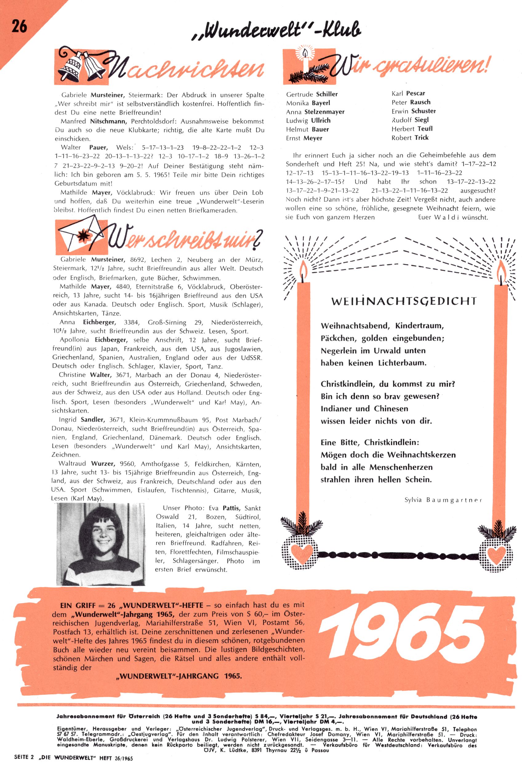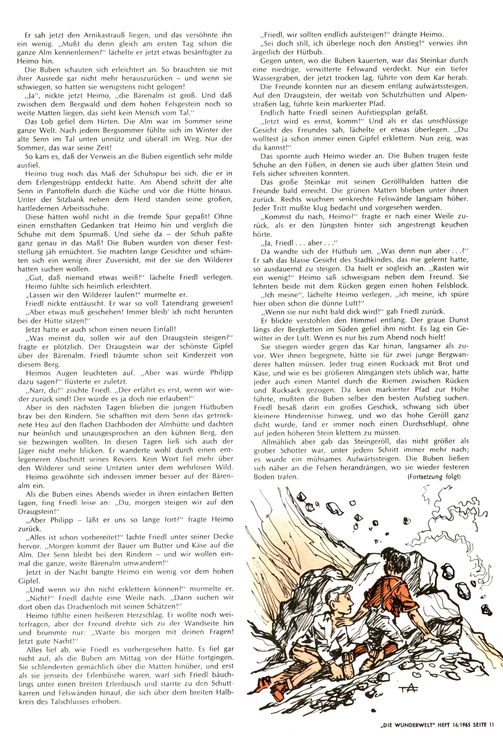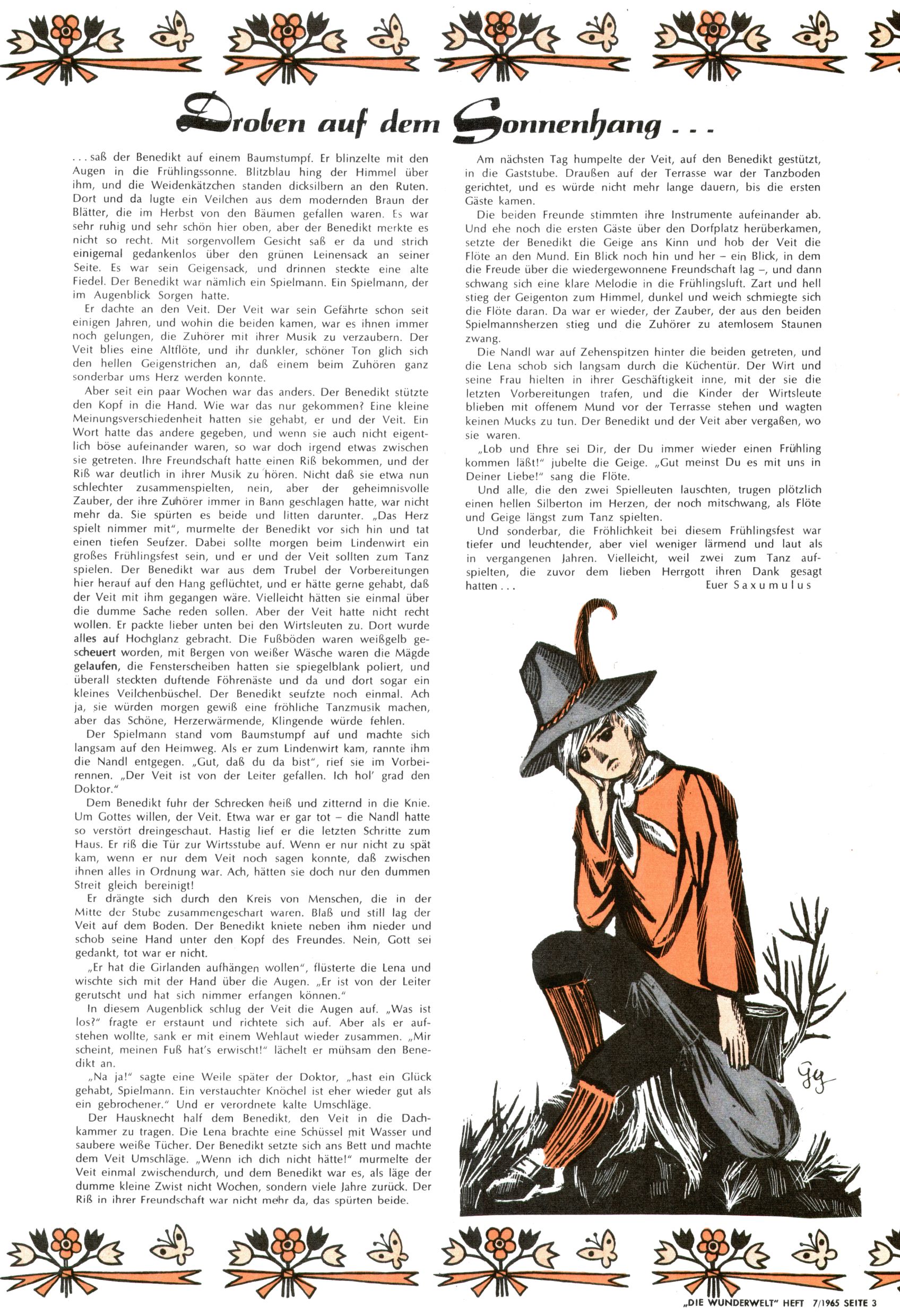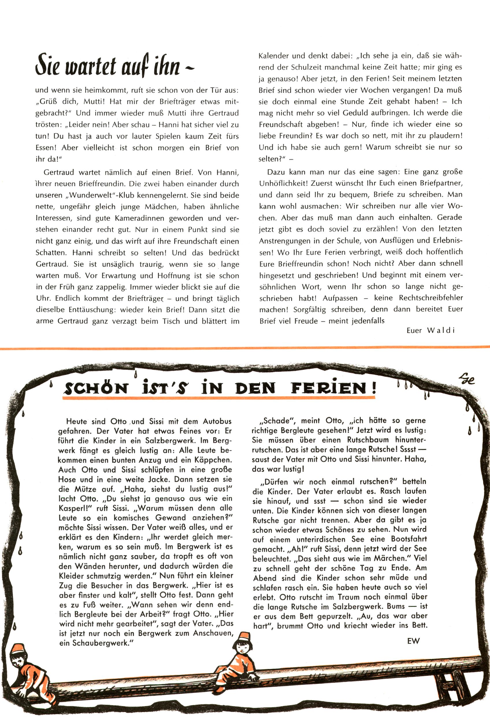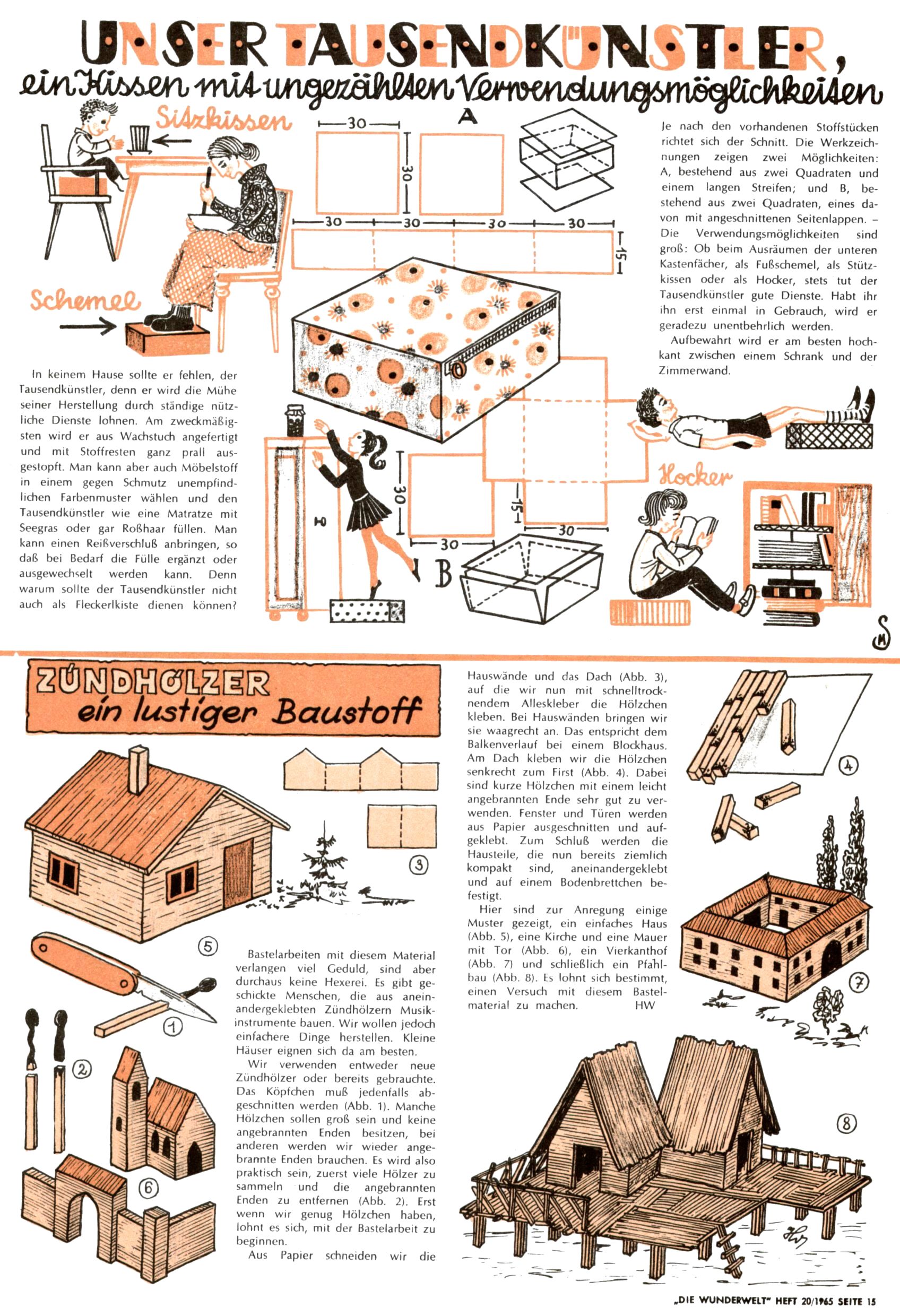1965 - Die Zeichen der Zeit ignorieren In den Sonderheften hatte man längst umgestellt. In den Standardheften klammerte man sich mit Händen und Füßen an das Altbewährte. Ein einziges Mal bekam Gudrun Groh-Götzinger 1965 die Chance, ihren modenernen Zeichenstil in einem Mittelmärchen umsetzen zu können. Teja Aicher setzte seine Nachbildungen historischer Gebäude fort und startete eine neue Serie über Bauernhöfe in Österreich. Neben seinen beiden Comicserien Zwerg Bumsti und Kri, der Zauberlehrling gestaltete er nach wie vor die Technikseite. Zusammen mit Rosl Warzilek, die nach 5 Jahren Pause erstmals wieder regelmäßig Titelseiten entwerfen durfte, war er für mehr als 50 Prozenz des Heftinhalts verantwortlich. Monica Skidelsky hatte sich ganz auf die Bastelarbeiten für Mädchen verlagert. Daneben waren nach wie vor Lisbeth Hölzl und Gudrun Groh-Götzinger im Einsatz. |