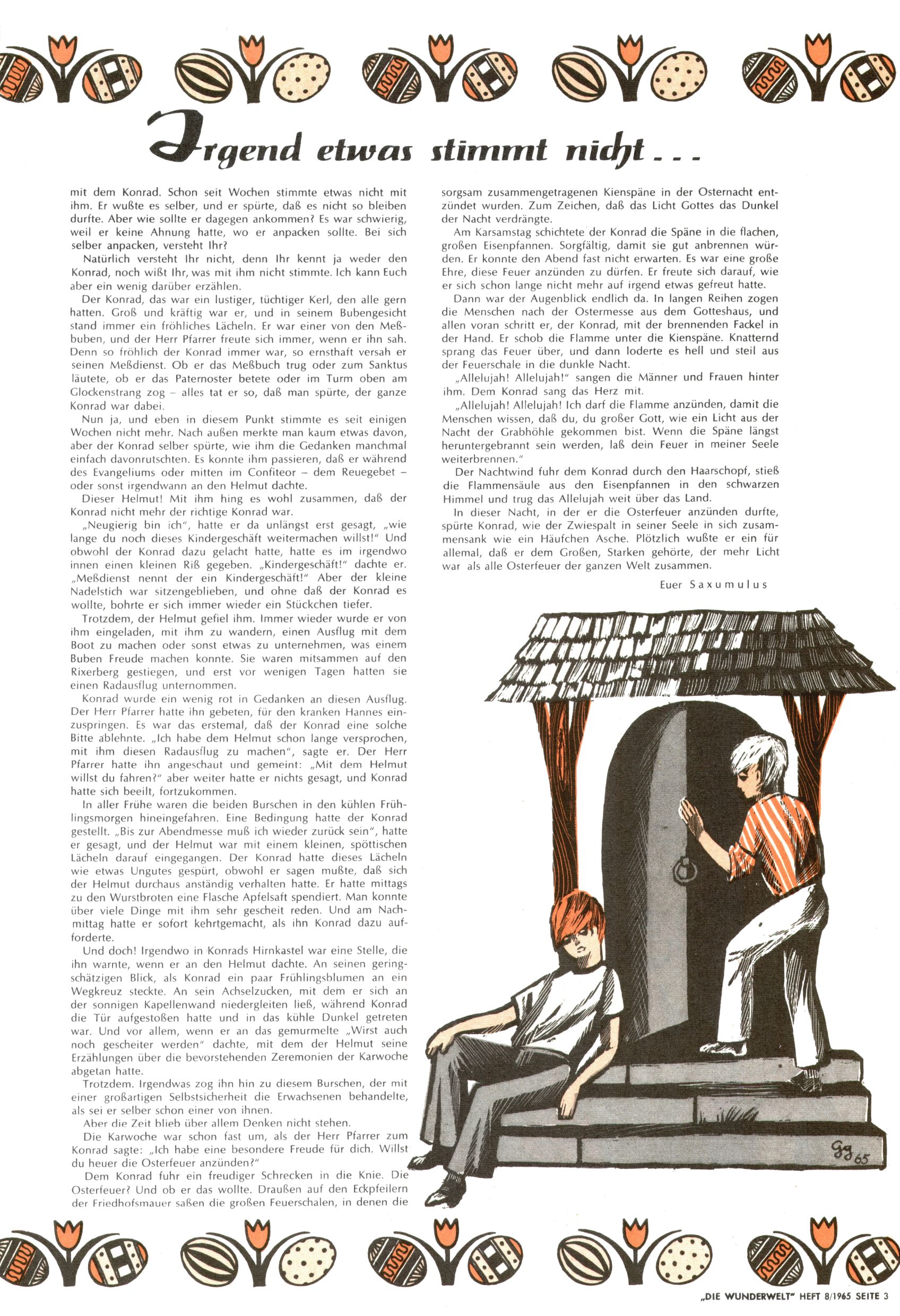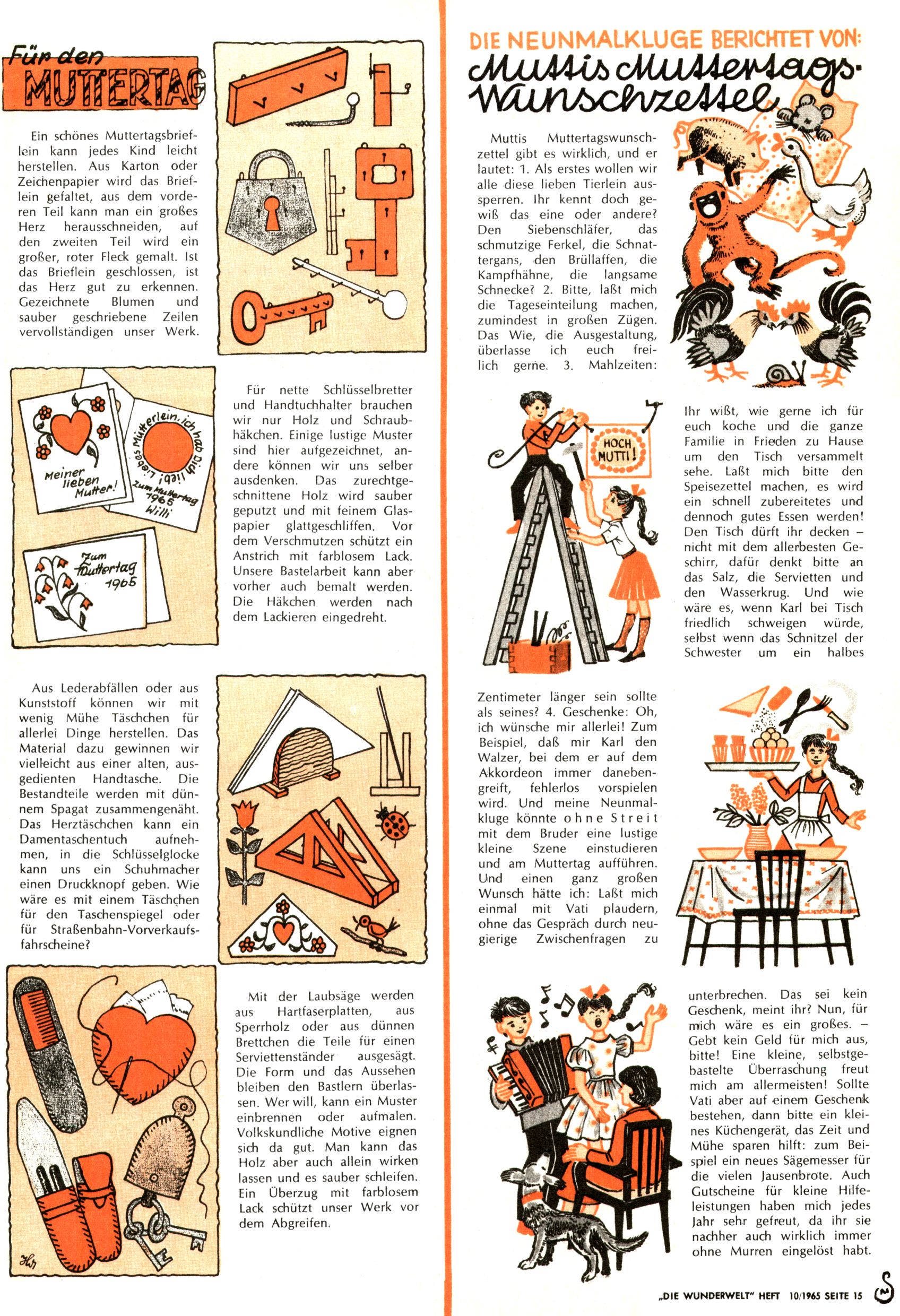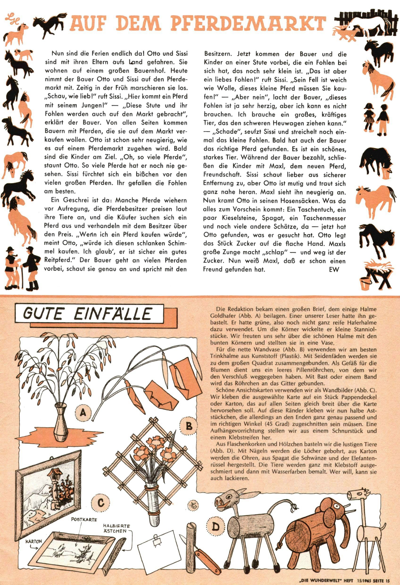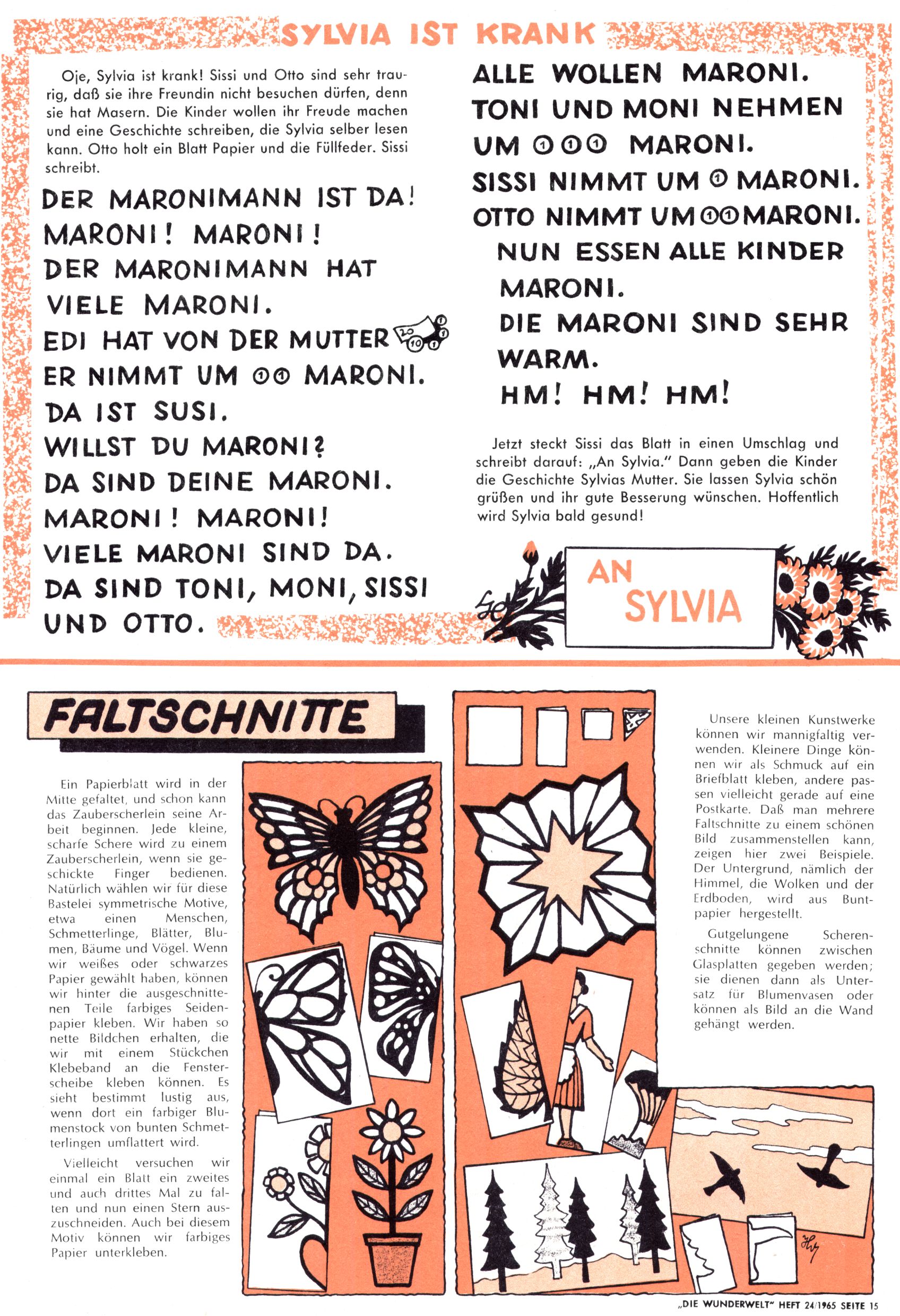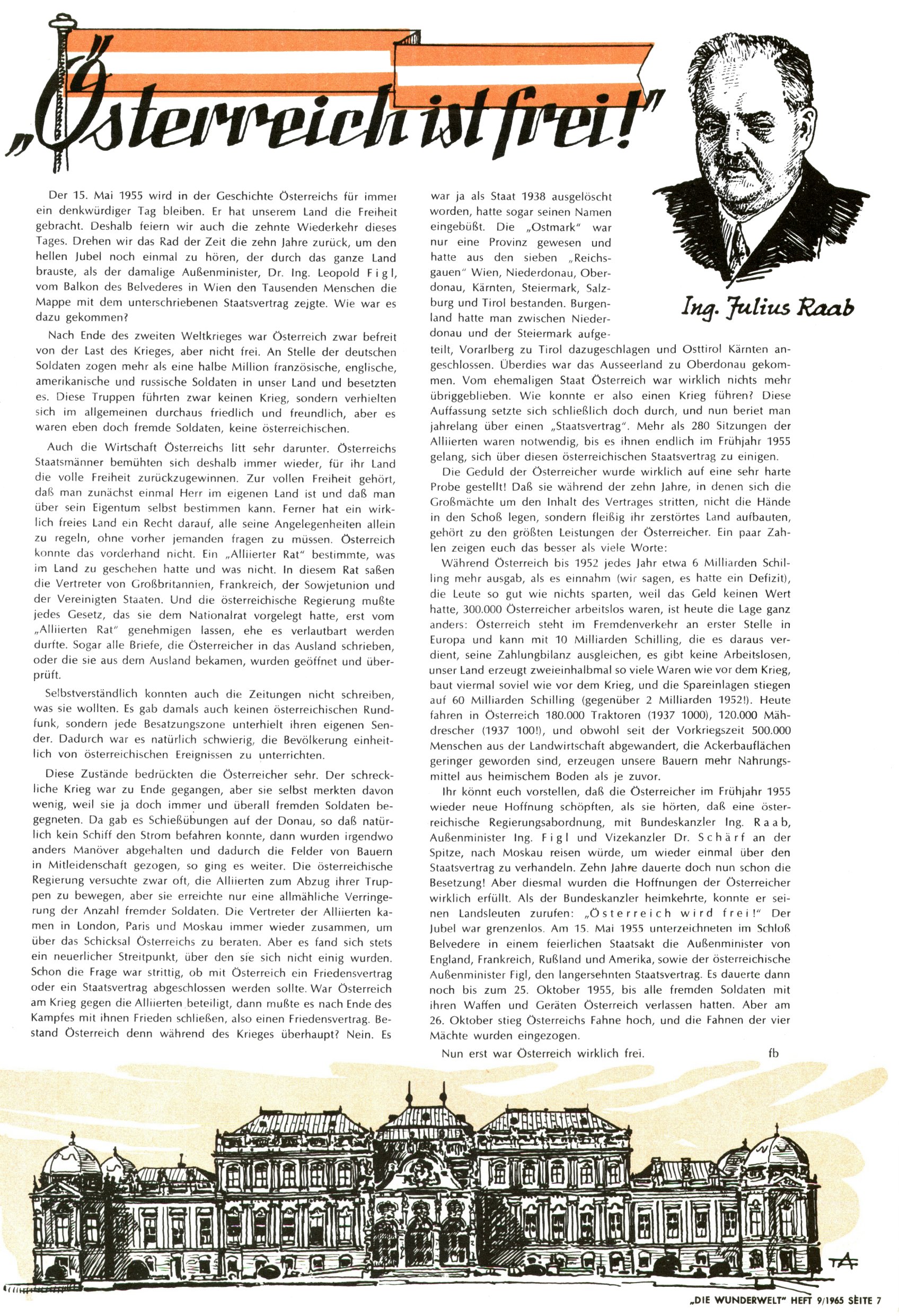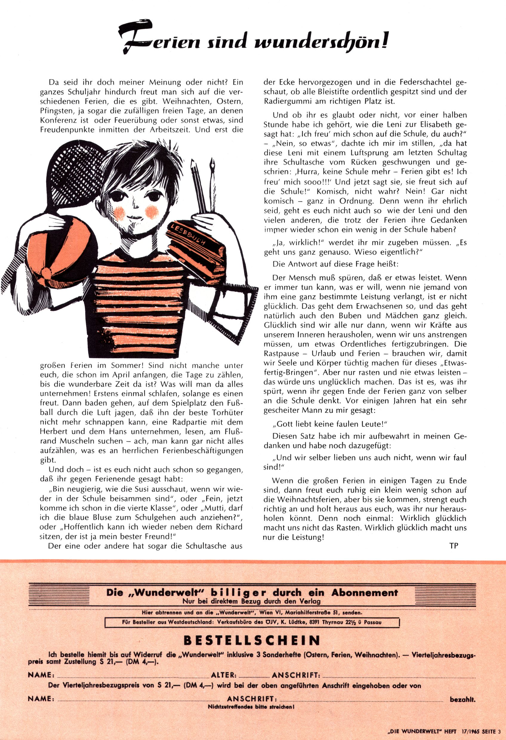 1965 - Die Zeichen der Zeit ignorieren In den Sonderheften hatte man längst umgestellt. In den Standardheften klammerte man sich mit Händen und Füßen an das Altbewährte. Ein einziges Mal bekam Gudrun Groh-Götzinger 1965 die Chance, ihren modenernen Zeichenstil in einem Mittelmärchen umsetzen zu können. Teja Aicher setzte seine Nachbildungen historischer Gebäude fort und startete eine neue Serie über Bauernhöfe in Österreich. Neben seinen beiden Comicserien Zwerg Bumsti und Kri, der Zauberlehrling gestaltete er nach wie vor die Technikseite. Zusammen mit Rosl Warzilek, die nach 5 Jahren Pause erstmals wieder regelmäßig Titelseiten entwerfen durfte, war er für mehr als 50 Prozenz des Heftinhalts verantwortlich. Monica Skidelsky hatte sich ganz auf die Bastelarbeiten für Mädchen verlagert. Daneben waren nach wie vor Lisbeth Hölzl und Gudrun Groh-Götzinger im Einsatz. |