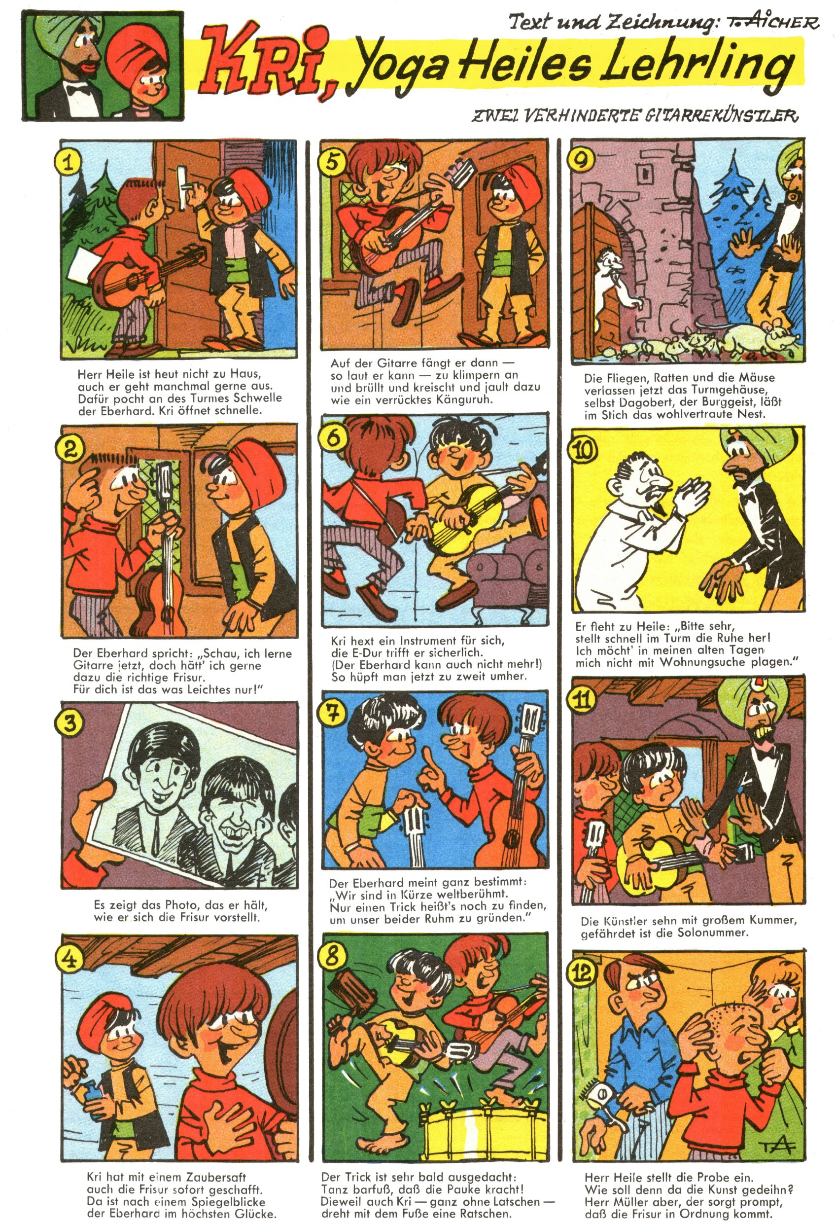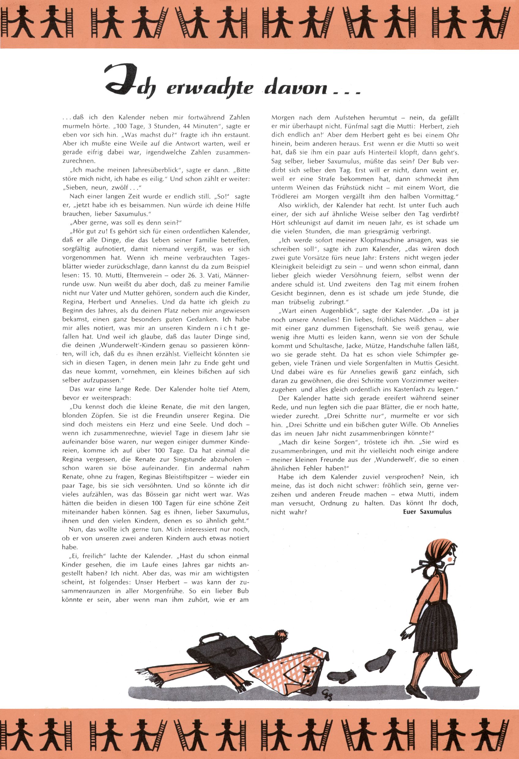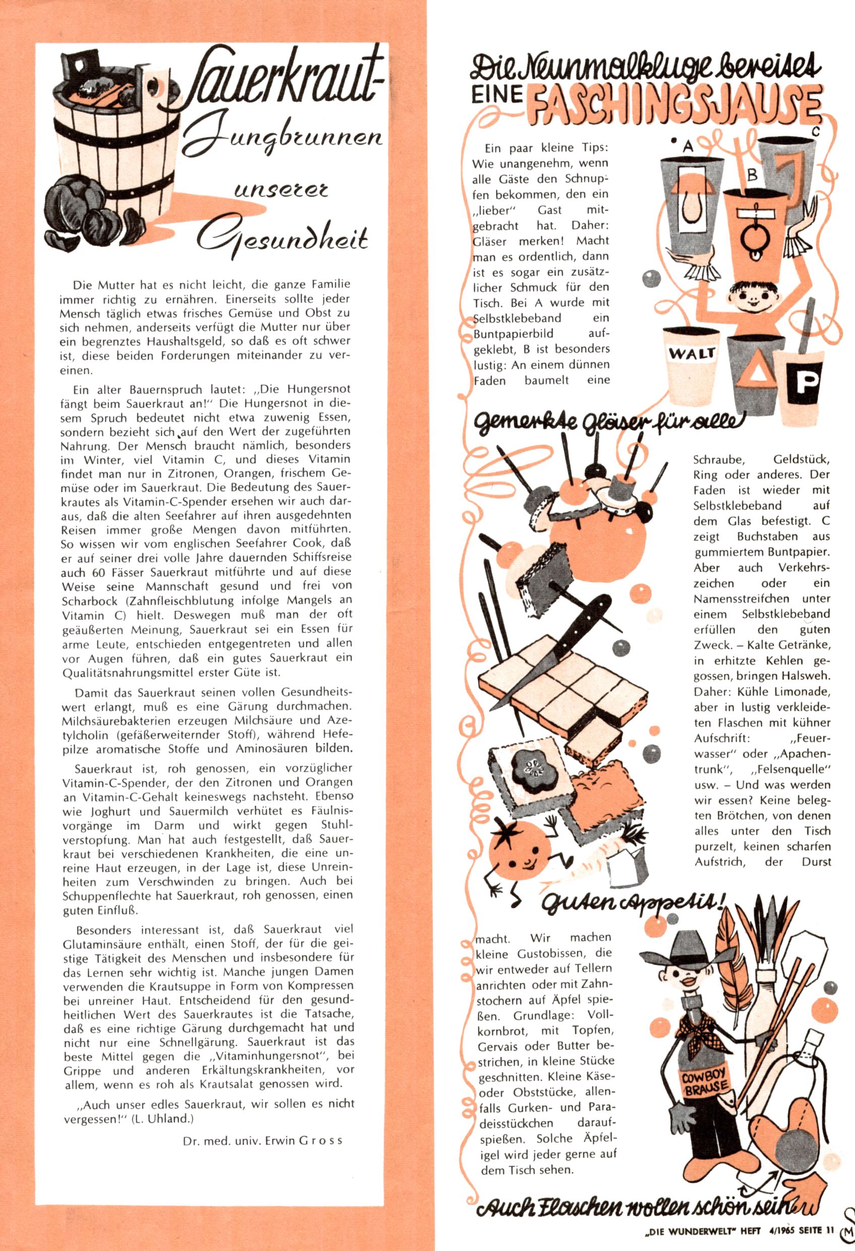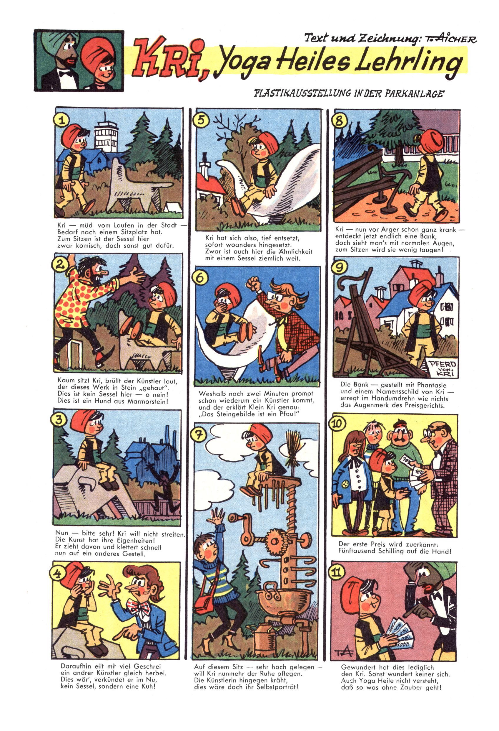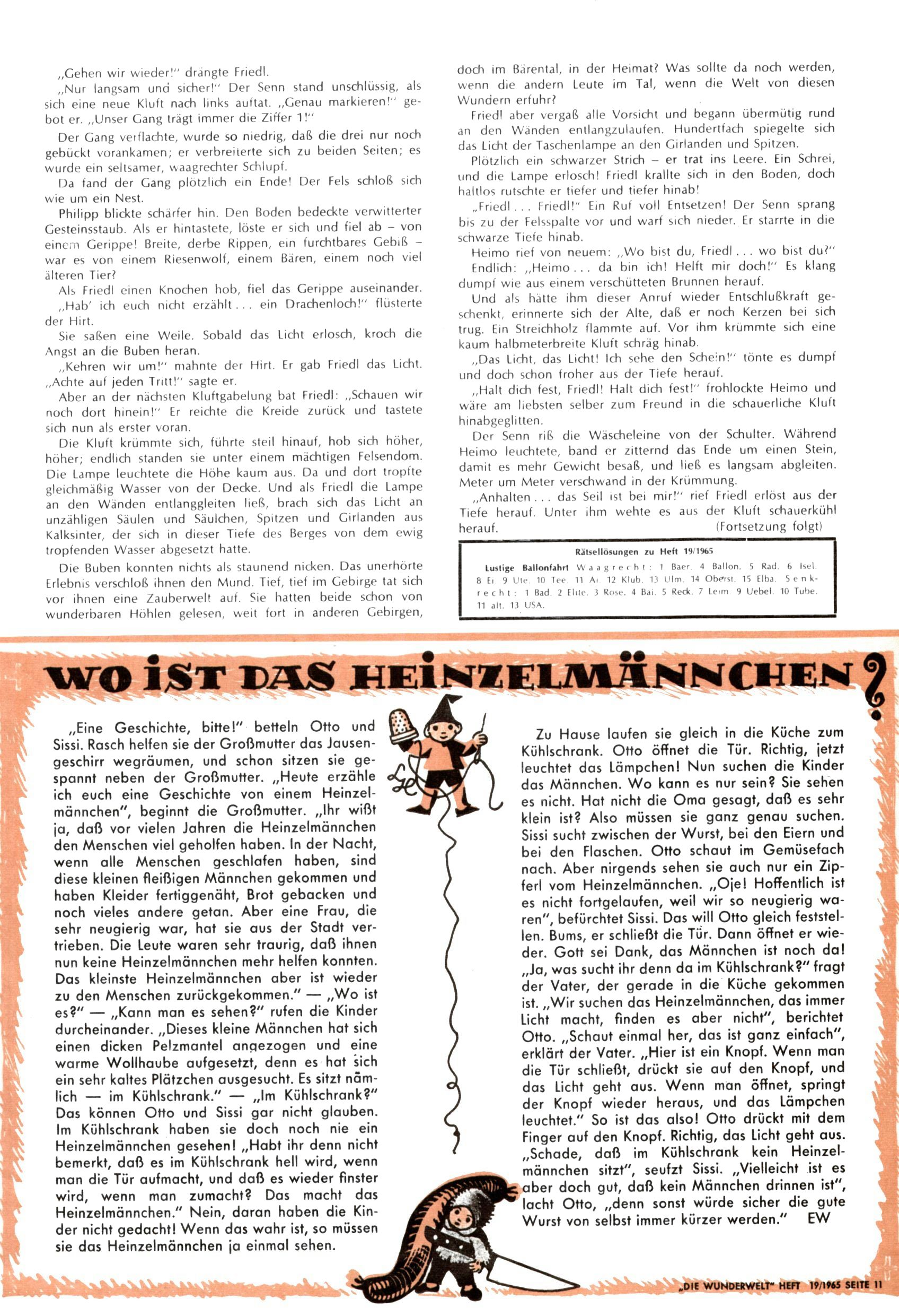 1965 - Die Zeichen der Zeit ignorieren In den Sonderheften hatte man längst umgestellt. In den Standardheften klammerte man sich mit Händen und Füßen an das Altbewährte. Ein einziges Mal bekam Gudrun Groh-Götzinger 1965 die Chance, ihren modenernen Zeichenstil in einem Mittelmärchen umsetzen zu können. Teja Aicher setzte seine Nachbildungen historischer Gebäude fort und startete eine neue Serie über Bauernhöfe in Österreich. Neben seinen beiden Comicserien Zwerg Bumsti und Kri, der Zauberlehrling gestaltete er nach wie vor die Technikseite. Zusammen mit Rosl Warzilek, die nach 5 Jahren Pause erstmals wieder regelmäßig Titelseiten entwerfen durfte, war er für mehr als 50 Prozenz des Heftinhalts verantwortlich. Monica Skidelsky hatte sich ganz auf die Bastelarbeiten für Mädchen verlagert. Daneben waren nach wie vor Lisbeth Hölzl und Gudrun Groh-Götzinger im Einsatz. |