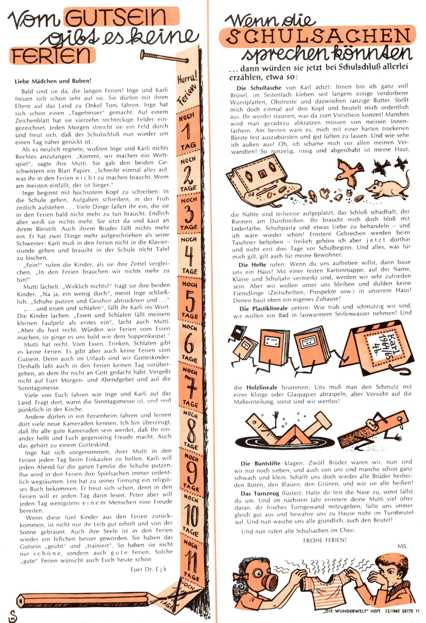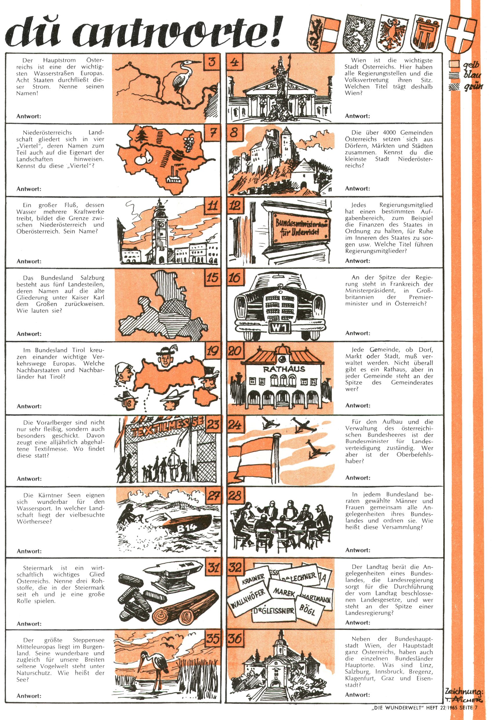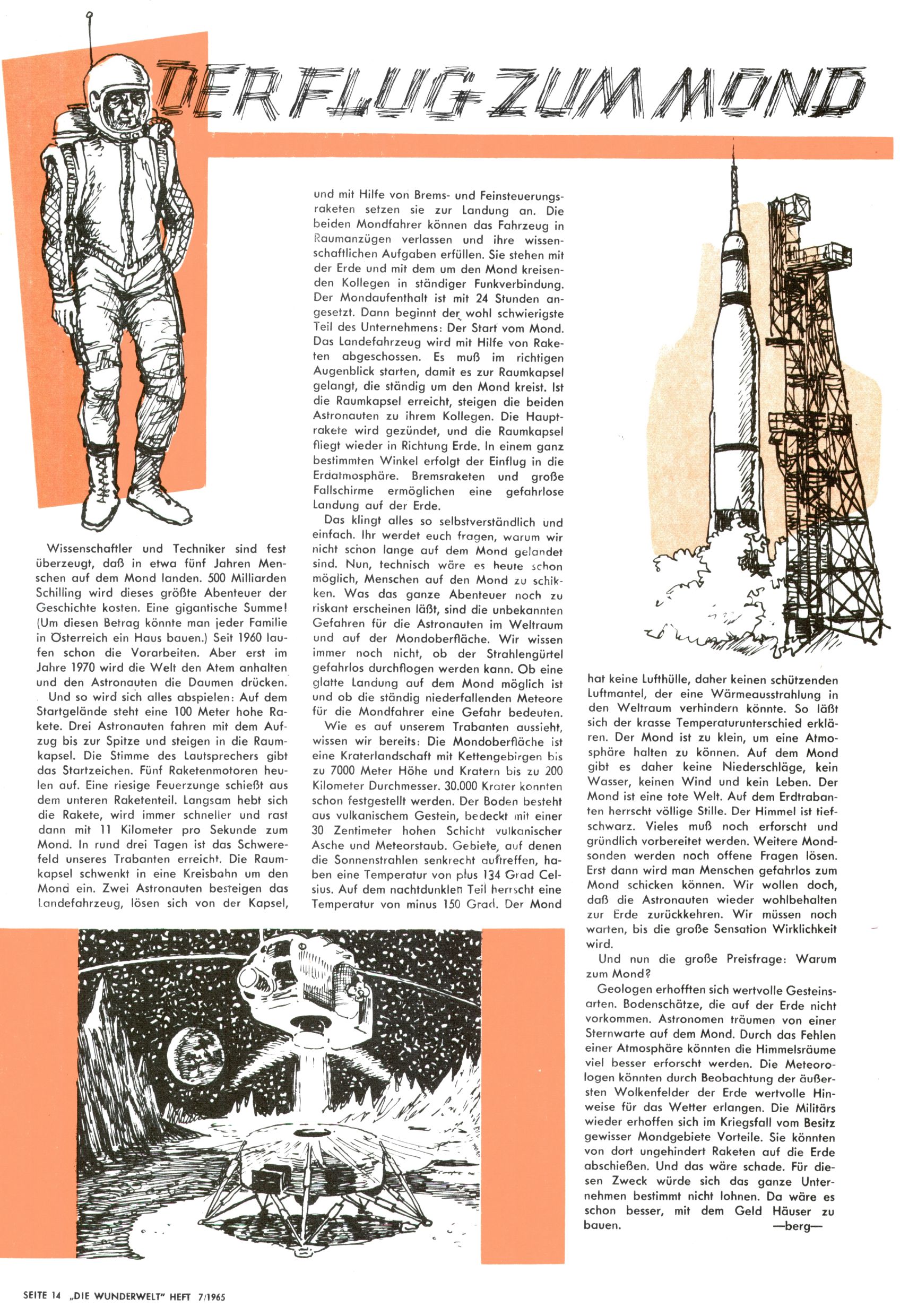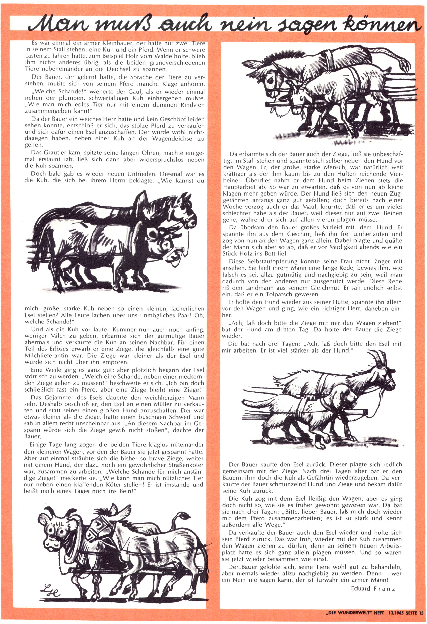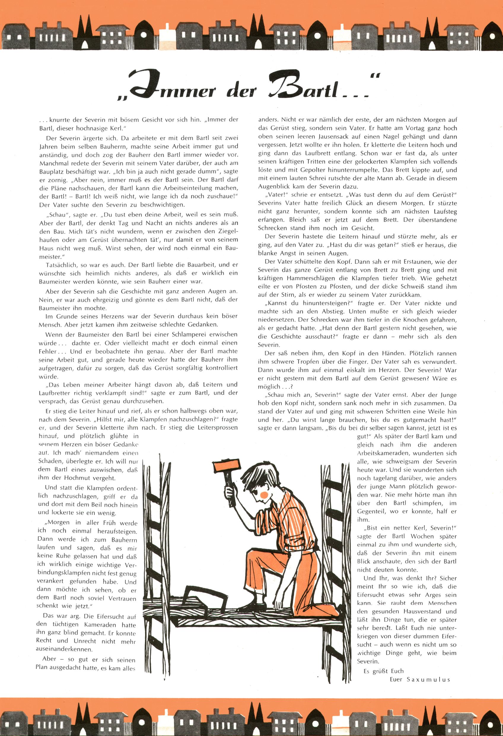 1965 - Die Zeichen der Zeit ignorieren In den Sonderheften hatte man längst umgestellt. In den Standardheften klammerte man sich mit Händen und Füßen an das Altbewährte. Ein einziges Mal bekam Gudrun Groh-Götzinger 1965 die Chance, ihren modenernen Zeichenstil in einem Mittelmärchen umsetzen zu können. Teja Aicher setzte seine Nachbildungen historischer Gebäude fort und startete eine neue Serie über Bauernhöfe in Österreich. Neben seinen beiden Comicserien Zwerg Bumsti und Kri, der Zauberlehrling gestaltete er nach wie vor die Technikseite. Zusammen mit Rosl Warzilek, die nach 5 Jahren Pause erstmals wieder regelmäßig Titelseiten entwerfen durfte, war er für mehr als 50 Prozenz des Heftinhalts verantwortlich. Monica Skidelsky hatte sich ganz auf die Bastelarbeiten für Mädchen verlagert. Daneben waren nach wie vor Lisbeth Hölzl und Gudrun Groh-Götzinger im Einsatz. |