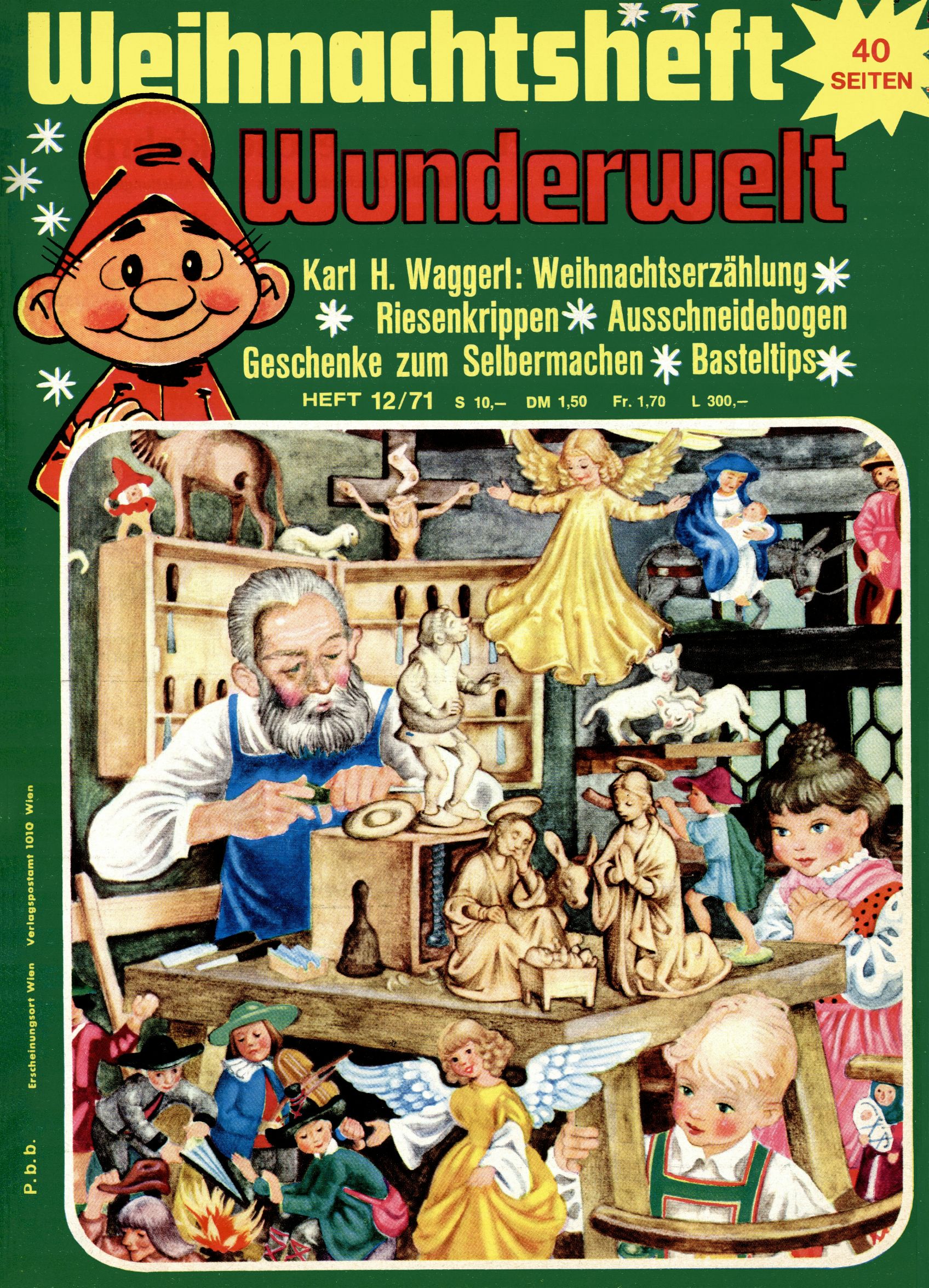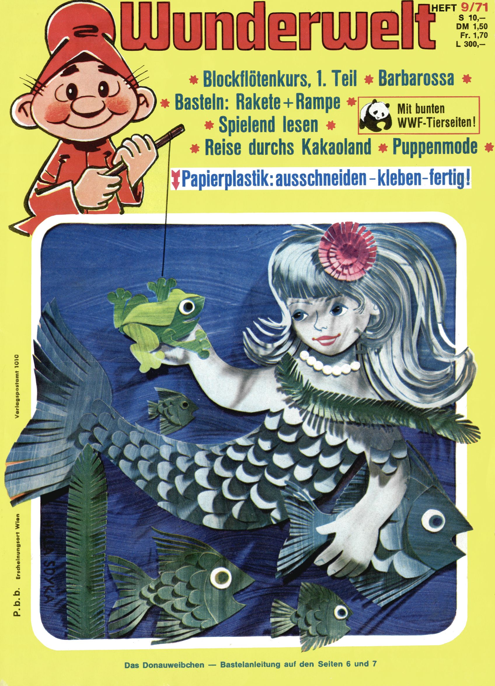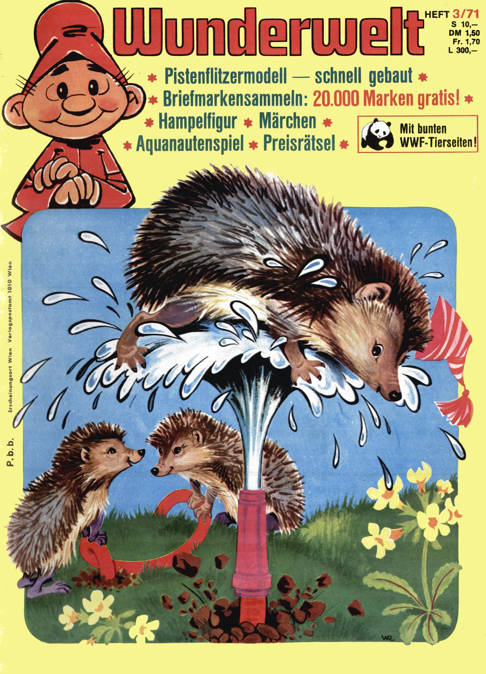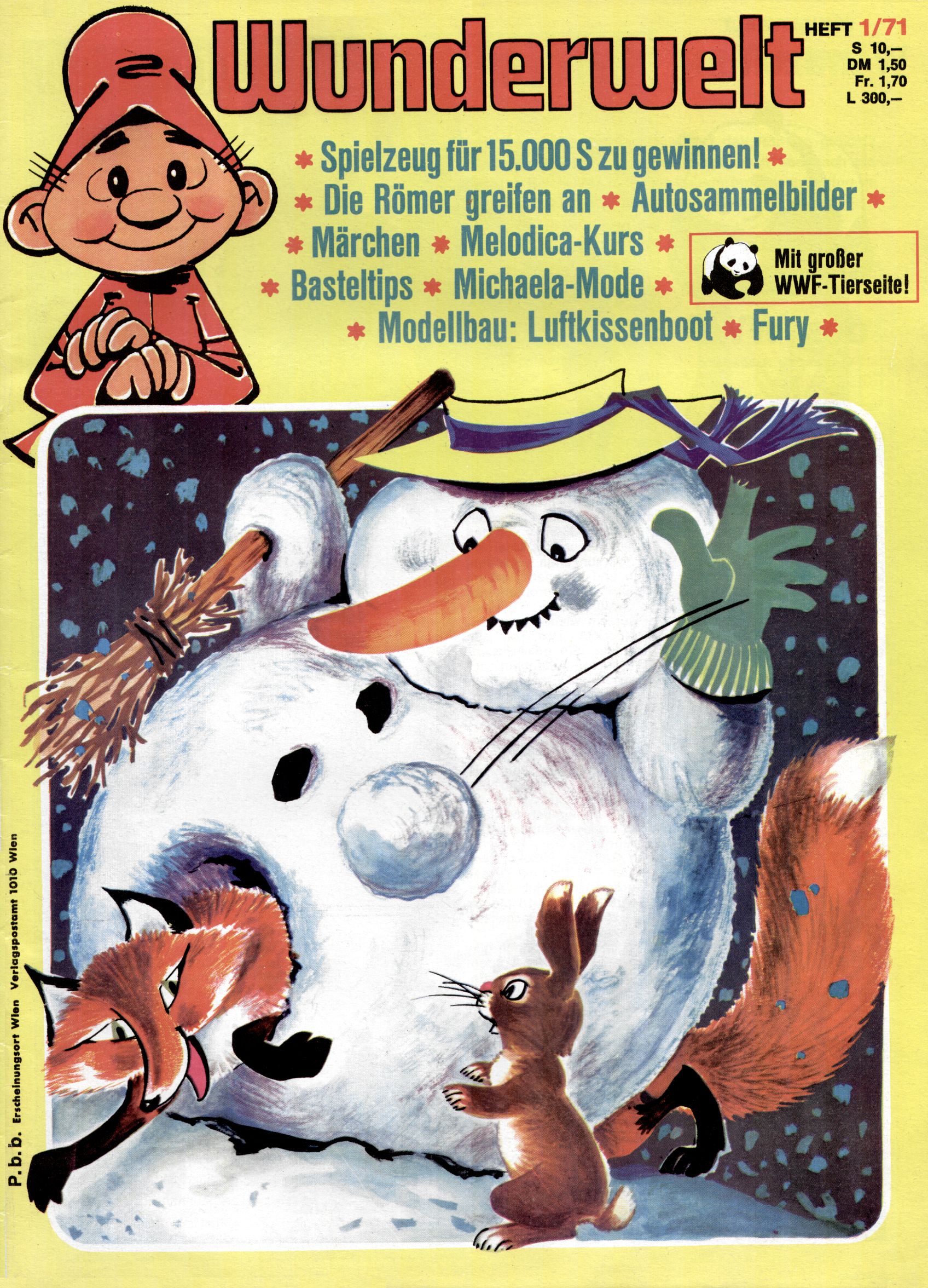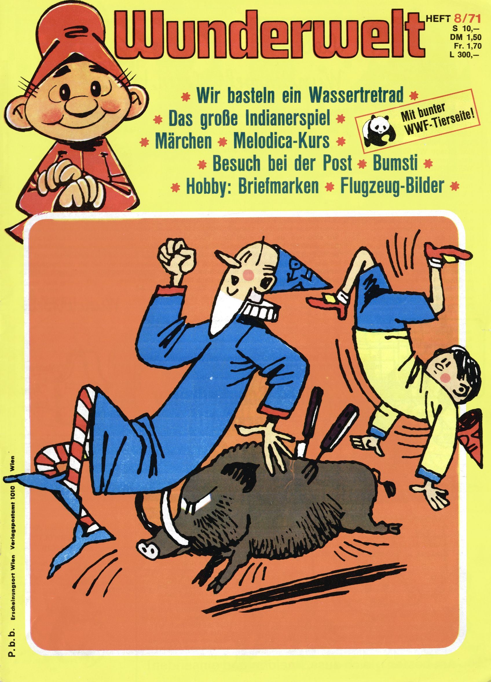 1971 - Rückkehr zur Normalität? 1971 gab es erstmals wieder die geplanten 12 Zeitschriften in einem Jahr. Noch immer war Rosl Warzilek beim Team. Hella Soyka hatte sich mittlerweile eingelebt und auch Christian Raffeiner gehörte bereits dazu. TA Teja Aicher tat, was ihm gerade in den Sinn kam. Im 11. Heft versetzte er seinem Zwerg Bumsti einen neuen Tiefschlag, indem er diesen ab nun durch Sprechblasen kommunizieren ließ. Die Welt von Bumsti war fortan eine andere, in der die Ratten das Sagen hatten. Dies war ganz offensichtlich ein neuer bitterer Zynismus von TA. Aber es sollte noch besser kommen. Mit Perry und Silia schuf TA eine Saubermann-Serie, in der er sich selbst als namenloser Kater die Drecksarbeit machen ließ, während andere den Lohn ernteten. Hätte die Redaktionsleitung TAs Sarkasmus durchschaut, hätte dieser wohl längst seine Sachen packen dürfen. Aber so konnte TA seinen heimlichen Rachefeldzug ungehindert fortsetzen. Die Wunderwelt agierte um 1971 als Sprachrohr des WWF. Neben viel Werbung gab es eine Serie über das auch nicht mehr ganz zeitgemäße Briefmarkensammeln und einen Melodica-Kurs. In einem Akt der Verzweiflung wurde Mitte 1971 nochmals Willibald der Zauberlehrling ins Leben gerufen. Natürlich nur mit alten Abenteuern, denn Willibalds wahrer Meister Peter Paul Prinz hatte der Wunderwelt längst den Rücken gekehrt. Im Advent- und im Weihnachtsheft fand sich dann eine überraschende Anzahl von guten Bastelideen nach alter Tradition. Hatte die Wunderwelt doch noch eine Chance? |