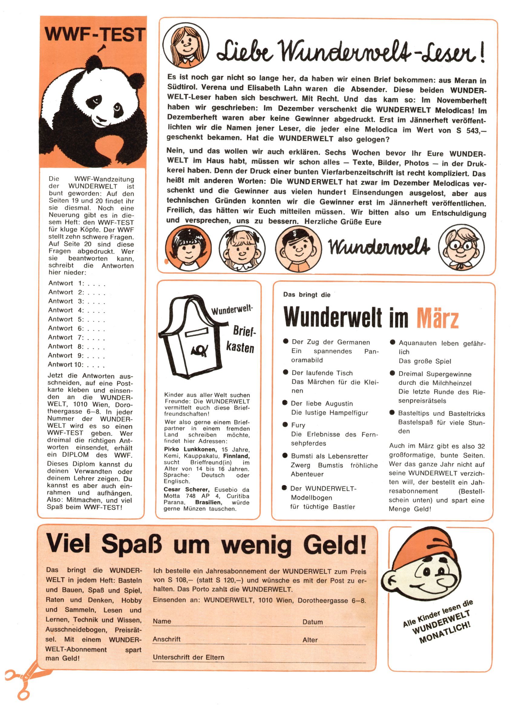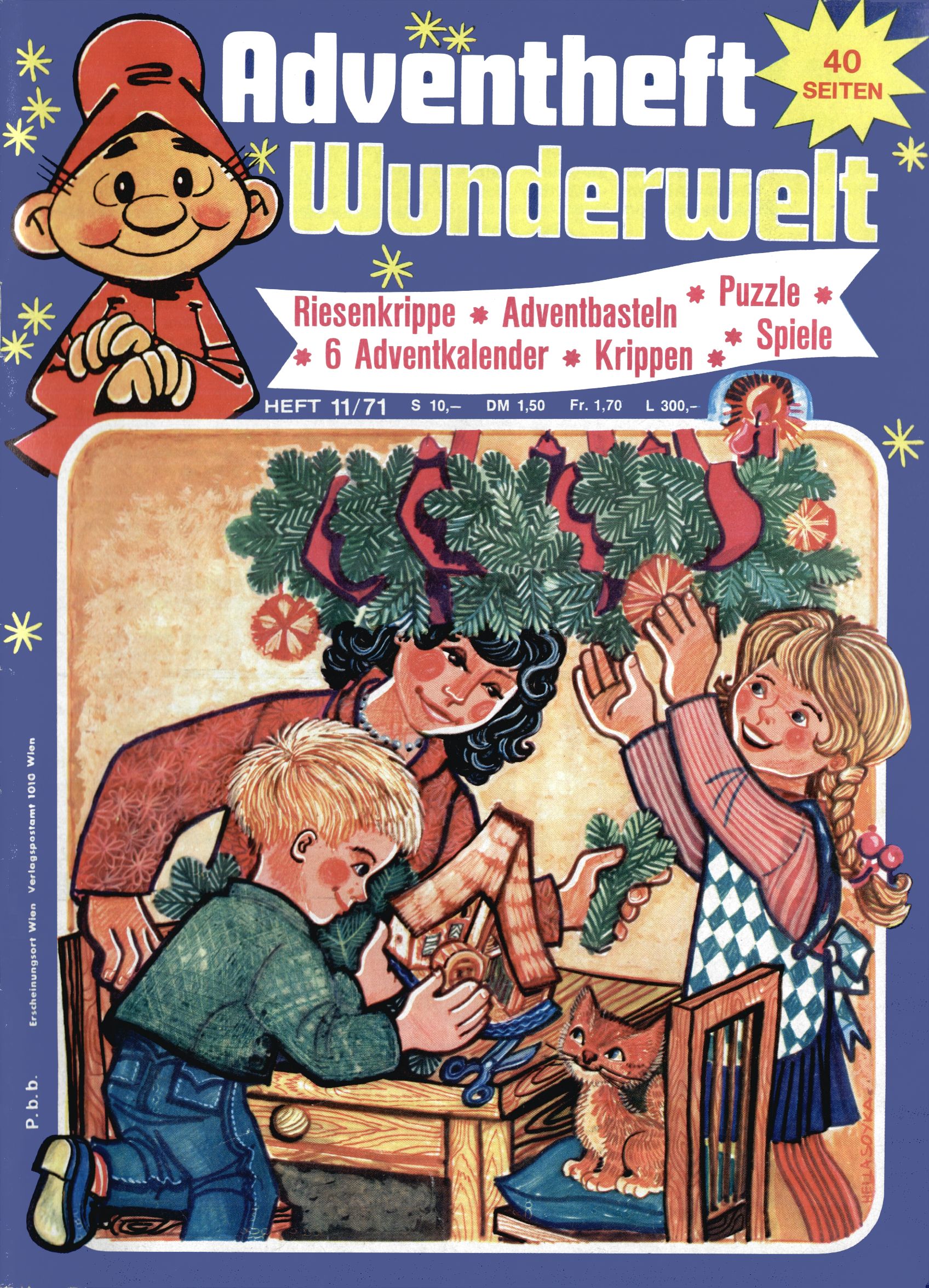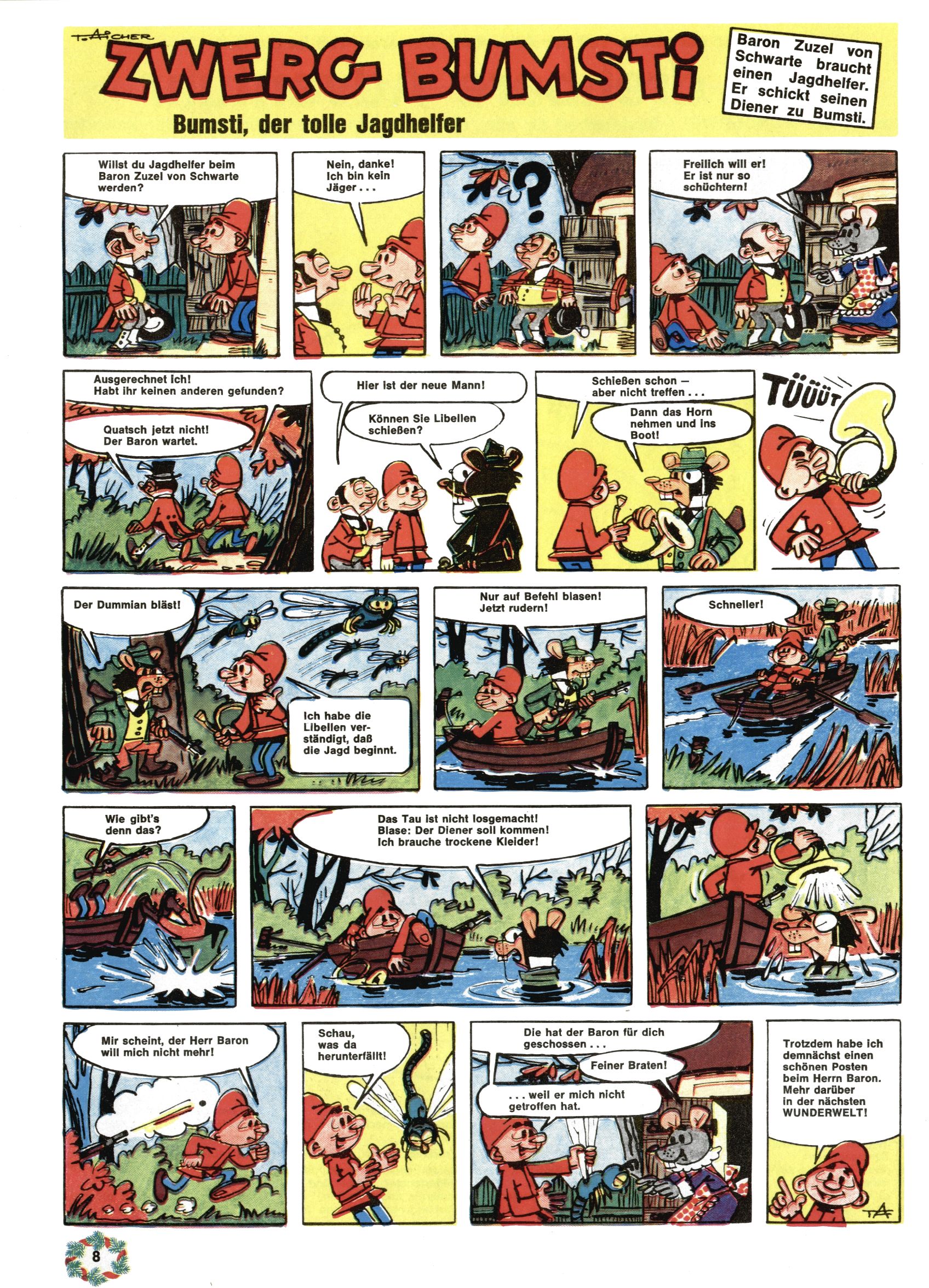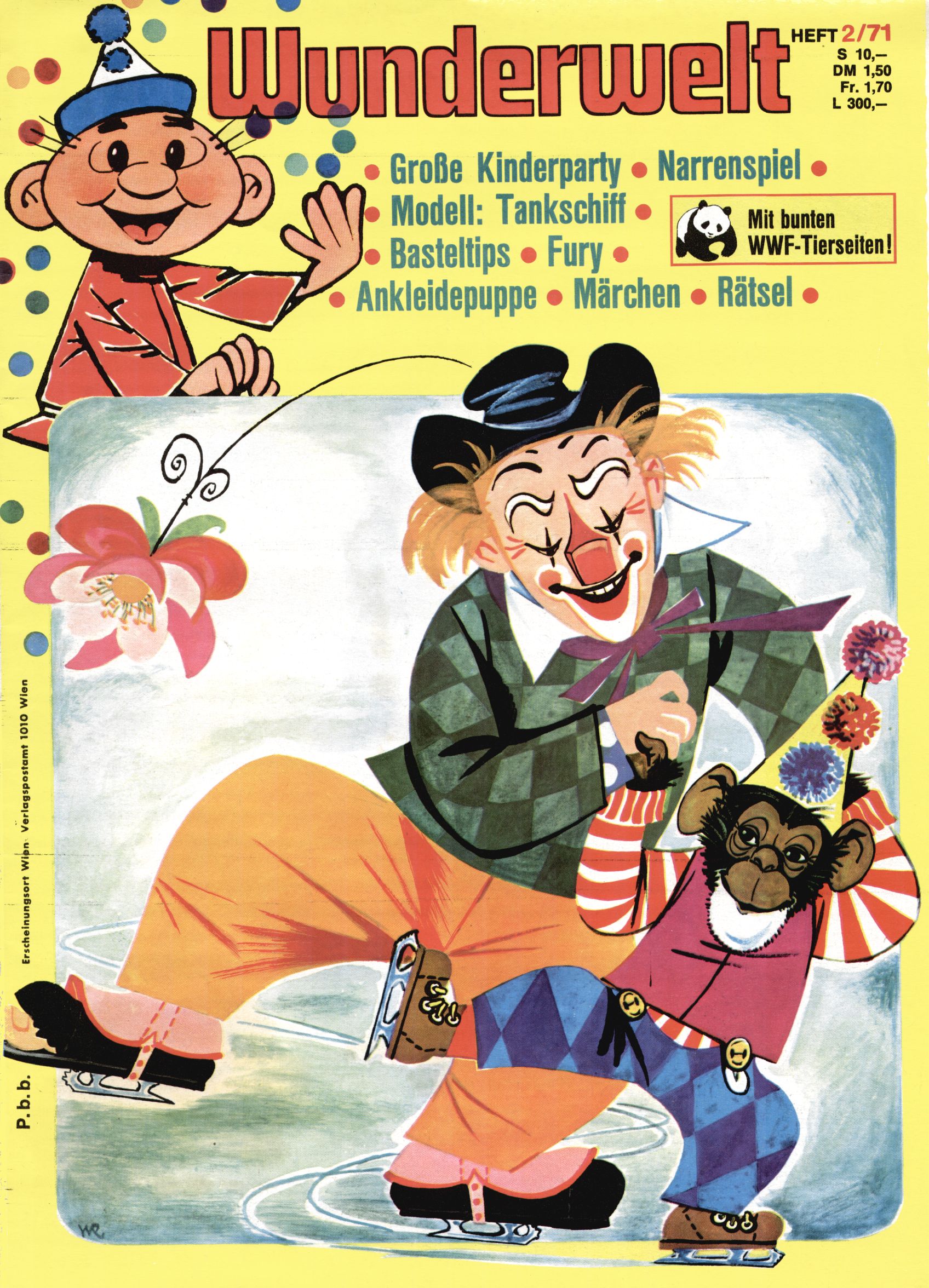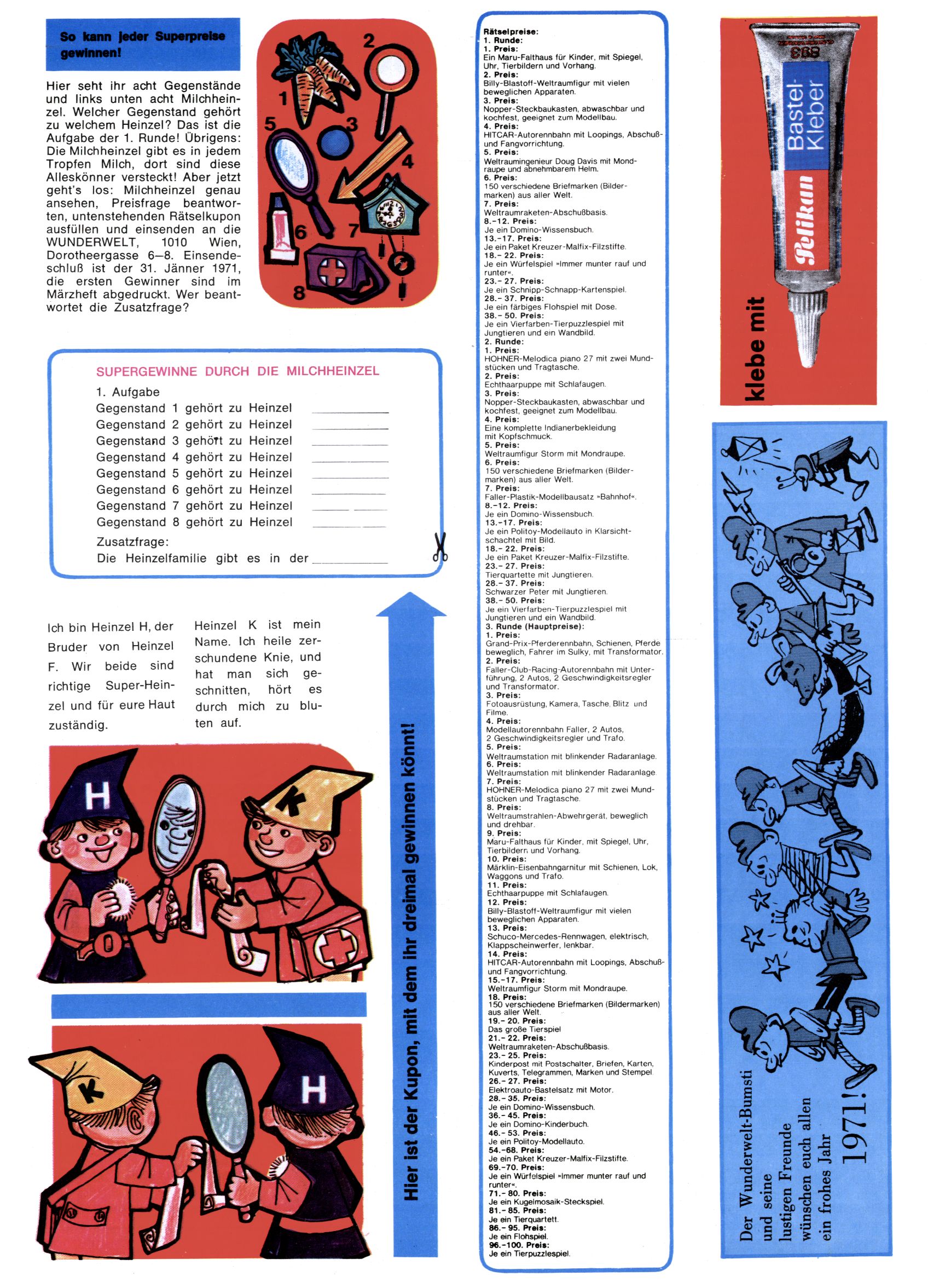 1971 - Rückkehr zur Normalität? 1971 gab es erstmals wieder die geplanten 12 Zeitschriften in einem Jahr. Noch immer war Rosl Warzilek beim Team. Hella Soyka hatte sich mittlerweile eingelebt und auch Christian Raffeiner gehörte bereits dazu. TA Teja Aicher tat, was ihm gerade in den Sinn kam. Im 11. Heft versetzte er seinem Zwerg Bumsti einen neuen Tiefschlag, indem er diesen ab nun durch Sprechblasen kommunizieren ließ. Die Welt von Bumsti war fortan eine andere, in der die Ratten das Sagen hatten. Dies war ganz offensichtlich ein neuer bitterer Zynismus von TA. Aber es sollte noch besser kommen. Mit Perry und Silia schuf TA eine Saubermann-Serie, in der er sich selbst als namenloser Kater die Drecksarbeit machen ließ, während andere den Lohn ernteten. Hätte die Redaktionsleitung TAs Sarkasmus durchschaut, hätte dieser wohl längst seine Sachen packen dürfen. Aber so konnte TA seinen heimlichen Rachefeldzug ungehindert fortsetzen. Die Wunderwelt agierte um 1971 als Sprachrohr des WWF. Neben viel Werbung gab es eine Serie über das auch nicht mehr ganz zeitgemäße Briefmarkensammeln und einen Melodica-Kurs. In einem Akt der Verzweiflung wurde Mitte 1971 nochmals Willibald der Zauberlehrling ins Leben gerufen. Natürlich nur mit alten Abenteuern, denn Willibalds wahrer Meister Peter Paul Prinz hatte der Wunderwelt längst den Rücken gekehrt. Im Advent- und im Weihnachtsheft fand sich dann eine überraschende Anzahl von guten Bastelideen nach alter Tradition. Hatte die Wunderwelt doch noch eine Chance? |