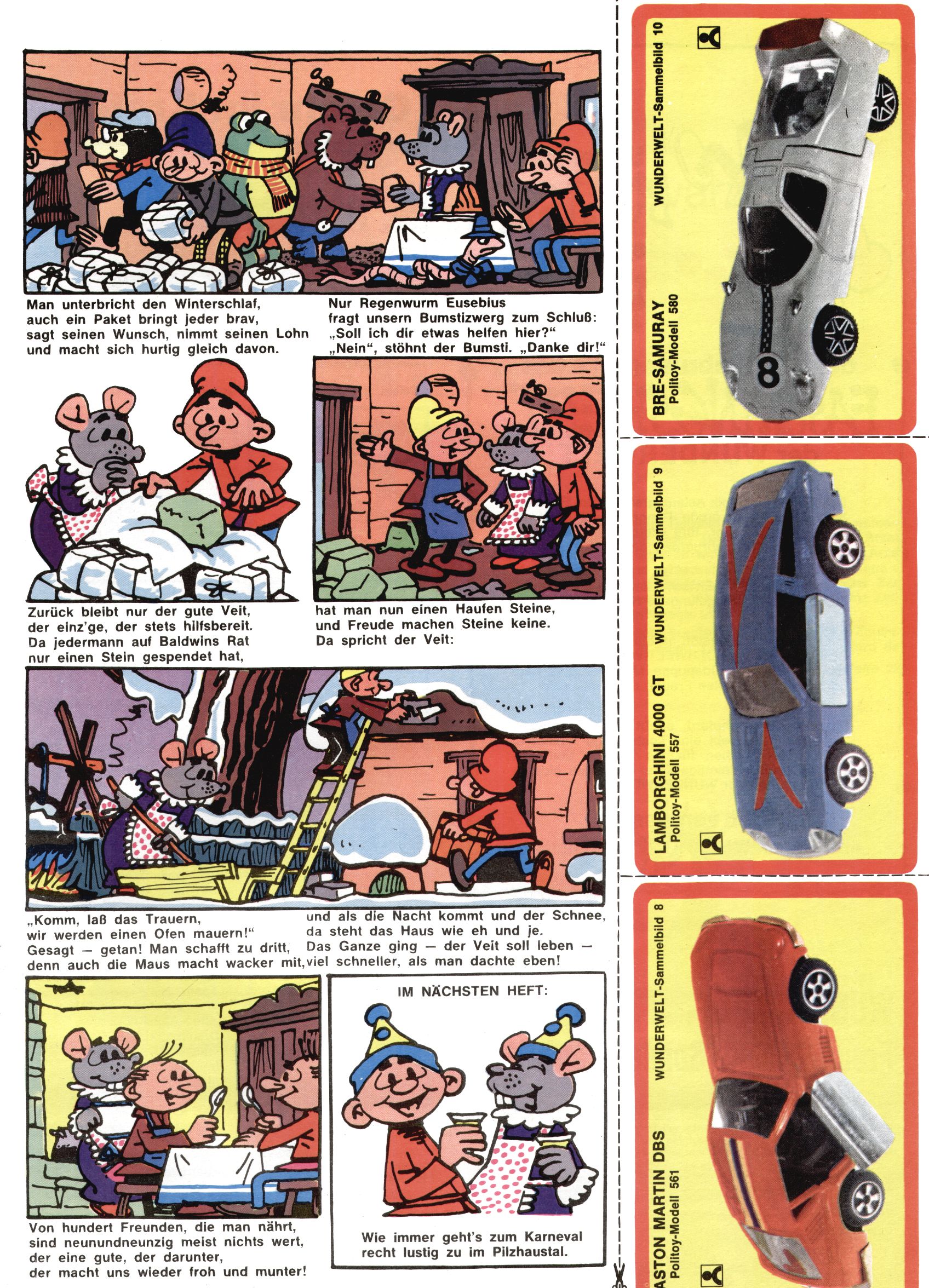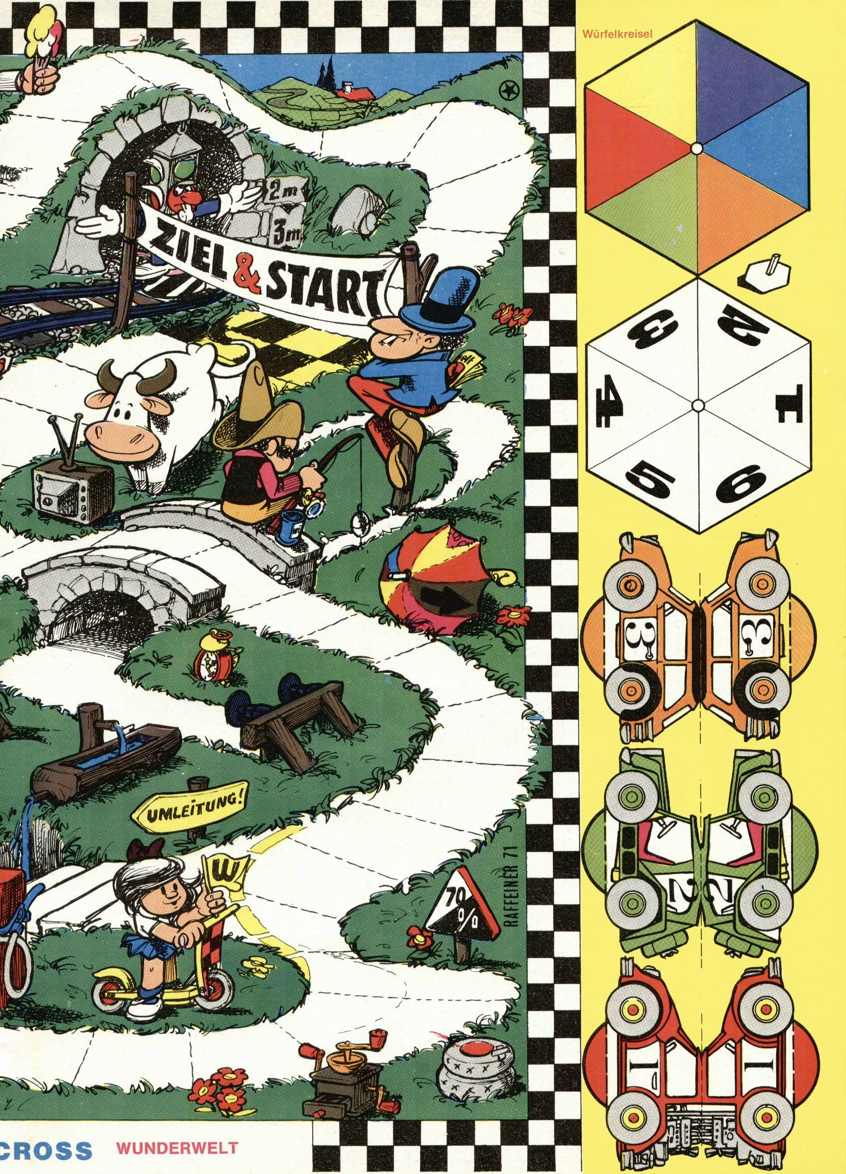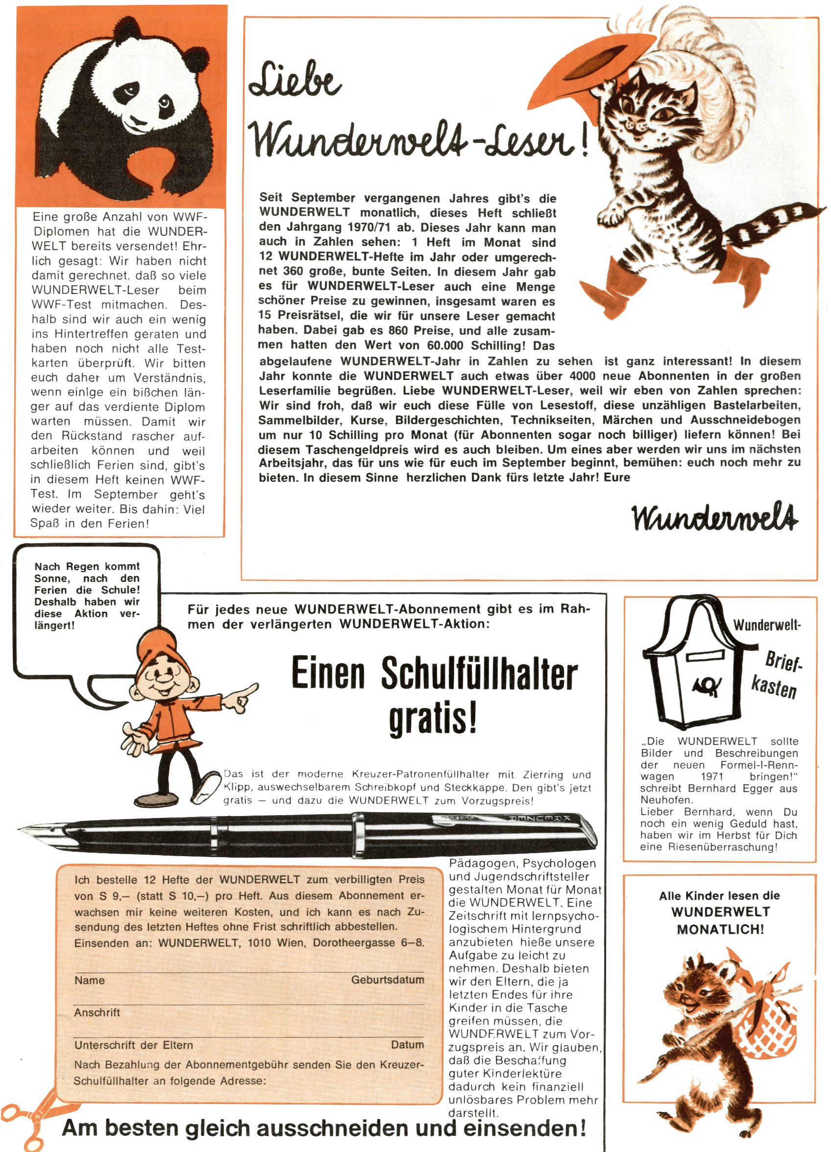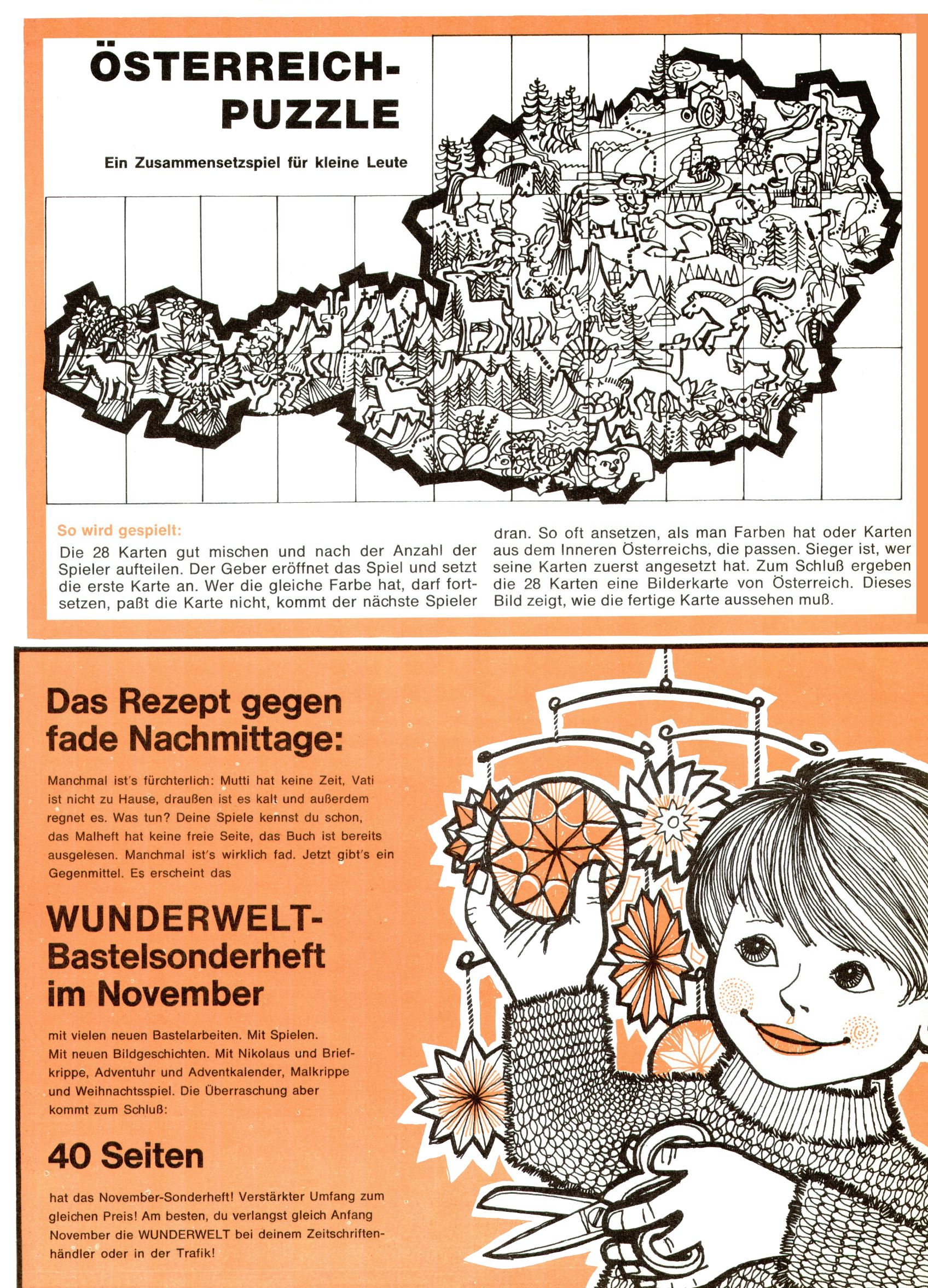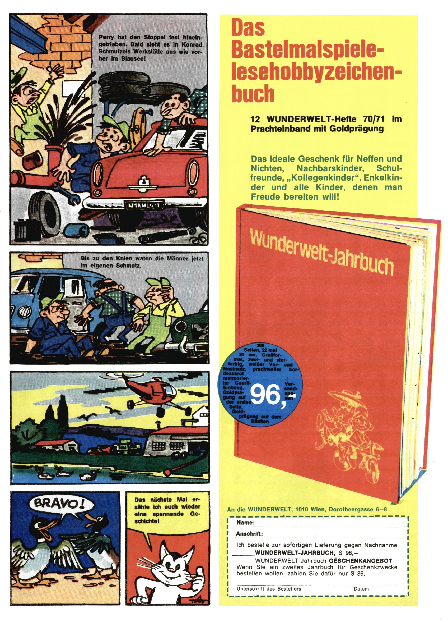 1971 - Rückkehr zur Normalität? 1971 gab es erstmals wieder die geplanten 12 Zeitschriften in einem Jahr. Noch immer war Rosl Warzilek beim Team. Hella Soyka hatte sich mittlerweile eingelebt und auch Christian Raffeiner gehörte bereits dazu. TA Teja Aicher tat, was ihm gerade in den Sinn kam. Im 11. Heft versetzte er seinem Zwerg Bumsti einen neuen Tiefschlag, indem er diesen ab nun durch Sprechblasen kommunizieren ließ. Die Welt von Bumsti war fortan eine andere, in der die Ratten das Sagen hatten. Dies war ganz offensichtlich ein neuer bitterer Zynismus von TA. Aber es sollte noch besser kommen. Mit Perry und Silia schuf TA eine Saubermann-Serie, in der er sich selbst als namenloser Kater die Drecksarbeit machen ließ, während andere den Lohn ernteten. Hätte die Redaktionsleitung TAs Sarkasmus durchschaut, hätte dieser wohl längst seine Sachen packen dürfen. Aber so konnte TA seinen heimlichen Rachefeldzug ungehindert fortsetzen. Die Wunderwelt agierte um 1971 als Sprachrohr des WWF. Neben viel Werbung gab es eine Serie über das auch nicht mehr ganz zeitgemäße Briefmarkensammeln und einen Melodica-Kurs. In einem Akt der Verzweiflung wurde Mitte 1971 nochmals Willibald der Zauberlehrling ins Leben gerufen. Natürlich nur mit alten Abenteuern, denn Willibalds wahrer Meister Peter Paul Prinz hatte der Wunderwelt längst den Rücken gekehrt. Im Advent- und im Weihnachtsheft fand sich dann eine überraschende Anzahl von guten Bastelideen nach alter Tradition. Hatte die Wunderwelt doch noch eine Chance? |