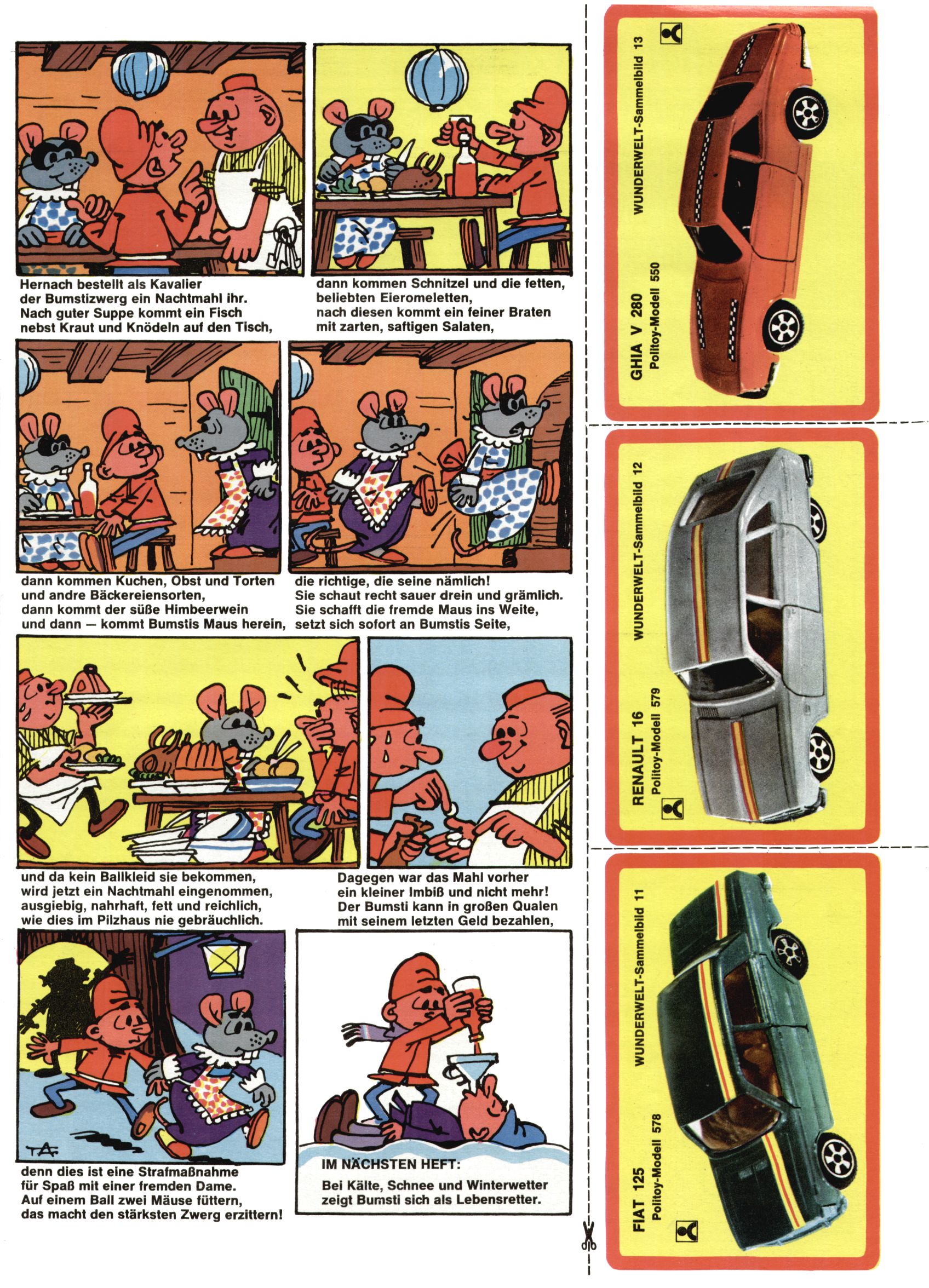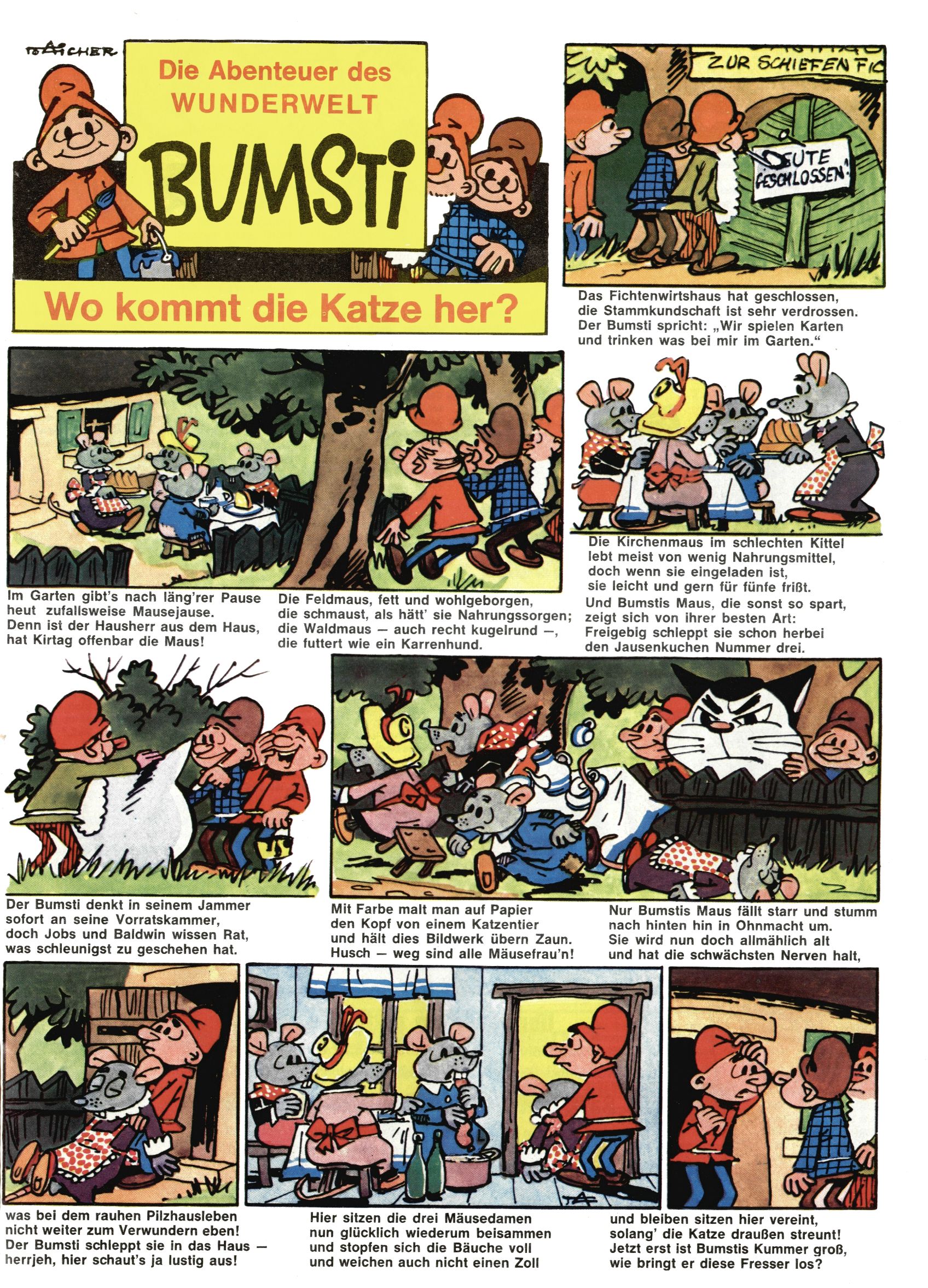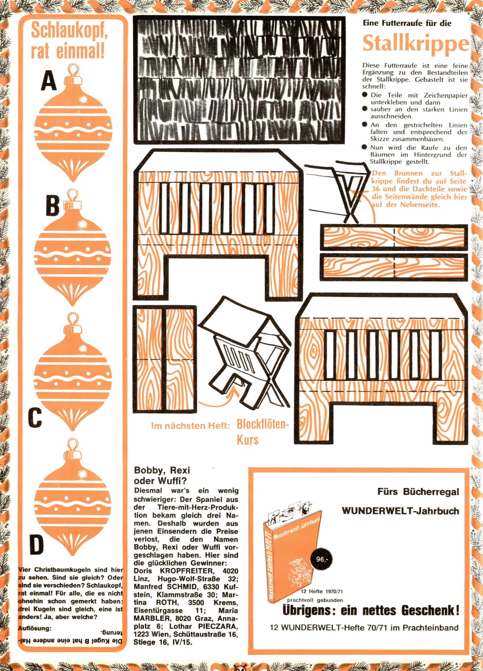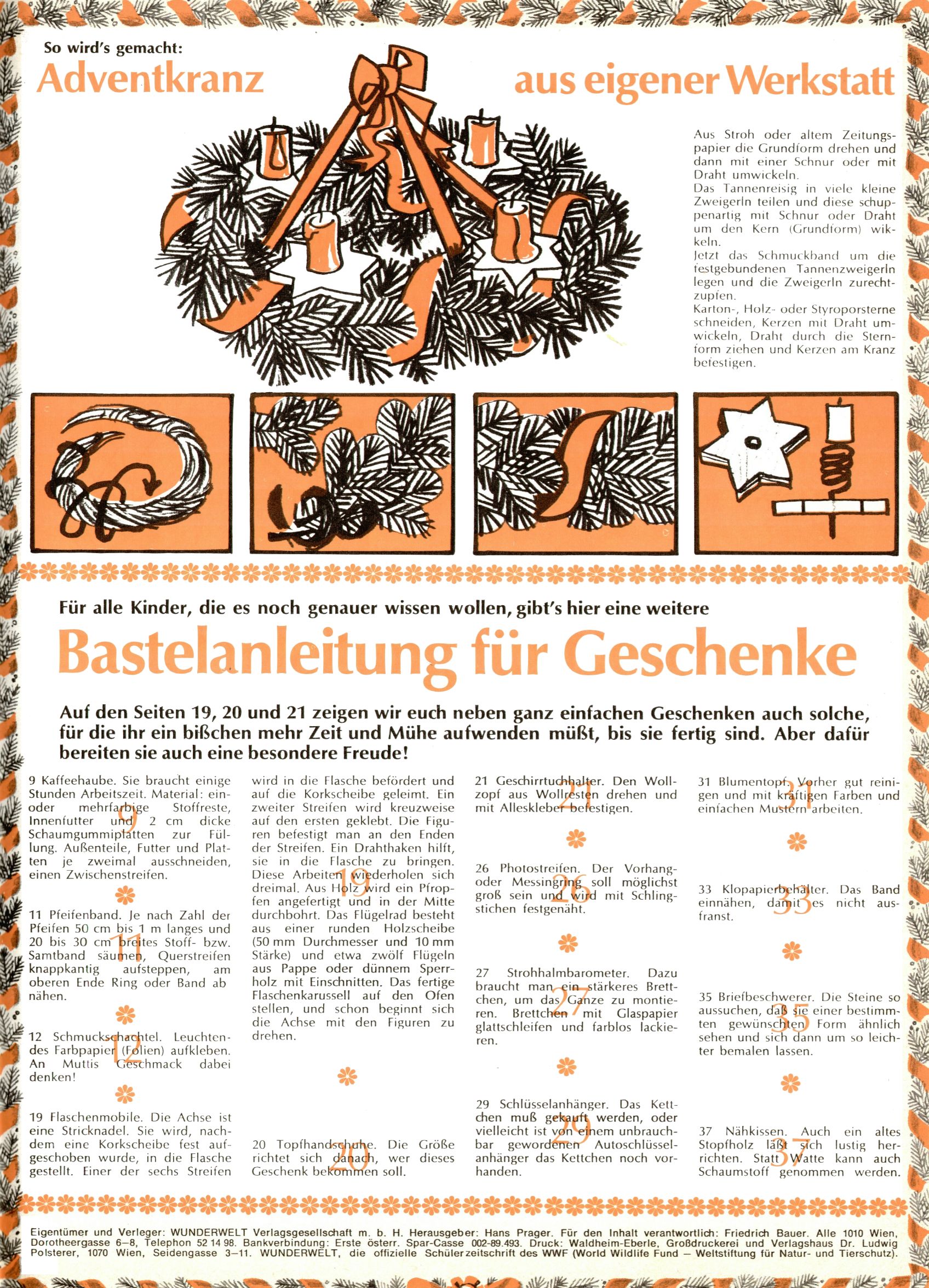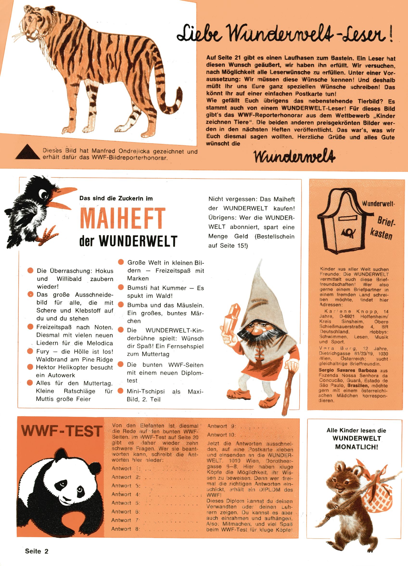1971 - Rückkehr zur Normalität? 1971 gab es erstmals wieder die geplanten 12 Zeitschriften in einem Jahr. Noch immer war Rosl Warzilek beim Team. Hella Soyka hatte sich mittlerweile eingelebt und auch Christian Raffeiner gehörte bereits dazu. TA Teja Aicher tat, was ihm gerade in den Sinn kam. Im 11. Heft versetzte er seinem Zwerg Bumsti einen neuen Tiefschlag, indem er diesen ab nun durch Sprechblasen kommunizieren ließ. Die Welt von Bumsti war fortan eine andere, in der die Ratten das Sagen hatten. Dies war ganz offensichtlich ein neuer bitterer Zynismus von TA. Aber es sollte noch besser kommen. Mit Perry und Silia schuf TA eine Saubermann-Serie, in der er sich selbst als namenloser Kater die Drecksarbeit machen ließ, während andere den Lohn ernteten. Hätte die Redaktionsleitung TAs Sarkasmus durchschaut, hätte dieser wohl längst seine Sachen packen dürfen. Aber so konnte TA seinen heimlichen Rachefeldzug ungehindert fortsetzen. Die Wunderwelt agierte um 1971 als Sprachrohr des WWF. Neben viel Werbung gab es eine Serie über das auch nicht mehr ganz zeitgemäße Briefmarkensammeln und einen Melodica-Kurs. In einem Akt der Verzweiflung wurde Mitte 1971 nochmals Willibald der Zauberlehrling ins Leben gerufen. Natürlich nur mit alten Abenteuern, denn Willibalds wahrer Meister Peter Paul Prinz hatte der Wunderwelt längst den Rücken gekehrt. Im Advent- und im Weihnachtsheft fand sich dann eine überraschende Anzahl von guten Bastelideen nach alter Tradition. Hatte die Wunderwelt doch noch eine Chance? |