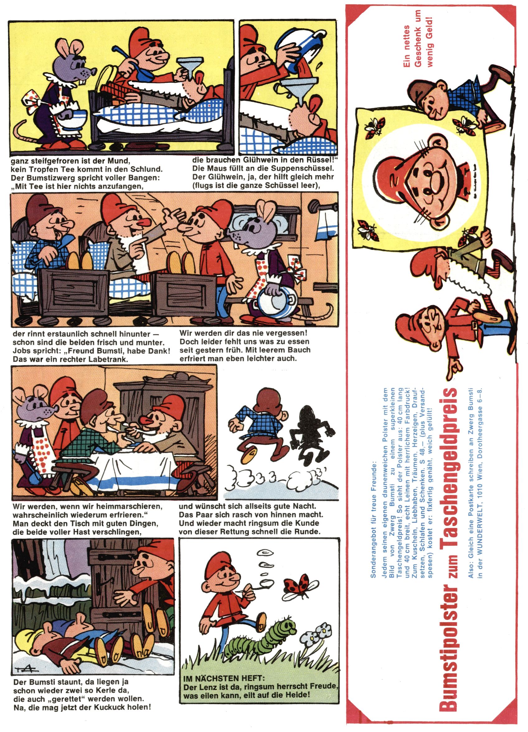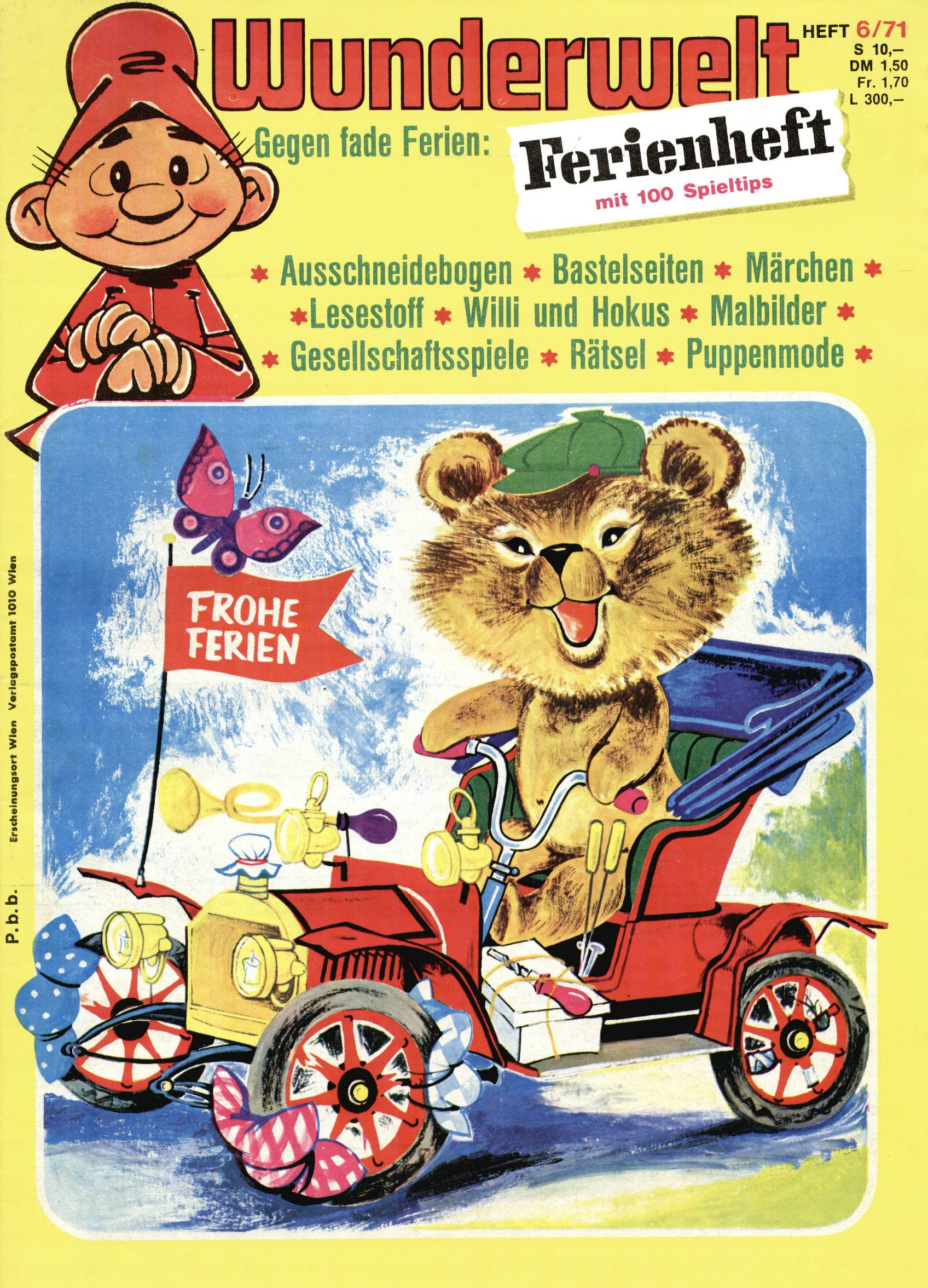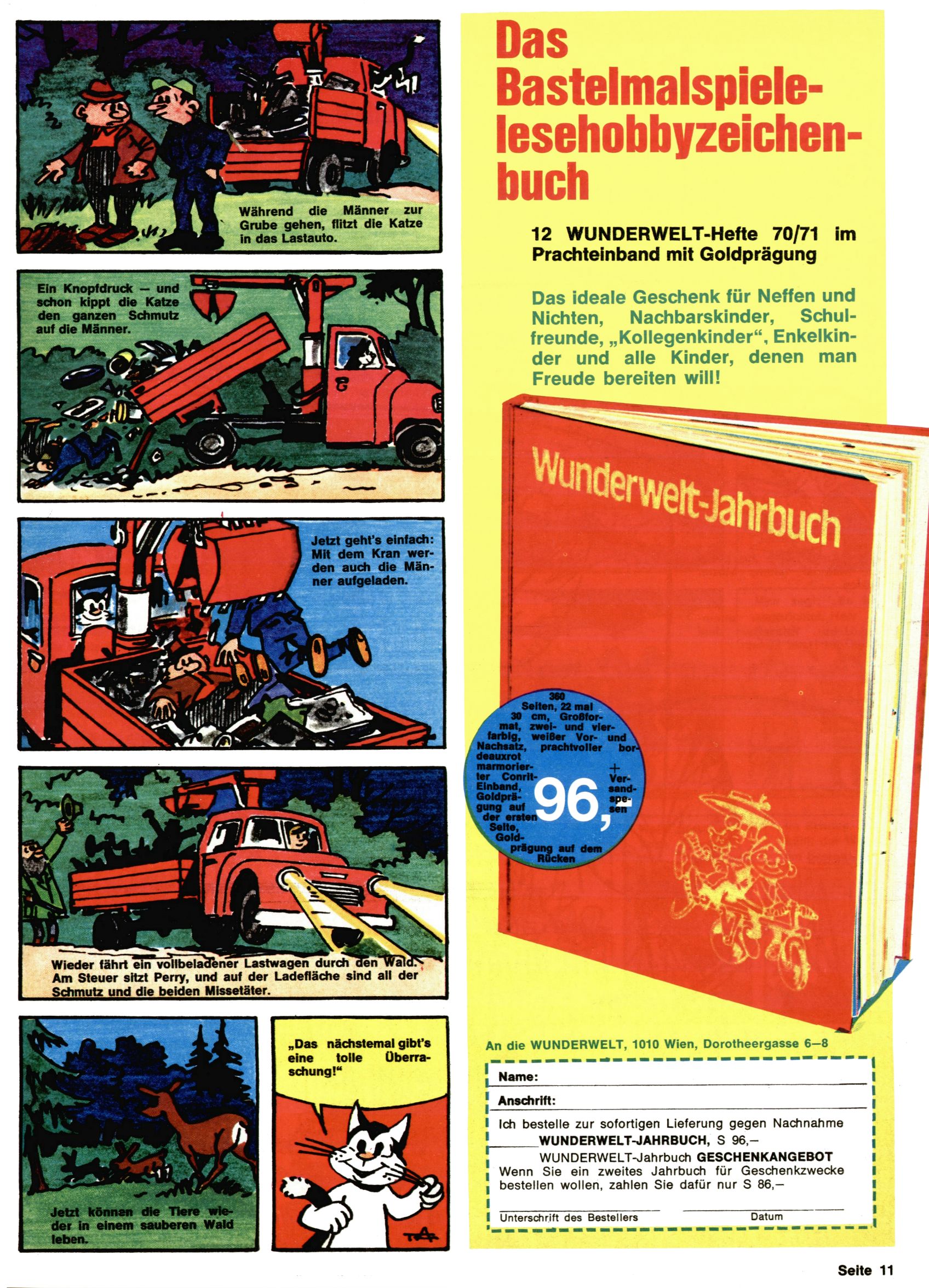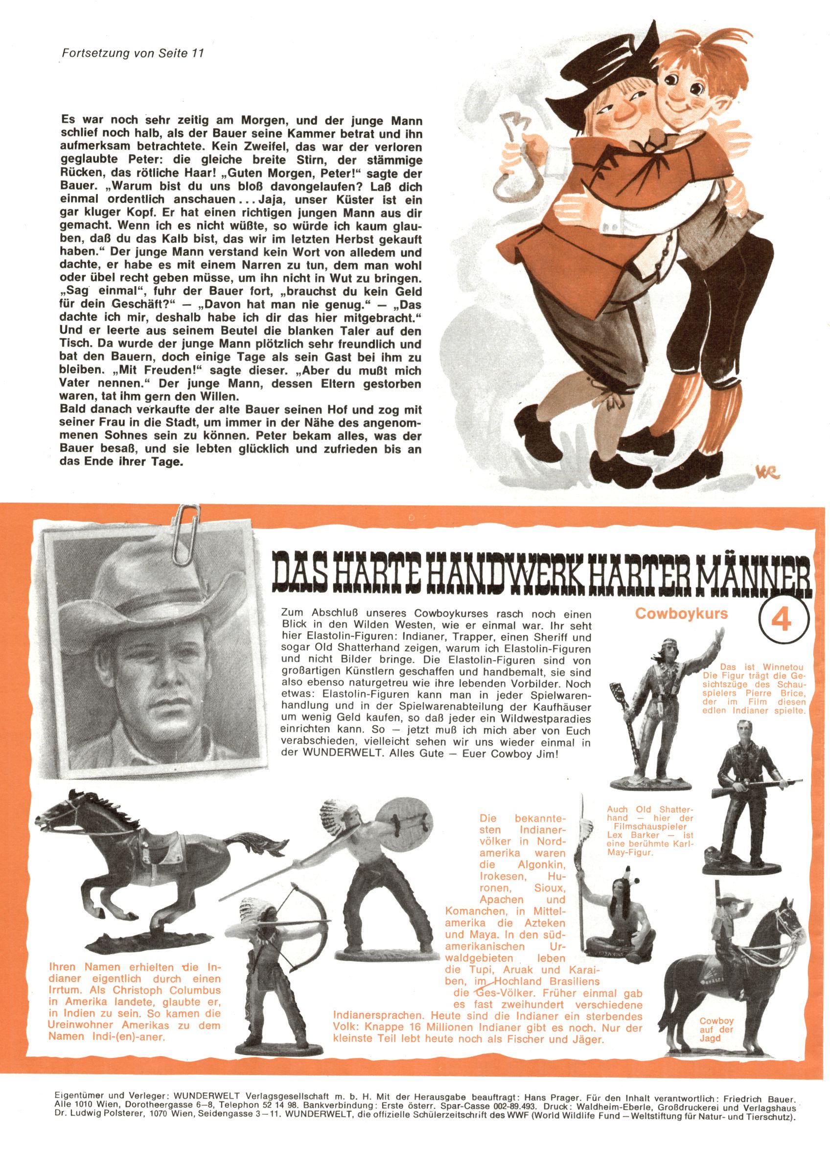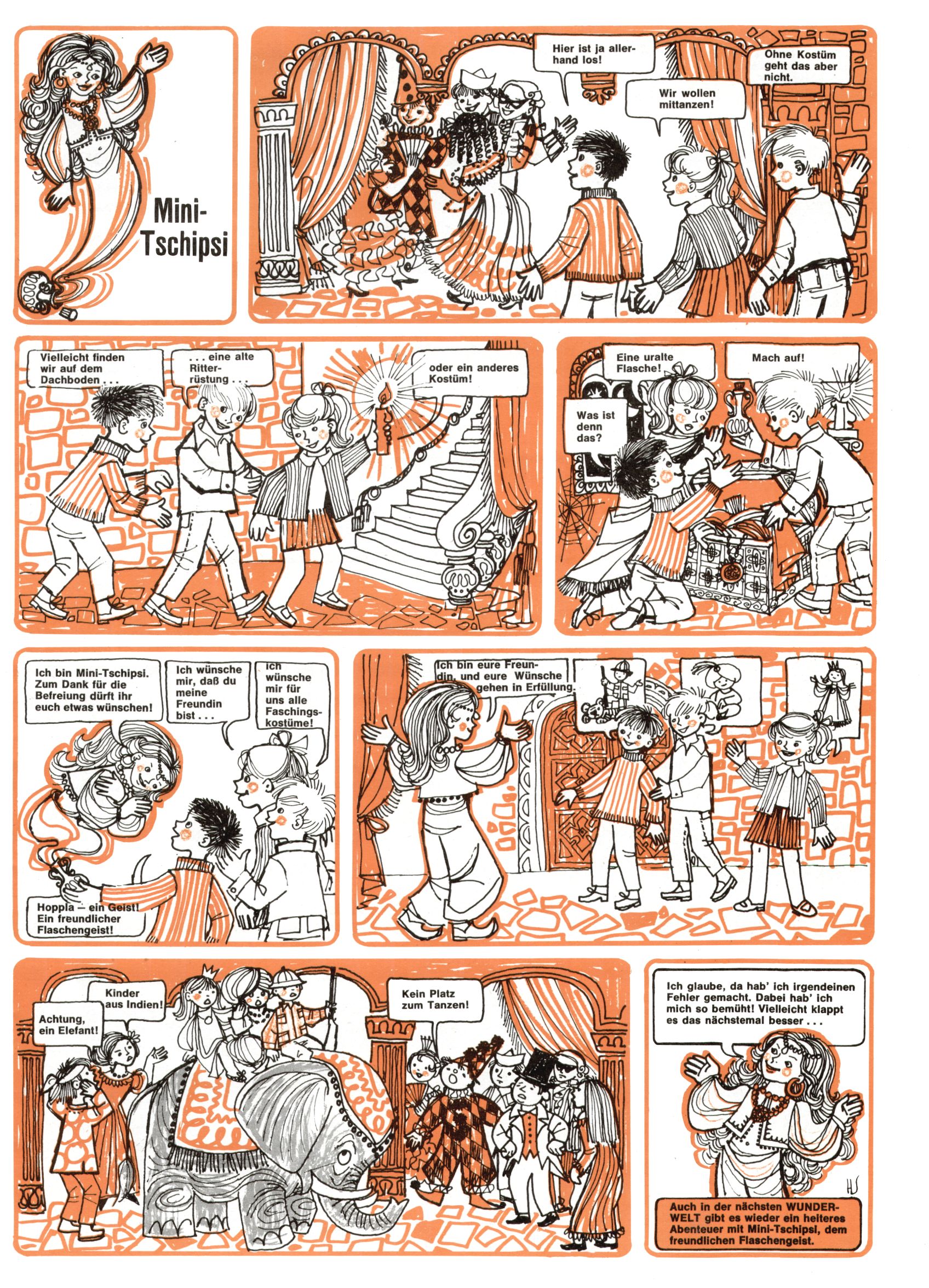 1971 - Rückkehr zur Normalität? 1971 gab es erstmals wieder die geplanten 12 Zeitschriften in einem Jahr. Noch immer war Rosl Warzilek beim Team. Hella Soyka hatte sich mittlerweile eingelebt und auch Christian Raffeiner gehörte bereits dazu. TA Teja Aicher tat, was ihm gerade in den Sinn kam. Im 11. Heft versetzte er seinem Zwerg Bumsti einen neuen Tiefschlag, indem er diesen ab nun durch Sprechblasen kommunizieren ließ. Die Welt von Bumsti war fortan eine andere, in der die Ratten das Sagen hatten. Dies war ganz offensichtlich ein neuer bitterer Zynismus von TA. Aber es sollte noch besser kommen. Mit Perry und Silia schuf TA eine Saubermann-Serie, in der er sich selbst als namenloser Kater die Drecksarbeit machen ließ, während andere den Lohn ernteten. Hätte die Redaktionsleitung TAs Sarkasmus durchschaut, hätte dieser wohl längst seine Sachen packen dürfen. Aber so konnte TA seinen heimlichen Rachefeldzug ungehindert fortsetzen. Die Wunderwelt agierte um 1971 als Sprachrohr des WWF. Neben viel Werbung gab es eine Serie über das auch nicht mehr ganz zeitgemäße Briefmarkensammeln und einen Melodica-Kurs. In einem Akt der Verzweiflung wurde Mitte 1971 nochmals Willibald der Zauberlehrling ins Leben gerufen. Natürlich nur mit alten Abenteuern, denn Willibalds wahrer Meister Peter Paul Prinz hatte der Wunderwelt längst den Rücken gekehrt. Im Advent- und im Weihnachtsheft fand sich dann eine überraschende Anzahl von guten Bastelideen nach alter Tradition. Hatte die Wunderwelt doch noch eine Chance? |