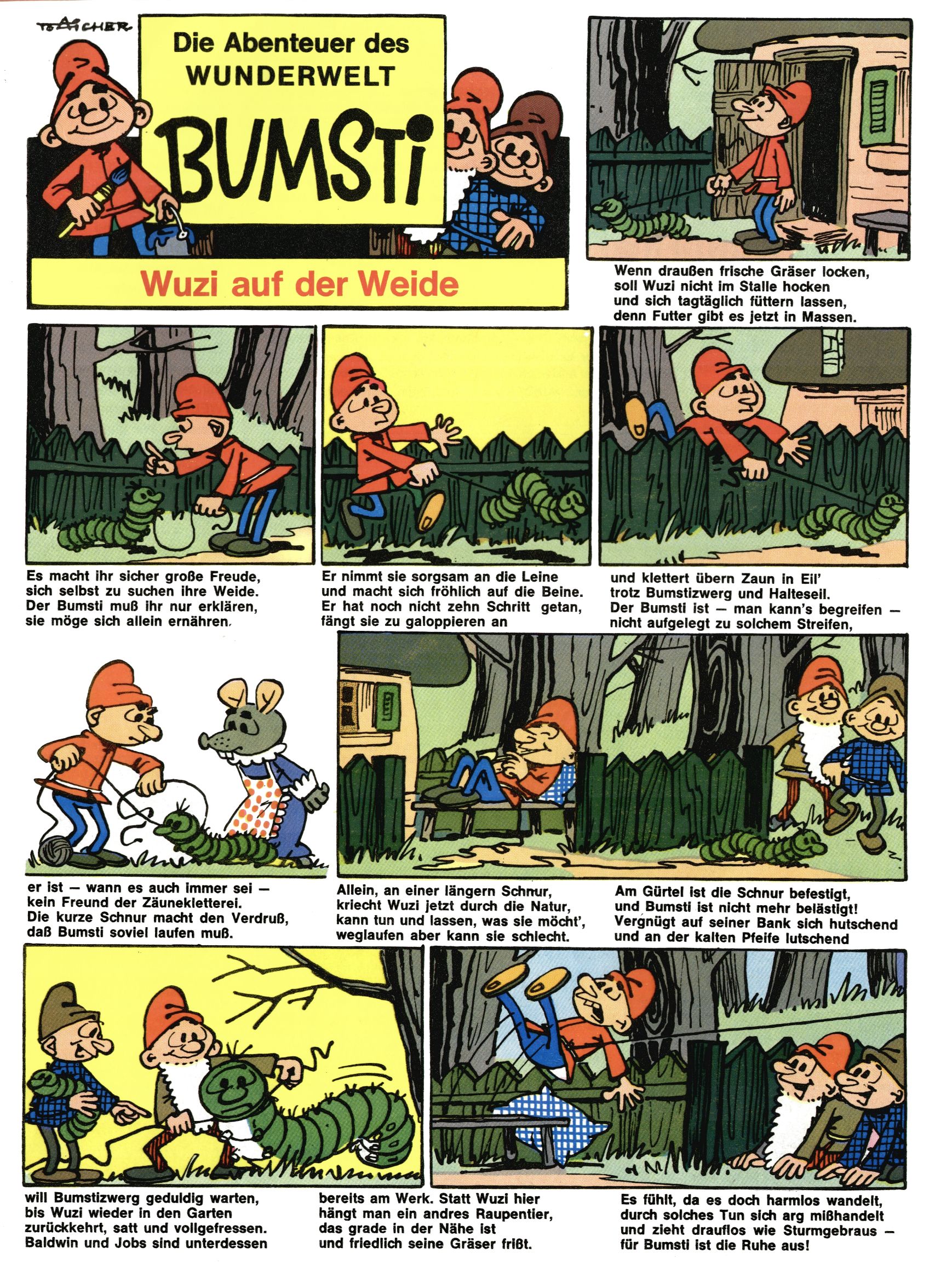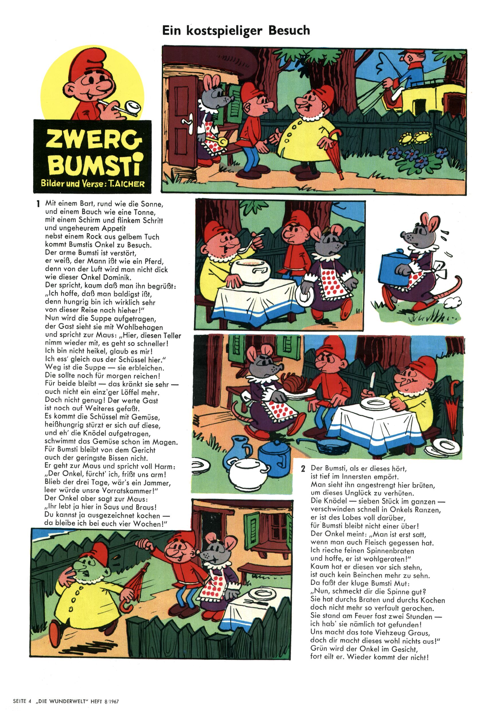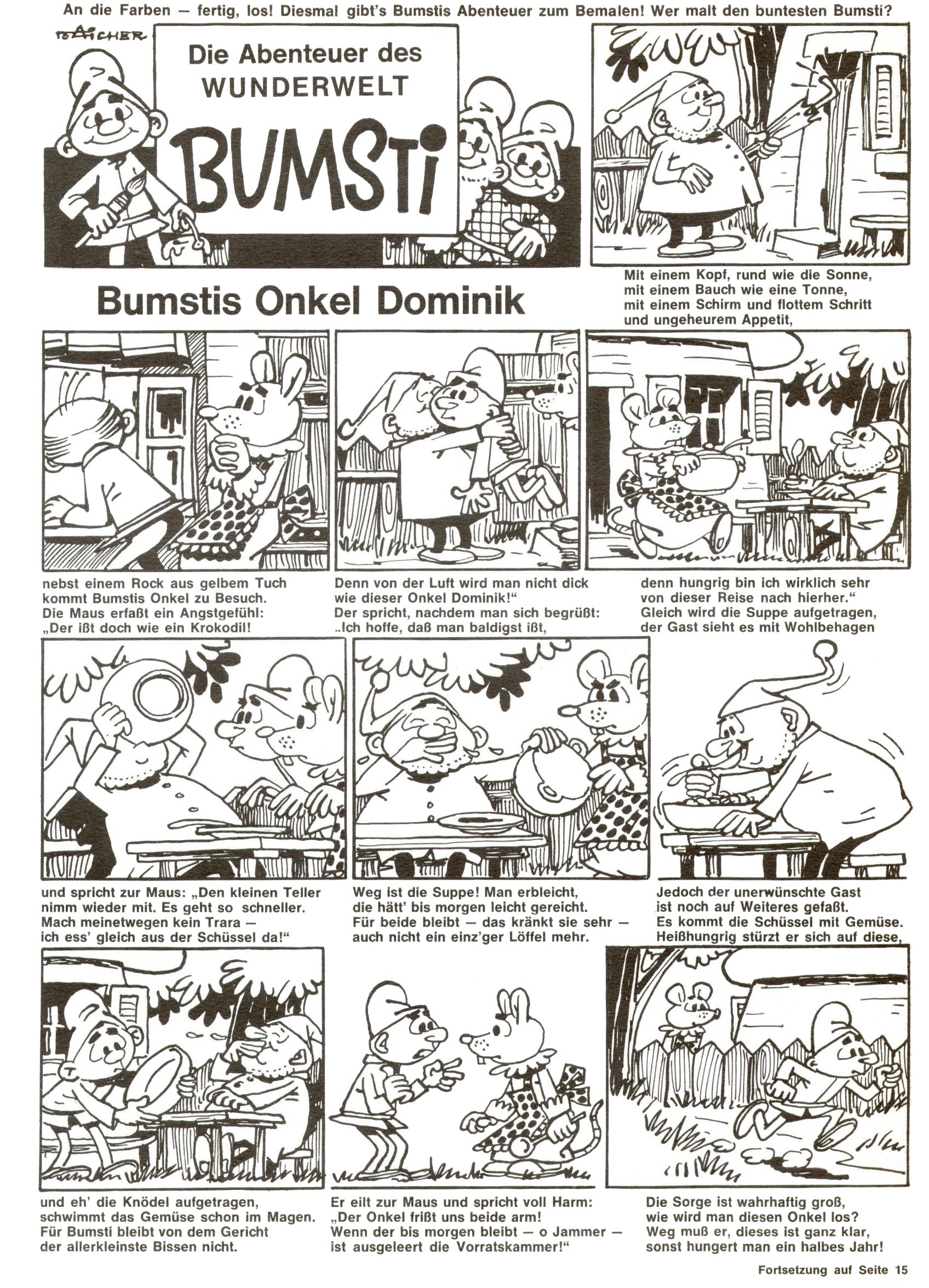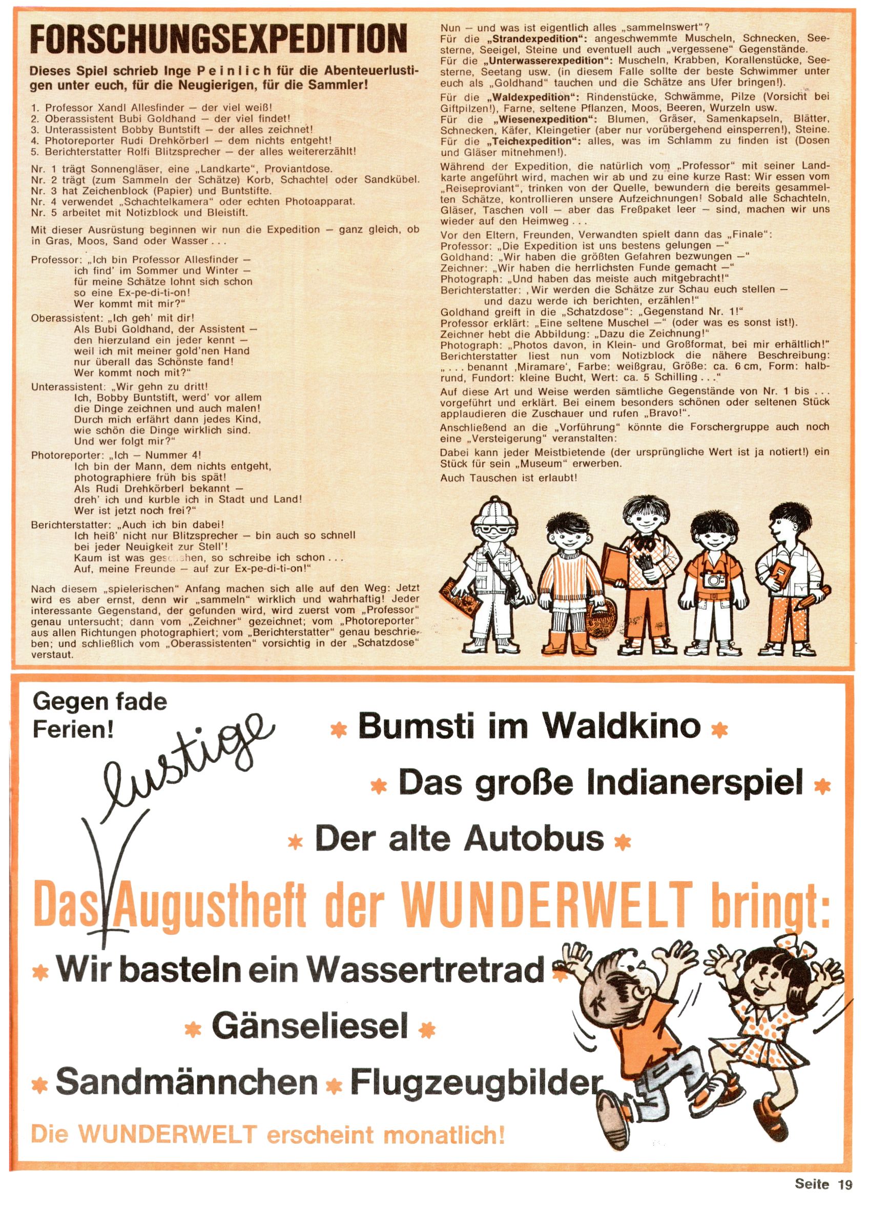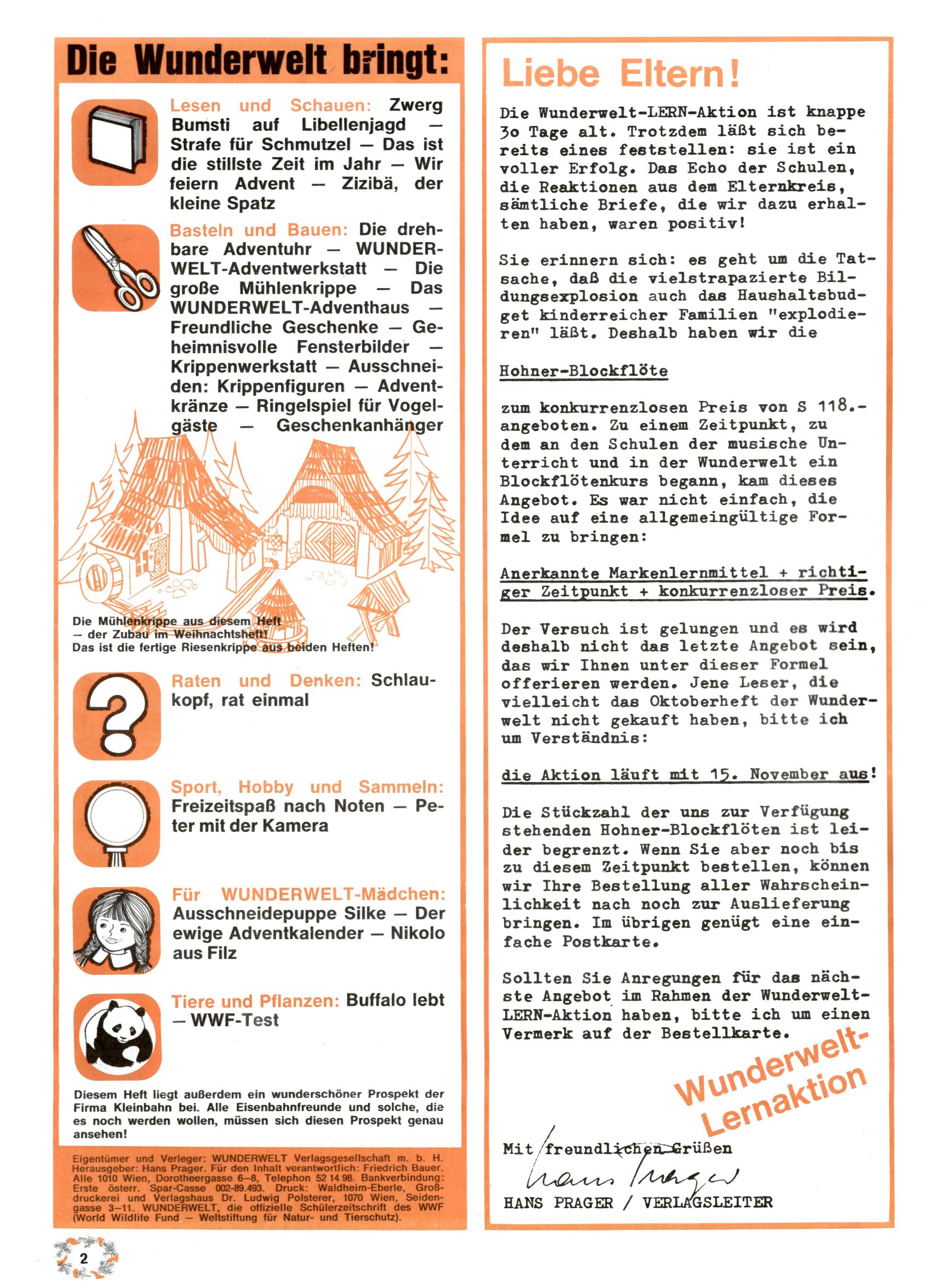 1971 - Rückkehr zur Normalität? 1971 gab es erstmals wieder die geplanten 12 Zeitschriften in einem Jahr. Noch immer war Rosl Warzilek beim Team. Hella Soyka hatte sich mittlerweile eingelebt und auch Christian Raffeiner gehörte bereits dazu. TA Teja Aicher tat, was ihm gerade in den Sinn kam. Im 11. Heft versetzte er seinem Zwerg Bumsti einen neuen Tiefschlag, indem er diesen ab nun durch Sprechblasen kommunizieren ließ. Die Welt von Bumsti war fortan eine andere, in der die Ratten das Sagen hatten. Dies war ganz offensichtlich ein neuer bitterer Zynismus von TA. Aber es sollte noch besser kommen. Mit Perry und Silia schuf TA eine Saubermann-Serie, in der er sich selbst als namenloser Kater die Drecksarbeit machen ließ, während andere den Lohn ernteten. Hätte die Redaktionsleitung TAs Sarkasmus durchschaut, hätte dieser wohl längst seine Sachen packen dürfen. Aber so konnte TA seinen heimlichen Rachefeldzug ungehindert fortsetzen. Die Wunderwelt agierte um 1971 als Sprachrohr des WWF. Neben viel Werbung gab es eine Serie über das auch nicht mehr ganz zeitgemäße Briefmarkensammeln und einen Melodica-Kurs. In einem Akt der Verzweiflung wurde Mitte 1971 nochmals Willibald der Zauberlehrling ins Leben gerufen. Natürlich nur mit alten Abenteuern, denn Willibalds wahrer Meister Peter Paul Prinz hatte der Wunderwelt längst den Rücken gekehrt. Im Advent- und im Weihnachtsheft fand sich dann eine überraschende Anzahl von guten Bastelideen nach alter Tradition. Hatte die Wunderwelt doch noch eine Chance? |