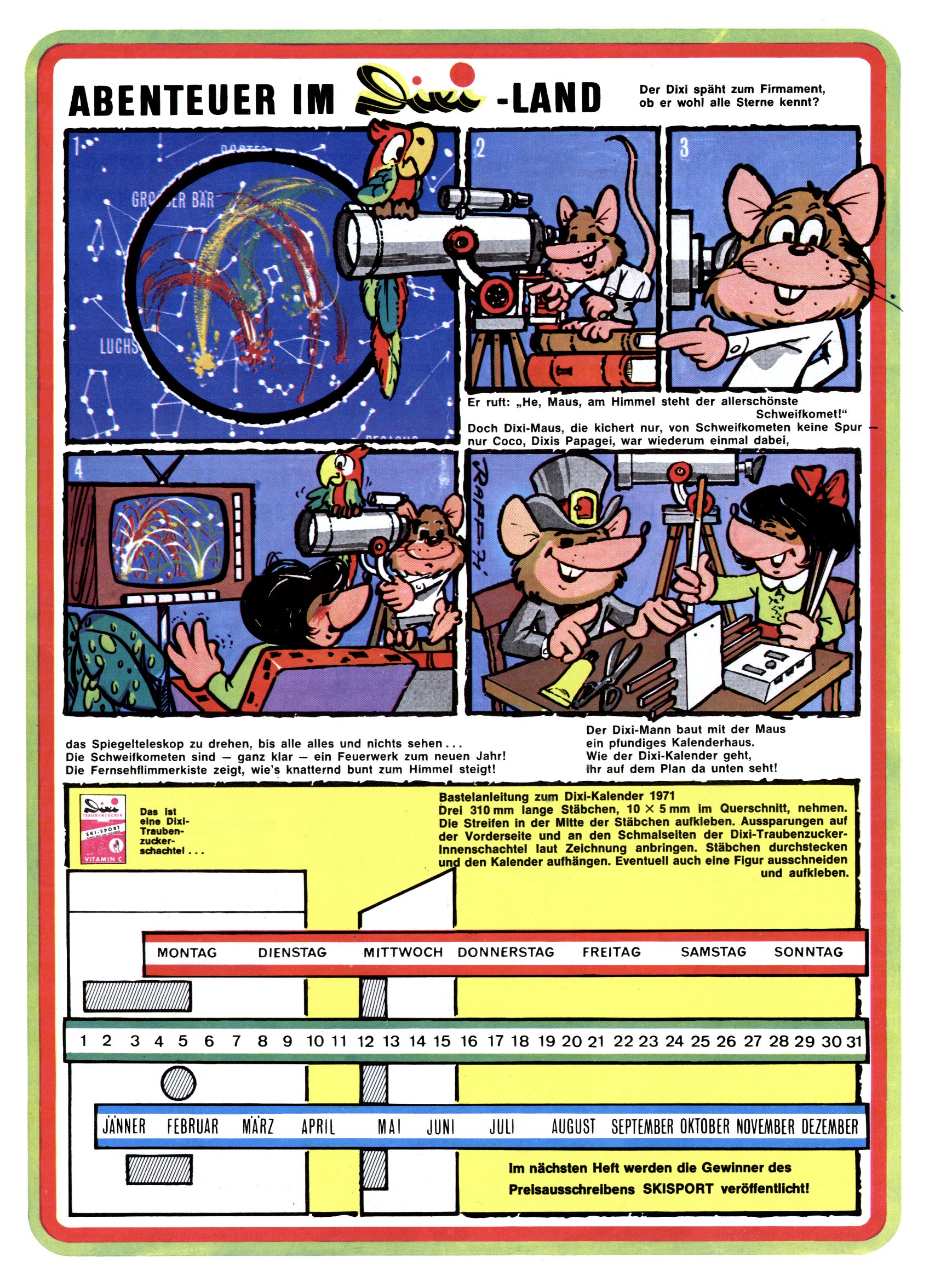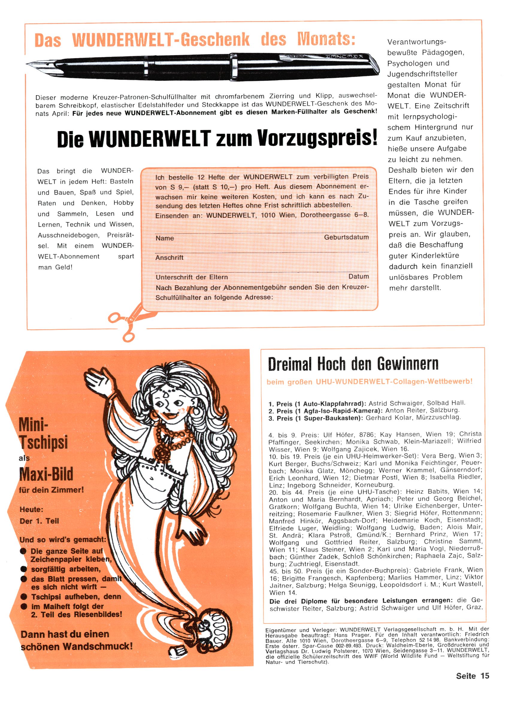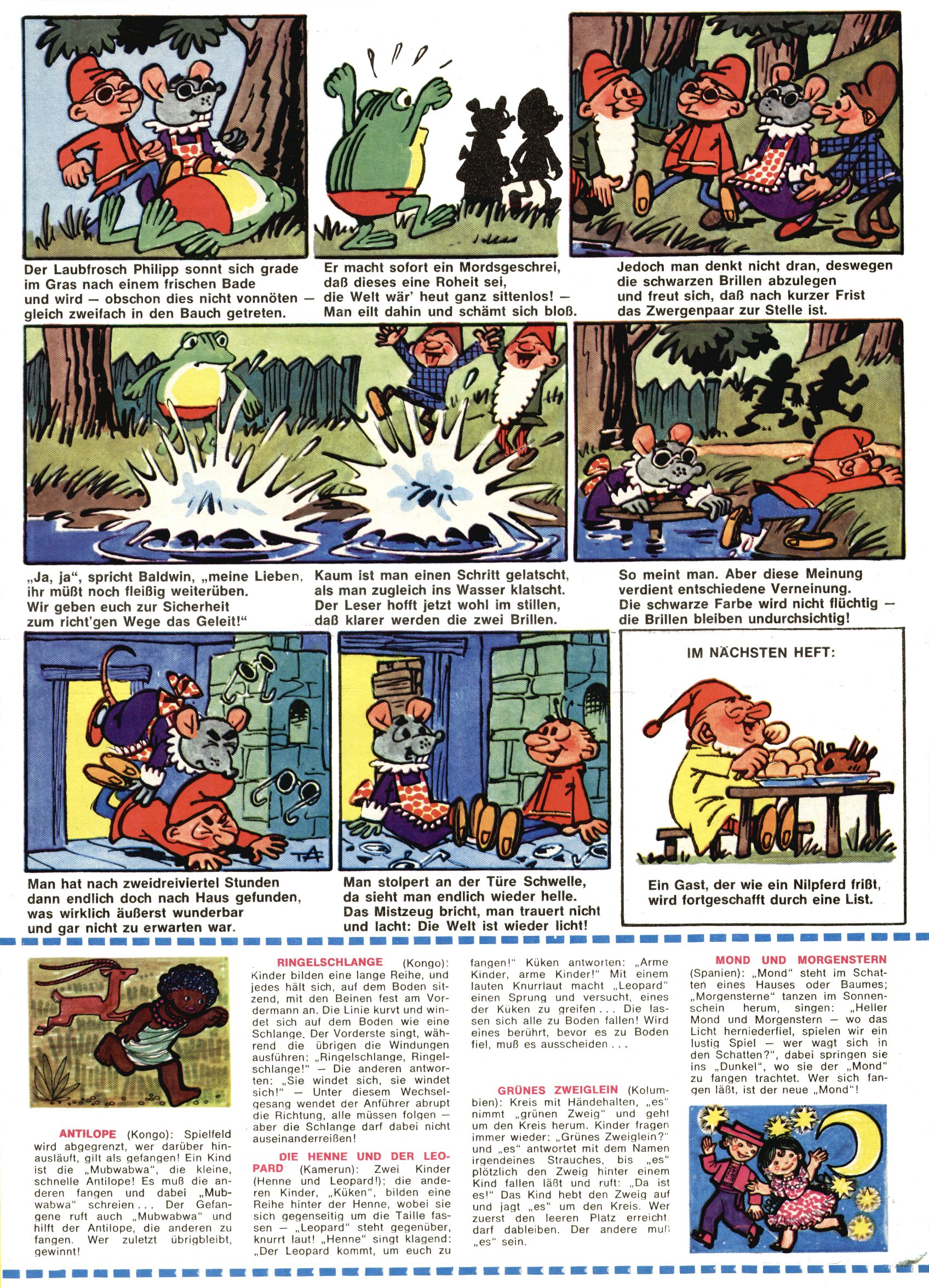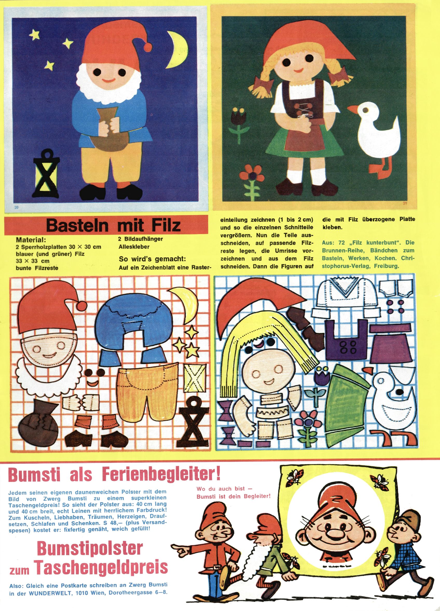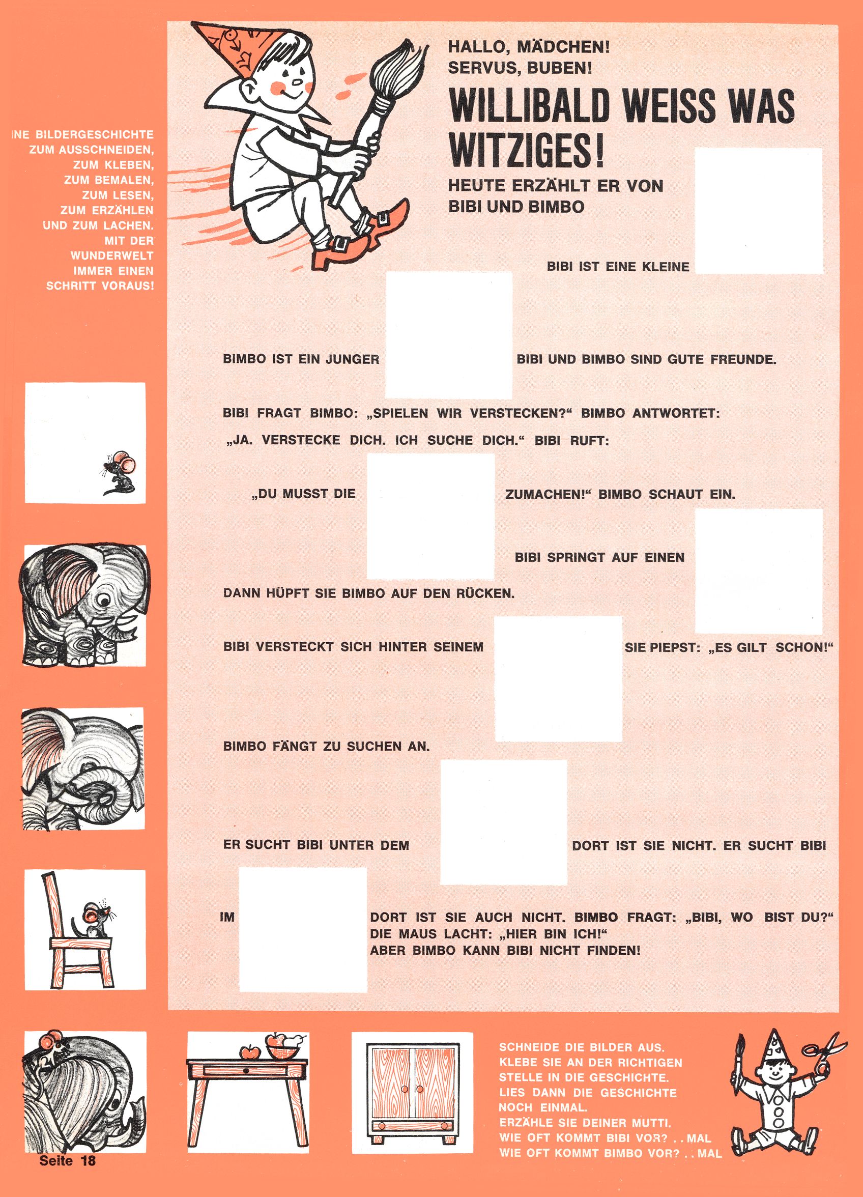 1971 - Rückkehr zur Normalität? 1971 gab es erstmals wieder die geplanten 12 Zeitschriften in einem Jahr. Noch immer war Rosl Warzilek beim Team. Hella Soyka hatte sich mittlerweile eingelebt und auch Christian Raffeiner gehörte bereits dazu. TA Teja Aicher tat, was ihm gerade in den Sinn kam. Im 11. Heft versetzte er seinem Zwerg Bumsti einen neuen Tiefschlag, indem er diesen ab nun durch Sprechblasen kommunizieren ließ. Die Welt von Bumsti war fortan eine andere, in der die Ratten das Sagen hatten. Dies war ganz offensichtlich ein neuer bitterer Zynismus von TA. Aber es sollte noch besser kommen. Mit Perry und Silia schuf TA eine Saubermann-Serie, in der er sich selbst als namenloser Kater die Drecksarbeit machen ließ, während andere den Lohn ernteten. Hätte die Redaktionsleitung TAs Sarkasmus durchschaut, hätte dieser wohl längst seine Sachen packen dürfen. Aber so konnte TA seinen heimlichen Rachefeldzug ungehindert fortsetzen. Die Wunderwelt agierte um 1971 als Sprachrohr des WWF. Neben viel Werbung gab es eine Serie über das auch nicht mehr ganz zeitgemäße Briefmarkensammeln und einen Melodica-Kurs. In einem Akt der Verzweiflung wurde Mitte 1971 nochmals Willibald der Zauberlehrling ins Leben gerufen. Natürlich nur mit alten Abenteuern, denn Willibalds wahrer Meister Peter Paul Prinz hatte der Wunderwelt längst den Rücken gekehrt. Im Advent- und im Weihnachtsheft fand sich dann eine überraschende Anzahl von guten Bastelideen nach alter Tradition. Hatte die Wunderwelt doch noch eine Chance? |