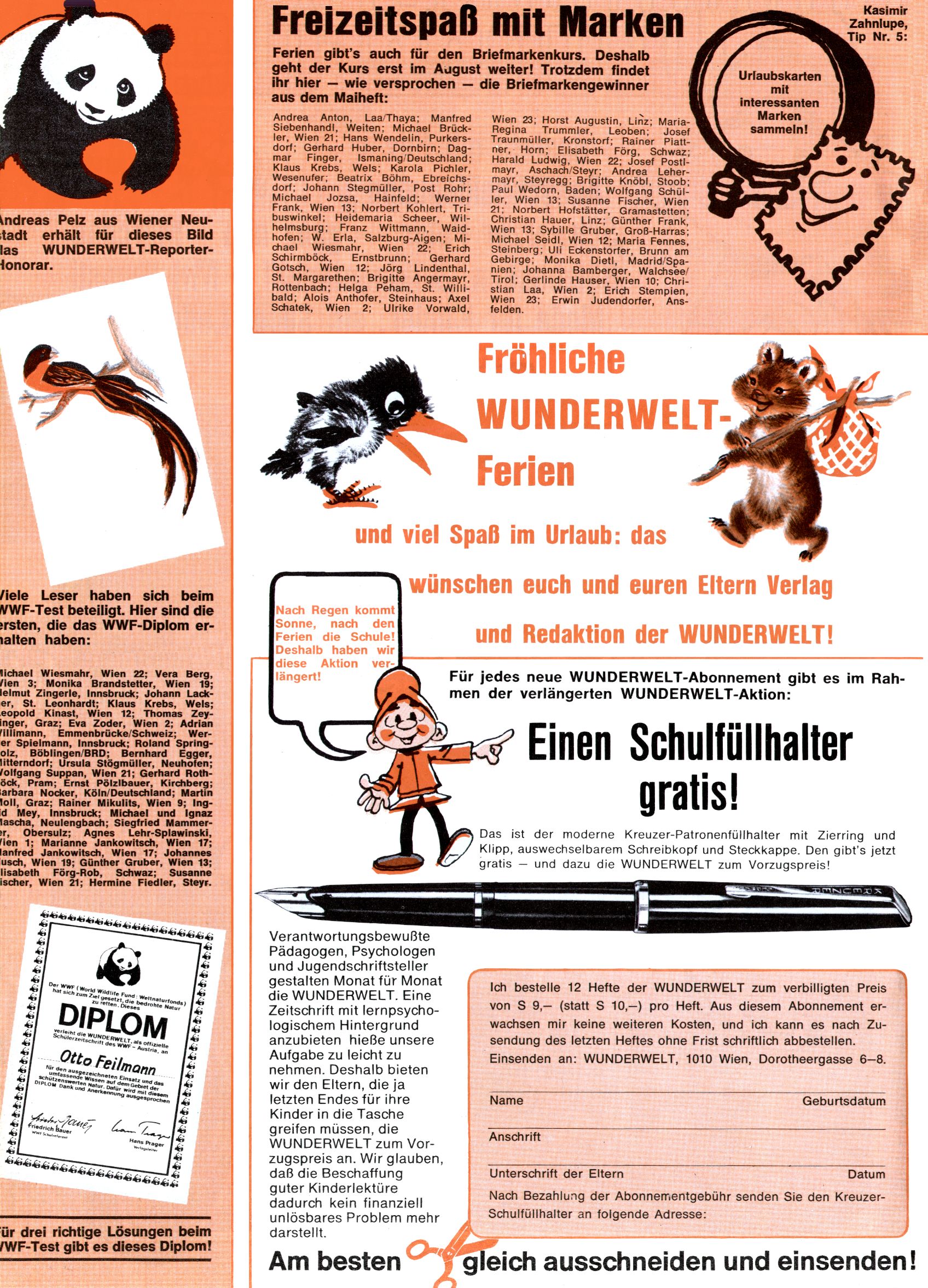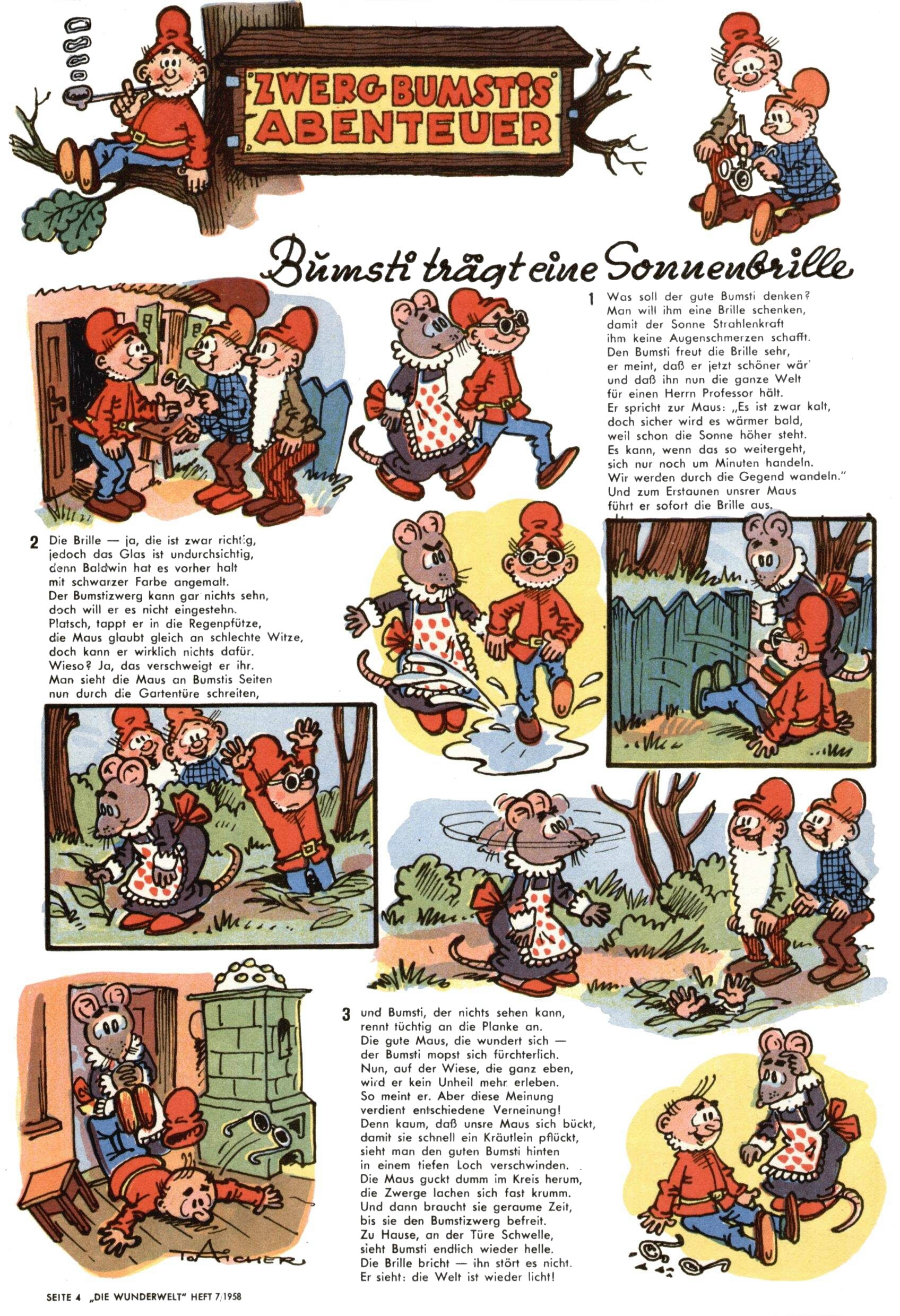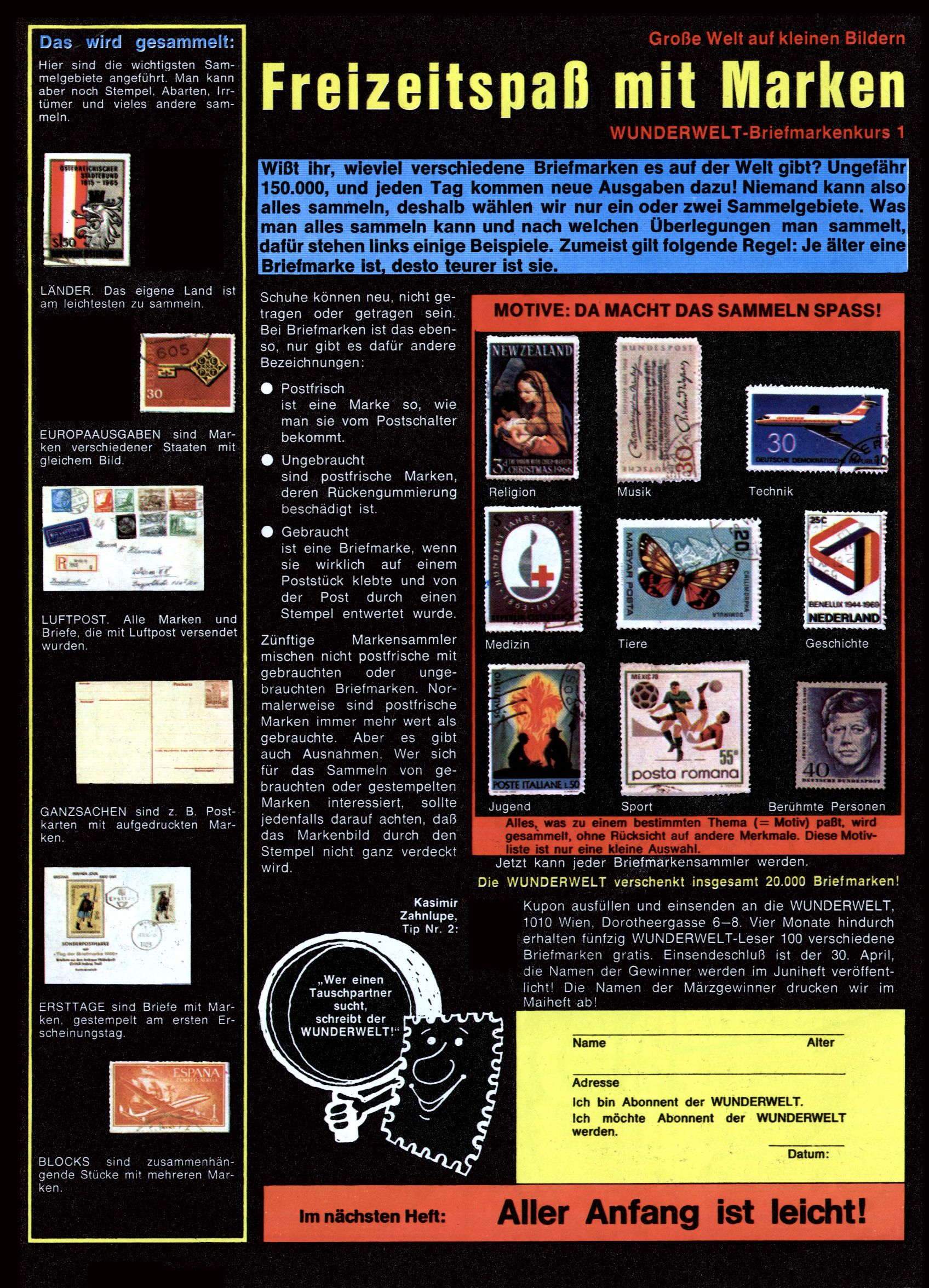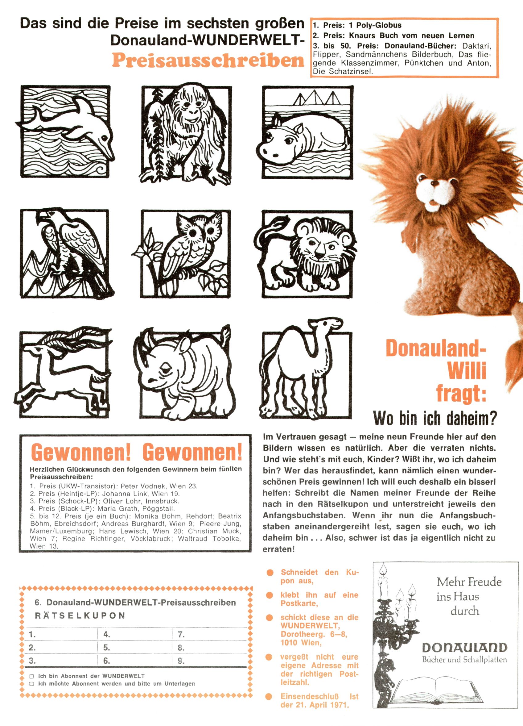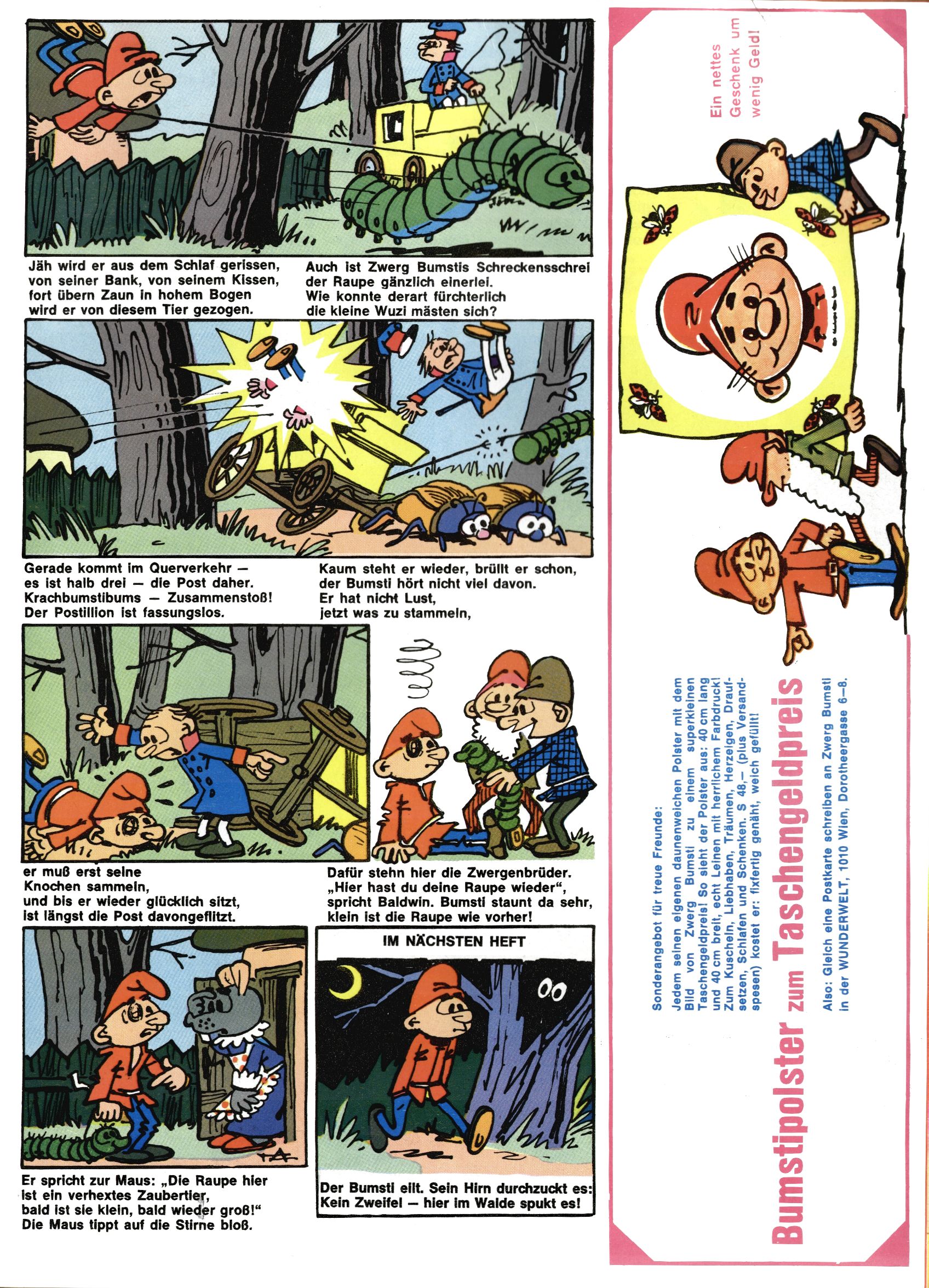 1971 - Rückkehr zur Normalität? 1971 gab es erstmals wieder die geplanten 12 Zeitschriften in einem Jahr. Noch immer war Rosl Warzilek beim Team. Hella Soyka hatte sich mittlerweile eingelebt und auch Christian Raffeiner gehörte bereits dazu. TA Teja Aicher tat, was ihm gerade in den Sinn kam. Im 11. Heft versetzte er seinem Zwerg Bumsti einen neuen Tiefschlag, indem er diesen ab nun durch Sprechblasen kommunizieren ließ. Die Welt von Bumsti war fortan eine andere, in der die Ratten das Sagen hatten. Dies war ganz offensichtlich ein neuer bitterer Zynismus von TA. Aber es sollte noch besser kommen. Mit Perry und Silia schuf TA eine Saubermann-Serie, in der er sich selbst als namenloser Kater die Drecksarbeit machen ließ, während andere den Lohn ernteten. Hätte die Redaktionsleitung TAs Sarkasmus durchschaut, hätte dieser wohl längst seine Sachen packen dürfen. Aber so konnte TA seinen heimlichen Rachefeldzug ungehindert fortsetzen. Die Wunderwelt agierte um 1971 als Sprachrohr des WWF. Neben viel Werbung gab es eine Serie über das auch nicht mehr ganz zeitgemäße Briefmarkensammeln und einen Melodica-Kurs. In einem Akt der Verzweiflung wurde Mitte 1971 nochmals Willibald der Zauberlehrling ins Leben gerufen. Natürlich nur mit alten Abenteuern, denn Willibalds wahrer Meister Peter Paul Prinz hatte der Wunderwelt längst den Rücken gekehrt. Im Advent- und im Weihnachtsheft fand sich dann eine überraschende Anzahl von guten Bastelideen nach alter Tradition. Hatte die Wunderwelt doch noch eine Chance? |