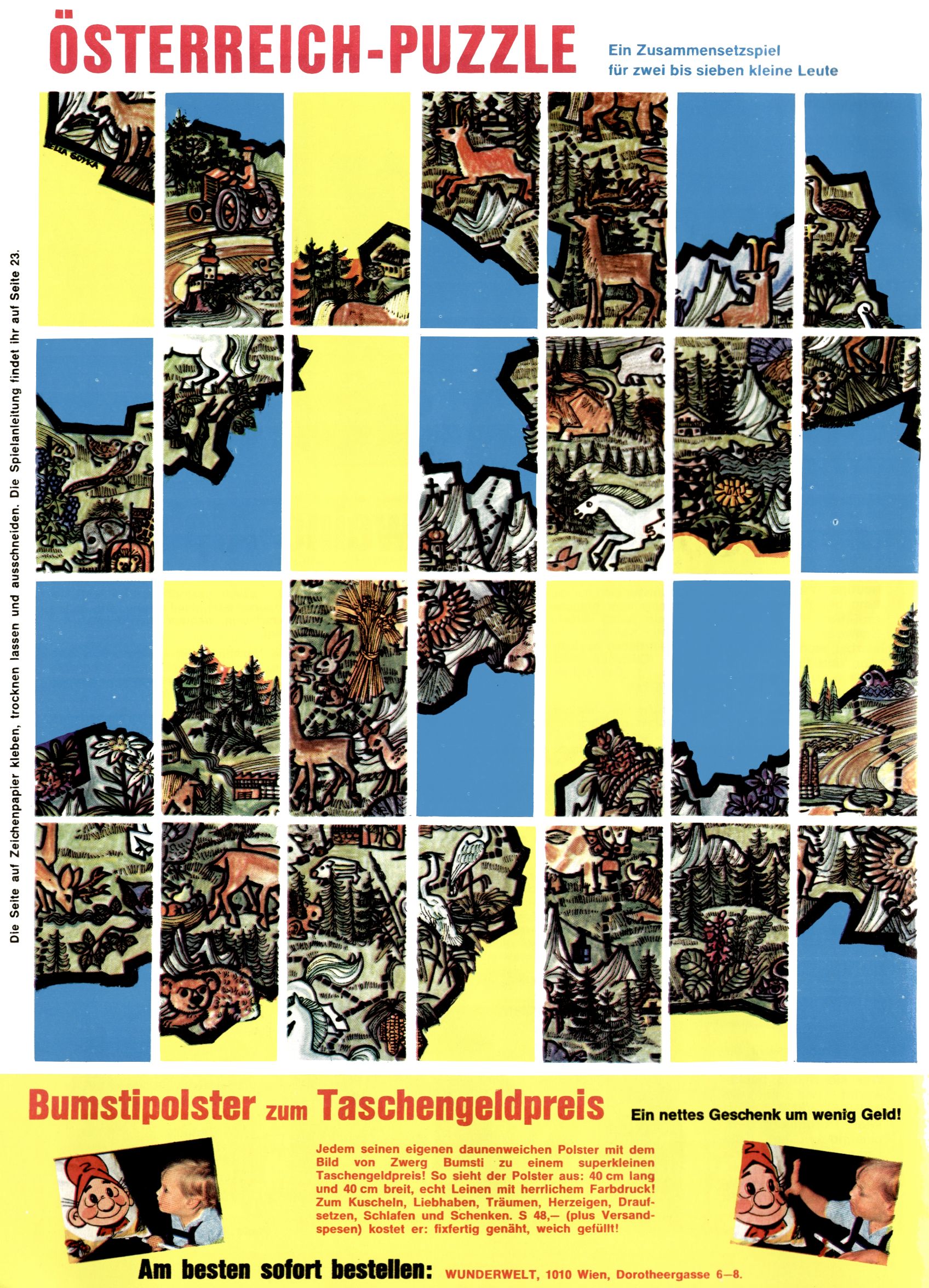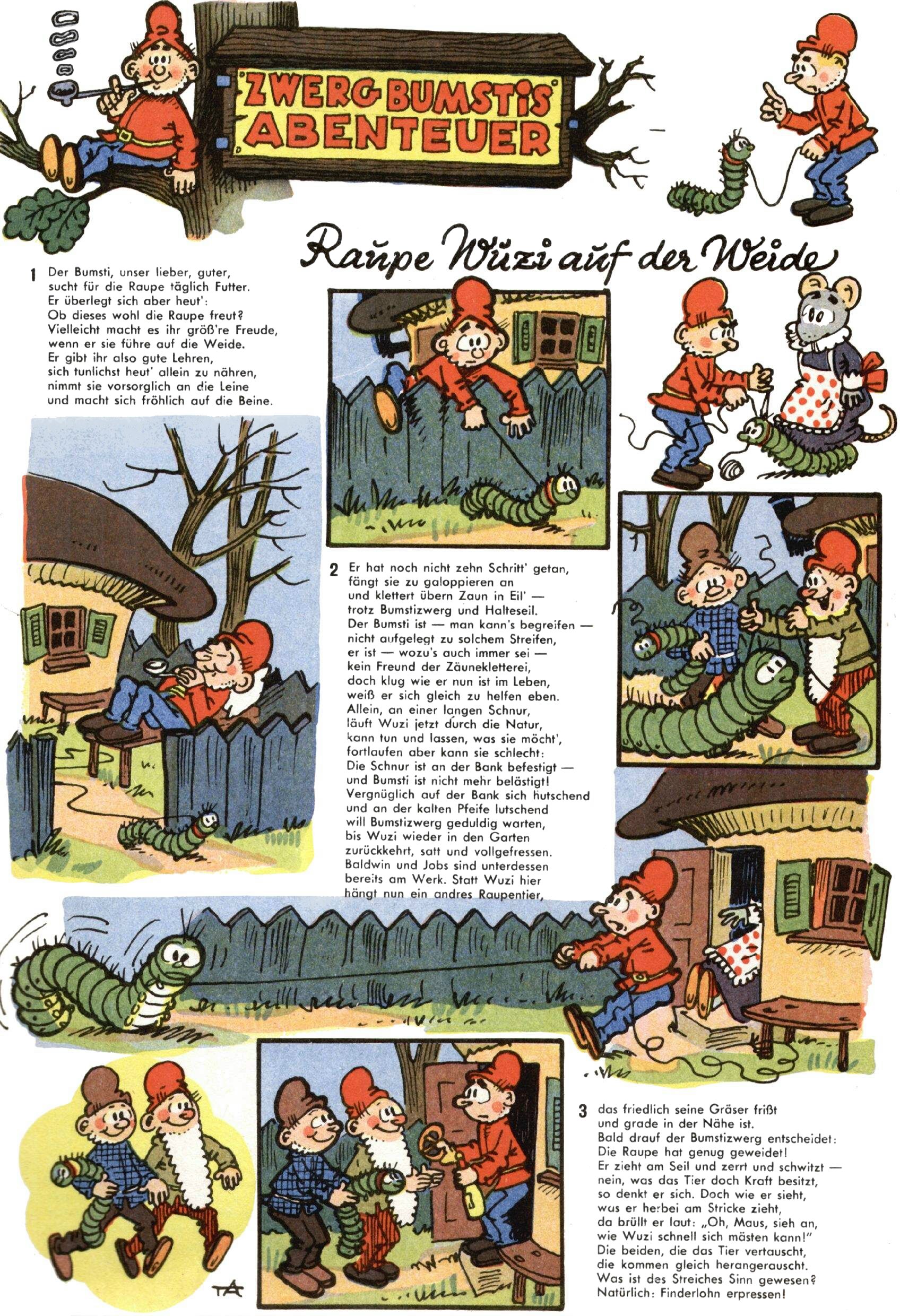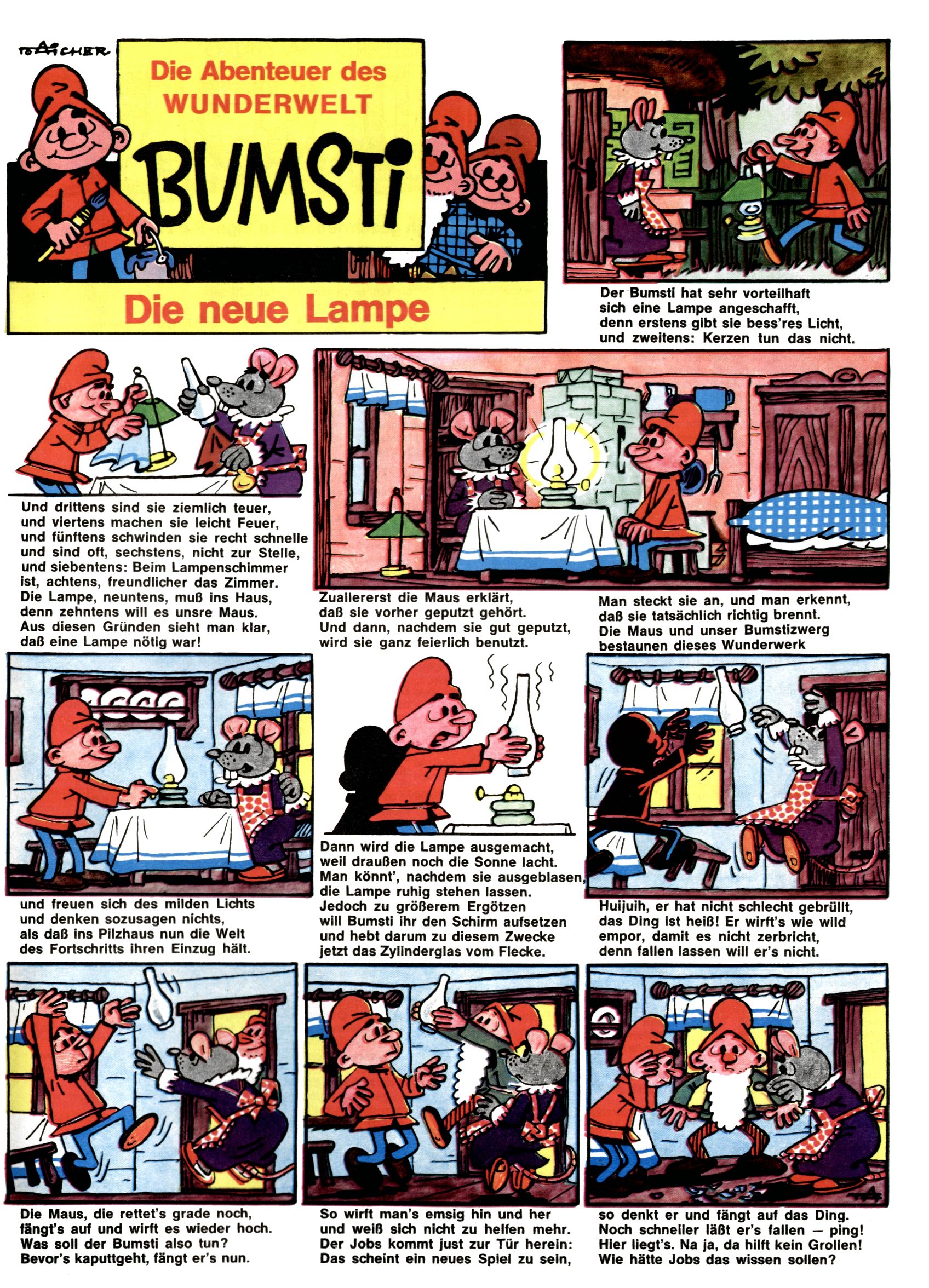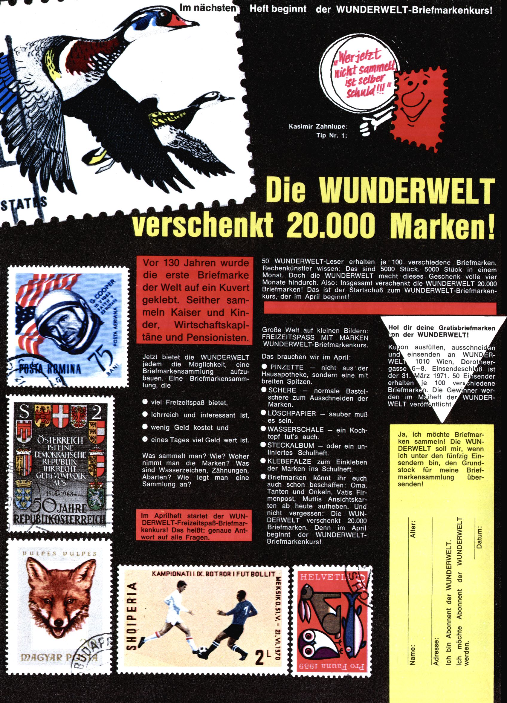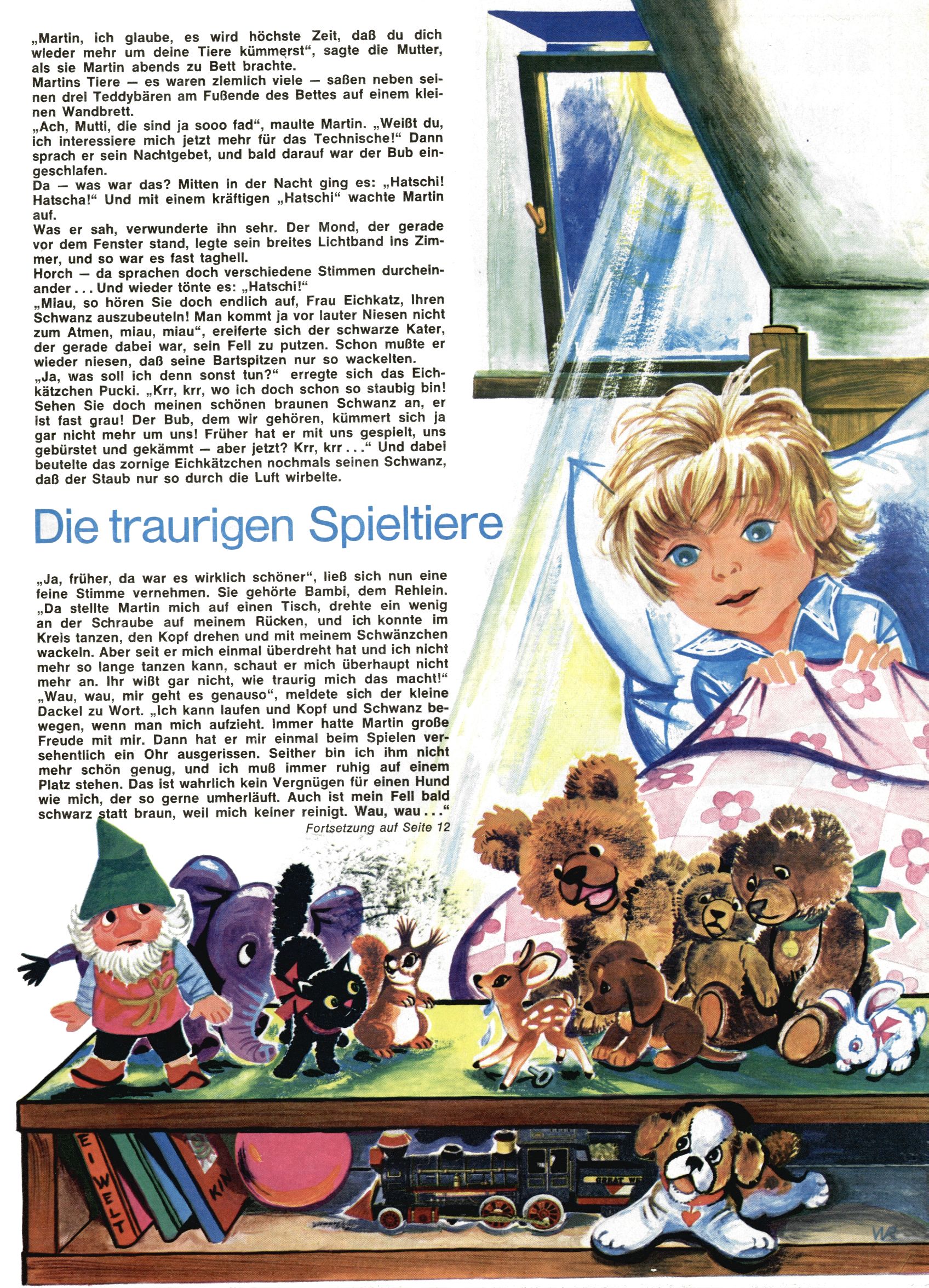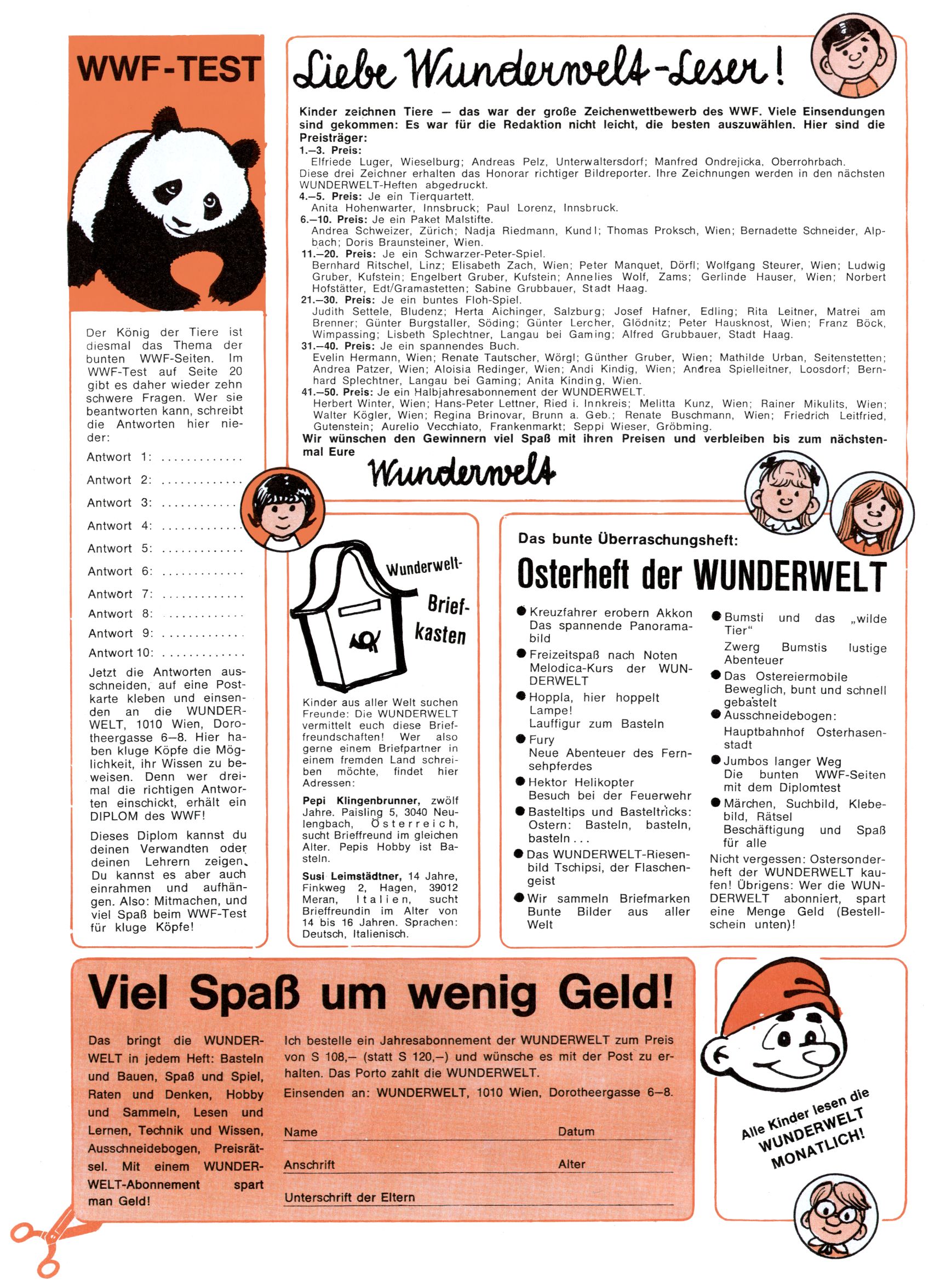 1971 - Rückkehr zur Normalität? 1971 gab es erstmals wieder die geplanten 12 Zeitschriften in einem Jahr. Noch immer war Rosl Warzilek beim Team. Hella Soyka hatte sich mittlerweile eingelebt und auch Christian Raffeiner gehörte bereits dazu. TA Teja Aicher tat, was ihm gerade in den Sinn kam. Im 11. Heft versetzte er seinem Zwerg Bumsti einen neuen Tiefschlag, indem er diesen ab nun durch Sprechblasen kommunizieren ließ. Die Welt von Bumsti war fortan eine andere, in der die Ratten das Sagen hatten. Dies war ganz offensichtlich ein neuer bitterer Zynismus von TA. Aber es sollte noch besser kommen. Mit Perry und Silia schuf TA eine Saubermann-Serie, in der er sich selbst als namenloser Kater die Drecksarbeit machen ließ, während andere den Lohn ernteten. Hätte die Redaktionsleitung TAs Sarkasmus durchschaut, hätte dieser wohl längst seine Sachen packen dürfen. Aber so konnte TA seinen heimlichen Rachefeldzug ungehindert fortsetzen. Die Wunderwelt agierte um 1971 als Sprachrohr des WWF. Neben viel Werbung gab es eine Serie über das auch nicht mehr ganz zeitgemäße Briefmarkensammeln und einen Melodica-Kurs. In einem Akt der Verzweiflung wurde Mitte 1971 nochmals Willibald der Zauberlehrling ins Leben gerufen. Natürlich nur mit alten Abenteuern, denn Willibalds wahrer Meister Peter Paul Prinz hatte der Wunderwelt längst den Rücken gekehrt. Im Advent- und im Weihnachtsheft fand sich dann eine überraschende Anzahl von guten Bastelideen nach alter Tradition. Hatte die Wunderwelt doch noch eine Chance? |