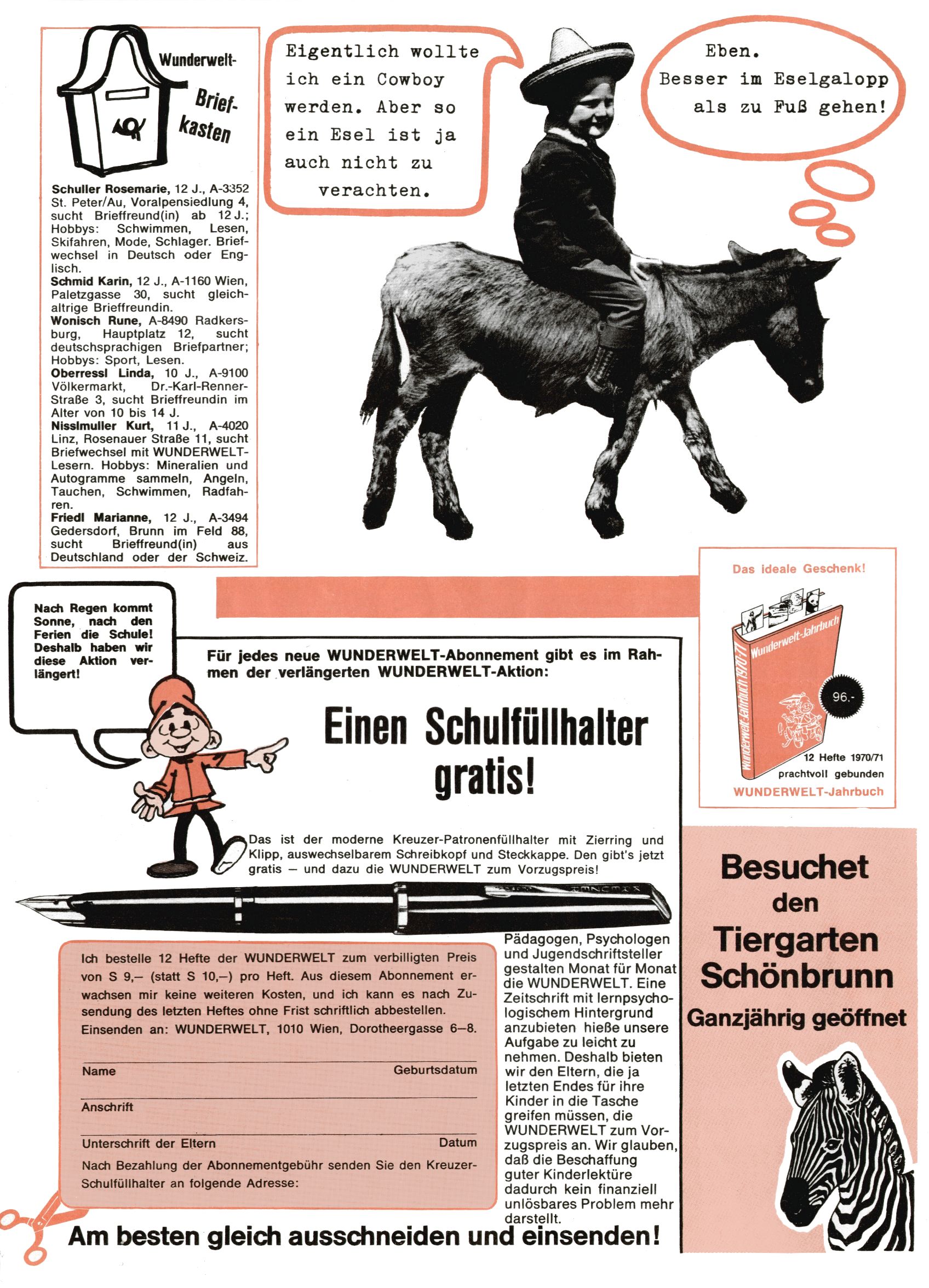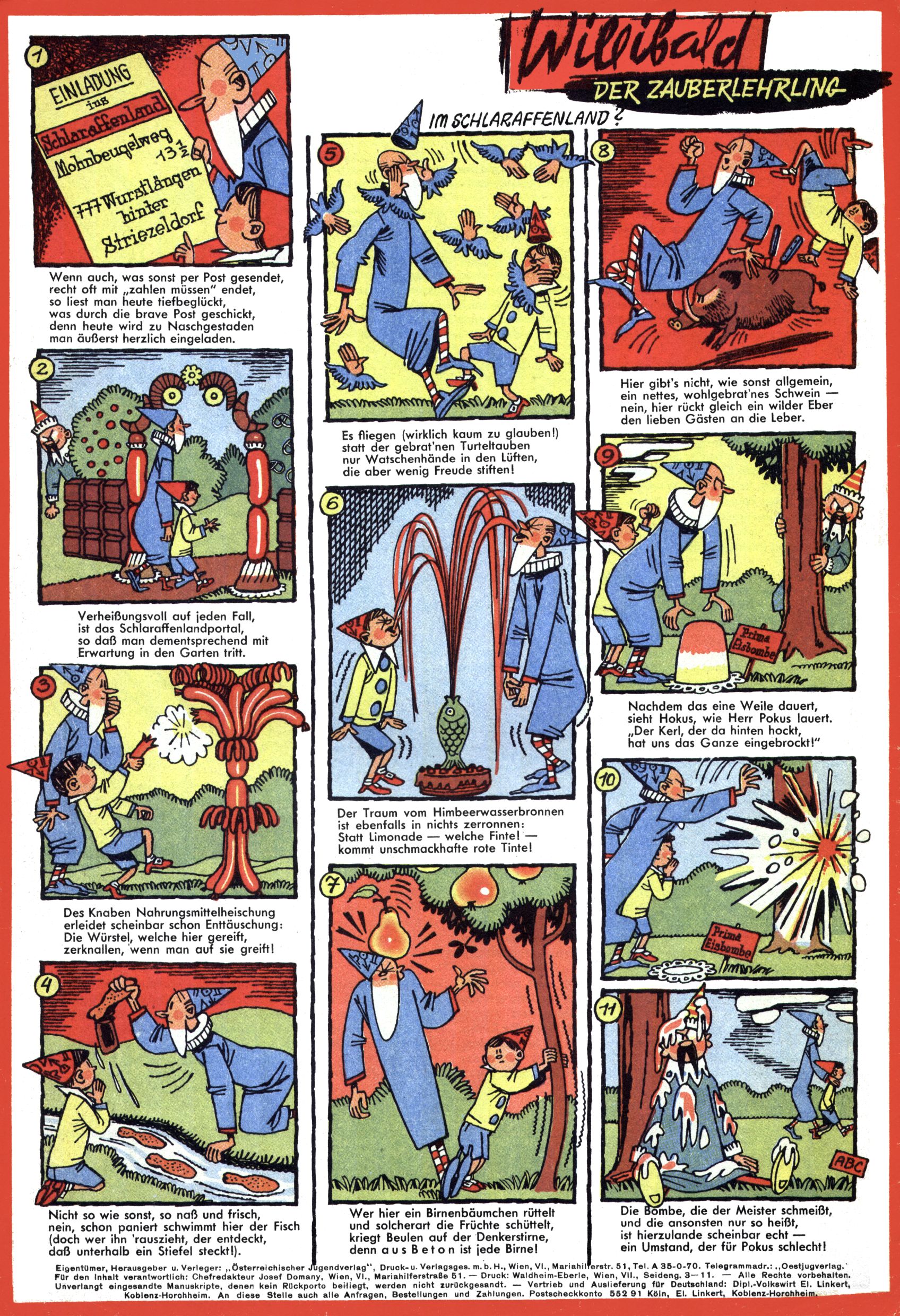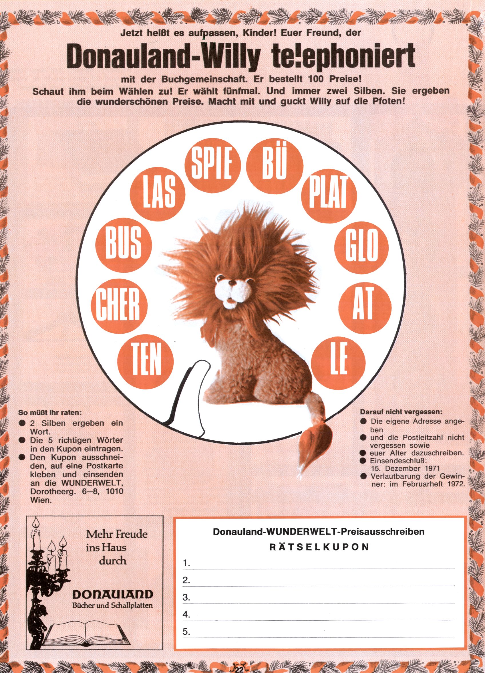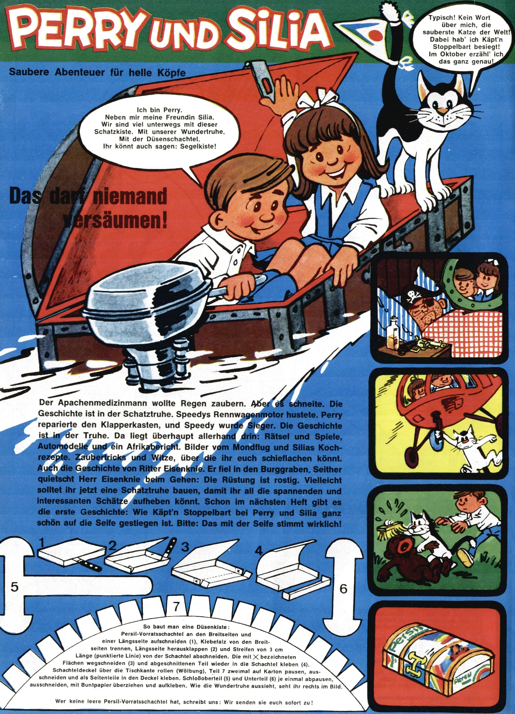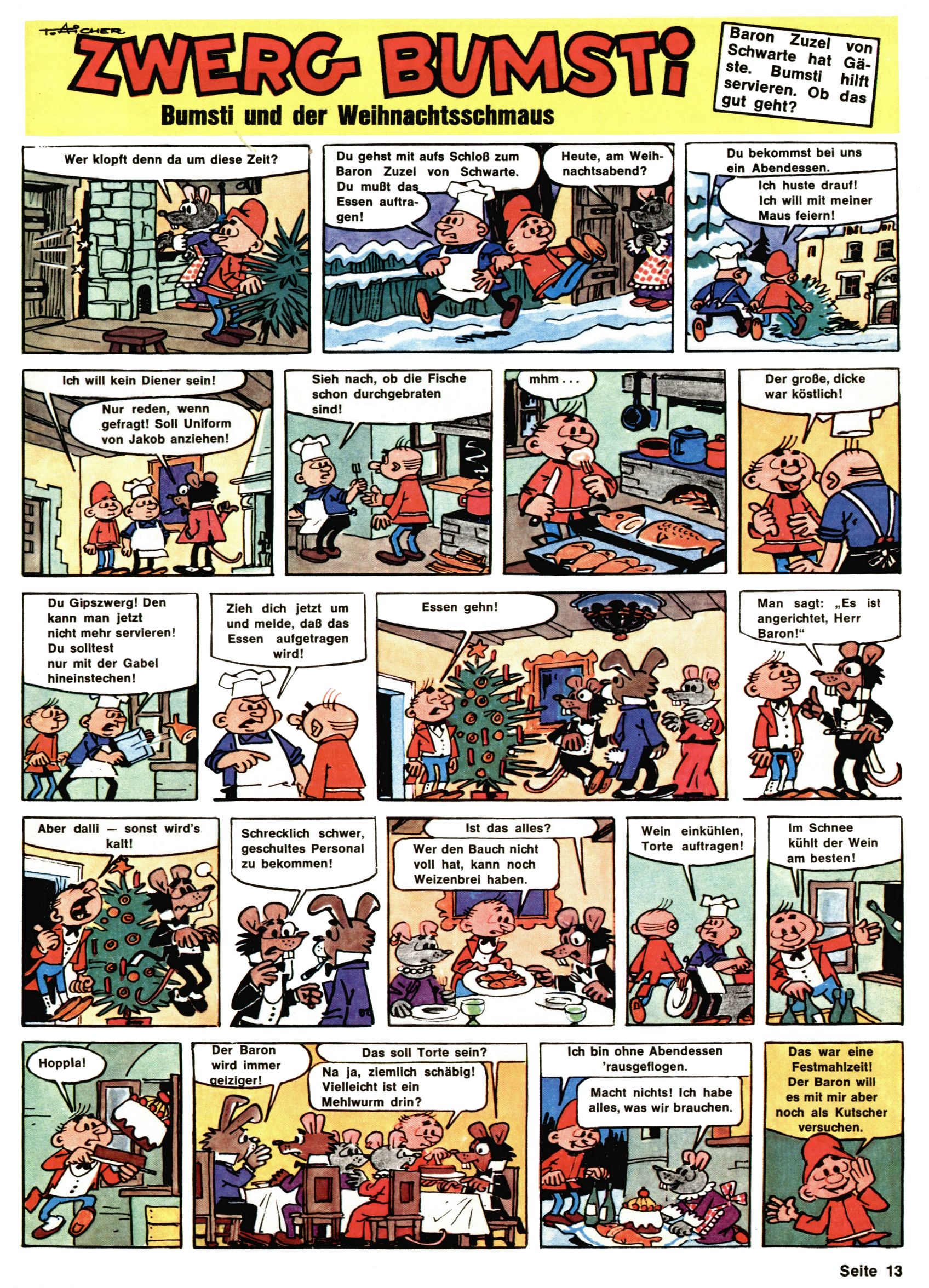 1971 - Rückkehr zur Normalität? 1971 gab es erstmals wieder die geplanten 12 Zeitschriften in einem Jahr. Noch immer war Rosl Warzilek beim Team. Hella Soyka hatte sich mittlerweile eingelebt und auch Christian Raffeiner gehörte bereits dazu. TA Teja Aicher tat, was ihm gerade in den Sinn kam. Im 11. Heft versetzte er seinem Zwerg Bumsti einen neuen Tiefschlag, indem er diesen ab nun durch Sprechblasen kommunizieren ließ. Die Welt von Bumsti war fortan eine andere, in der die Ratten das Sagen hatten. Dies war ganz offensichtlich ein neuer bitterer Zynismus von TA. Aber es sollte noch besser kommen. Mit Perry und Silia schuf TA eine Saubermann-Serie, in der er sich selbst als namenloser Kater die Drecksarbeit machen ließ, während andere den Lohn ernteten. Hätte die Redaktionsleitung TAs Sarkasmus durchschaut, hätte dieser wohl längst seine Sachen packen dürfen. Aber so konnte TA seinen heimlichen Rachefeldzug ungehindert fortsetzen. Die Wunderwelt agierte um 1971 als Sprachrohr des WWF. Neben viel Werbung gab es eine Serie über das auch nicht mehr ganz zeitgemäße Briefmarkensammeln und einen Melodica-Kurs. In einem Akt der Verzweiflung wurde Mitte 1971 nochmals Willibald der Zauberlehrling ins Leben gerufen. Natürlich nur mit alten Abenteuern, denn Willibalds wahrer Meister Peter Paul Prinz hatte der Wunderwelt längst den Rücken gekehrt. Im Advent- und im Weihnachtsheft fand sich dann eine überraschende Anzahl von guten Bastelideen nach alter Tradition. Hatte die Wunderwelt doch noch eine Chance? |