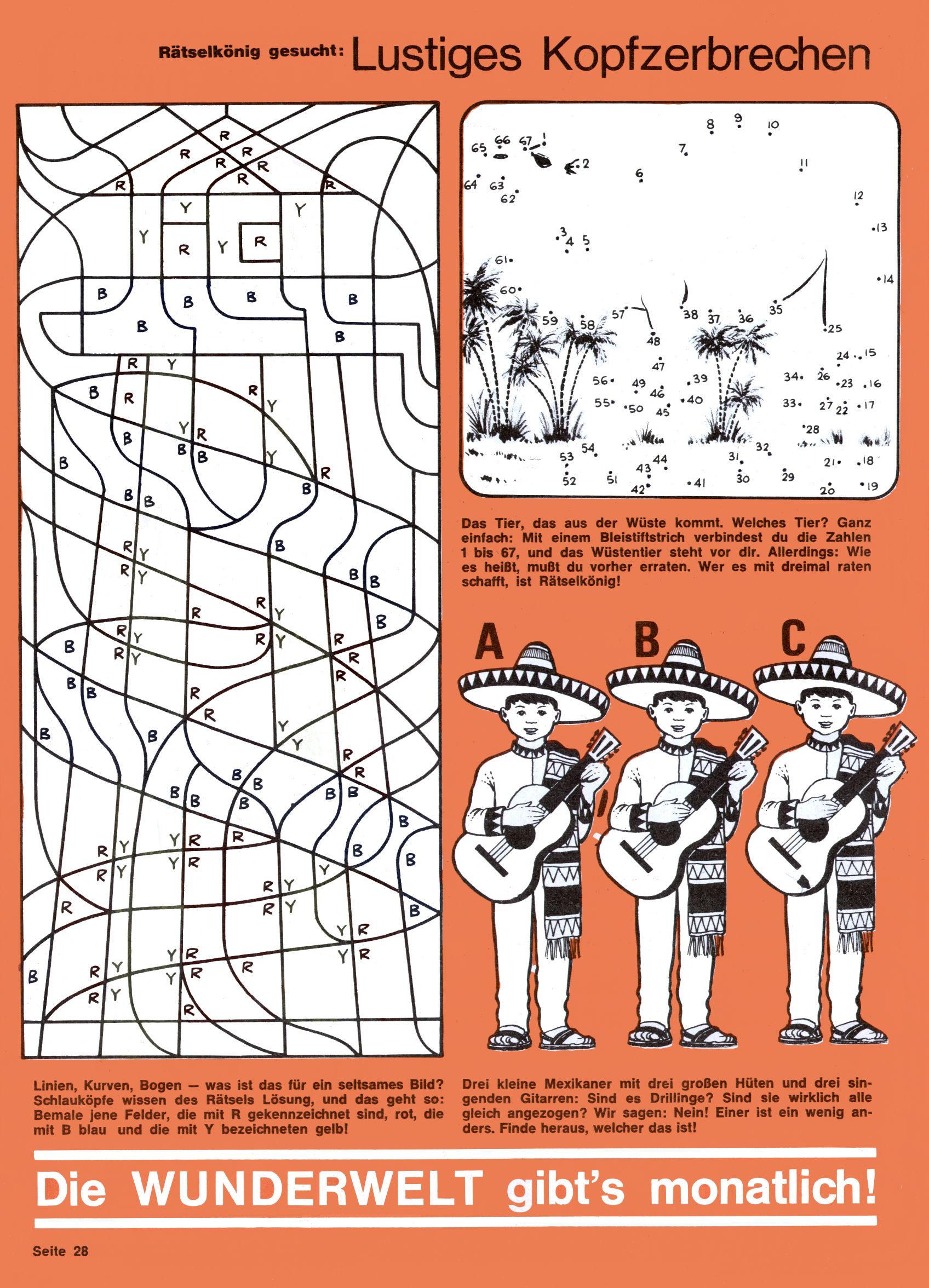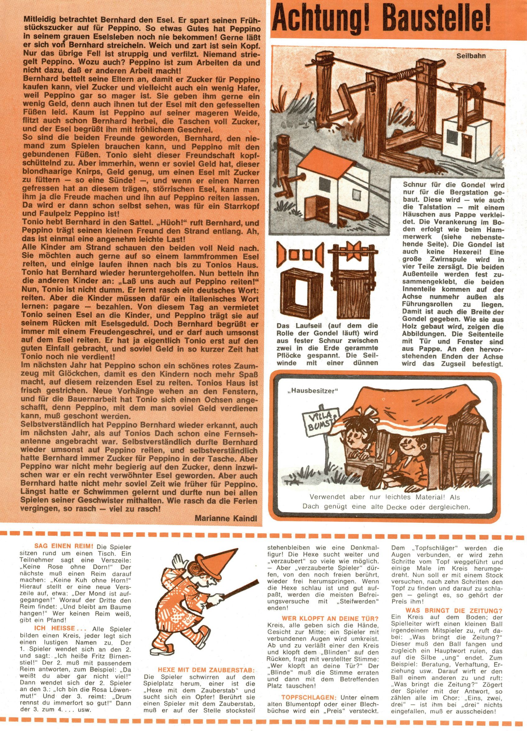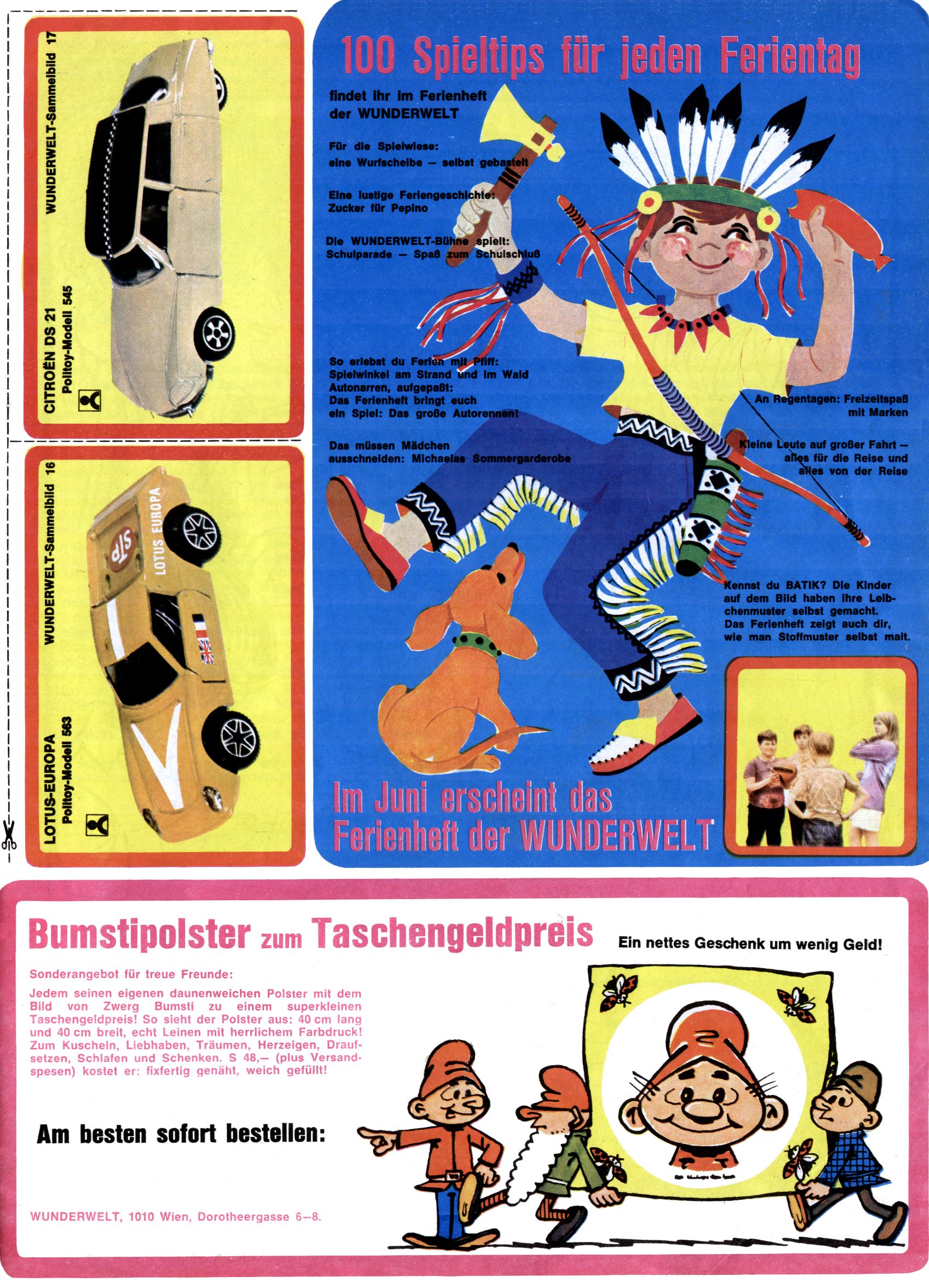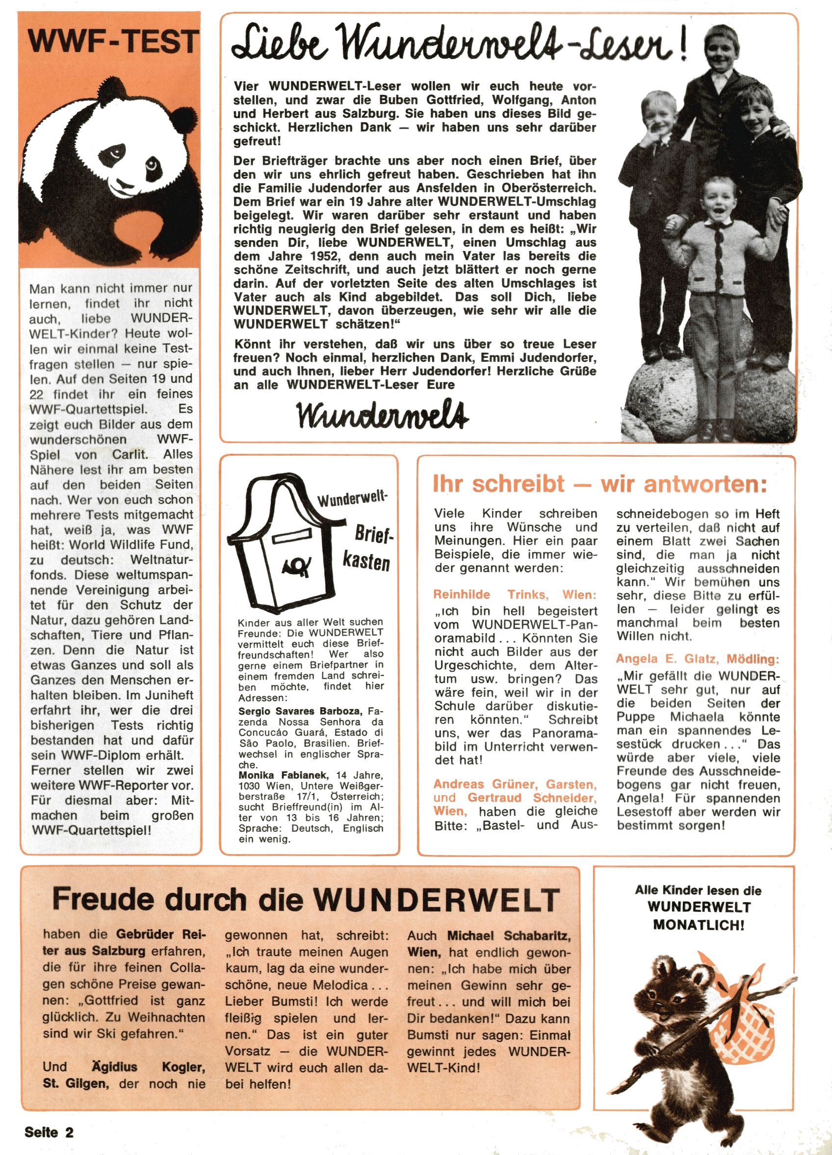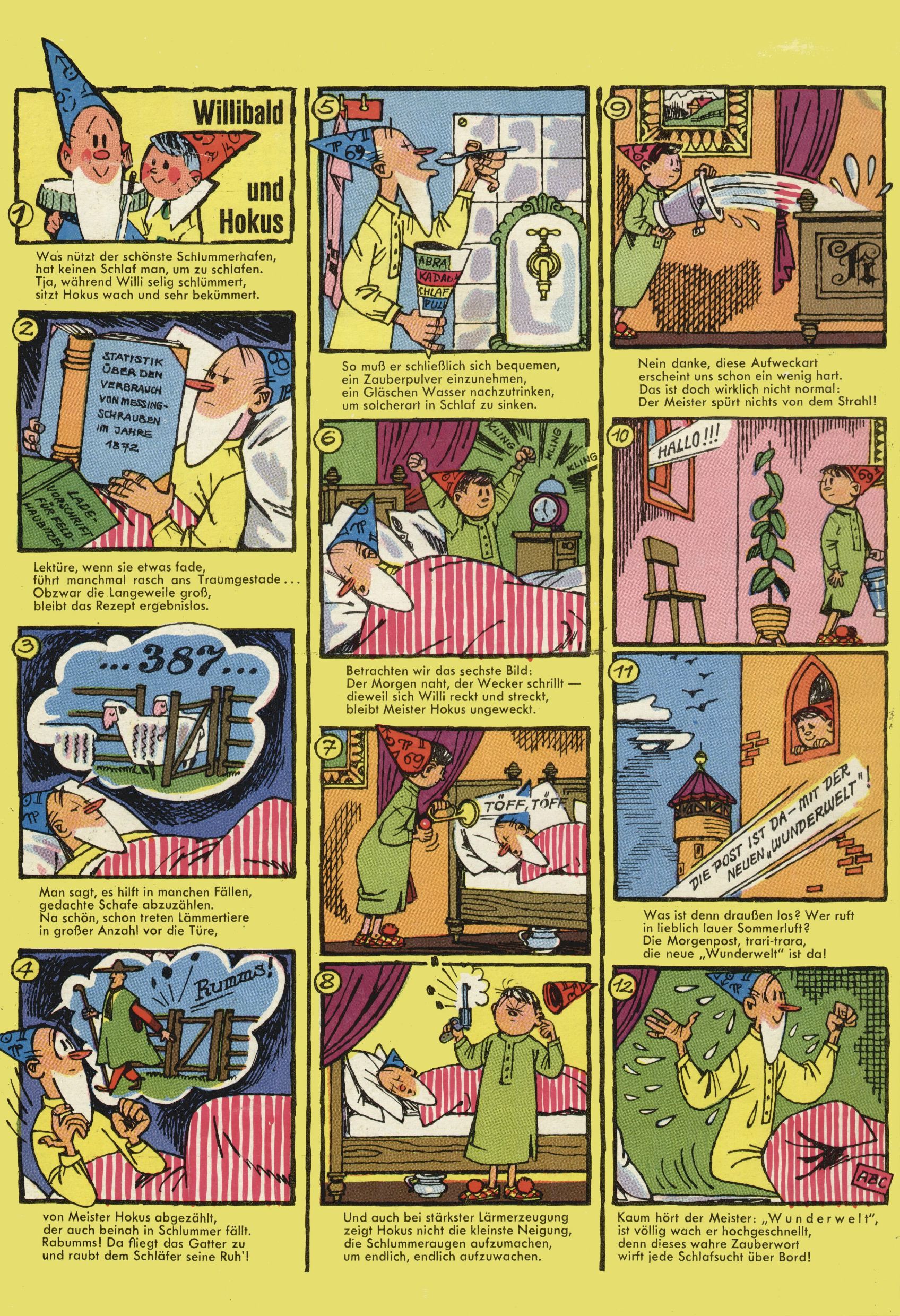 1971 - Rückkehr zur Normalität? 1971 gab es erstmals wieder die geplanten 12 Zeitschriften in einem Jahr. Noch immer war Rosl Warzilek beim Team. Hella Soyka hatte sich mittlerweile eingelebt und auch Christian Raffeiner gehörte bereits dazu. TA Teja Aicher tat, was ihm gerade in den Sinn kam. Im 11. Heft versetzte er seinem Zwerg Bumsti einen neuen Tiefschlag, indem er diesen ab nun durch Sprechblasen kommunizieren ließ. Die Welt von Bumsti war fortan eine andere, in der die Ratten das Sagen hatten. Dies war ganz offensichtlich ein neuer bitterer Zynismus von TA. Aber es sollte noch besser kommen. Mit Perry und Silia schuf TA eine Saubermann-Serie, in der er sich selbst als namenloser Kater die Drecksarbeit machen ließ, während andere den Lohn ernteten. Hätte die Redaktionsleitung TAs Sarkasmus durchschaut, hätte dieser wohl längst seine Sachen packen dürfen. Aber so konnte TA seinen heimlichen Rachefeldzug ungehindert fortsetzen. Die Wunderwelt agierte um 1971 als Sprachrohr des WWF. Neben viel Werbung gab es eine Serie über das auch nicht mehr ganz zeitgemäße Briefmarkensammeln und einen Melodica-Kurs. In einem Akt der Verzweiflung wurde Mitte 1971 nochmals Willibald der Zauberlehrling ins Leben gerufen. Natürlich nur mit alten Abenteuern, denn Willibalds wahrer Meister Peter Paul Prinz hatte der Wunderwelt längst den Rücken gekehrt. Im Advent- und im Weihnachtsheft fand sich dann eine überraschende Anzahl von guten Bastelideen nach alter Tradition. Hatte die Wunderwelt doch noch eine Chance? |