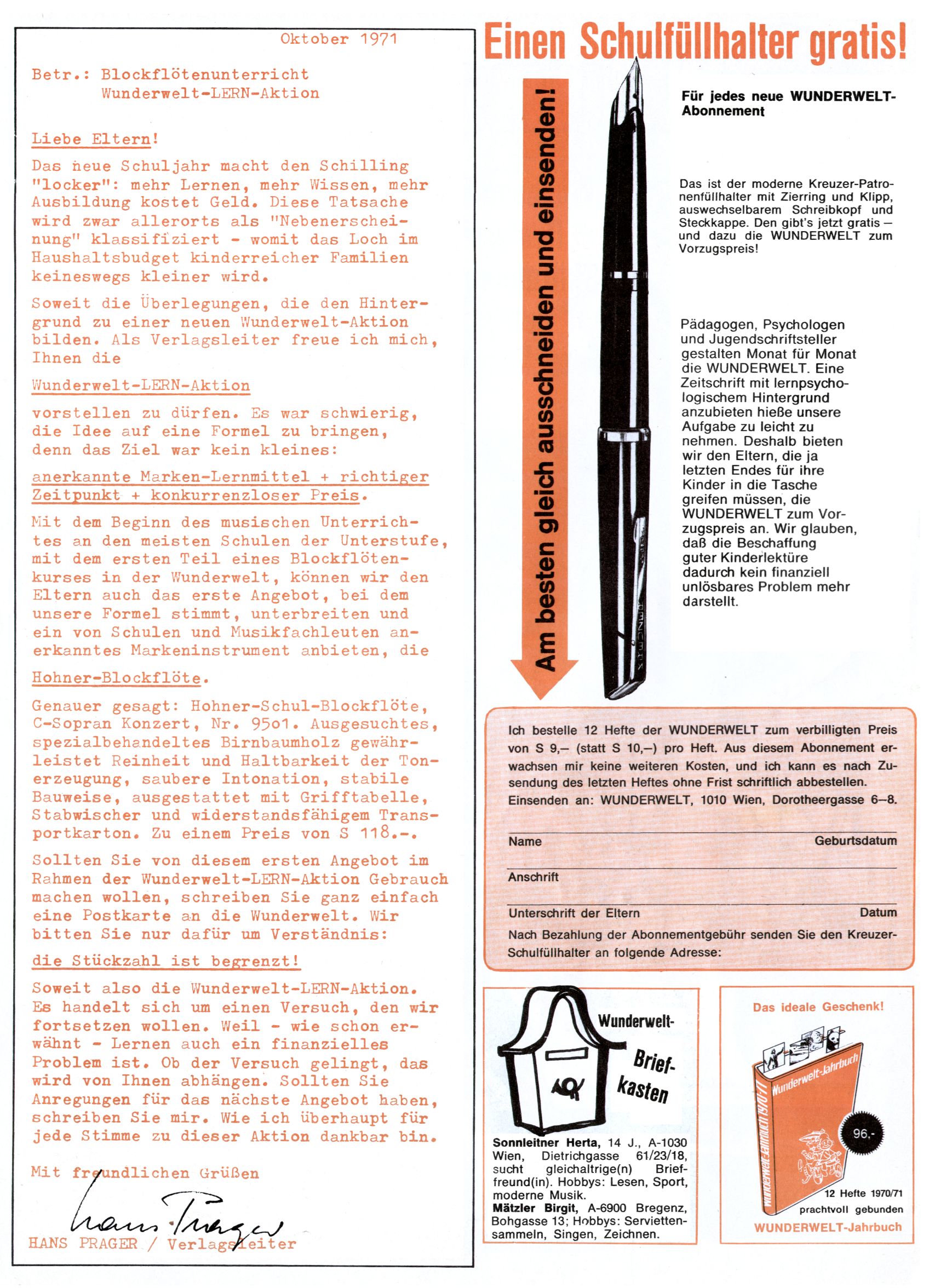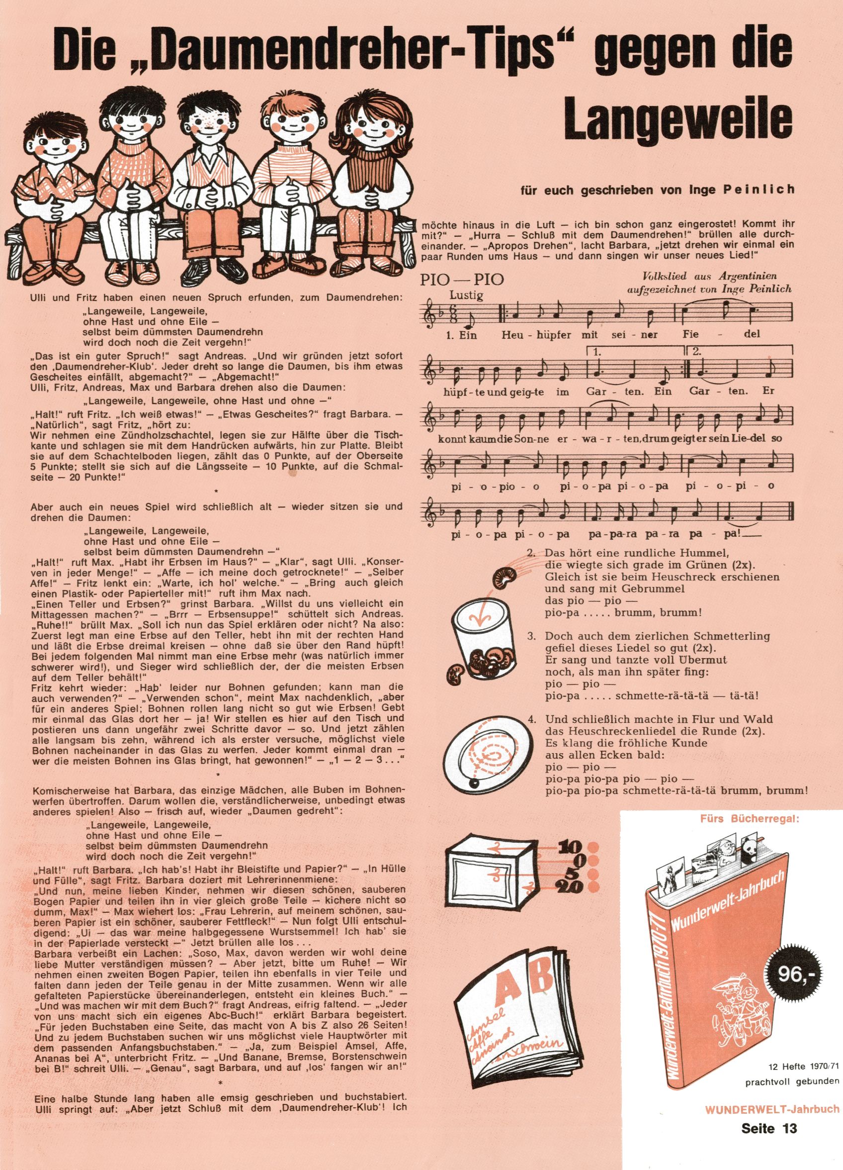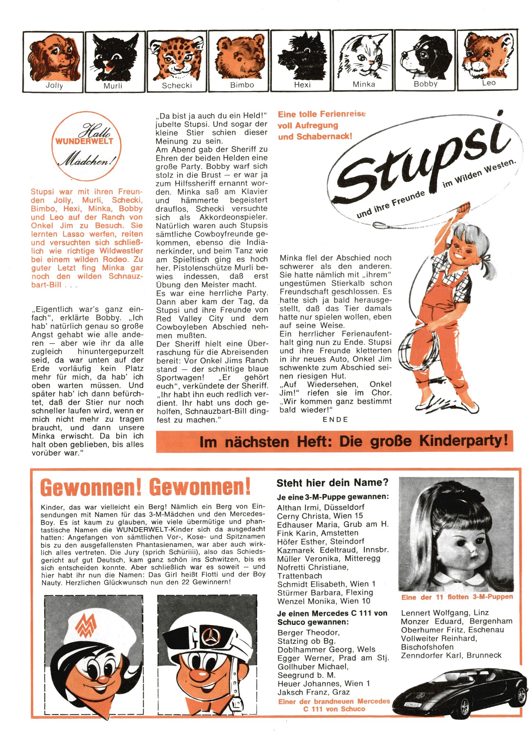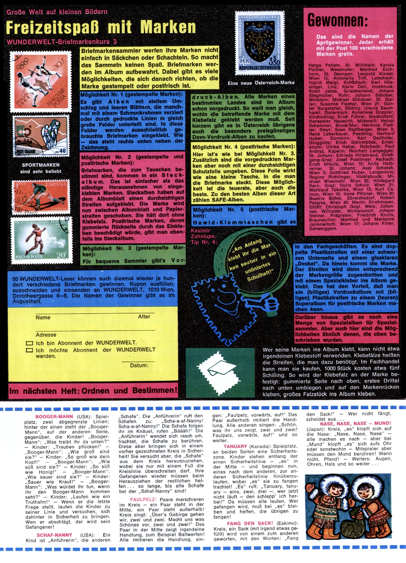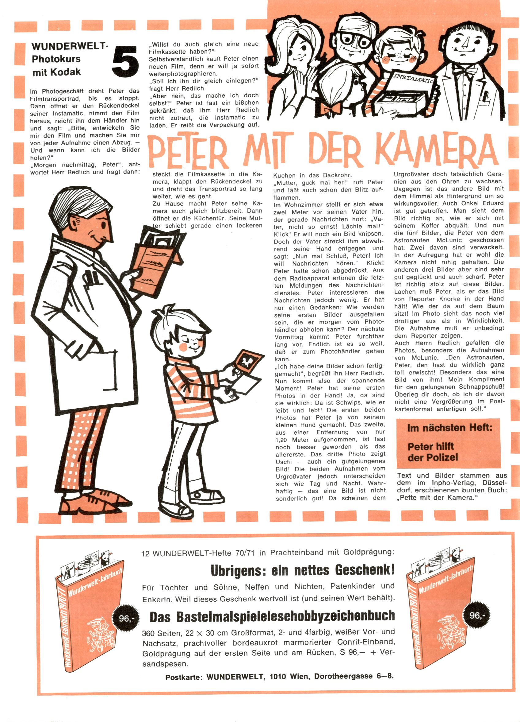 1971 - Rückkehr zur Normalität? 1971 gab es erstmals wieder die geplanten 12 Zeitschriften in einem Jahr. Noch immer war Rosl Warzilek beim Team. Hella Soyka hatte sich mittlerweile eingelebt und auch Christian Raffeiner gehörte bereits dazu. TA Teja Aicher tat, was ihm gerade in den Sinn kam. Im 11. Heft versetzte er seinem Zwerg Bumsti einen neuen Tiefschlag, indem er diesen ab nun durch Sprechblasen kommunizieren ließ. Die Welt von Bumsti war fortan eine andere, in der die Ratten das Sagen hatten. Dies war ganz offensichtlich ein neuer bitterer Zynismus von TA. Aber es sollte noch besser kommen. Mit Perry und Silia schuf TA eine Saubermann-Serie, in der er sich selbst als namenloser Kater die Drecksarbeit machen ließ, während andere den Lohn ernteten. Hätte die Redaktionsleitung TAs Sarkasmus durchschaut, hätte dieser wohl längst seine Sachen packen dürfen. Aber so konnte TA seinen heimlichen Rachefeldzug ungehindert fortsetzen. Die Wunderwelt agierte um 1971 als Sprachrohr des WWF. Neben viel Werbung gab es eine Serie über das auch nicht mehr ganz zeitgemäße Briefmarkensammeln und einen Melodica-Kurs. In einem Akt der Verzweiflung wurde Mitte 1971 nochmals Willibald der Zauberlehrling ins Leben gerufen. Natürlich nur mit alten Abenteuern, denn Willibalds wahrer Meister Peter Paul Prinz hatte der Wunderwelt längst den Rücken gekehrt. Im Advent- und im Weihnachtsheft fand sich dann eine überraschende Anzahl von guten Bastelideen nach alter Tradition. Hatte die Wunderwelt doch noch eine Chance? |