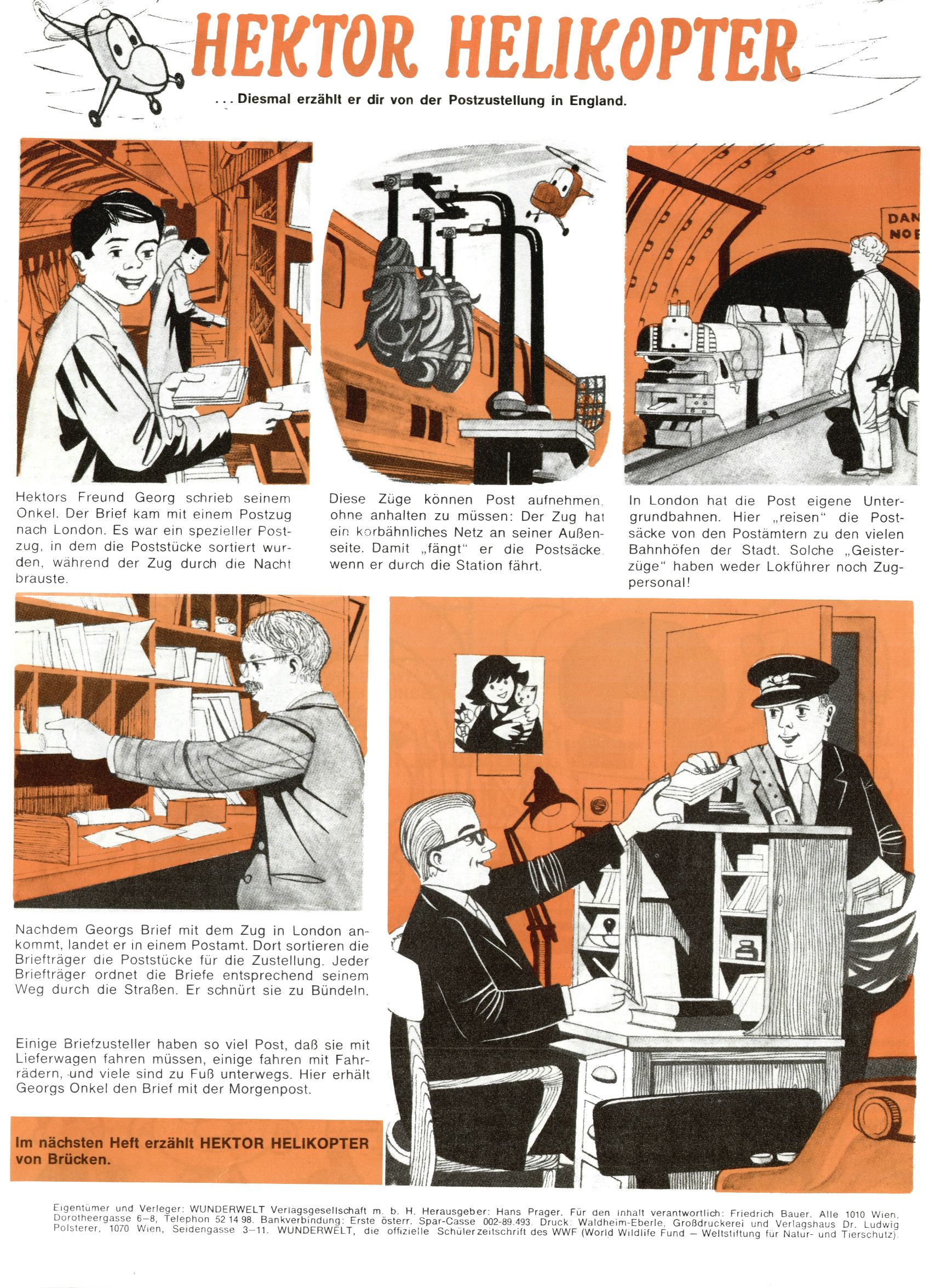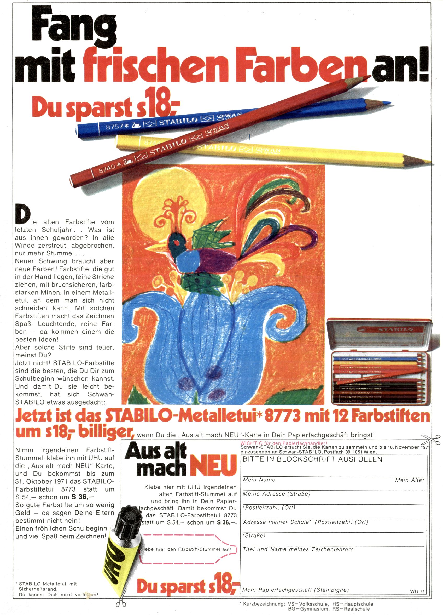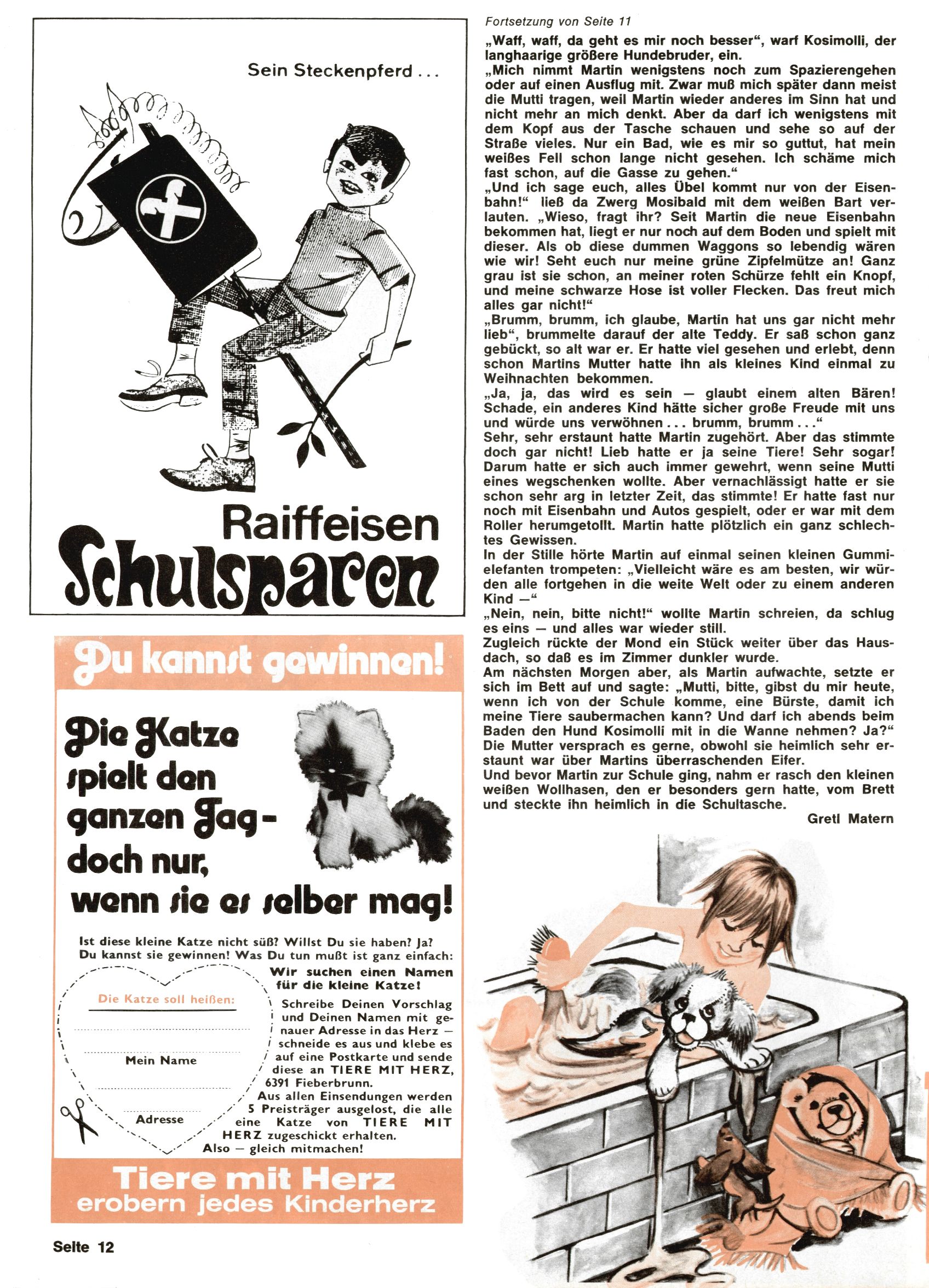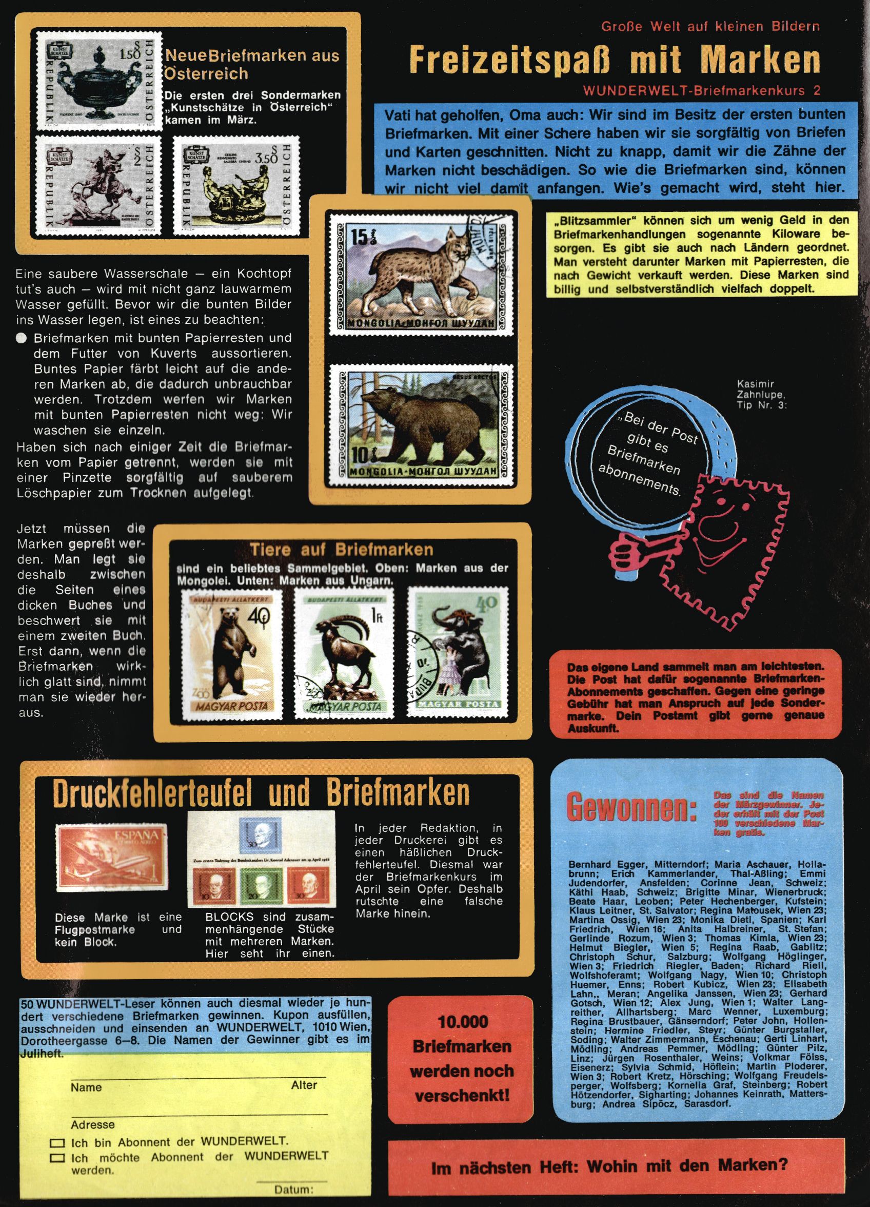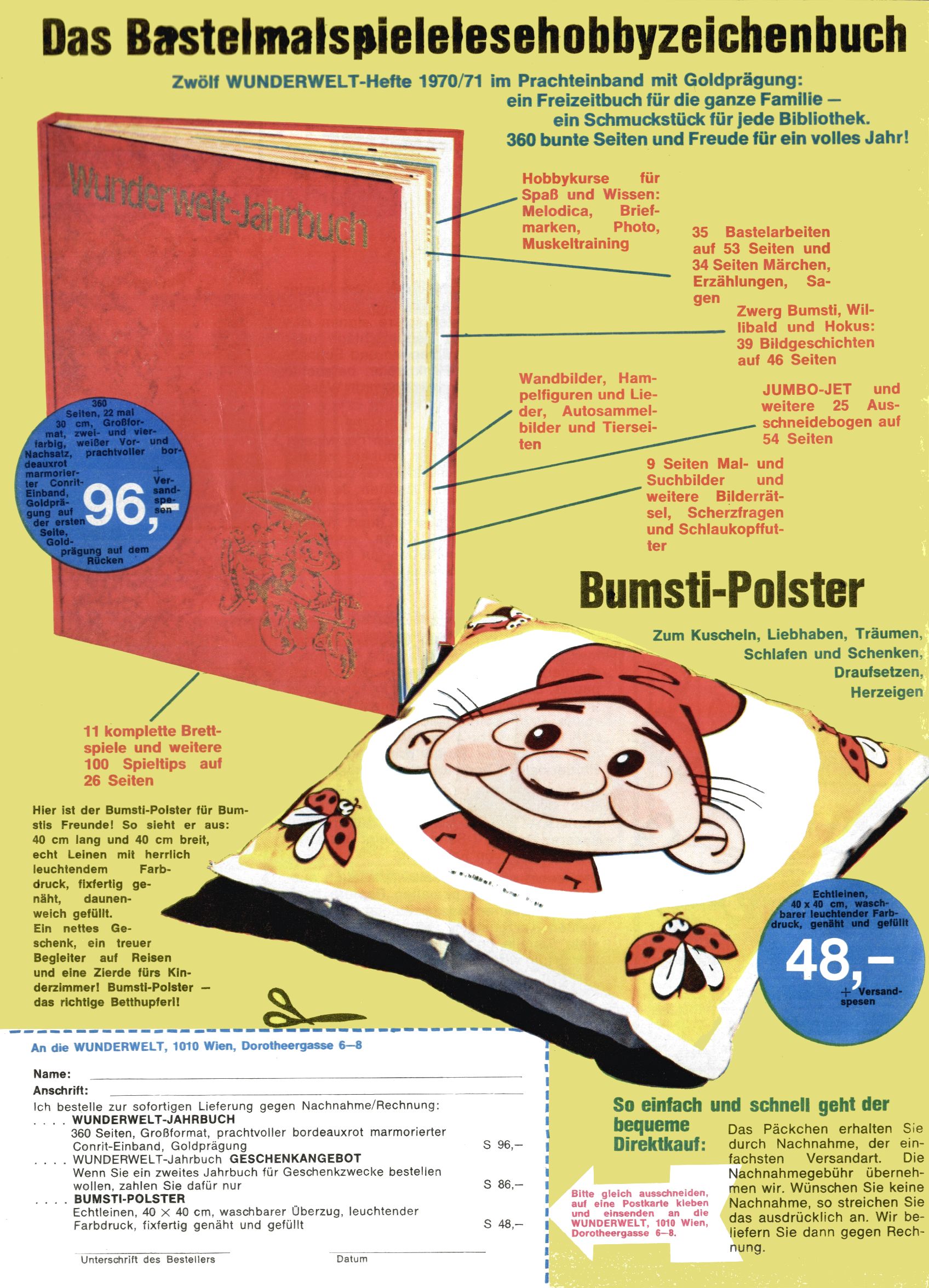 1971 - Rückkehr zur Normalität? 1971 gab es erstmals wieder die geplanten 12 Zeitschriften in einem Jahr. Noch immer war Rosl Warzilek beim Team. Hella Soyka hatte sich mittlerweile eingelebt und auch Christian Raffeiner gehörte bereits dazu. TA Teja Aicher tat, was ihm gerade in den Sinn kam. Im 11. Heft versetzte er seinem Zwerg Bumsti einen neuen Tiefschlag, indem er diesen ab nun durch Sprechblasen kommunizieren ließ. Die Welt von Bumsti war fortan eine andere, in der die Ratten das Sagen hatten. Dies war ganz offensichtlich ein neuer bitterer Zynismus von TA. Aber es sollte noch besser kommen. Mit Perry und Silia schuf TA eine Saubermann-Serie, in der er sich selbst als namenloser Kater die Drecksarbeit machen ließ, während andere den Lohn ernteten. Hätte die Redaktionsleitung TAs Sarkasmus durchschaut, hätte dieser wohl längst seine Sachen packen dürfen. Aber so konnte TA seinen heimlichen Rachefeldzug ungehindert fortsetzen. Die Wunderwelt agierte um 1971 als Sprachrohr des WWF. Neben viel Werbung gab es eine Serie über das auch nicht mehr ganz zeitgemäße Briefmarkensammeln und einen Melodica-Kurs. In einem Akt der Verzweiflung wurde Mitte 1971 nochmals Willibald der Zauberlehrling ins Leben gerufen. Natürlich nur mit alten Abenteuern, denn Willibalds wahrer Meister Peter Paul Prinz hatte der Wunderwelt längst den Rücken gekehrt. Im Advent- und im Weihnachtsheft fand sich dann eine überraschende Anzahl von guten Bastelideen nach alter Tradition. Hatte die Wunderwelt doch noch eine Chance? |