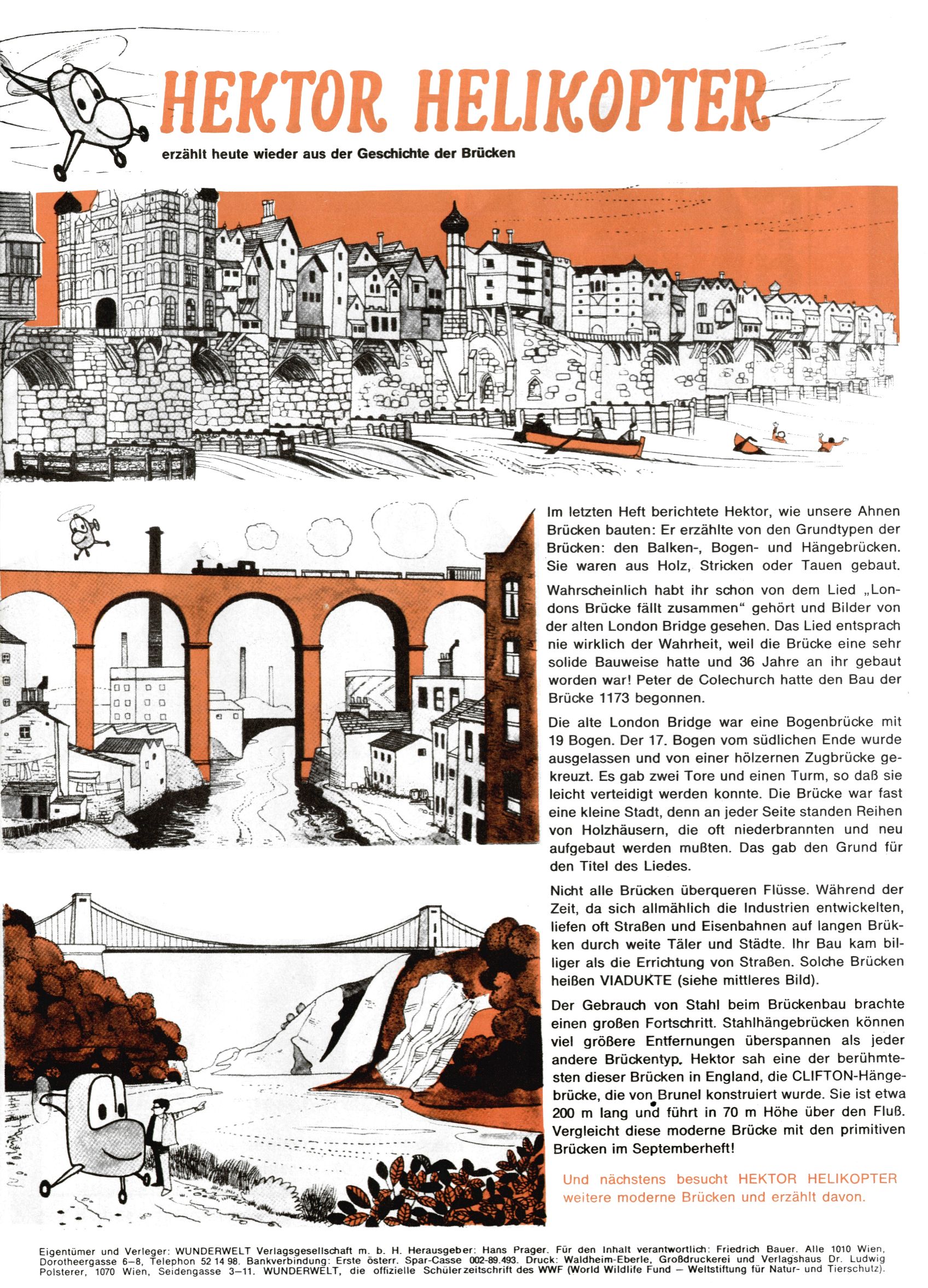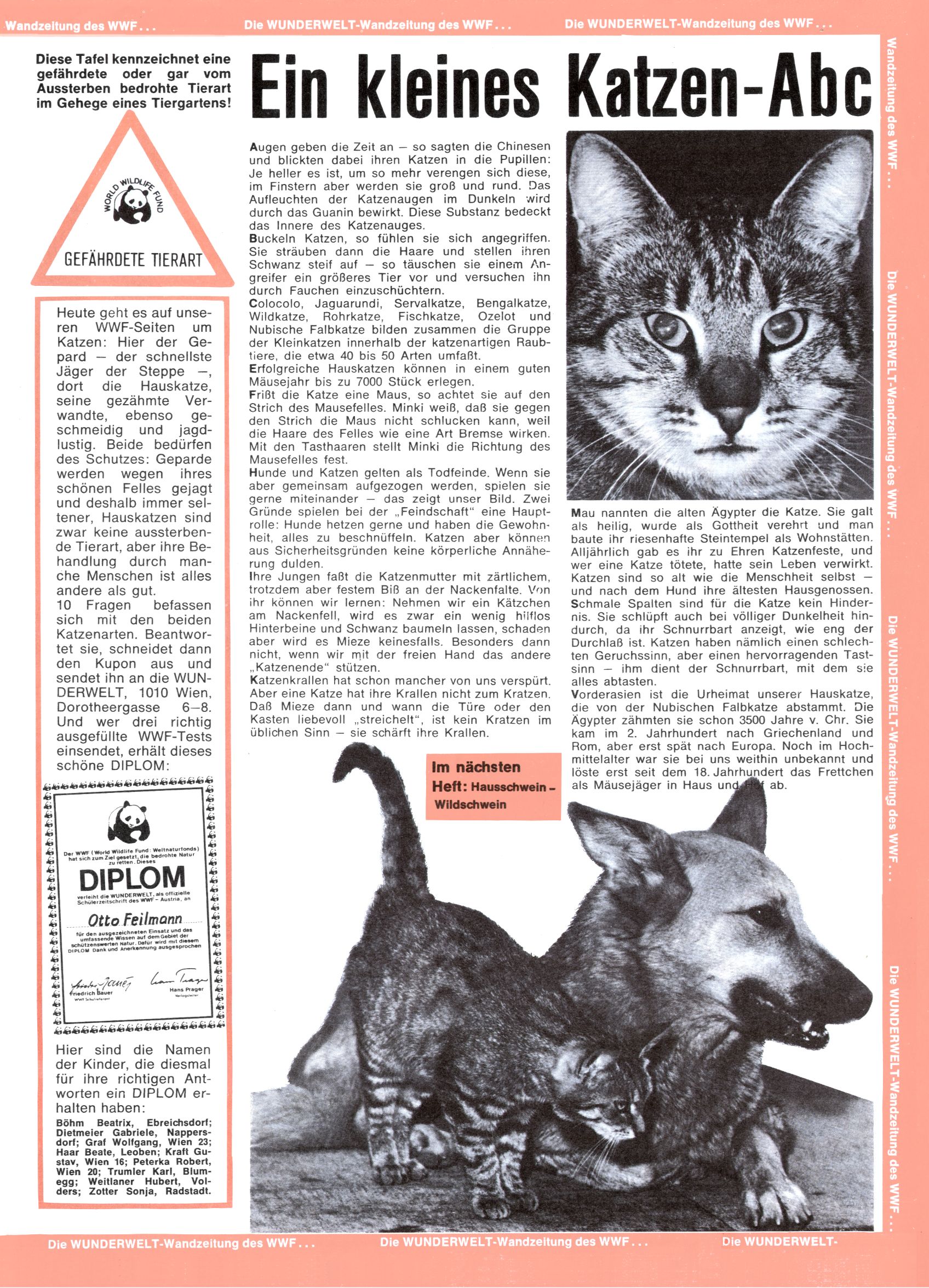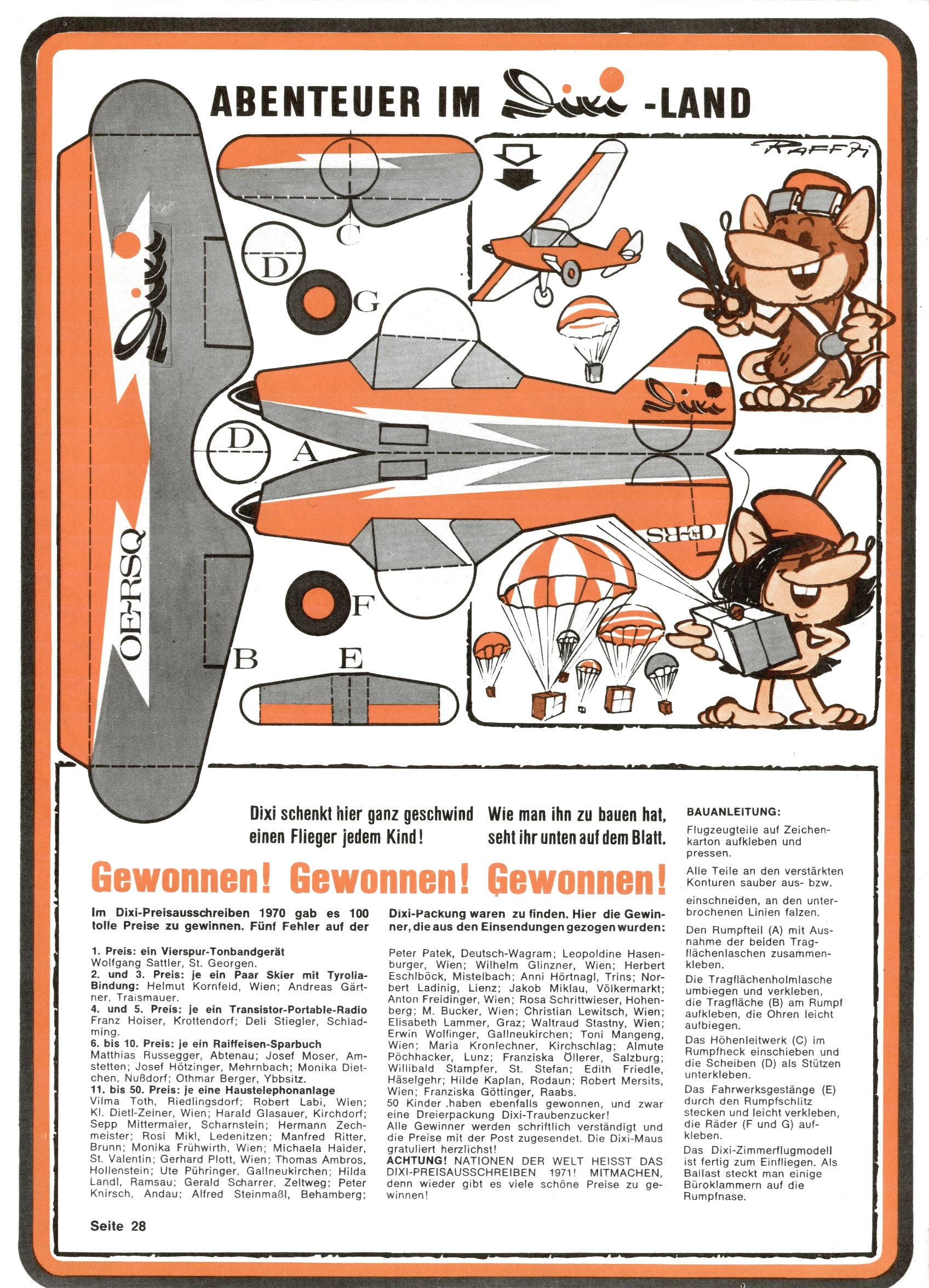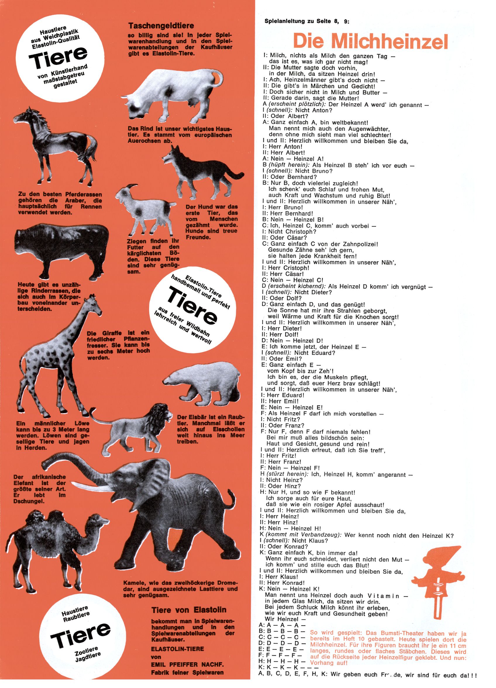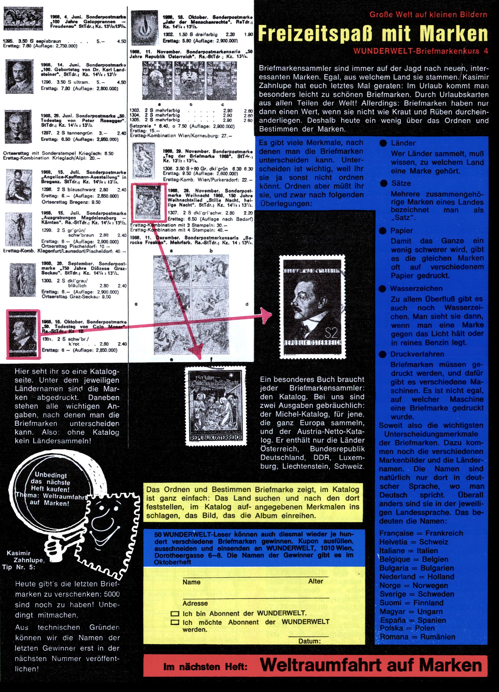 1971 - Rückkehr zur Normalität? 1971 gab es erstmals wieder die geplanten 12 Zeitschriften in einem Jahr. Noch immer war Rosl Warzilek beim Team. Hella Soyka hatte sich mittlerweile eingelebt und auch Christian Raffeiner gehörte bereits dazu. TA Teja Aicher tat, was ihm gerade in den Sinn kam. Im 11. Heft versetzte er seinem Zwerg Bumsti einen neuen Tiefschlag, indem er diesen ab nun durch Sprechblasen kommunizieren ließ. Die Welt von Bumsti war fortan eine andere, in der die Ratten das Sagen hatten. Dies war ganz offensichtlich ein neuer bitterer Zynismus von TA. Aber es sollte noch besser kommen. Mit Perry und Silia schuf TA eine Saubermann-Serie, in der er sich selbst als namenloser Kater die Drecksarbeit machen ließ, während andere den Lohn ernteten. Hätte die Redaktionsleitung TAs Sarkasmus durchschaut, hätte dieser wohl längst seine Sachen packen dürfen. Aber so konnte TA seinen heimlichen Rachefeldzug ungehindert fortsetzen. Die Wunderwelt agierte um 1971 als Sprachrohr des WWF. Neben viel Werbung gab es eine Serie über das auch nicht mehr ganz zeitgemäße Briefmarkensammeln und einen Melodica-Kurs. In einem Akt der Verzweiflung wurde Mitte 1971 nochmals Willibald der Zauberlehrling ins Leben gerufen. Natürlich nur mit alten Abenteuern, denn Willibalds wahrer Meister Peter Paul Prinz hatte der Wunderwelt längst den Rücken gekehrt. Im Advent- und im Weihnachtsheft fand sich dann eine überraschende Anzahl von guten Bastelideen nach alter Tradition. Hatte die Wunderwelt doch noch eine Chance? |