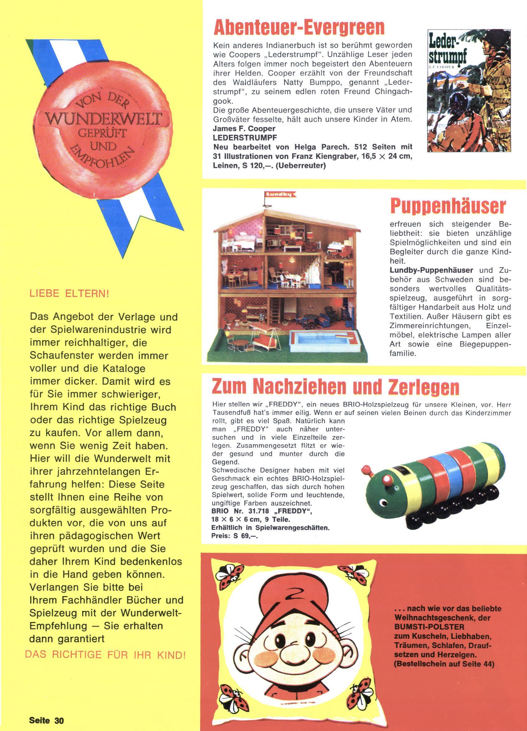 Weihnachtsgeschenke (Lederstrumpf / Puppenhäuser / Nachziehraupe / Bumstipolster) |