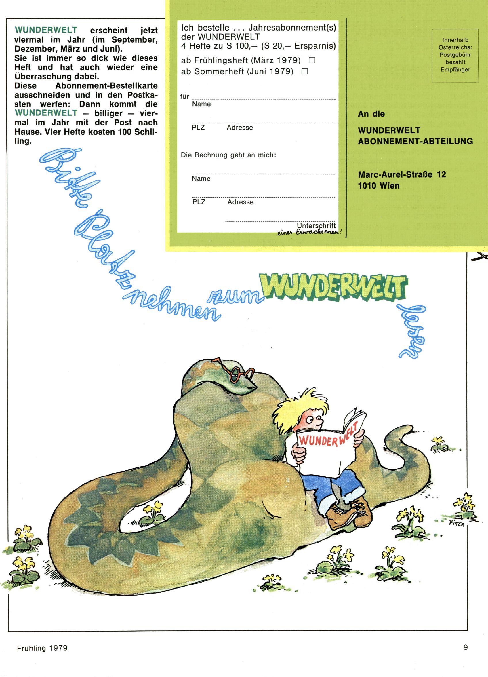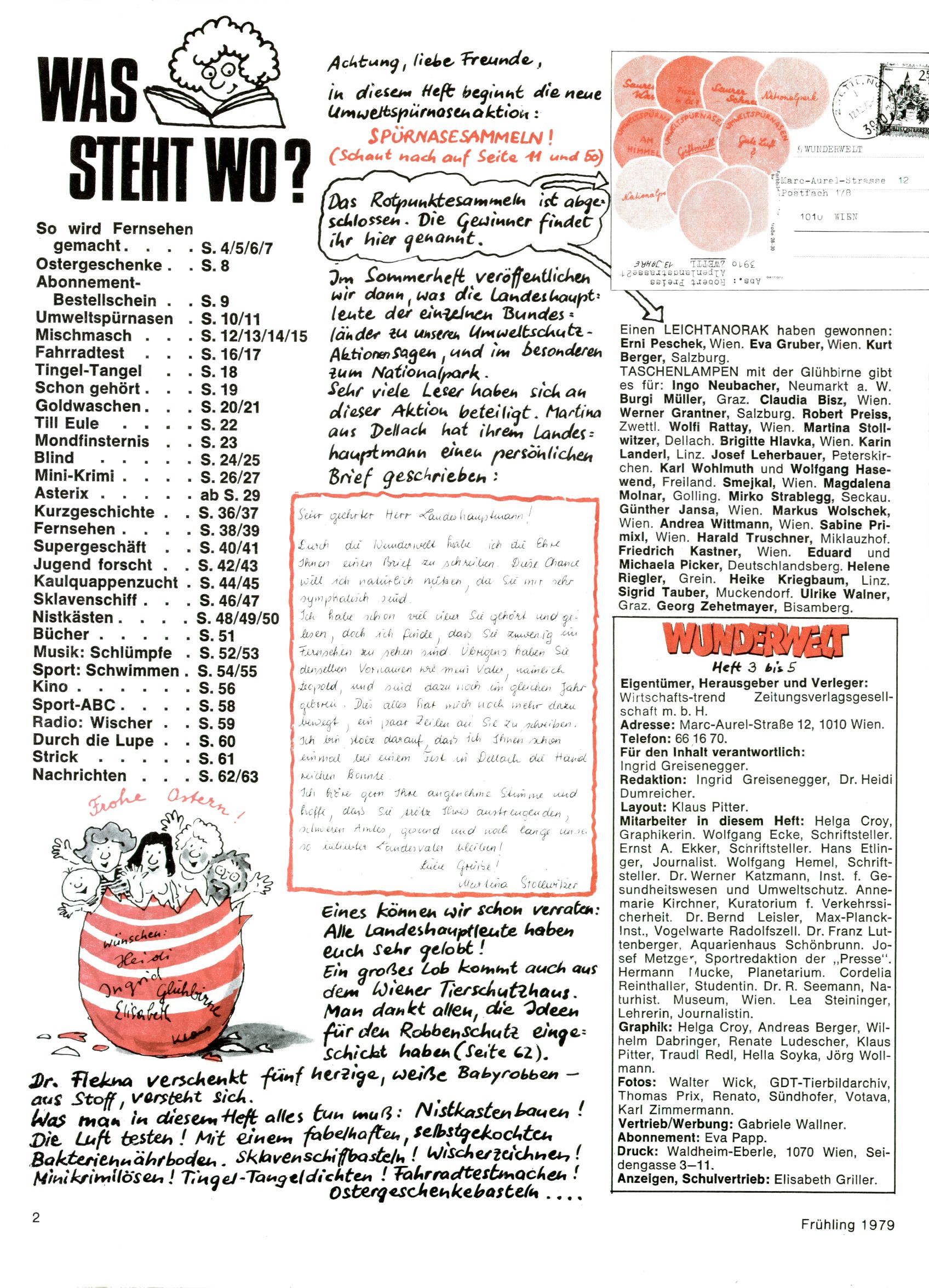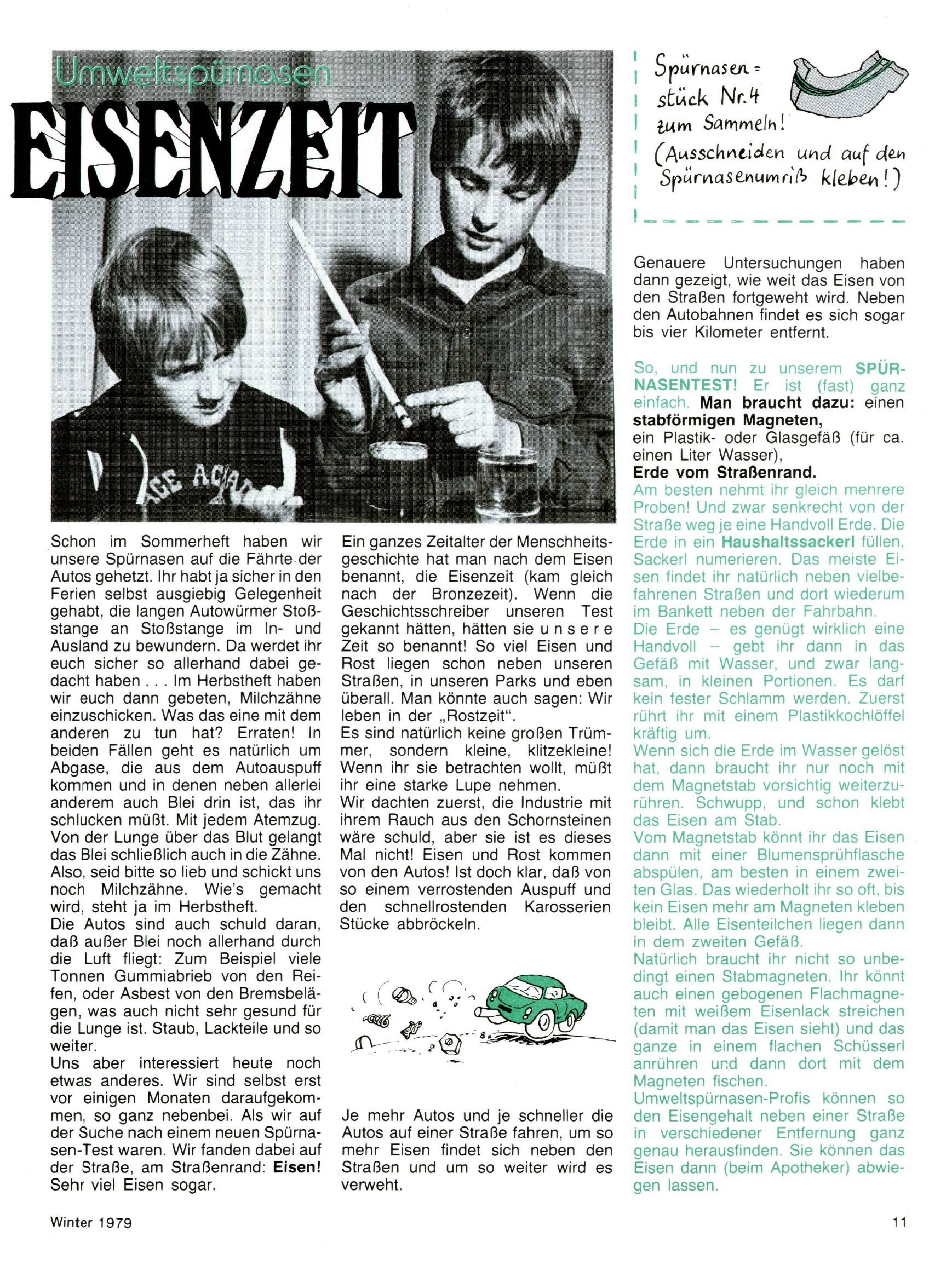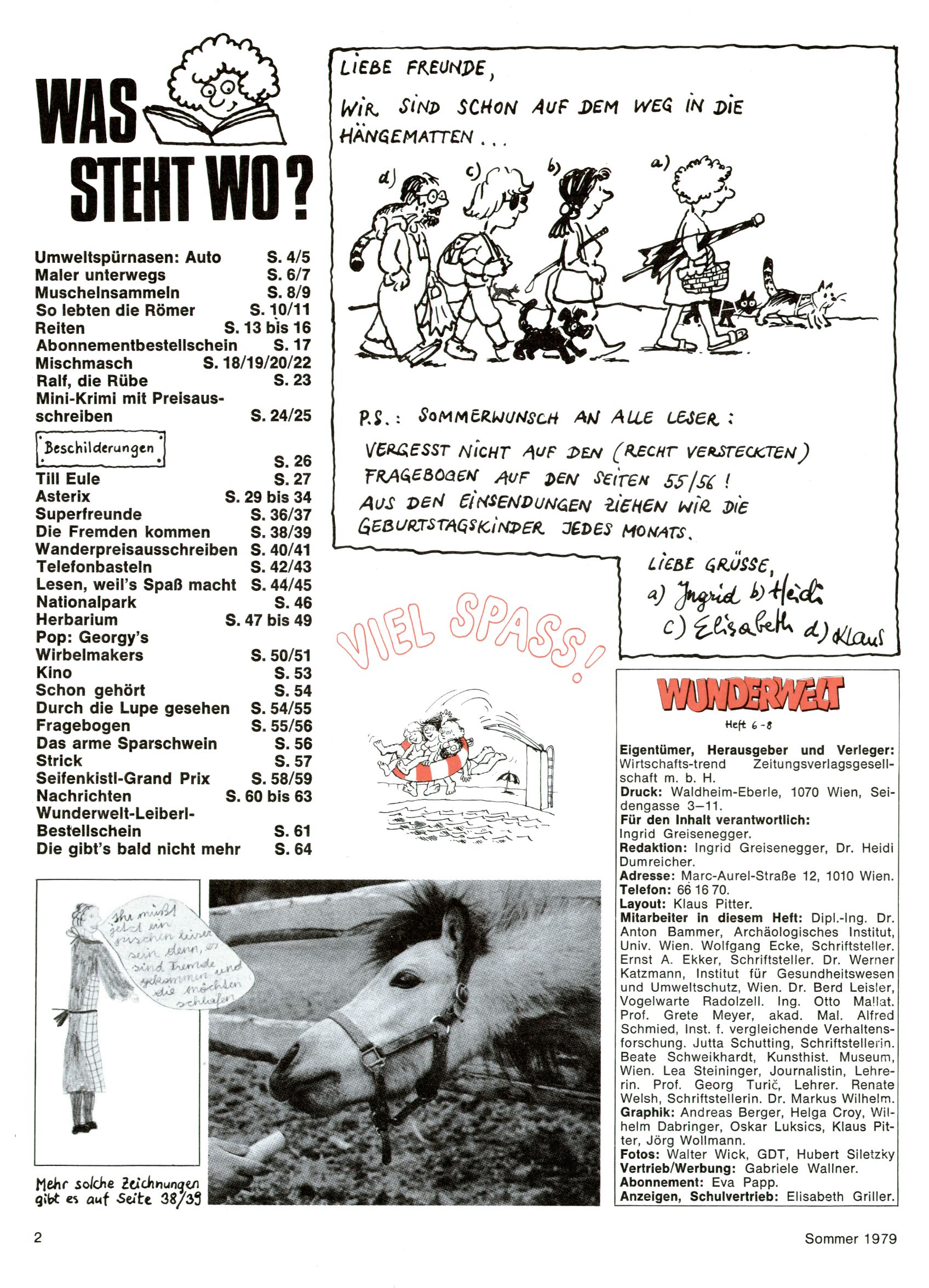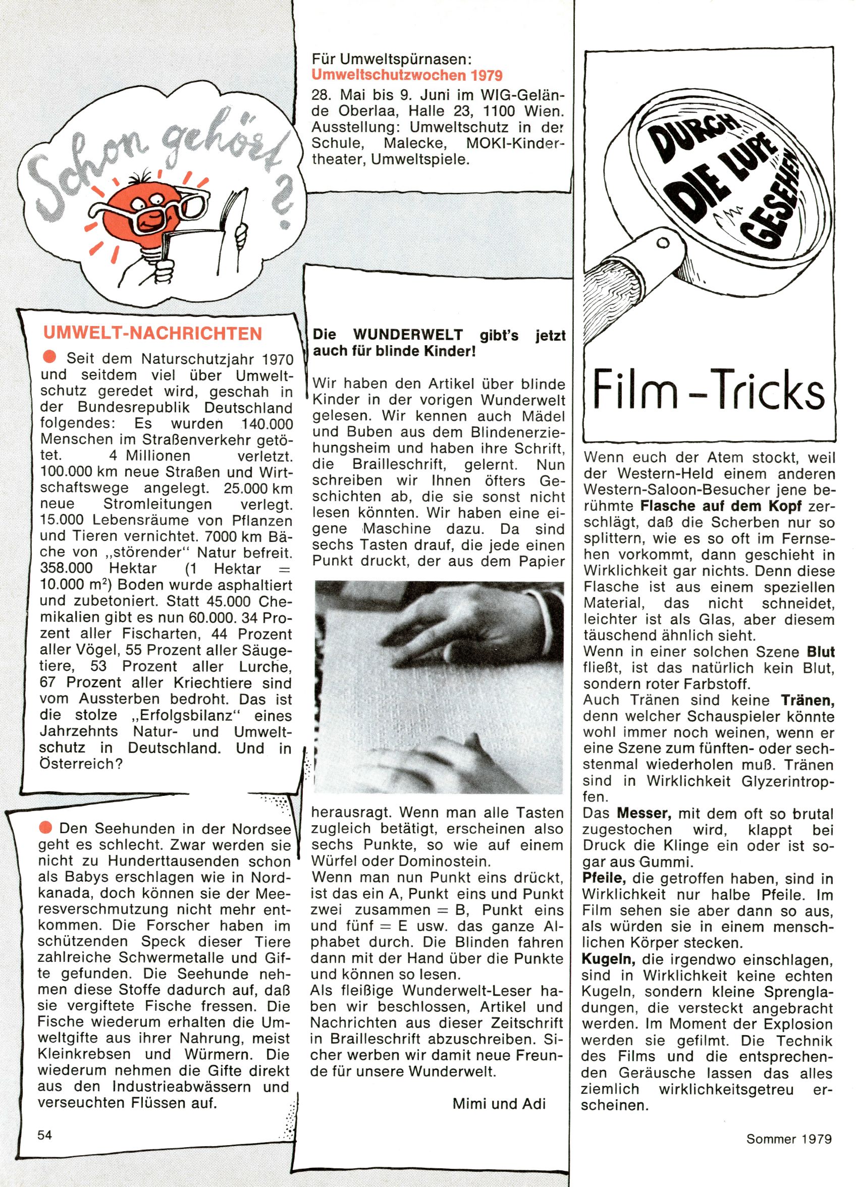1979 - Zeit für Feinheiten Nachdem man das Grobe geklärt hatte, war es 1979 an der Zeit, der neuen Zeitung einen Schliff zu verpassen. Wilhelm Dabringer begann sich an die Bastelbögen heranzutasten, wenn seine Modelle zunächst auch sehr simpel und nichteinmal in Farbe gestaltet wurden. Die allgemeinen Bastelideen brachten nach wie vor Renate Ludescher und Helga Croy zu Papier. Als erstes echtes Gimmick der Zeitung fand sich zum Jahresausklang eine 2-Minuten-Folien-Schallplatte, nachdem aus der im Sommer mit Fragebogen angekündigten Langspielplatte wohl aus Kostengründen letztlich doch nichts geworden war. Im Herbstheft hatte es aber immerhin bereits eine Art Bastelfigur gegeben ('Glühbirne als Verwandlungskünstler'). Nach der Verabschiedung von Asterix startete Jörg Wollmann gemeinsam mit G. Januszewski die skurrile Umwelt-Cartoon-Fortsetzungsgeschichte Direktor Karl Meidlinger und der Flußgeist. Nach wie vor waren Ernst A. Ekker, Renate Welsh und Wolfgang Ecke die Hauptautoren. Ernst A. Ekker war über alle Jahre hinweg auch immer als Kino-Rezensionist unterwegs. Christine Nöstlinger bekam 1979 ein zweites Gastspielangebot. Immer mehr Reportagen behandelten Umweltthemen - die Aktiv-Umweltspürnasen waren ins Leben gerufen worden. Jugendliche bekamen die Möglichkeit, selbständig unter wissenschaftlicher Anleitung Experimente durchzuführen. Später gründete Ingrid Greisenegger mit Klaus Pitter und Werner Katzmann den Umweltspürnasenclub. Insgesamt wurden 7 Aktivbücher für Umweltspürnasen herausgegeben und ab dem Jahr 2000 sogar nochmals aufgelegt. Mit einem eigenen WunderWelt-Fragebogen versuchte man erstmals, die Meinung der Leser zu hinterfragen, um den weiteren Verlauf der Zeitung den Leserwünschen entsprechend steuern zu können. |