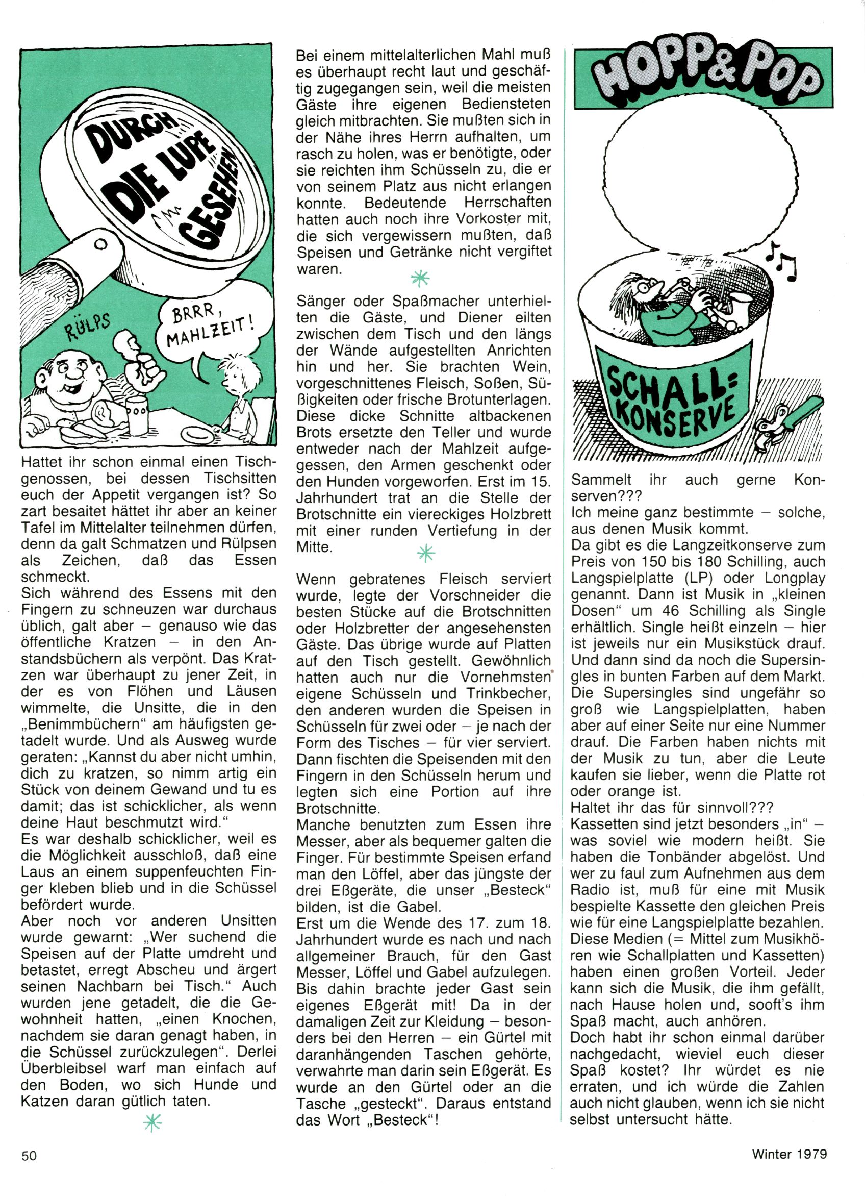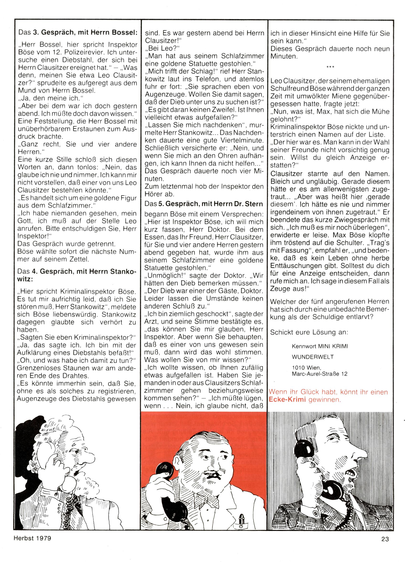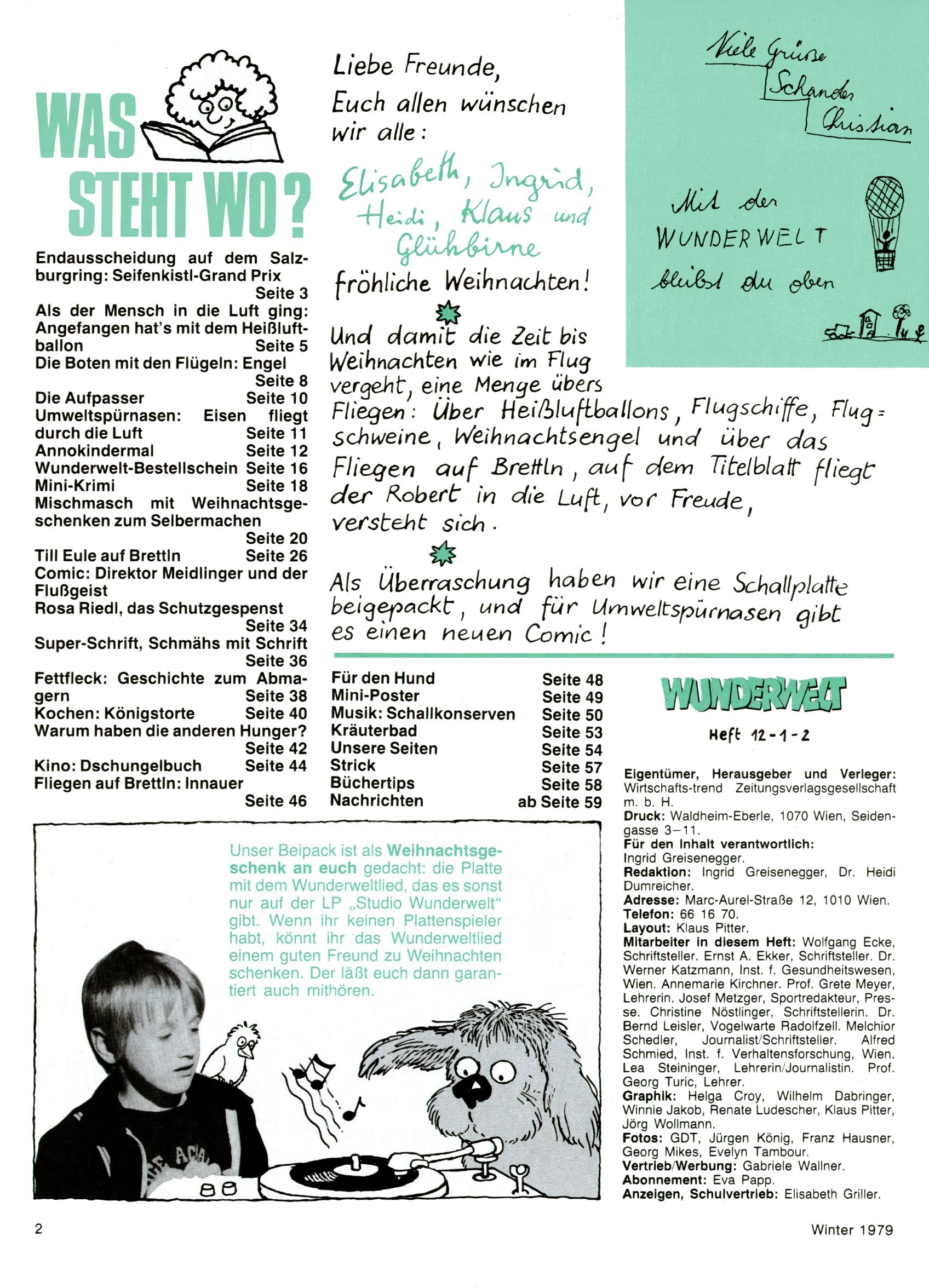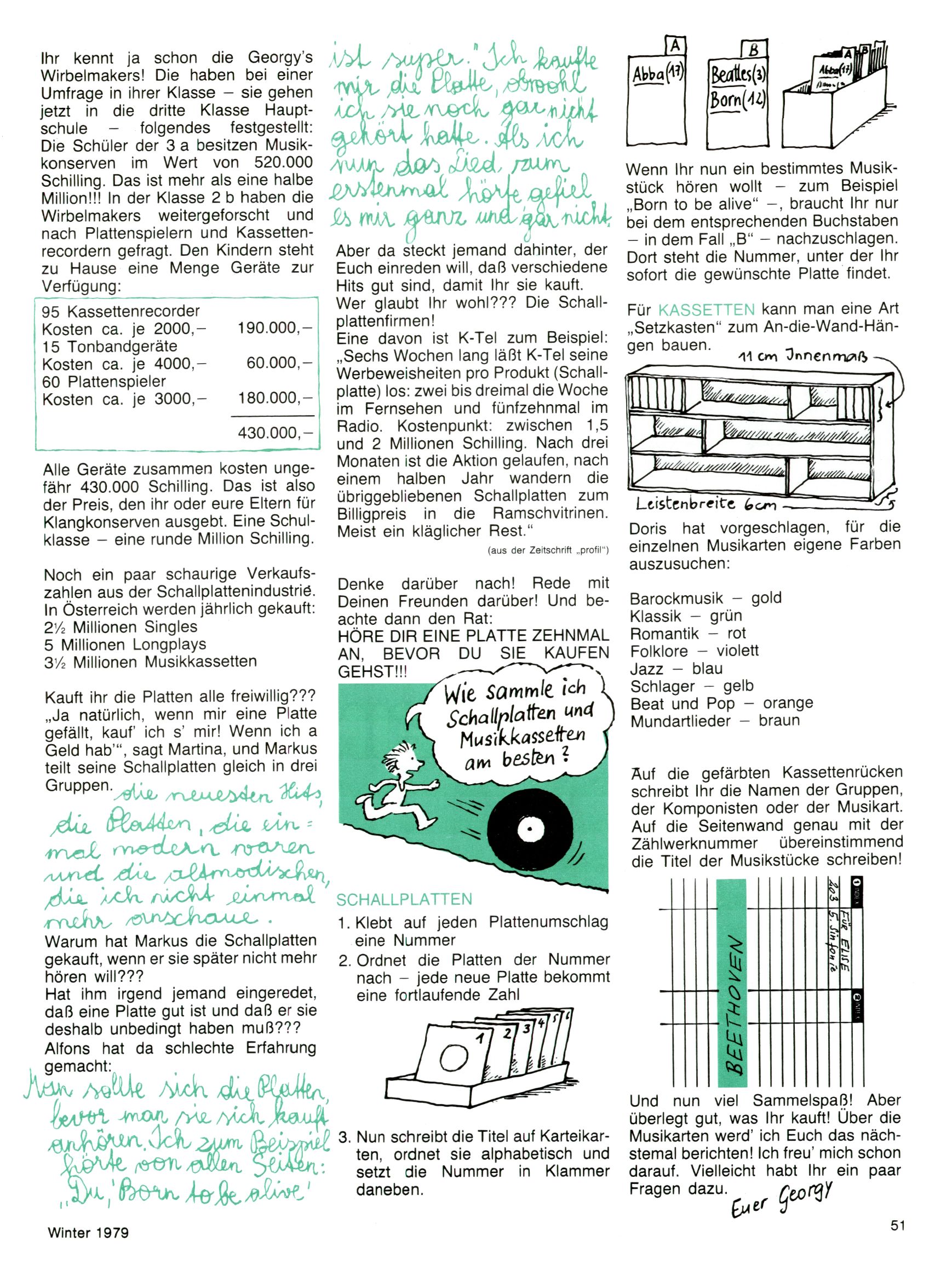 1979 - Zeit für Feinheiten Nachdem man das Grobe geklärt hatte, war es 1979 an der Zeit, der neuen Zeitung einen Schliff zu verpassen. Wilhelm Dabringer begann sich an die Bastelbögen heranzutasten, wenn seine Modelle zunächst auch sehr simpel und nichteinmal in Farbe gestaltet wurden. Die allgemeinen Bastelideen brachten nach wie vor Renate Ludescher und Helga Croy zu Papier. Als erstes echtes Gimmick der Zeitung fand sich zum Jahresausklang eine 2-Minuten-Folien-Schallplatte, nachdem aus der im Sommer mit Fragebogen angekündigten Langspielplatte wohl aus Kostengründen letztlich doch nichts geworden war. Im Herbstheft hatte es aber immerhin bereits eine Art Bastelfigur gegeben ('Glühbirne als Verwandlungskünstler'). Nach der Verabschiedung von Asterix startete Jörg Wollmann gemeinsam mit G. Januszewski die skurrile Umwelt-Cartoon-Fortsetzungsgeschichte Direktor Karl Meidlinger und der Flußgeist. Nach wie vor waren Ernst A. Ekker, Renate Welsh und Wolfgang Ecke die Hauptautoren. Ernst A. Ekker war über alle Jahre hinweg auch immer als Kino-Rezensionist unterwegs. Christine Nöstlinger bekam 1979 ein zweites Gastspielangebot. Immer mehr Reportagen behandelten Umweltthemen - die Aktiv-Umweltspürnasen waren ins Leben gerufen worden. Jugendliche bekamen die Möglichkeit, selbständig unter wissenschaftlicher Anleitung Experimente durchzuführen. Später gründete Ingrid Greisenegger mit Klaus Pitter und Werner Katzmann den Umweltspürnasenclub. Insgesamt wurden 7 Aktivbücher für Umweltspürnasen herausgegeben und ab dem Jahr 2000 sogar nochmals aufgelegt. Mit einem eigenen WunderWelt-Fragebogen versuchte man erstmals, die Meinung der Leser zu hinterfragen, um den weiteren Verlauf der Zeitung den Leserwünschen entsprechend steuern zu können. |