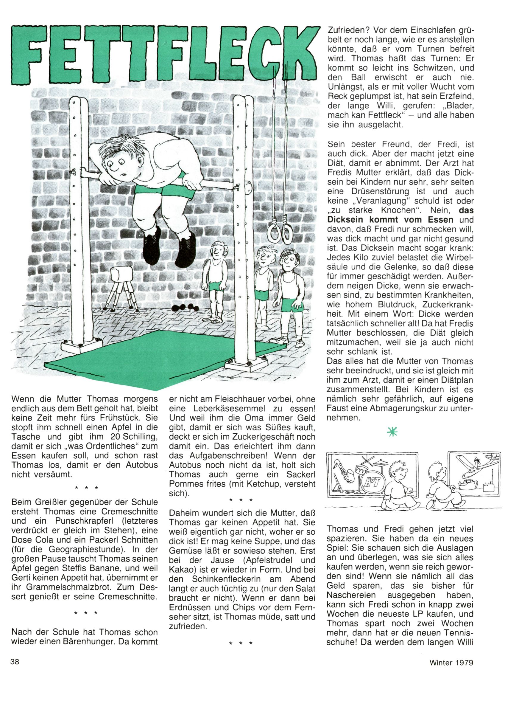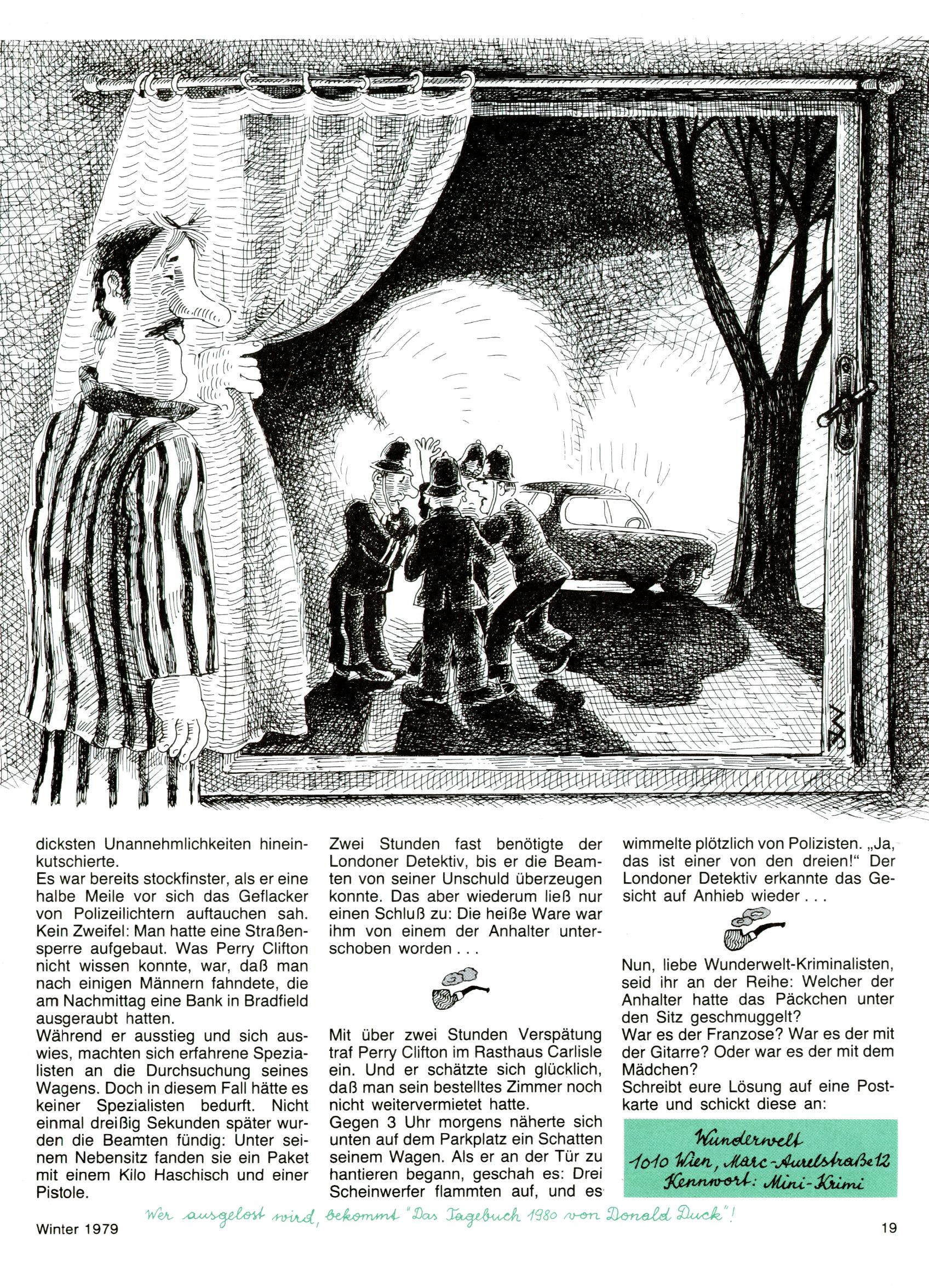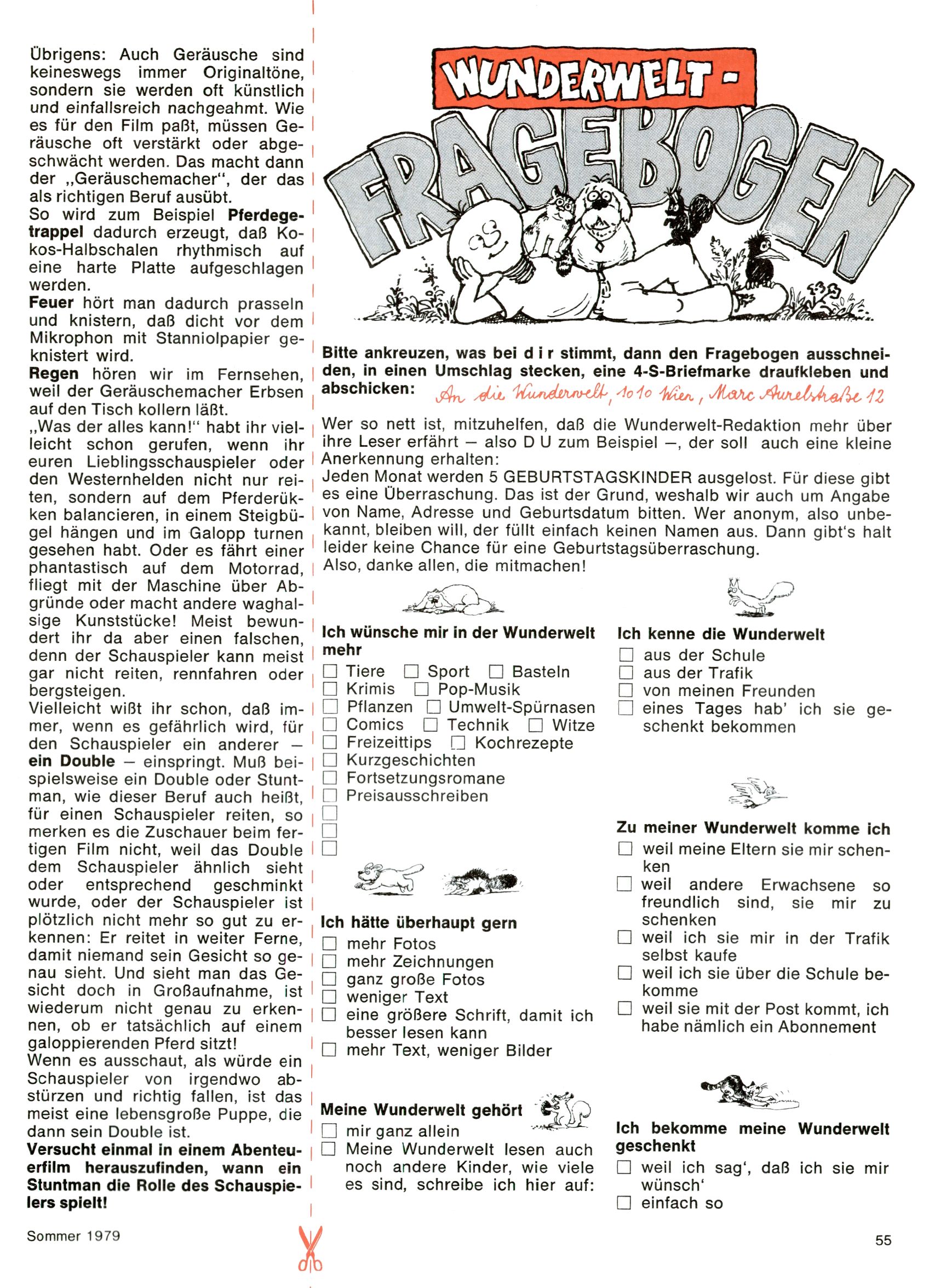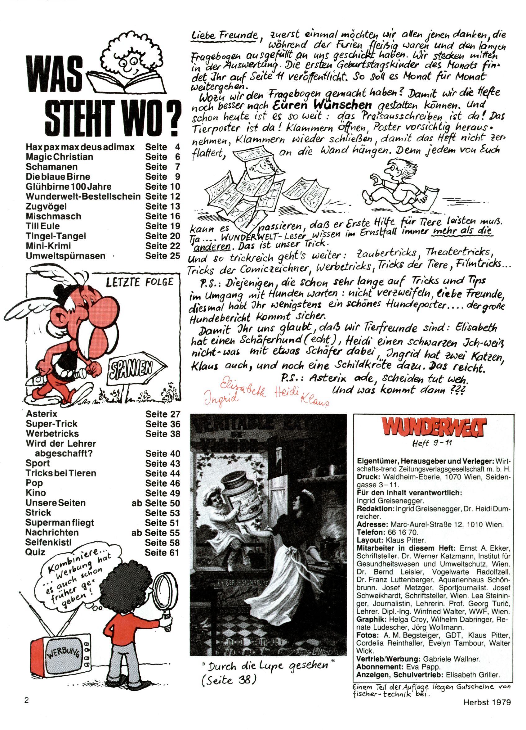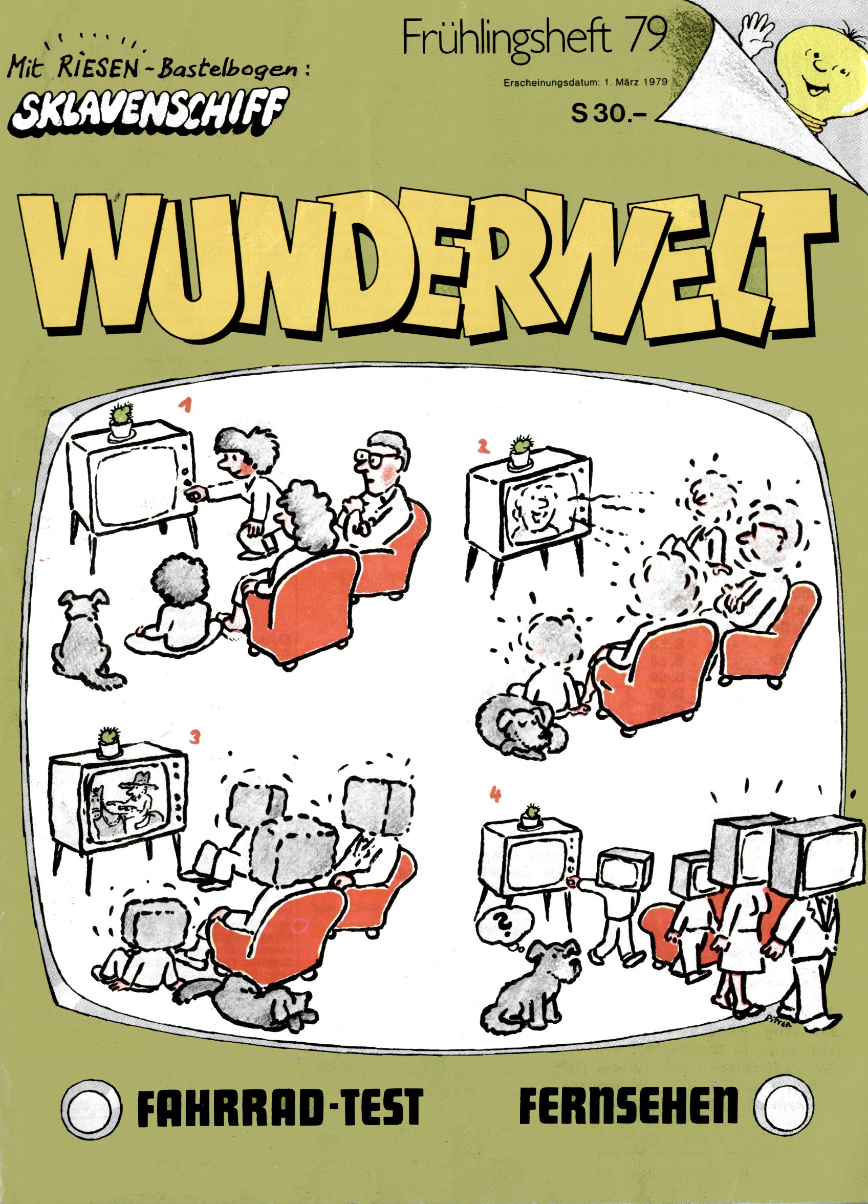 1979 - Zeit für Feinheiten Nachdem man das Grobe geklärt hatte, war es 1979 an der Zeit, der neuen Zeitung einen Schliff zu verpassen. Wilhelm Dabringer begann sich an die Bastelbögen heranzutasten, wenn seine Modelle zunächst auch sehr simpel und nichteinmal in Farbe gestaltet wurden. Die allgemeinen Bastelideen brachten nach wie vor Renate Ludescher und Helga Croy zu Papier. Als erstes echtes Gimmick der Zeitung fand sich zum Jahresausklang eine 2-Minuten-Folien-Schallplatte, nachdem aus der im Sommer mit Fragebogen angekündigten Langspielplatte wohl aus Kostengründen letztlich doch nichts geworden war. Im Herbstheft hatte es aber immerhin bereits eine Art Bastelfigur gegeben ('Glühbirne als Verwandlungskünstler'). Nach der Verabschiedung von Asterix startete Jörg Wollmann gemeinsam mit G. Januszewski die skurrile Umwelt-Cartoon-Fortsetzungsgeschichte Direktor Karl Meidlinger und der Flußgeist. Nach wie vor waren Ernst A. Ekker, Renate Welsh und Wolfgang Ecke die Hauptautoren. Ernst A. Ekker war über alle Jahre hinweg auch immer als Kino-Rezensionist unterwegs. Christine Nöstlinger bekam 1979 ein zweites Gastspielangebot. Immer mehr Reportagen behandelten Umweltthemen - die Aktiv-Umweltspürnasen waren ins Leben gerufen worden. Jugendliche bekamen die Möglichkeit, selbständig unter wissenschaftlicher Anleitung Experimente durchzuführen. Später gründete Ingrid Greisenegger mit Klaus Pitter und Werner Katzmann den Umweltspürnasenclub. Insgesamt wurden 7 Aktivbücher für Umweltspürnasen herausgegeben und ab dem Jahr 2000 sogar nochmals aufgelegt. Mit einem eigenen WunderWelt-Fragebogen versuchte man erstmals, die Meinung der Leser zu hinterfragen, um den weiteren Verlauf der Zeitung den Leserwünschen entsprechend steuern zu können. |