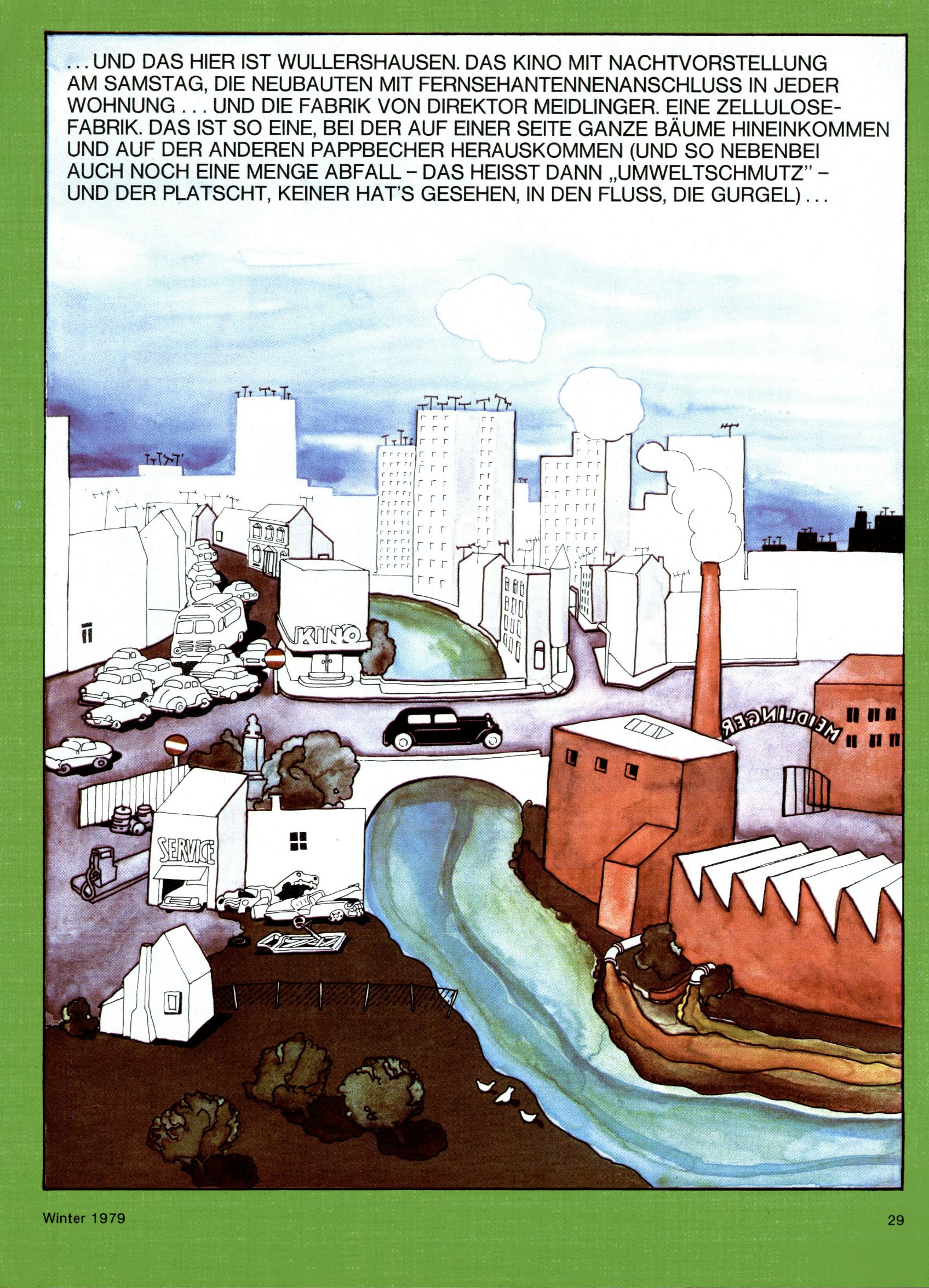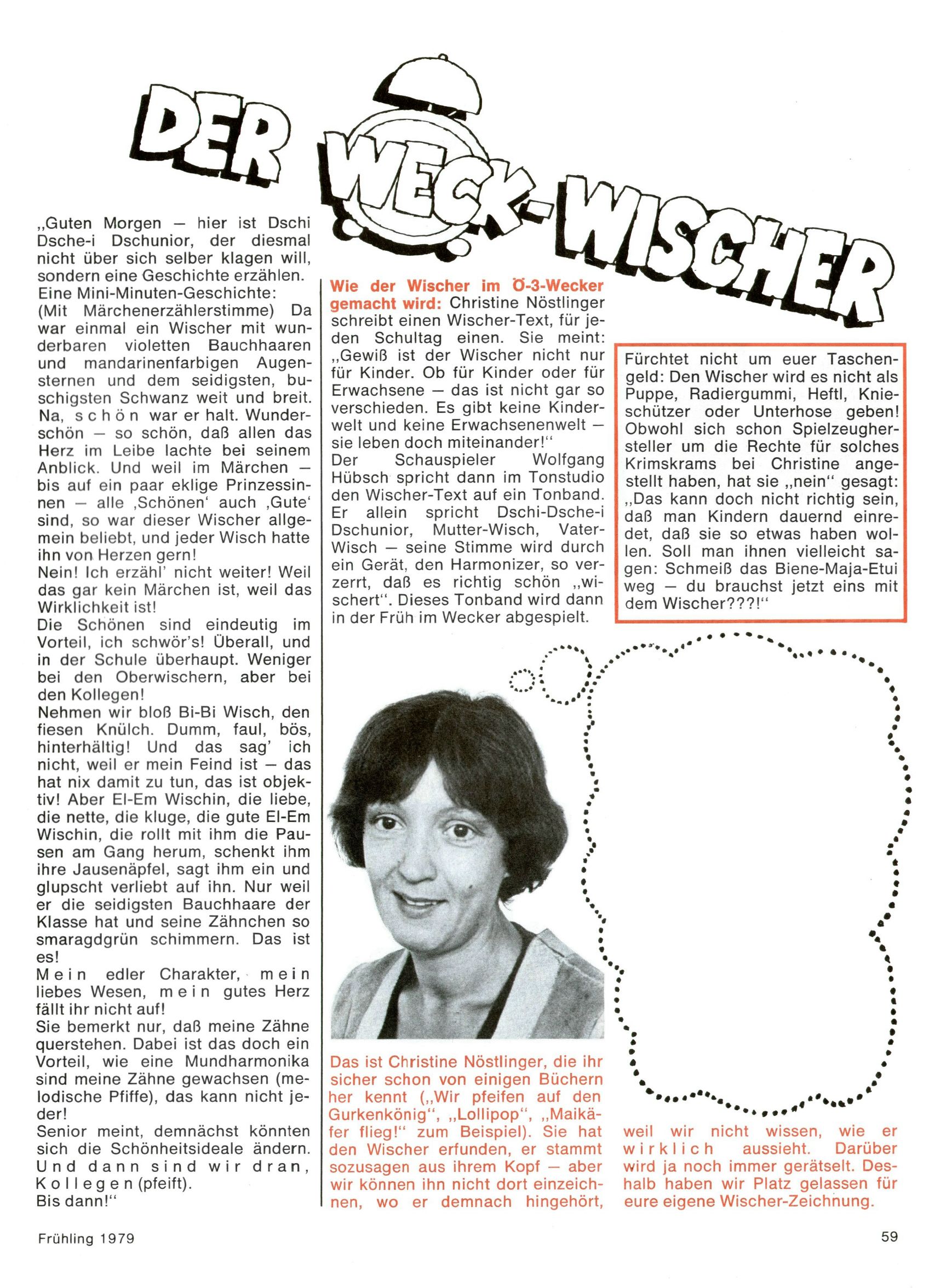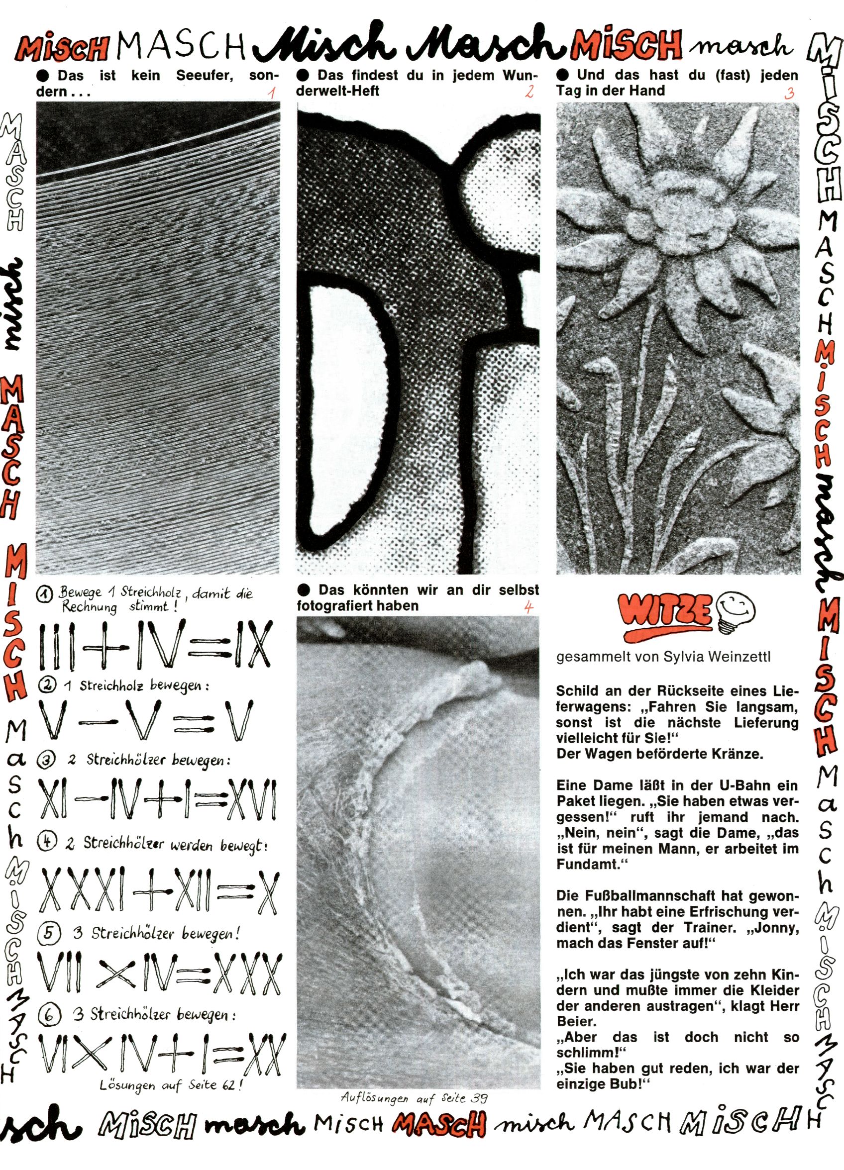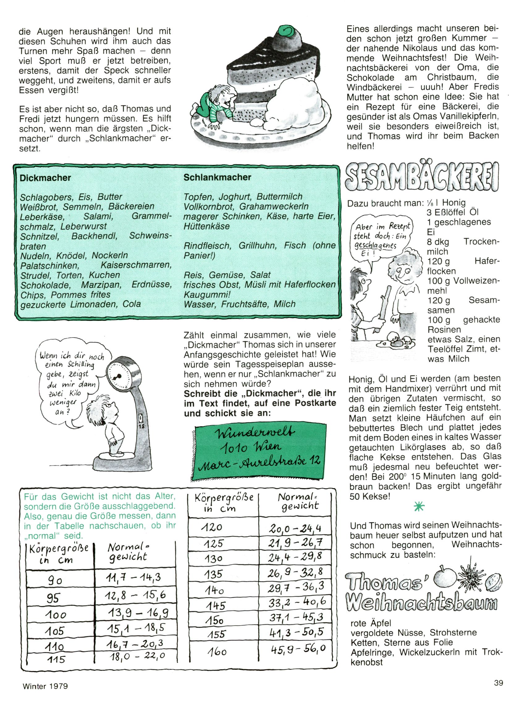 1979 - Zeit für Feinheiten Nachdem man das Grobe geklärt hatte, war es 1979 an der Zeit, der neuen Zeitung einen Schliff zu verpassen. Wilhelm Dabringer begann sich an die Bastelbögen heranzutasten, wenn seine Modelle zunächst auch sehr simpel und nichteinmal in Farbe gestaltet wurden. Die allgemeinen Bastelideen brachten nach wie vor Renate Ludescher und Helga Croy zu Papier. Als erstes echtes Gimmick der Zeitung fand sich zum Jahresausklang eine 2-Minuten-Folien-Schallplatte, nachdem aus der im Sommer mit Fragebogen angekündigten Langspielplatte wohl aus Kostengründen letztlich doch nichts geworden war. Im Herbstheft hatte es aber immerhin bereits eine Art Bastelfigur gegeben ('Glühbirne als Verwandlungskünstler'). Nach der Verabschiedung von Asterix startete Jörg Wollmann gemeinsam mit G. Januszewski die skurrile Umwelt-Cartoon-Fortsetzungsgeschichte Direktor Karl Meidlinger und der Flußgeist. Nach wie vor waren Ernst A. Ekker, Renate Welsh und Wolfgang Ecke die Hauptautoren. Ernst A. Ekker war über alle Jahre hinweg auch immer als Kino-Rezensionist unterwegs. Christine Nöstlinger bekam 1979 ein zweites Gastspielangebot. Immer mehr Reportagen behandelten Umweltthemen - die Aktiv-Umweltspürnasen waren ins Leben gerufen worden. Jugendliche bekamen die Möglichkeit, selbständig unter wissenschaftlicher Anleitung Experimente durchzuführen. Später gründete Ingrid Greisenegger mit Klaus Pitter und Werner Katzmann den Umweltspürnasenclub. Insgesamt wurden 7 Aktivbücher für Umweltspürnasen herausgegeben und ab dem Jahr 2000 sogar nochmals aufgelegt. Mit einem eigenen WunderWelt-Fragebogen versuchte man erstmals, die Meinung der Leser zu hinterfragen, um den weiteren Verlauf der Zeitung den Leserwünschen entsprechend steuern zu können. |