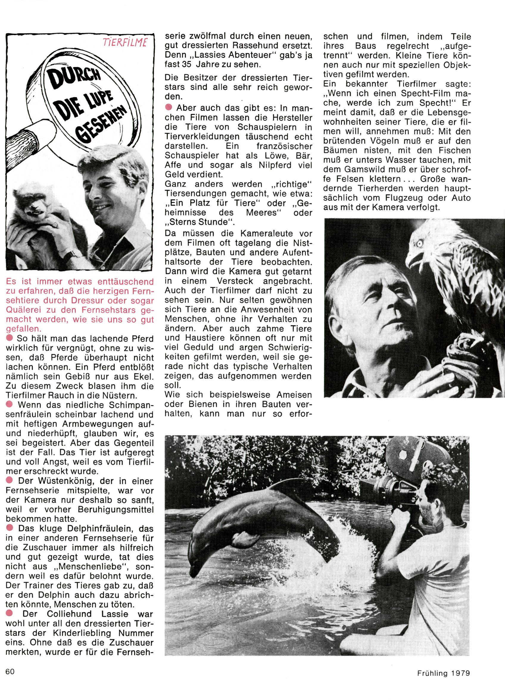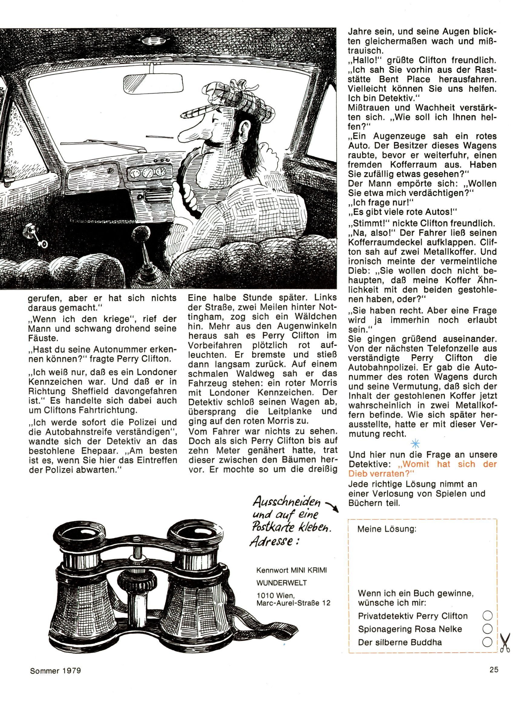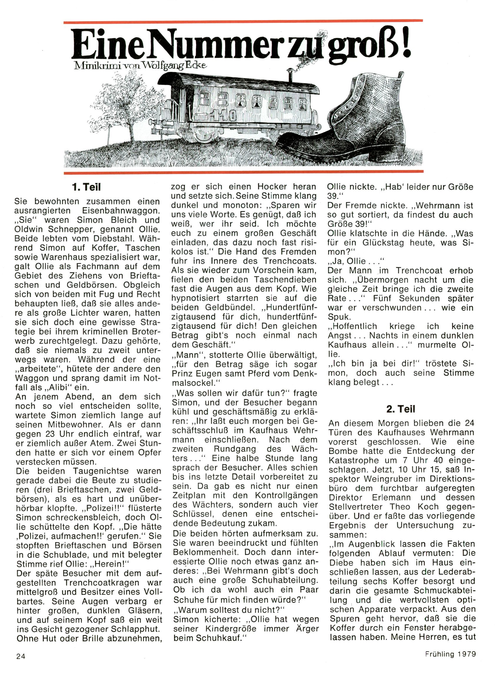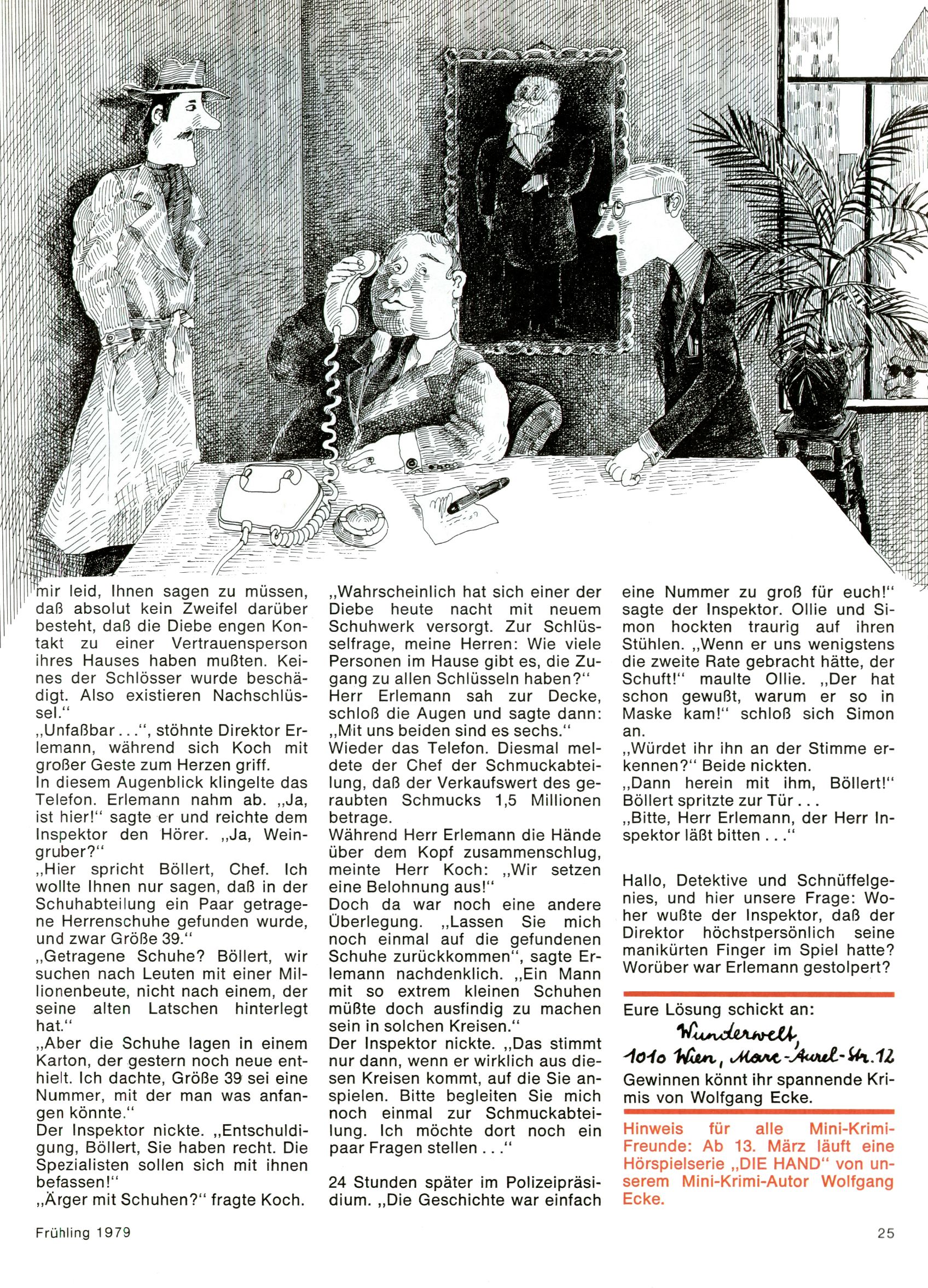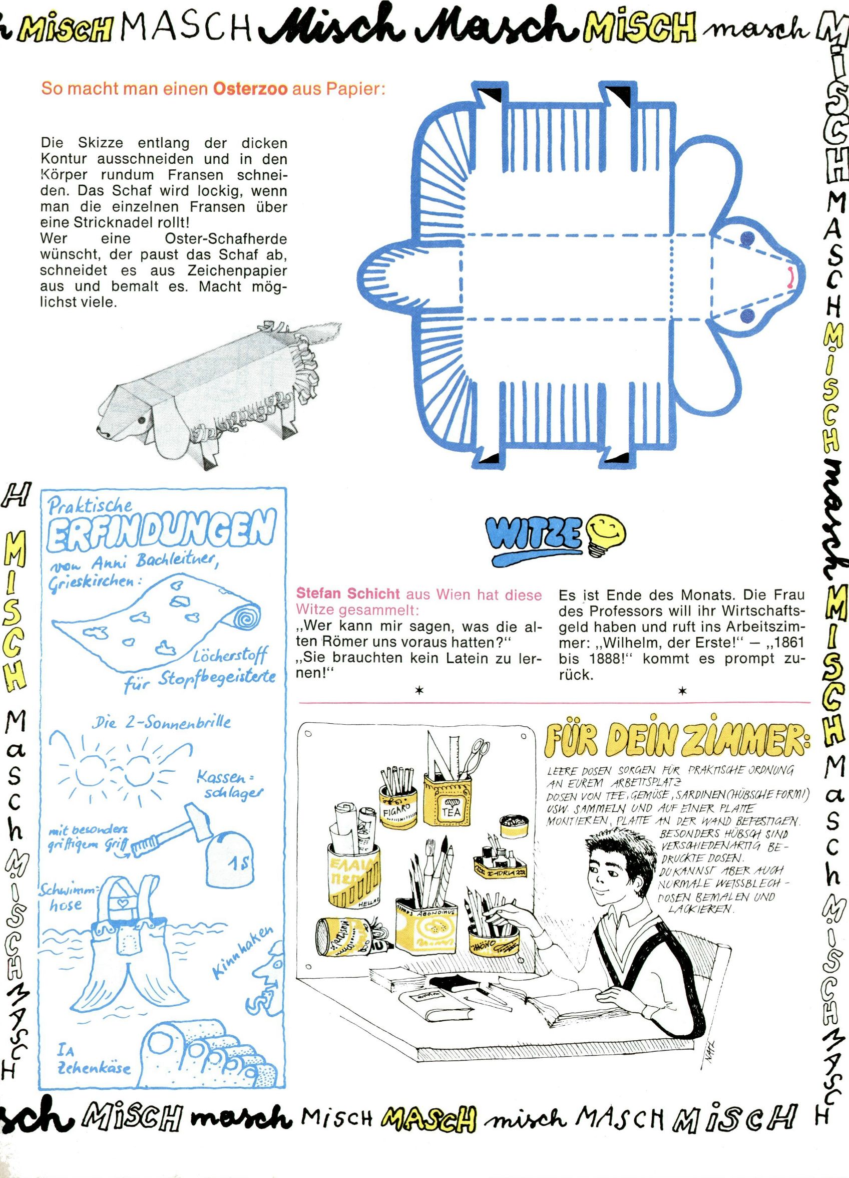 1979 - Zeit für Feinheiten Nachdem man das Grobe geklärt hatte, war es 1979 an der Zeit, der neuen Zeitung einen Schliff zu verpassen. Wilhelm Dabringer begann sich an die Bastelbögen heranzutasten, wenn seine Modelle zunächst auch sehr simpel und nichteinmal in Farbe gestaltet wurden. Die allgemeinen Bastelideen brachten nach wie vor Renate Ludescher und Helga Croy zu Papier. Als erstes echtes Gimmick der Zeitung fand sich zum Jahresausklang eine 2-Minuten-Folien-Schallplatte, nachdem aus der im Sommer mit Fragebogen angekündigten Langspielplatte wohl aus Kostengründen letztlich doch nichts geworden war. Im Herbstheft hatte es aber immerhin bereits eine Art Bastelfigur gegeben ('Glühbirne als Verwandlungskünstler'). Nach der Verabschiedung von Asterix startete Jörg Wollmann gemeinsam mit G. Januszewski die skurrile Umwelt-Cartoon-Fortsetzungsgeschichte Direktor Karl Meidlinger und der Flußgeist. Nach wie vor waren Ernst A. Ekker, Renate Welsh und Wolfgang Ecke die Hauptautoren. Ernst A. Ekker war über alle Jahre hinweg auch immer als Kino-Rezensionist unterwegs. Christine Nöstlinger bekam 1979 ein zweites Gastspielangebot. Immer mehr Reportagen behandelten Umweltthemen - die Aktiv-Umweltspürnasen waren ins Leben gerufen worden. Jugendliche bekamen die Möglichkeit, selbständig unter wissenschaftlicher Anleitung Experimente durchzuführen. Später gründete Ingrid Greisenegger mit Klaus Pitter und Werner Katzmann den Umweltspürnasenclub. Insgesamt wurden 7 Aktivbücher für Umweltspürnasen herausgegeben und ab dem Jahr 2000 sogar nochmals aufgelegt. Mit einem eigenen WunderWelt-Fragebogen versuchte man erstmals, die Meinung der Leser zu hinterfragen, um den weiteren Verlauf der Zeitung den Leserwünschen entsprechend steuern zu können. |