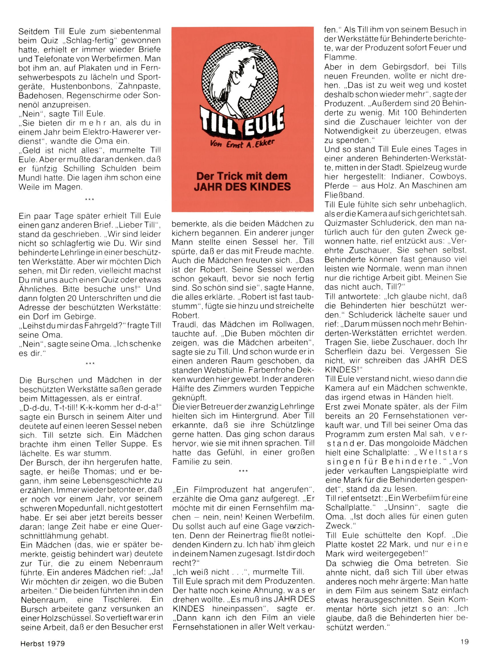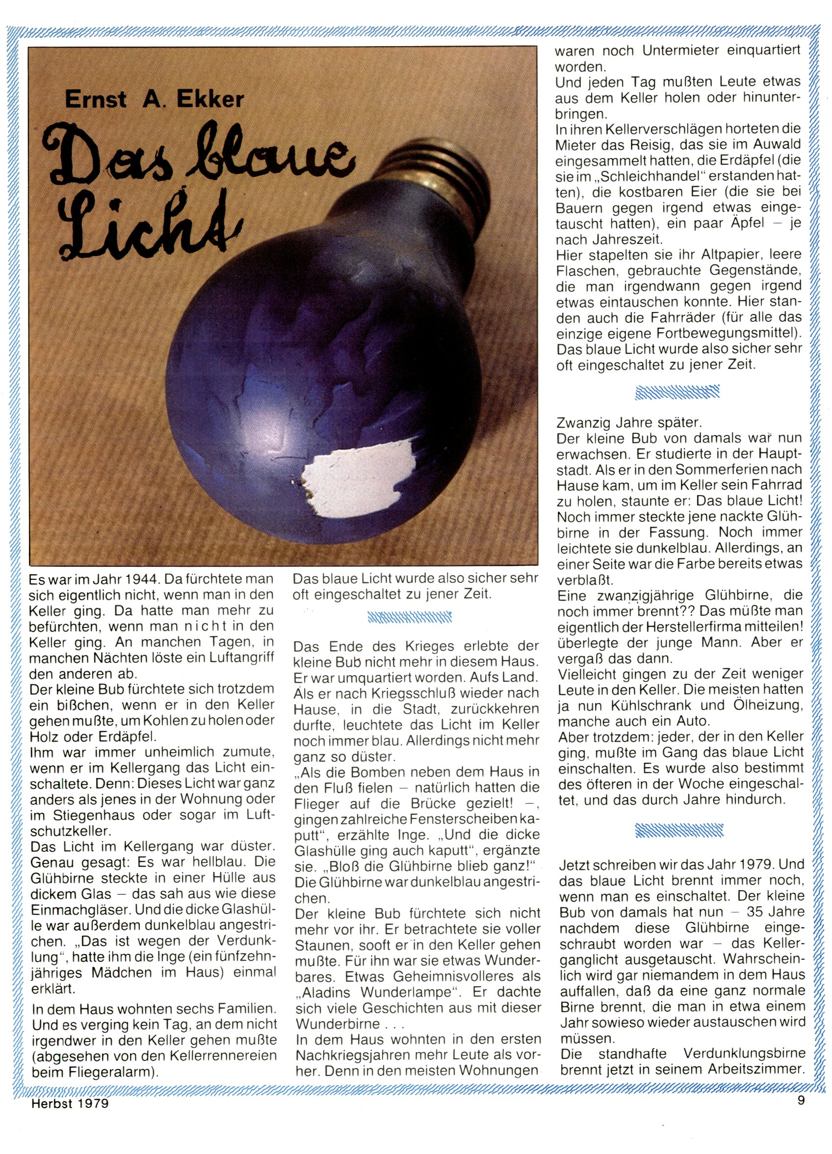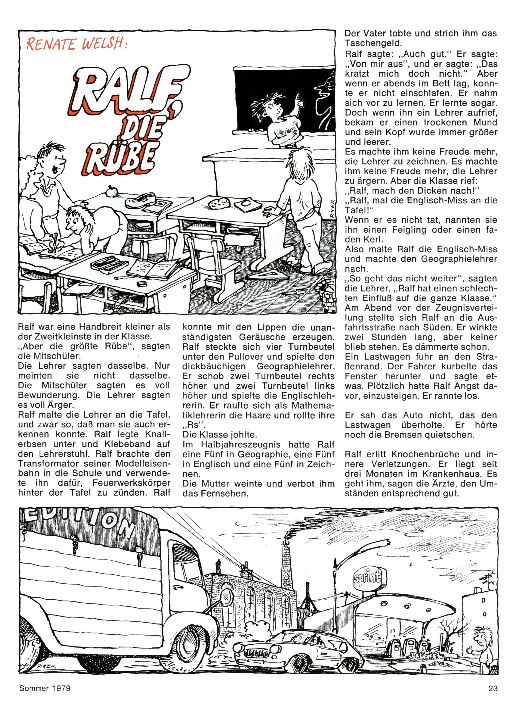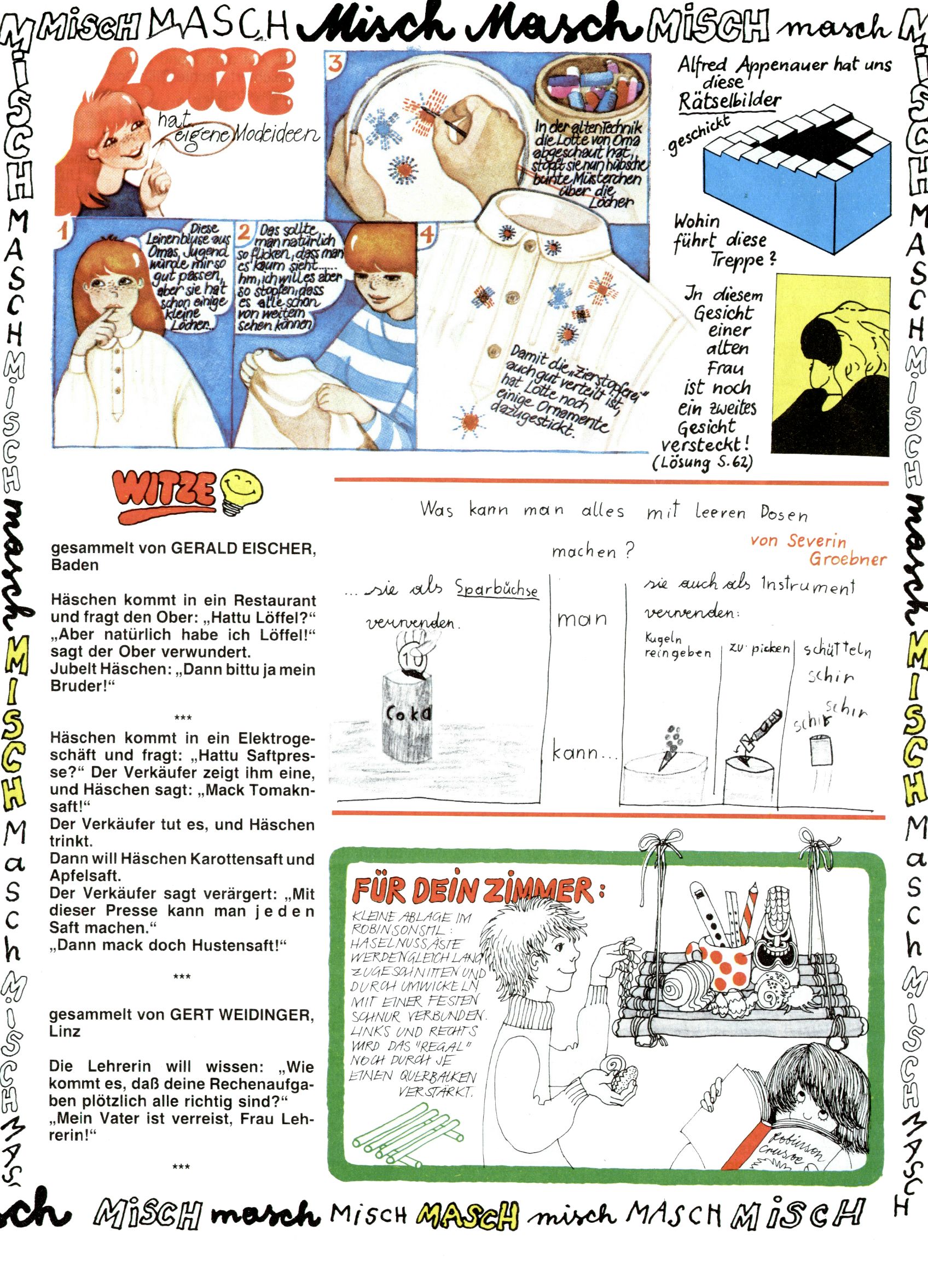 1979 - Zeit für Feinheiten Nachdem man das Grobe geklärt hatte, war es 1979 an der Zeit, der neuen Zeitung einen Schliff zu verpassen. Wilhelm Dabringer begann sich an die Bastelbögen heranzutasten, wenn seine Modelle zunächst auch sehr simpel und nichteinmal in Farbe gestaltet wurden. Die allgemeinen Bastelideen brachten nach wie vor Renate Ludescher und Helga Croy zu Papier. Als erstes echtes Gimmick der Zeitung fand sich zum Jahresausklang eine 2-Minuten-Folien-Schallplatte, nachdem aus der im Sommer mit Fragebogen angekündigten Langspielplatte wohl aus Kostengründen letztlich doch nichts geworden war. Im Herbstheft hatte es aber immerhin bereits eine Art Bastelfigur gegeben ('Glühbirne als Verwandlungskünstler'). Nach der Verabschiedung von Asterix startete Jörg Wollmann gemeinsam mit G. Januszewski die skurrile Umwelt-Cartoon-Fortsetzungsgeschichte Direktor Karl Meidlinger und der Flußgeist. Nach wie vor waren Ernst A. Ekker, Renate Welsh und Wolfgang Ecke die Hauptautoren. Ernst A. Ekker war über alle Jahre hinweg auch immer als Kino-Rezensionist unterwegs. Christine Nöstlinger bekam 1979 ein zweites Gastspielangebot. Immer mehr Reportagen behandelten Umweltthemen - die Aktiv-Umweltspürnasen waren ins Leben gerufen worden. Jugendliche bekamen die Möglichkeit, selbständig unter wissenschaftlicher Anleitung Experimente durchzuführen. Später gründete Ingrid Greisenegger mit Klaus Pitter und Werner Katzmann den Umweltspürnasenclub. Insgesamt wurden 7 Aktivbücher für Umweltspürnasen herausgegeben und ab dem Jahr 2000 sogar nochmals aufgelegt. Mit einem eigenen WunderWelt-Fragebogen versuchte man erstmals, die Meinung der Leser zu hinterfragen, um den weiteren Verlauf der Zeitung den Leserwünschen entsprechend steuern zu können. |