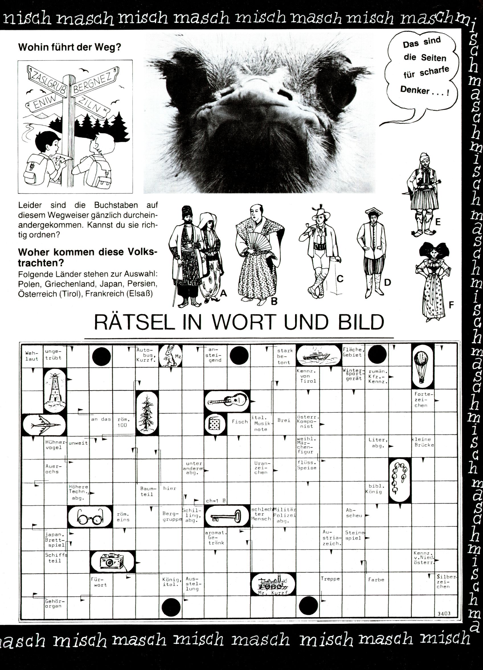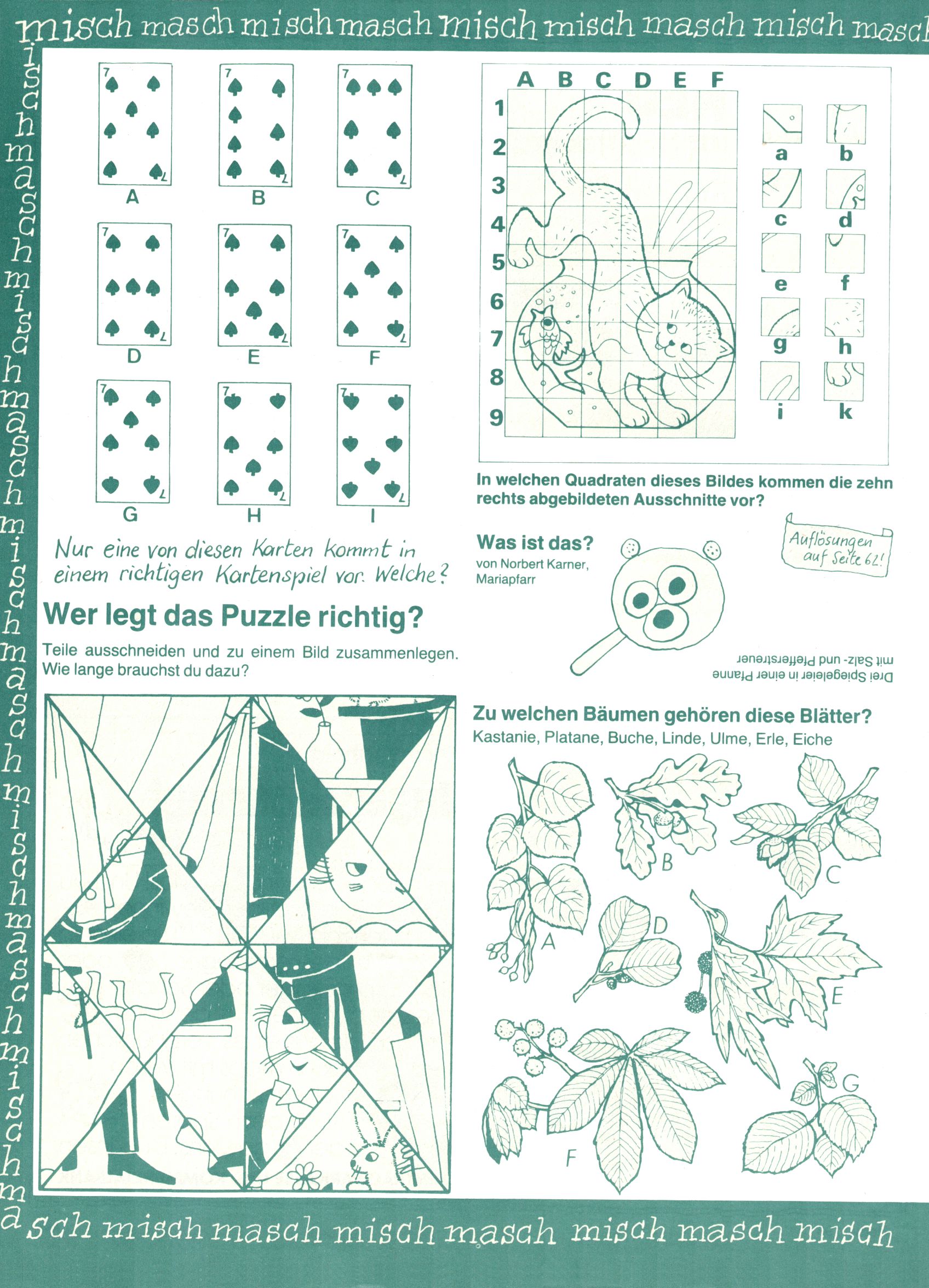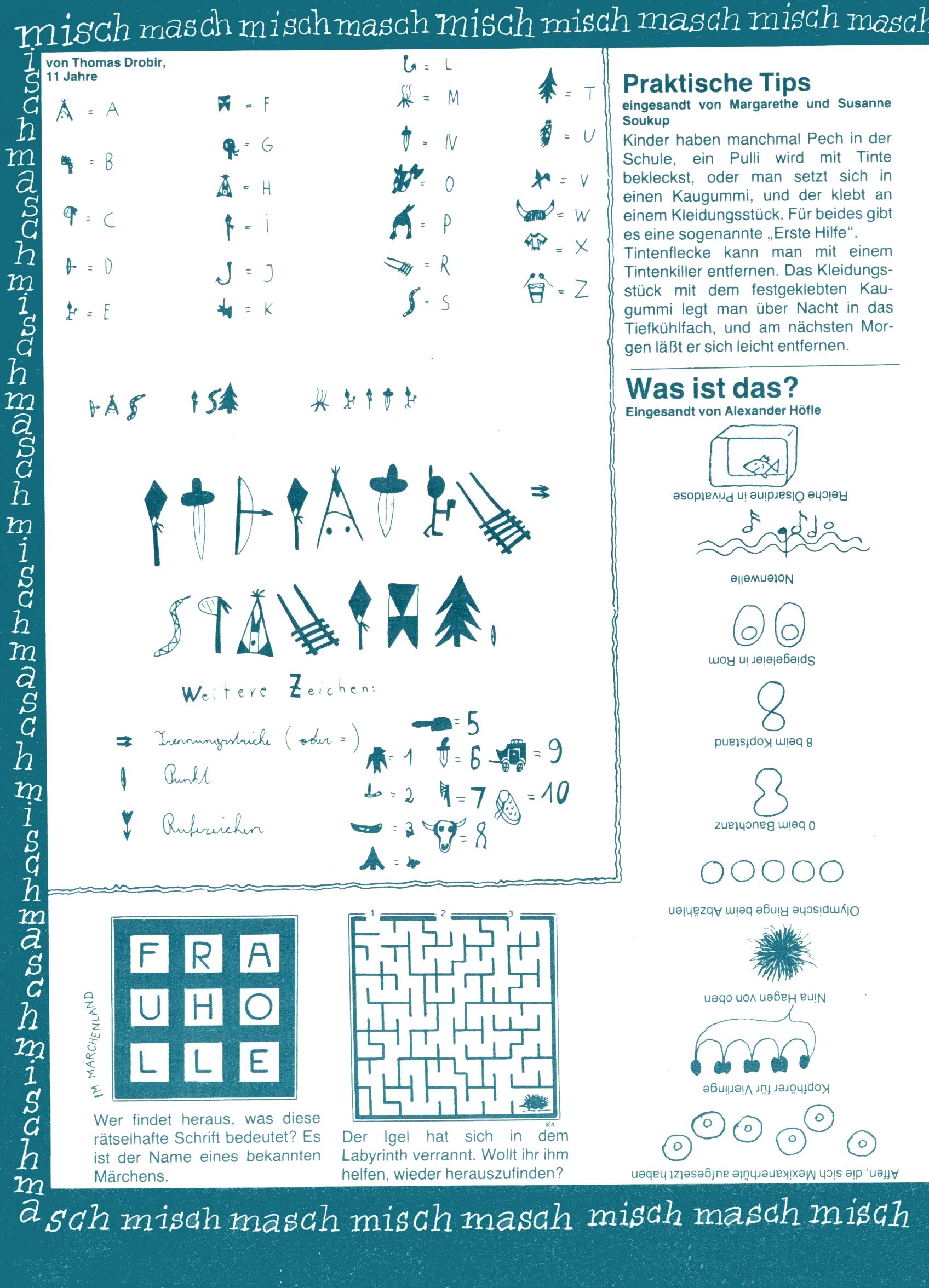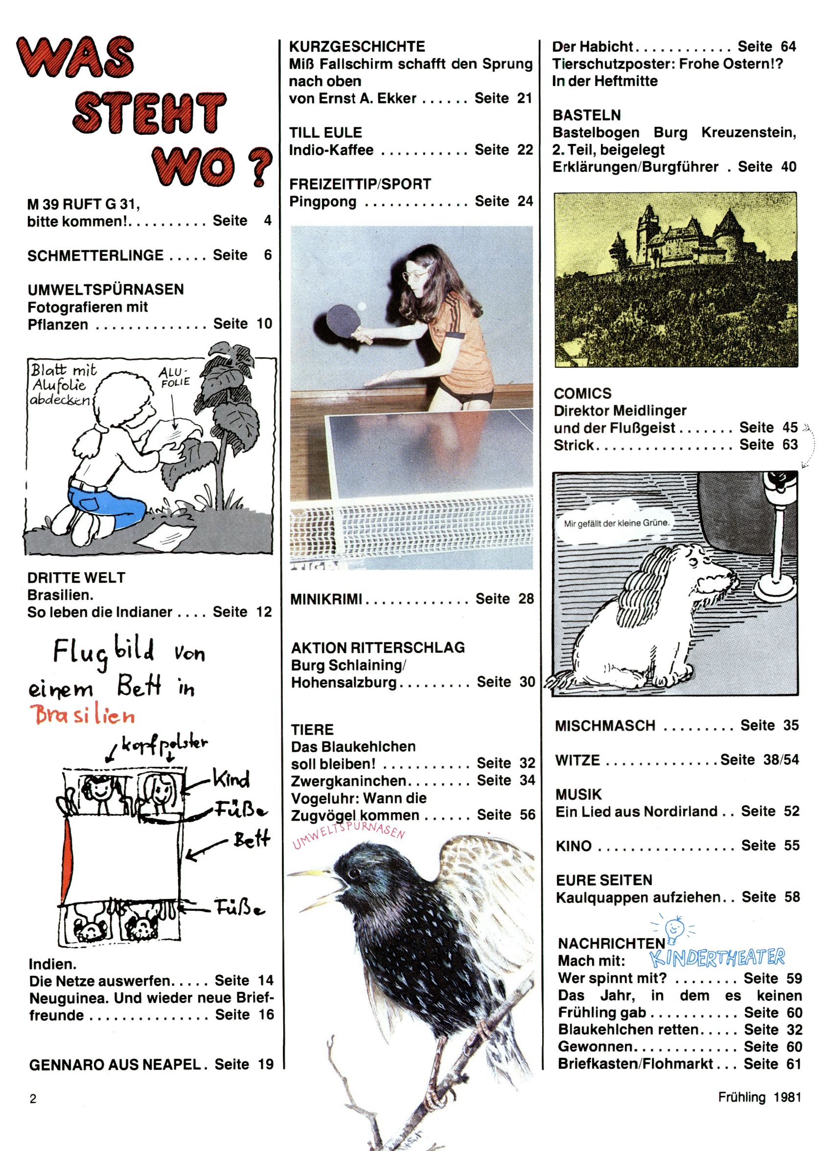 [A]usschneiden | [B]asteln/Handwerken | [C]omic | [E]rzählung/Märchen/Sage | [F]oto/Bild [G]edicht/Lied | [I]nformatives | [N]atur | [R]ätsel | [S]port/Spiel | [T]echnik/Wissen | [W]erbung |