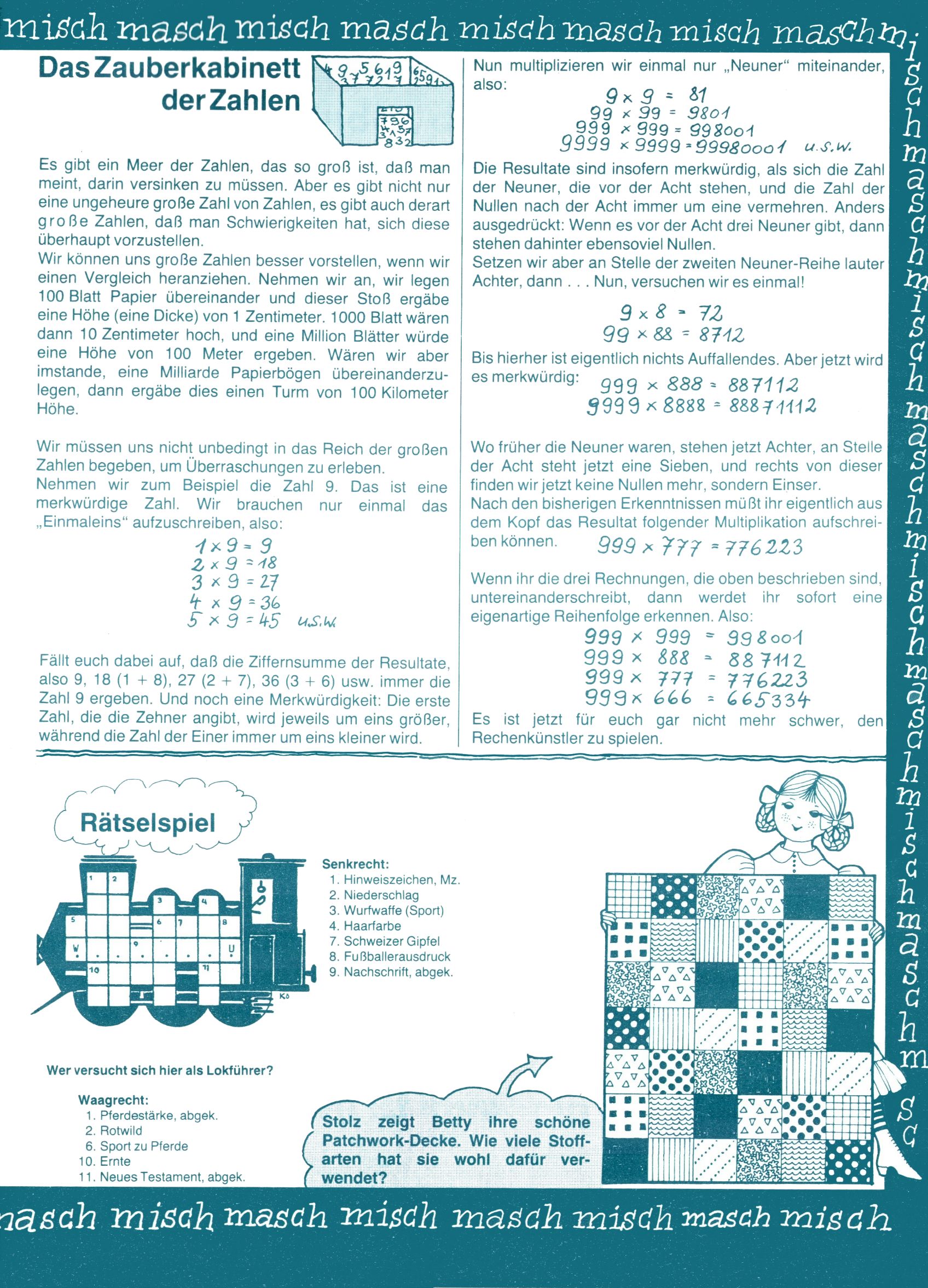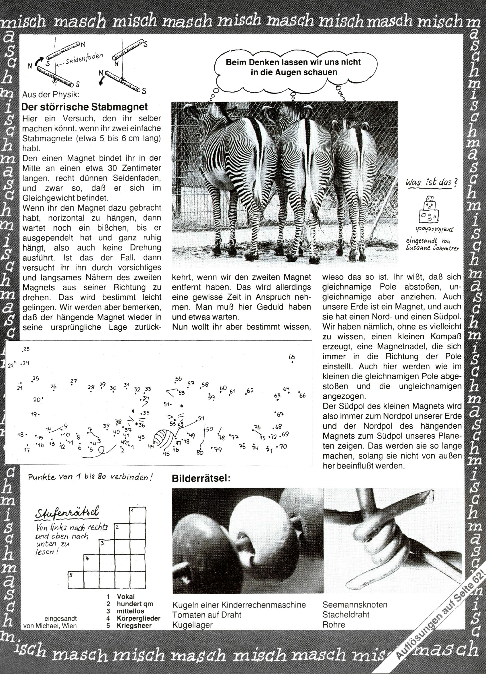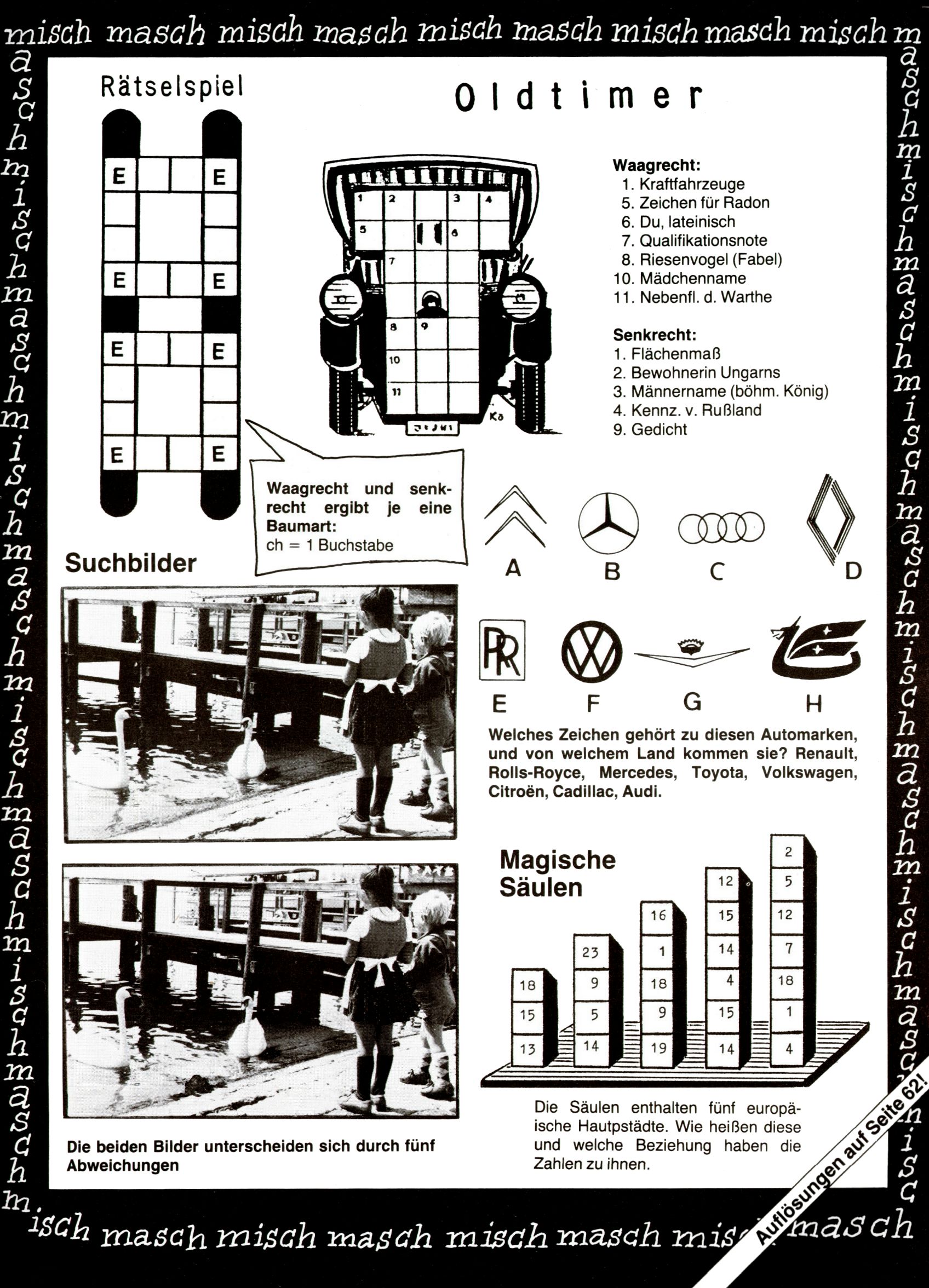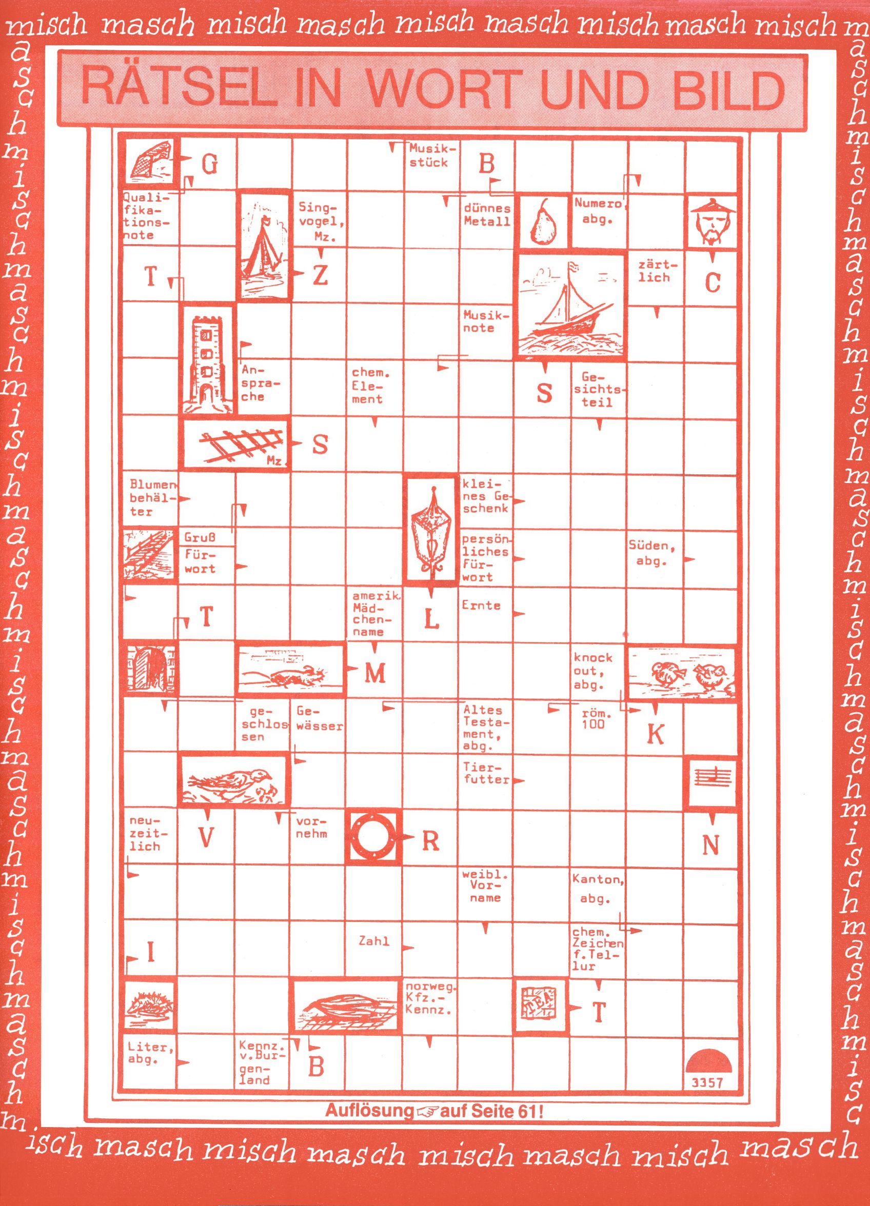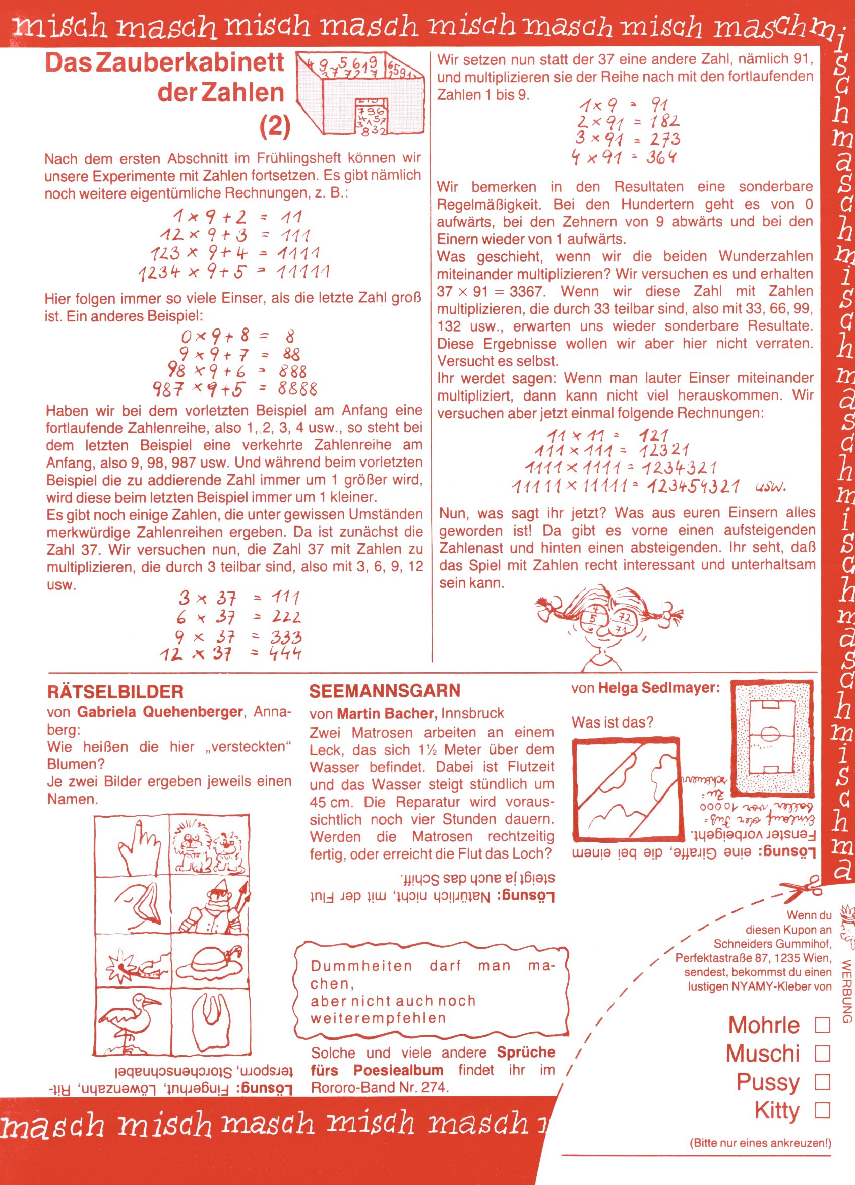 [A]usschneiden | [B]asteln/Handwerken | [C]omic | [E]rzählung/Märchen/Sage | [F]oto/Bild [G]edicht/Lied | [I]nformatives | [N]atur | [R]ätsel | [S]port/Spiel | [T]echnik/Wissen | [W]erbung |