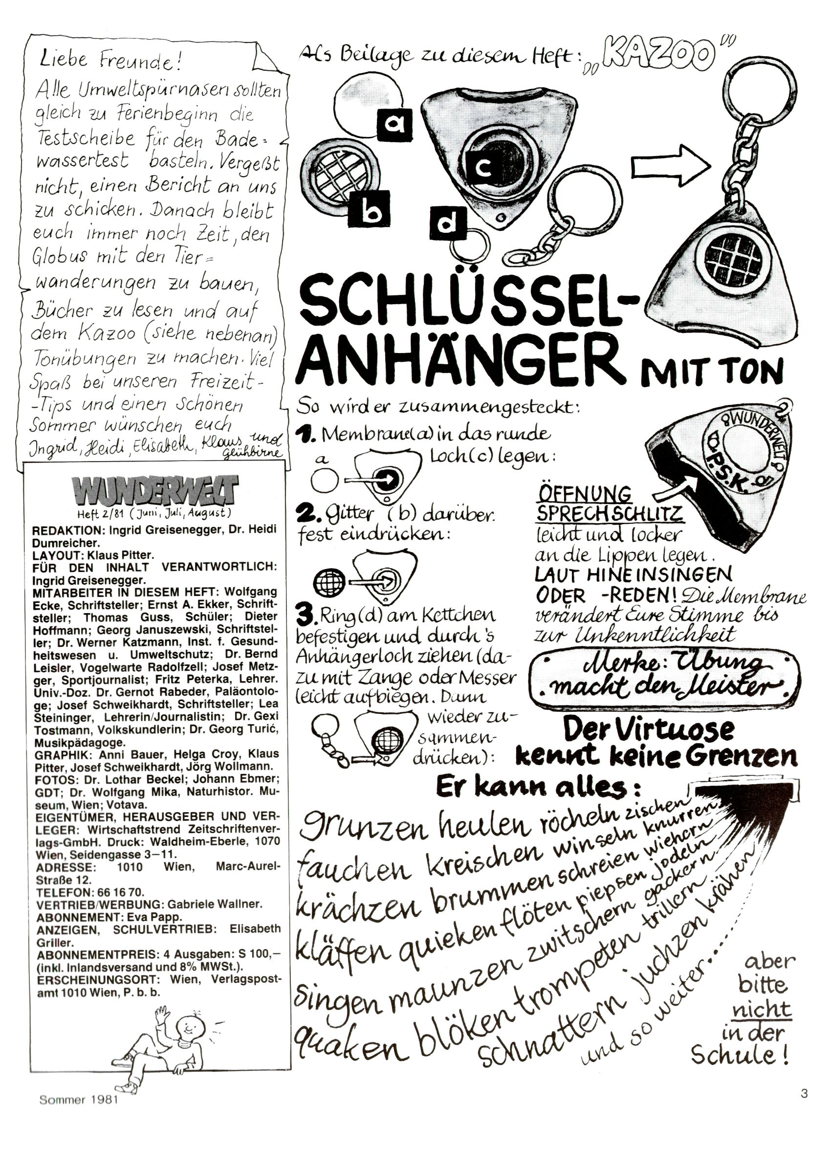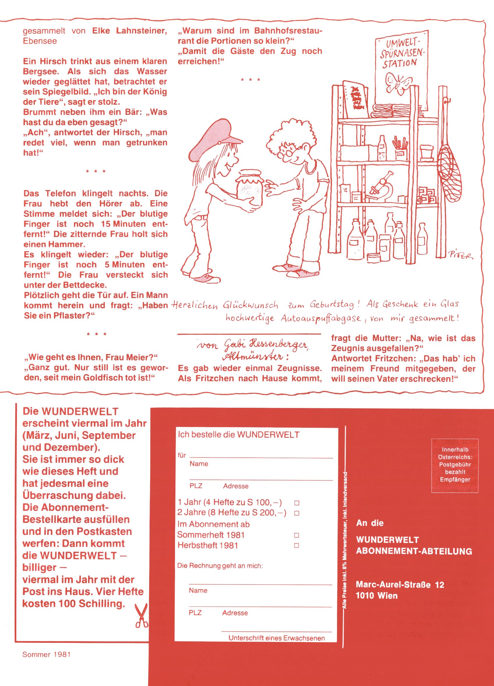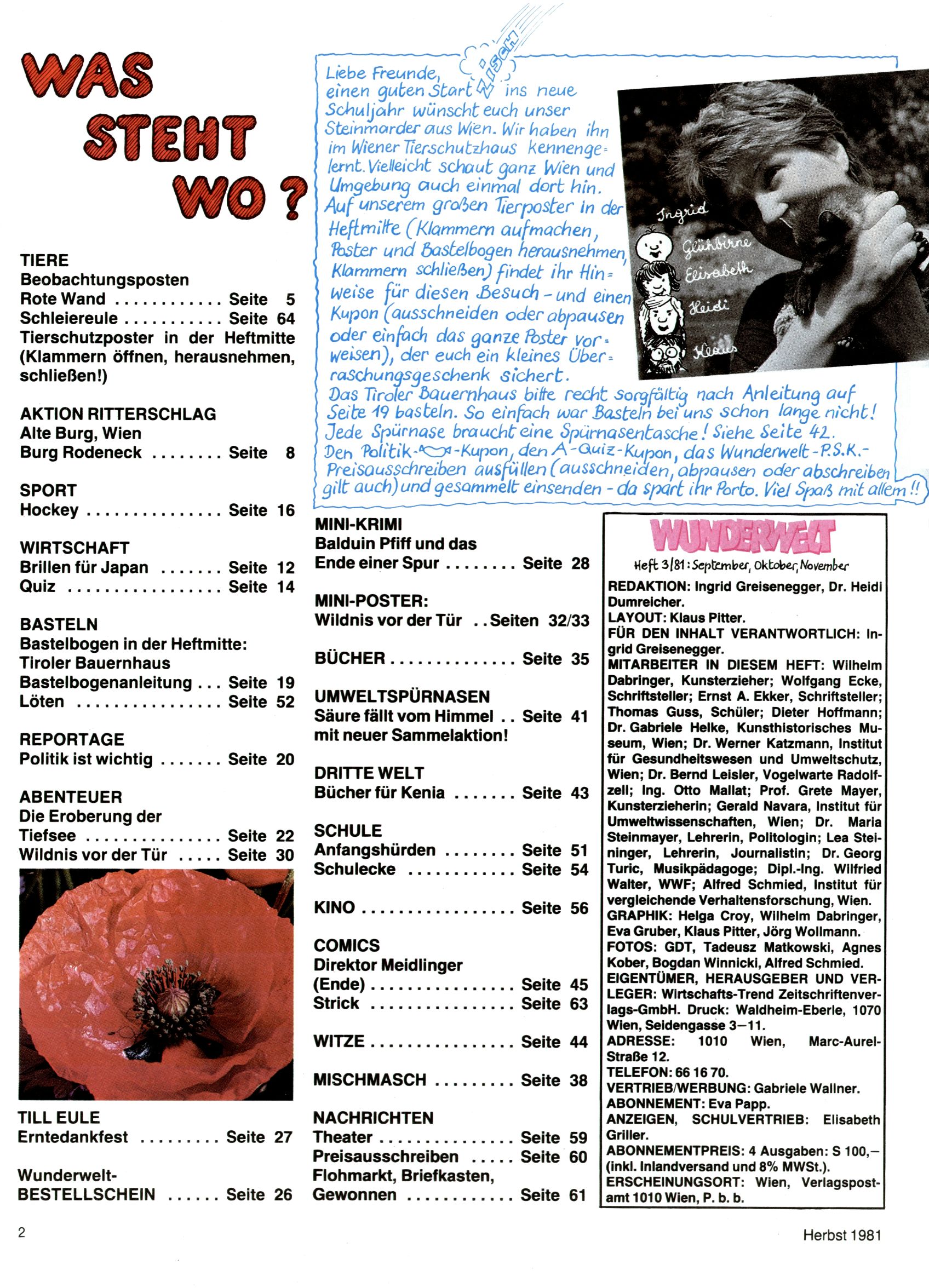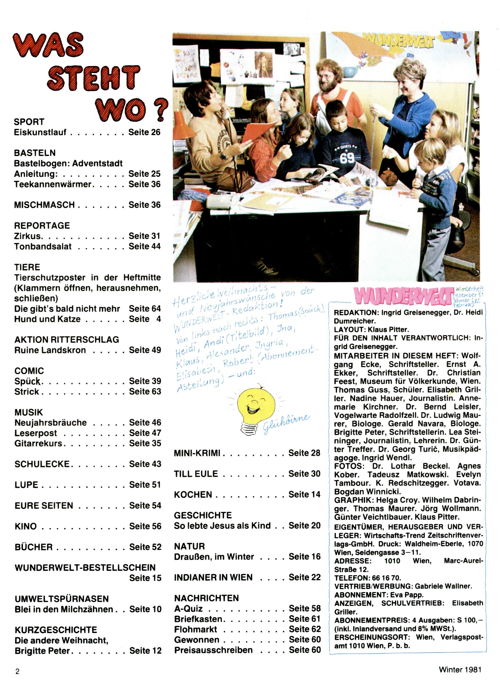 1981 - Ökosoziale Bildung ohne politische Beeinflussung Ein besonderes Kunststück, das dem Redaktionsteam der WunderWelt gelang, war es, über zehn Jahre hinweg ökologische, politische und soziale Themen anzufassen, ohne sich in Tagesthemen einzumischen oder eine politische Richtung vorzugeben. Selbst die Konkurrenz wurde trotz schwerer Verfehlungen fair und objektiv behandelt. Diesmal wurde das Konkurrenzblatt Yps unter die Lupe genommen, das als Marktführer im deutschsprachigen Raum für seine Reichweite mehrere Millionen Schmetterlinge hatte töten lassen, um diese den Lesern zu präsentieren. Die Antwort der WunderWelt war es, in einem Bildbericht die Schönheit der Schmetterlinge aufzuzeigen und dann in einem neutral gefassten Artikel die Leser um ihre Meinung zu fragen. Vorbildlicher hätte eine Redaktion kaum arbeiten können. Der Lohn dieser Arbeit war der Staatspreis für journalistische Leistungen im Interesse für die Jugend für Ingrid Greisenegger durch die Republik Österreich. Das Team der WunderWelt hatte nunmehr seinen Stil gefunden und verfeinert; demzufolge gab es 1981 abgesehen von einem Dritte-Welt-Schwerpunkt keine erwähnenswerten Neuerungen mehr. |