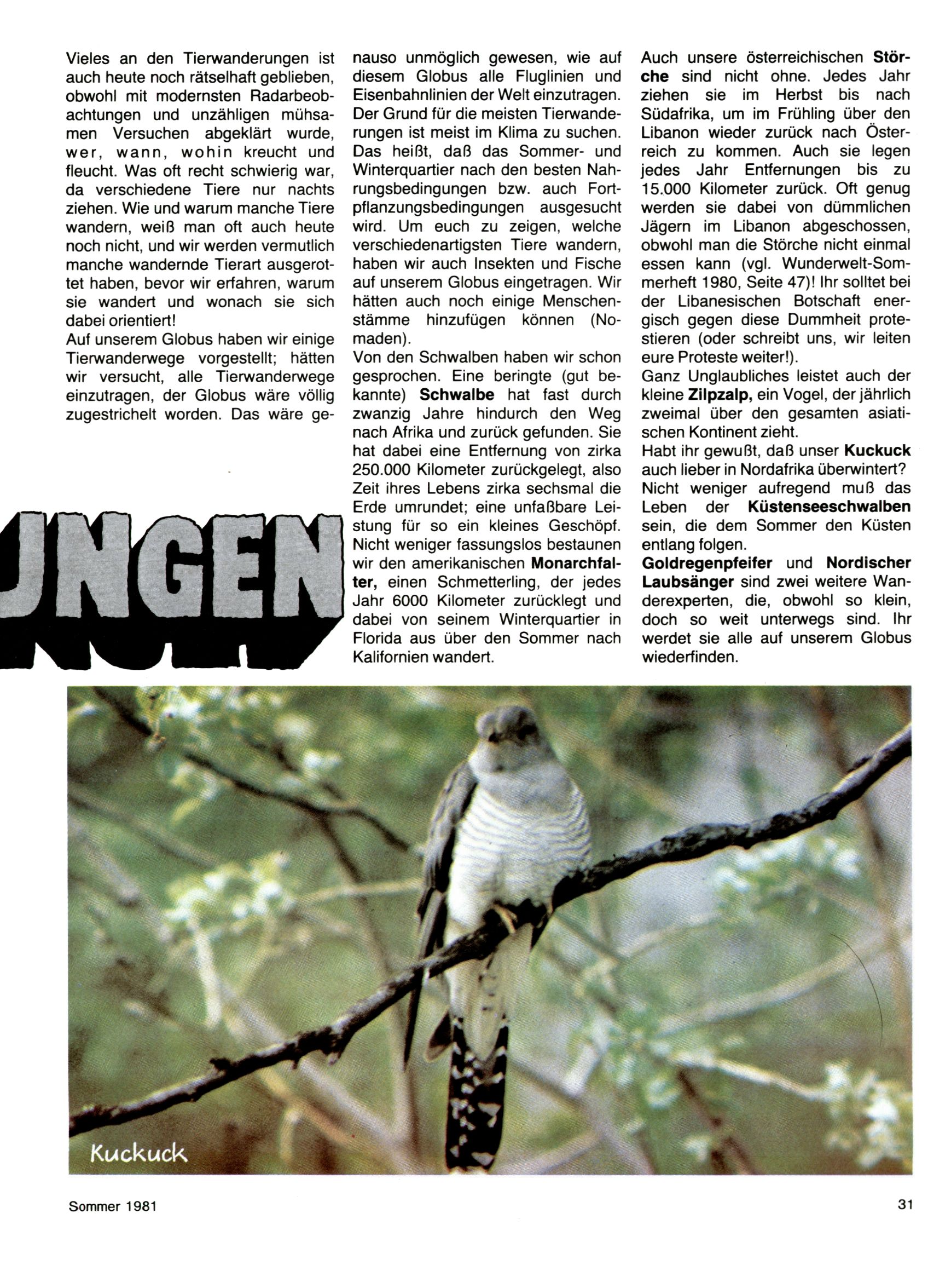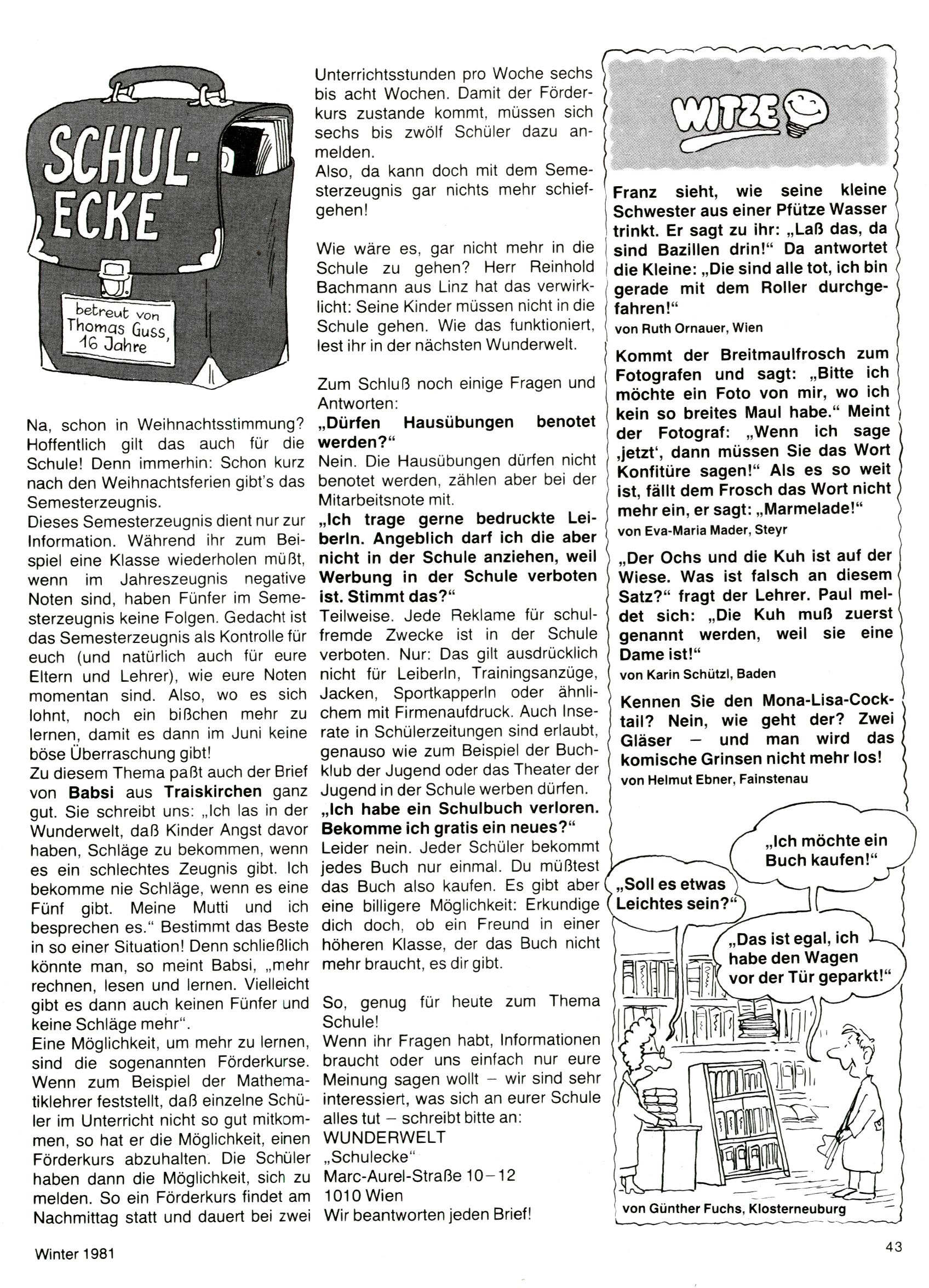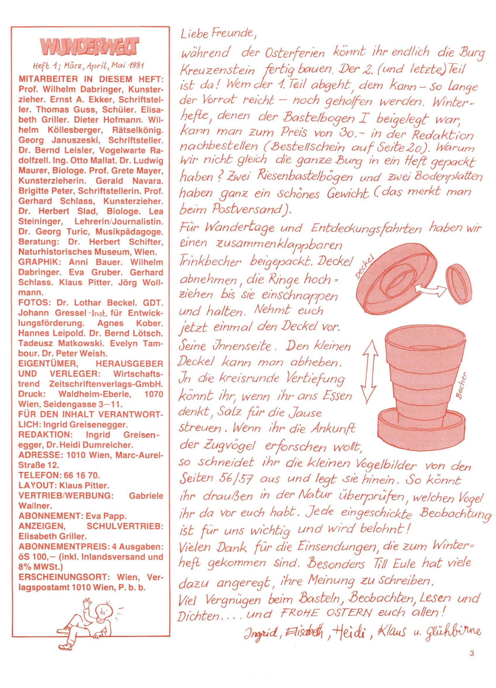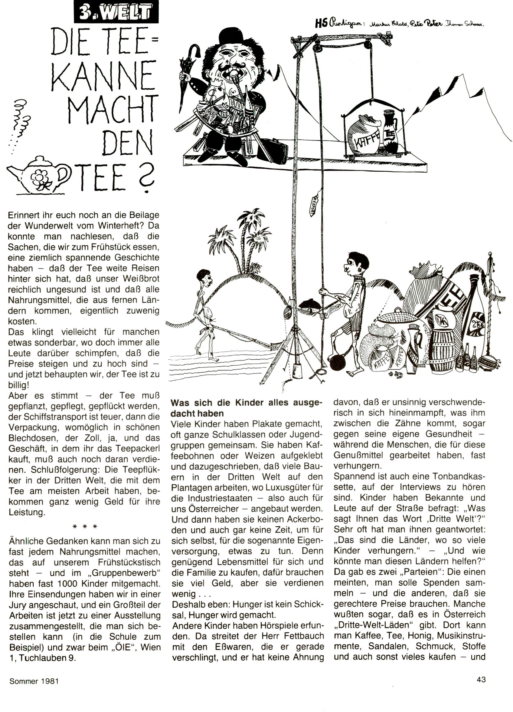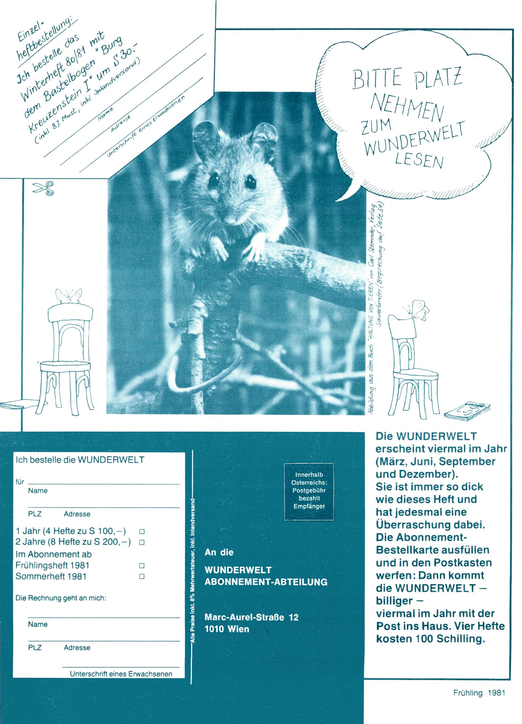 1981 - Ökosoziale Bildung ohne politische Beeinflussung Ein besonderes Kunststück, das dem Redaktionsteam der WunderWelt gelang, war es, über zehn Jahre hinweg ökologische, politische und soziale Themen anzufassen, ohne sich in Tagesthemen einzumischen oder eine politische Richtung vorzugeben. Selbst die Konkurrenz wurde trotz schwerer Verfehlungen fair und objektiv behandelt. Diesmal wurde das Konkurrenzblatt Yps unter die Lupe genommen, das als Marktführer im deutschsprachigen Raum für seine Reichweite mehrere Millionen Schmetterlinge hatte töten lassen, um diese den Lesern zu präsentieren. Die Antwort der WunderWelt war es, in einem Bildbericht die Schönheit der Schmetterlinge aufzuzeigen und dann in einem neutral gefassten Artikel die Leser um ihre Meinung zu fragen. Vorbildlicher hätte eine Redaktion kaum arbeiten können. Der Lohn dieser Arbeit war der Staatspreis für journalistische Leistungen im Interesse für die Jugend für Ingrid Greisenegger durch die Republik Österreich. Das Team der WunderWelt hatte nunmehr seinen Stil gefunden und verfeinert; demzufolge gab es 1981 abgesehen von einem Dritte-Welt-Schwerpunkt keine erwähnenswerten Neuerungen mehr. |
