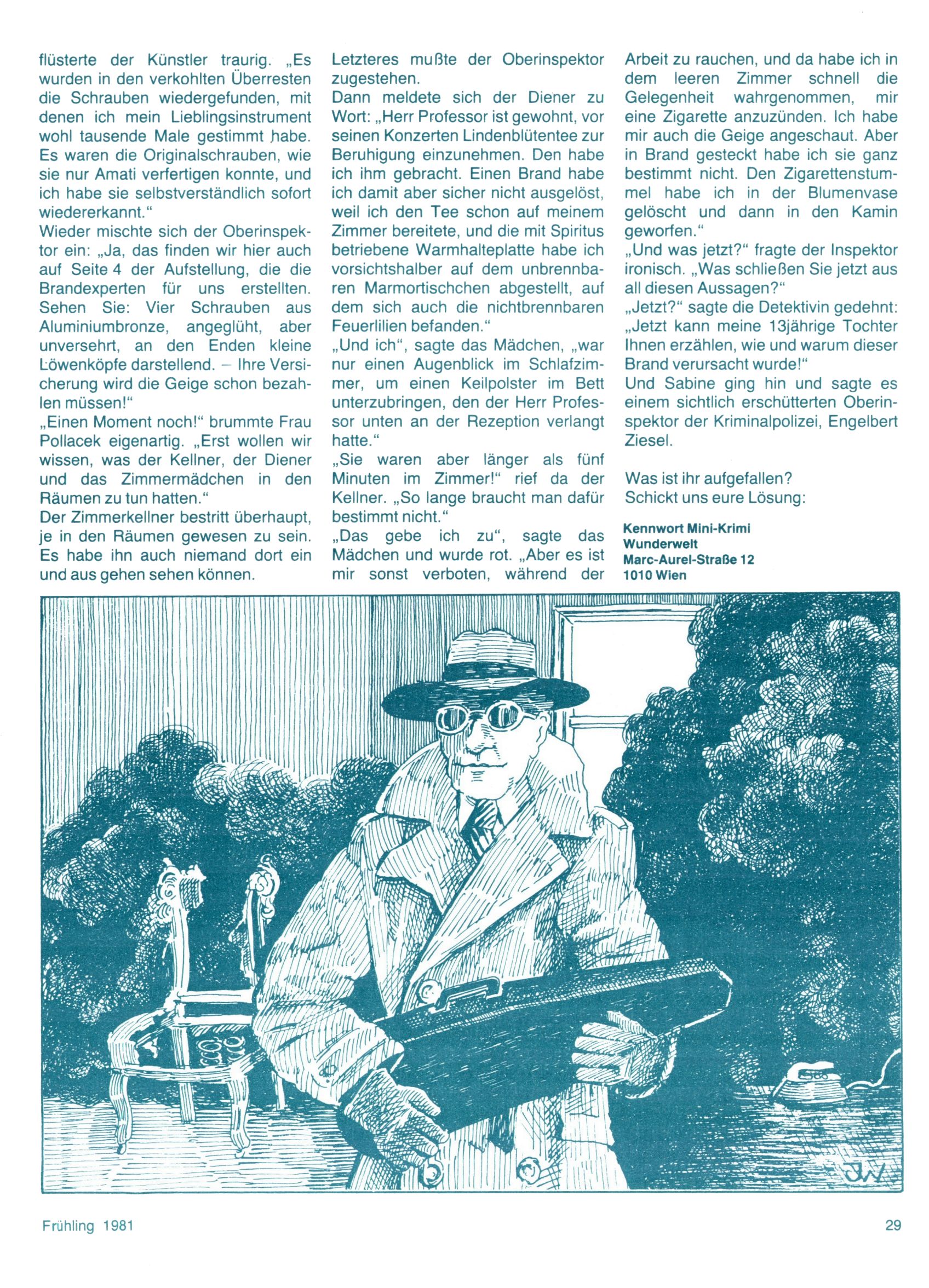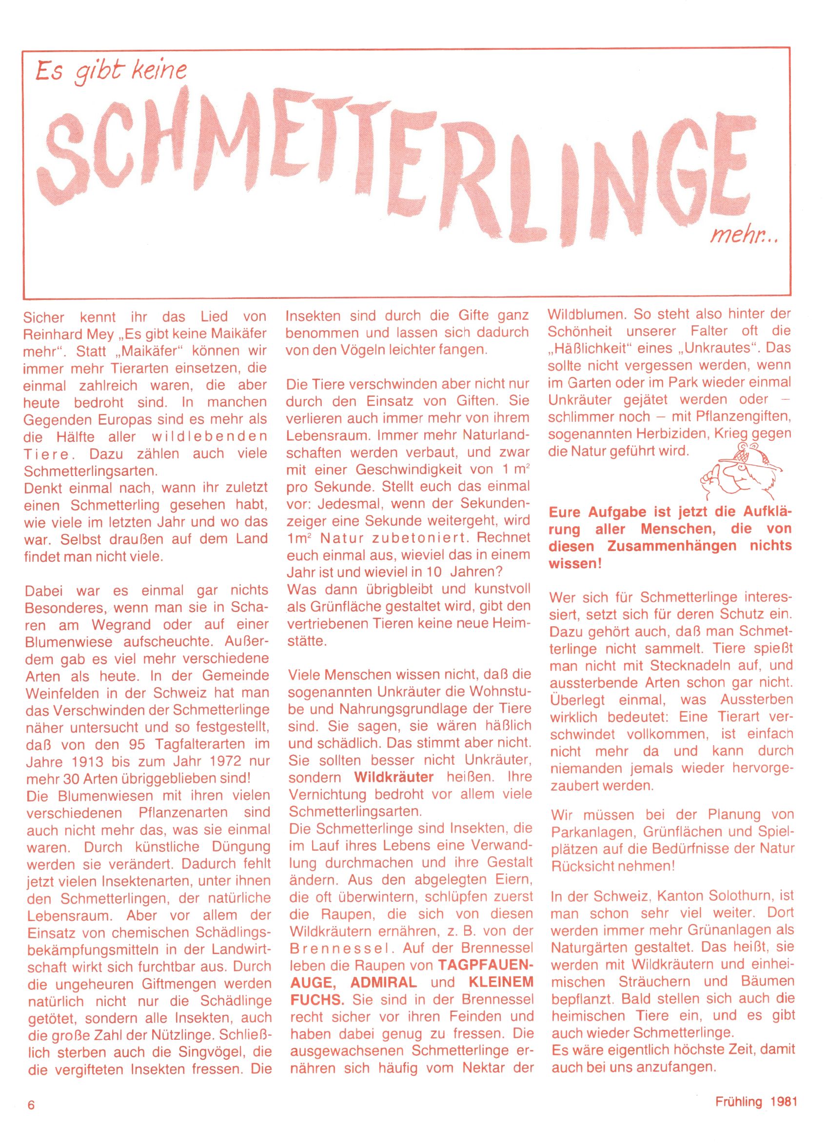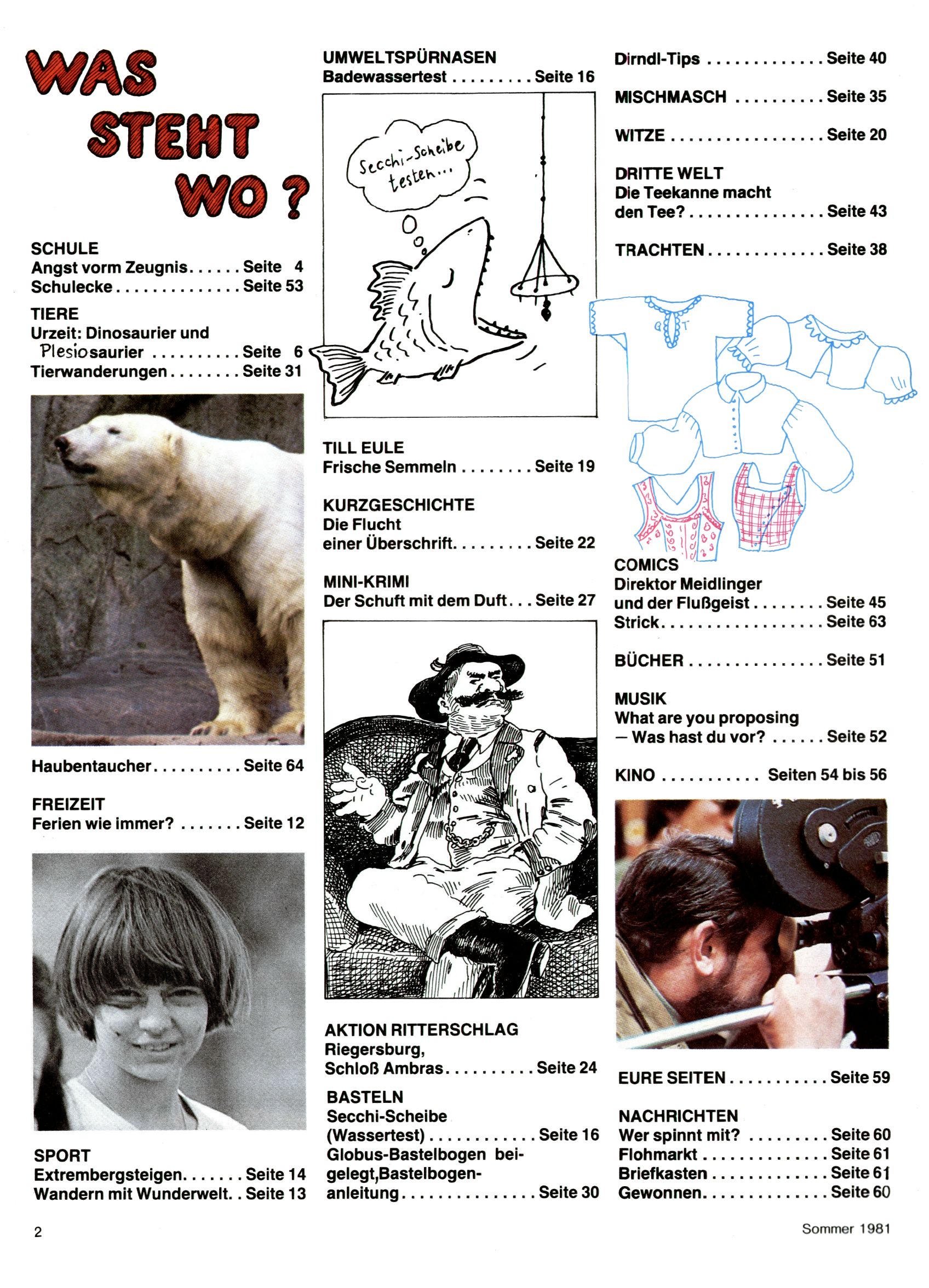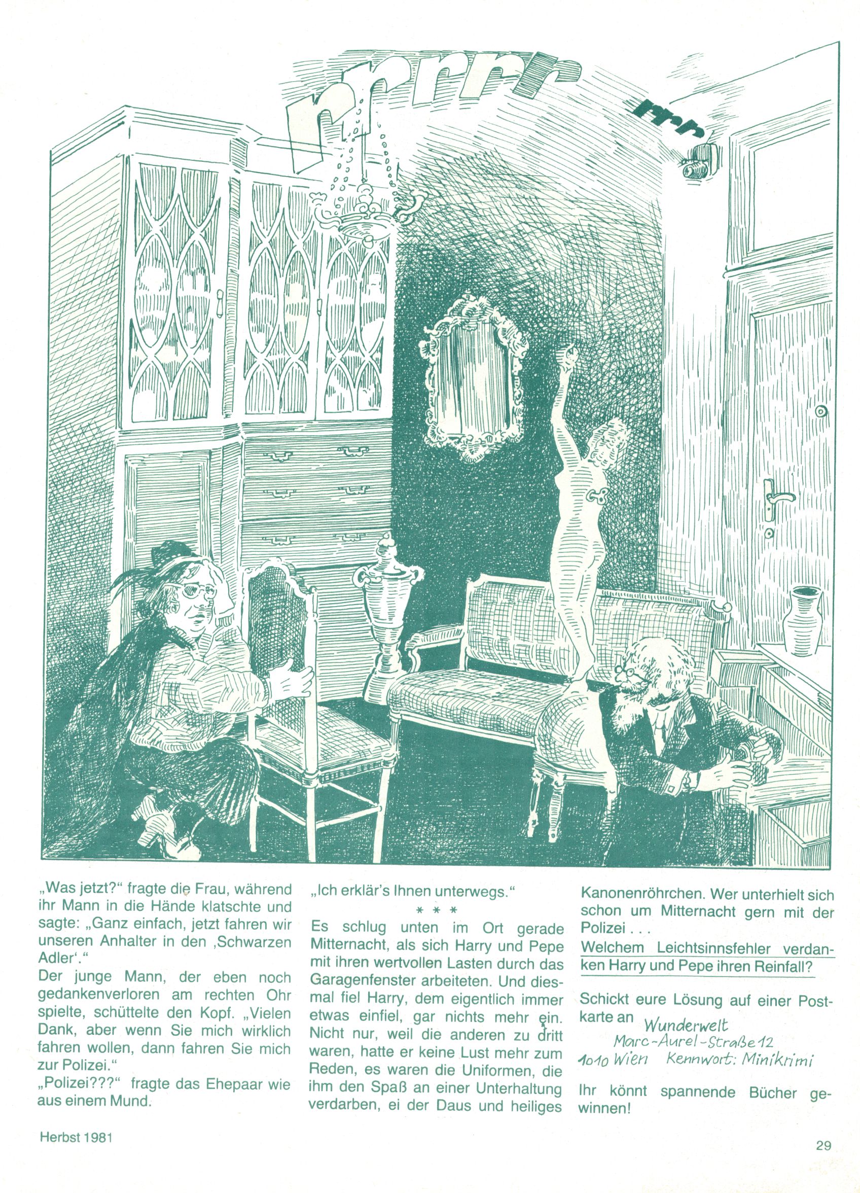 1981 - Ökosoziale Bildung ohne politische Beeinflussung Ein besonderes Kunststück, das dem Redaktionsteam der WunderWelt gelang, war es, über zehn Jahre hinweg ökologische, politische und soziale Themen anzufassen, ohne sich in Tagesthemen einzumischen oder eine politische Richtung vorzugeben. Selbst die Konkurrenz wurde trotz schwerer Verfehlungen fair und objektiv behandelt. Diesmal wurde das Konkurrenzblatt Yps unter die Lupe genommen, das als Marktführer im deutschsprachigen Raum für seine Reichweite mehrere Millionen Schmetterlinge hatte töten lassen, um diese den Lesern zu präsentieren. Die Antwort der WunderWelt war es, in einem Bildbericht die Schönheit der Schmetterlinge aufzuzeigen und dann in einem neutral gefassten Artikel die Leser um ihre Meinung zu fragen. Vorbildlicher hätte eine Redaktion kaum arbeiten können. Der Lohn dieser Arbeit war der Staatspreis für journalistische Leistungen im Interesse für die Jugend für Ingrid Greisenegger durch die Republik Österreich. Das Team der WunderWelt hatte nunmehr seinen Stil gefunden und verfeinert; demzufolge gab es 1981 abgesehen von einem Dritte-Welt-Schwerpunkt keine erwähnenswerten Neuerungen mehr. |