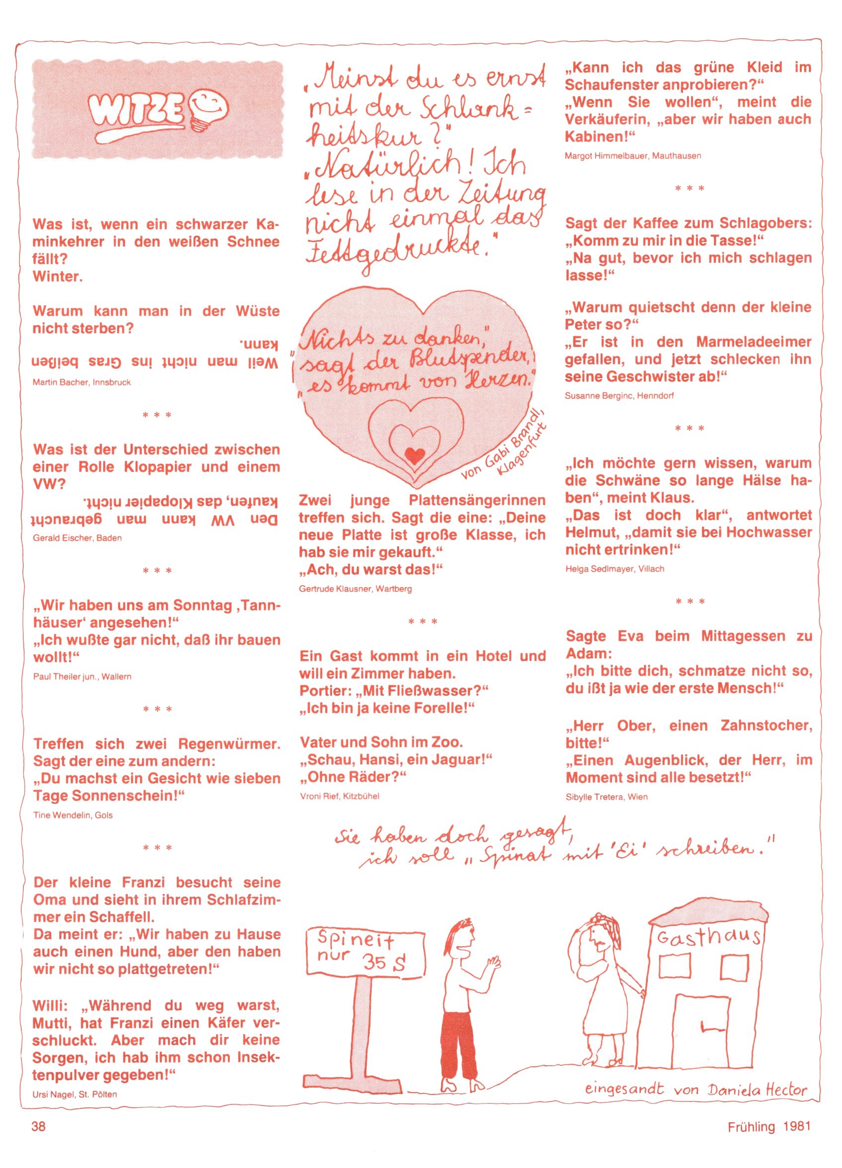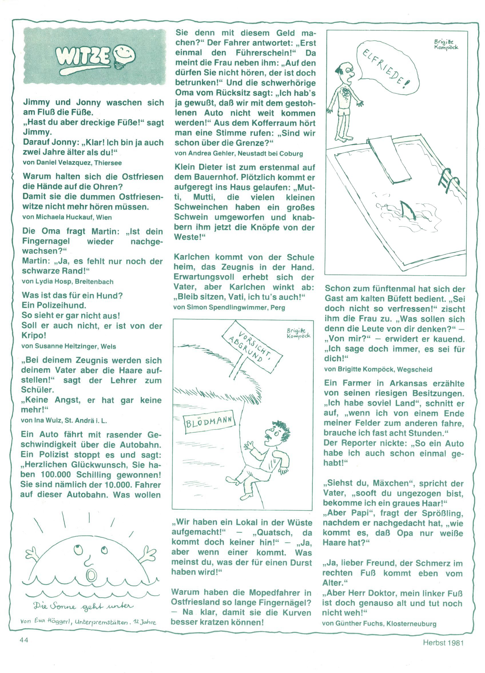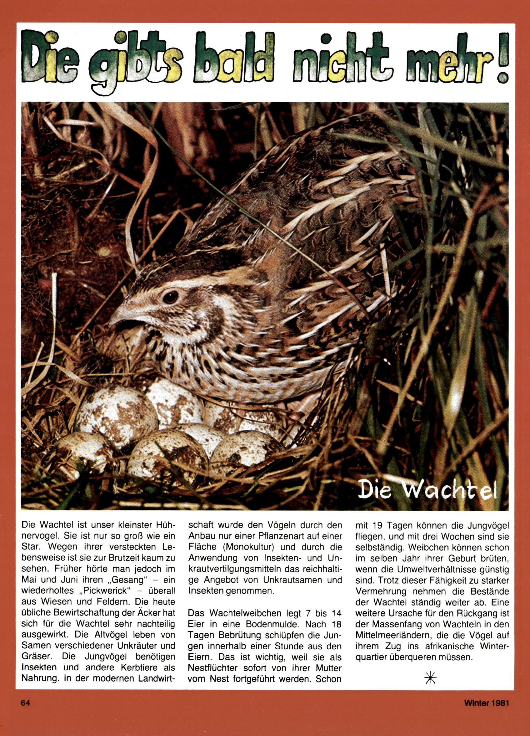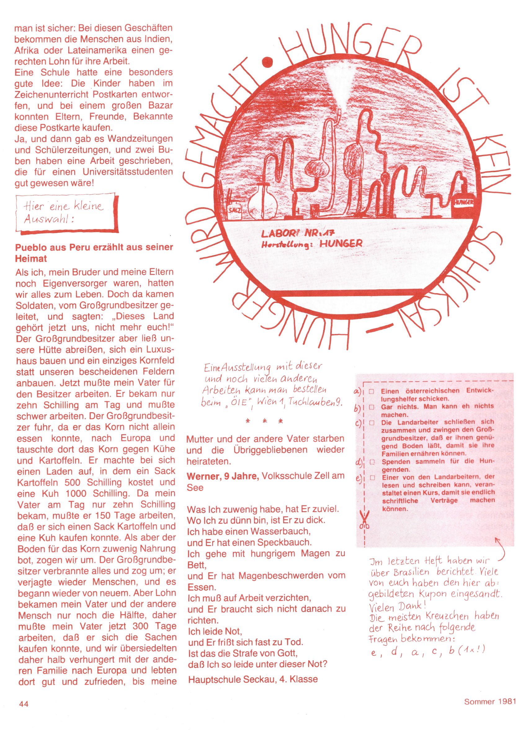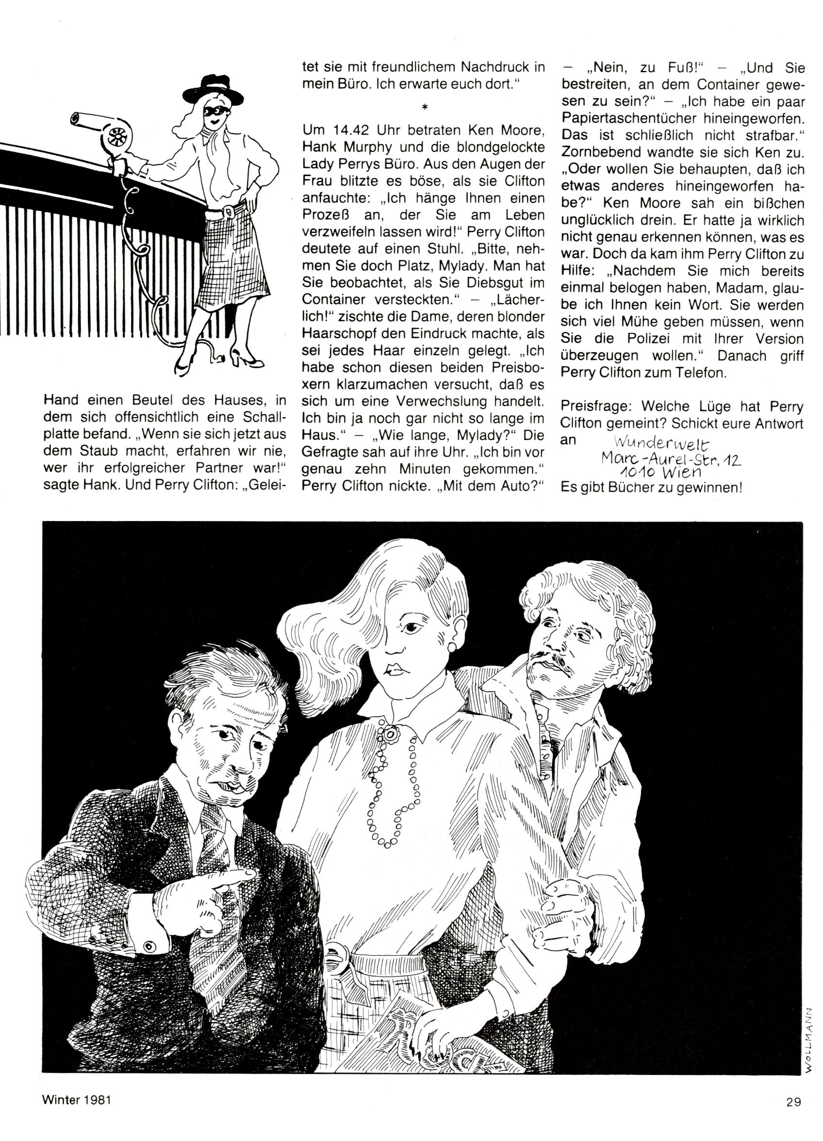 1981 - Ökosoziale Bildung ohne politische Beeinflussung Ein besonderes Kunststück, das dem Redaktionsteam der WunderWelt gelang, war es, über zehn Jahre hinweg ökologische, politische und soziale Themen anzufassen, ohne sich in Tagesthemen einzumischen oder eine politische Richtung vorzugeben. Selbst die Konkurrenz wurde trotz schwerer Verfehlungen fair und objektiv behandelt. Diesmal wurde das Konkurrenzblatt Yps unter die Lupe genommen, das als Marktführer im deutschsprachigen Raum für seine Reichweite mehrere Millionen Schmetterlinge hatte töten lassen, um diese den Lesern zu präsentieren. Die Antwort der WunderWelt war es, in einem Bildbericht die Schönheit der Schmetterlinge aufzuzeigen und dann in einem neutral gefassten Artikel die Leser um ihre Meinung zu fragen. Vorbildlicher hätte eine Redaktion kaum arbeiten können. Der Lohn dieser Arbeit war der Staatspreis für journalistische Leistungen im Interesse für die Jugend für Ingrid Greisenegger durch die Republik Österreich. Das Team der WunderWelt hatte nunmehr seinen Stil gefunden und verfeinert; demzufolge gab es 1981 abgesehen von einem Dritte-Welt-Schwerpunkt keine erwähnenswerten Neuerungen mehr. |
