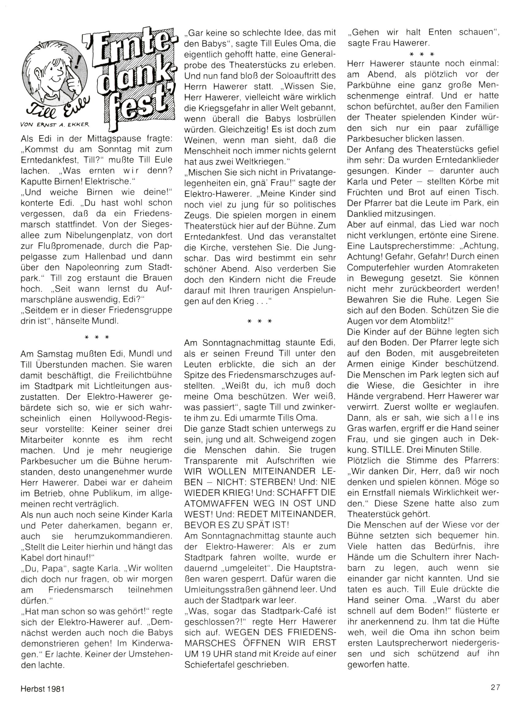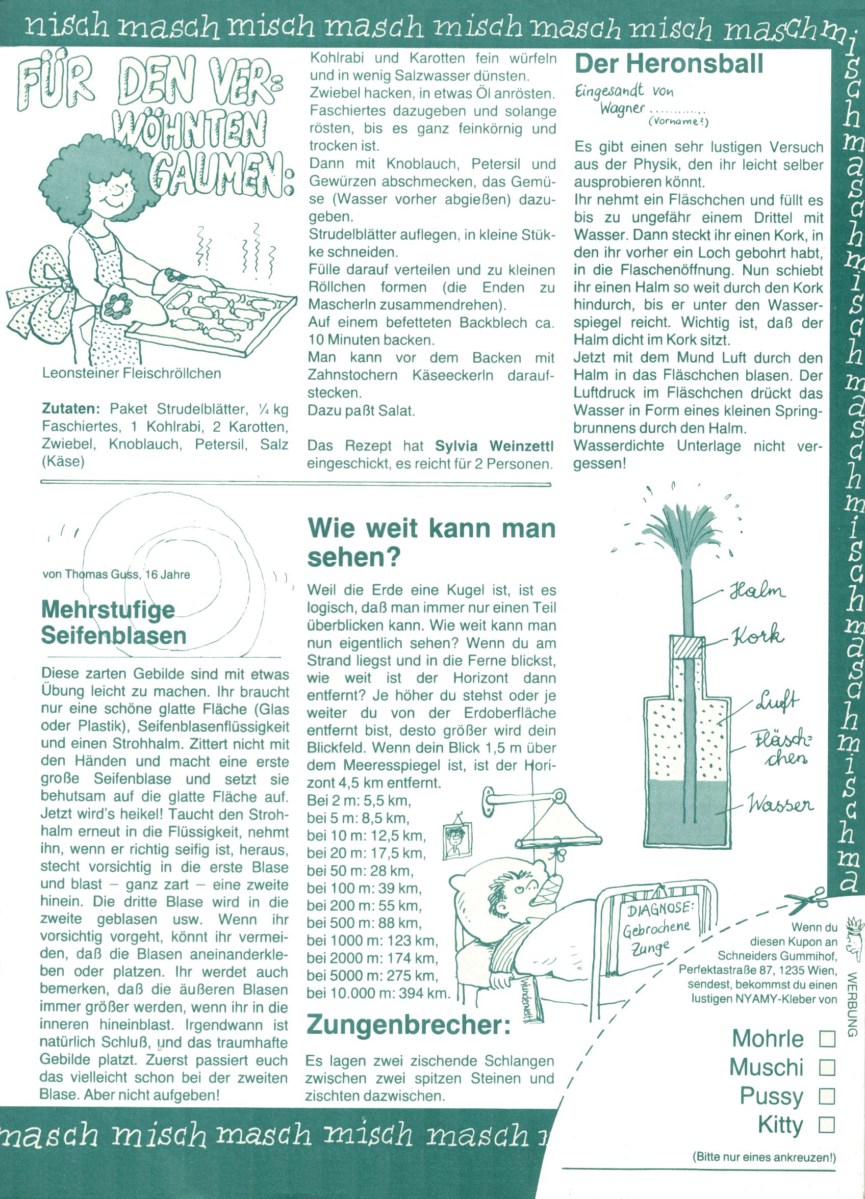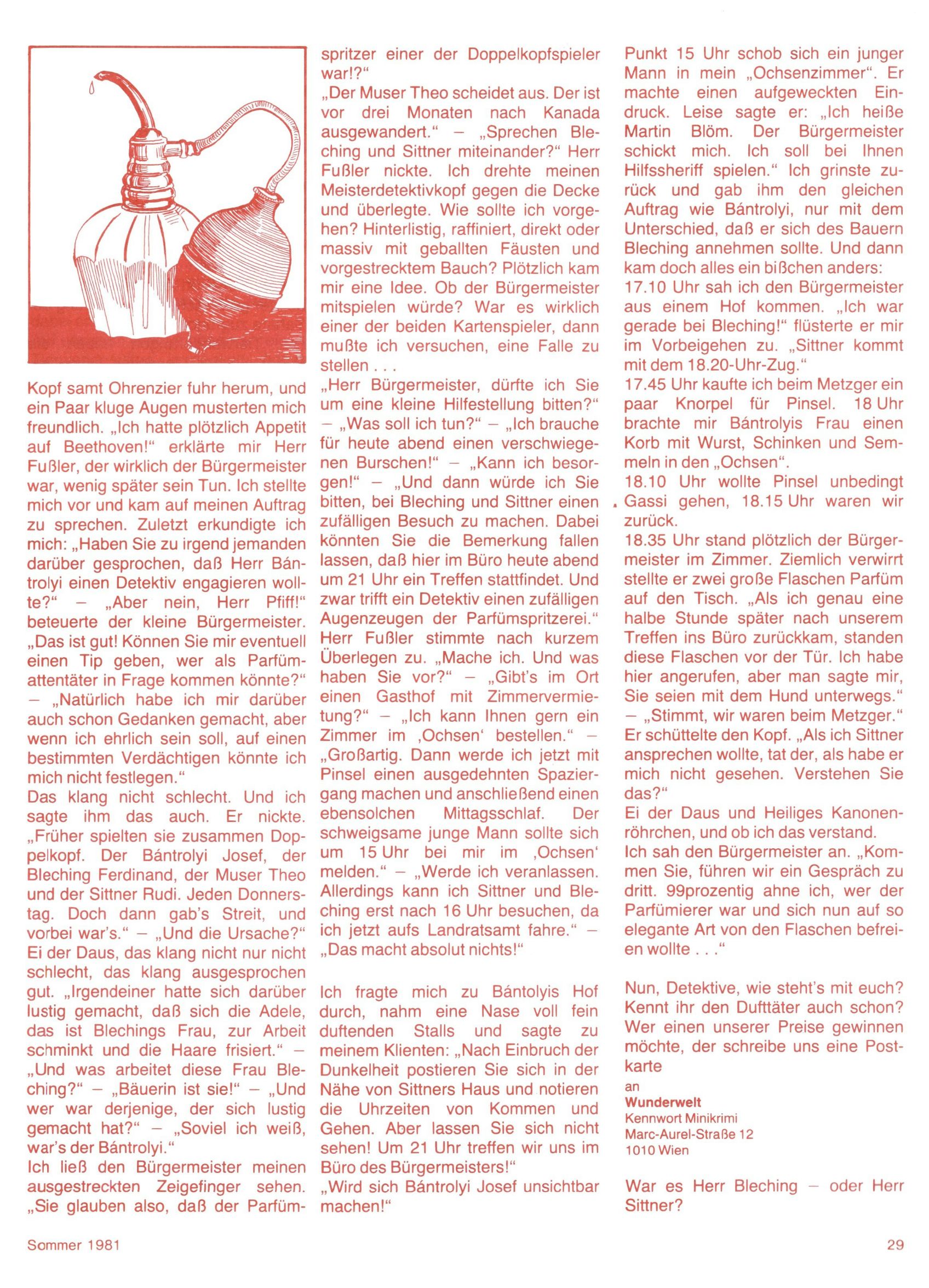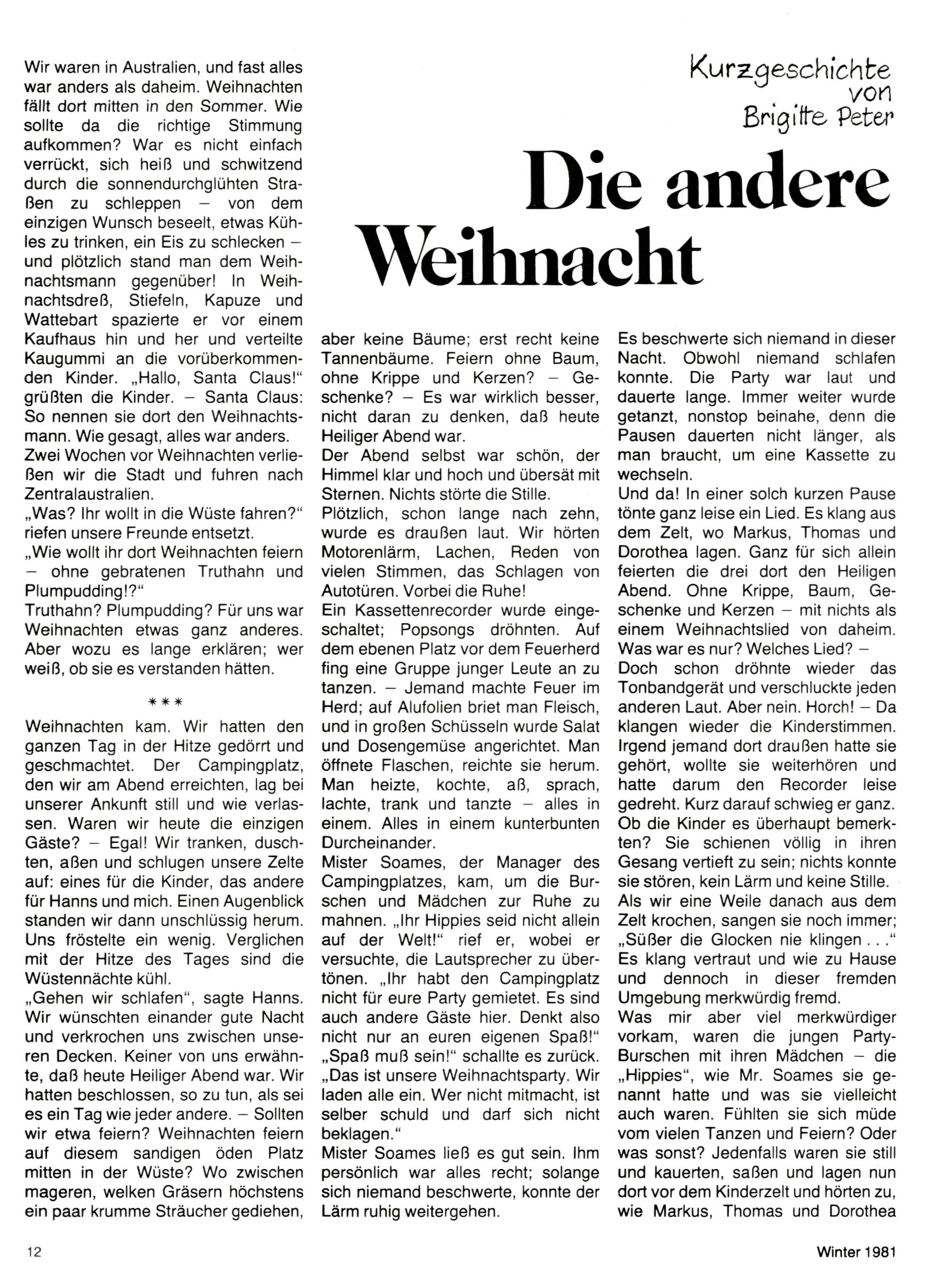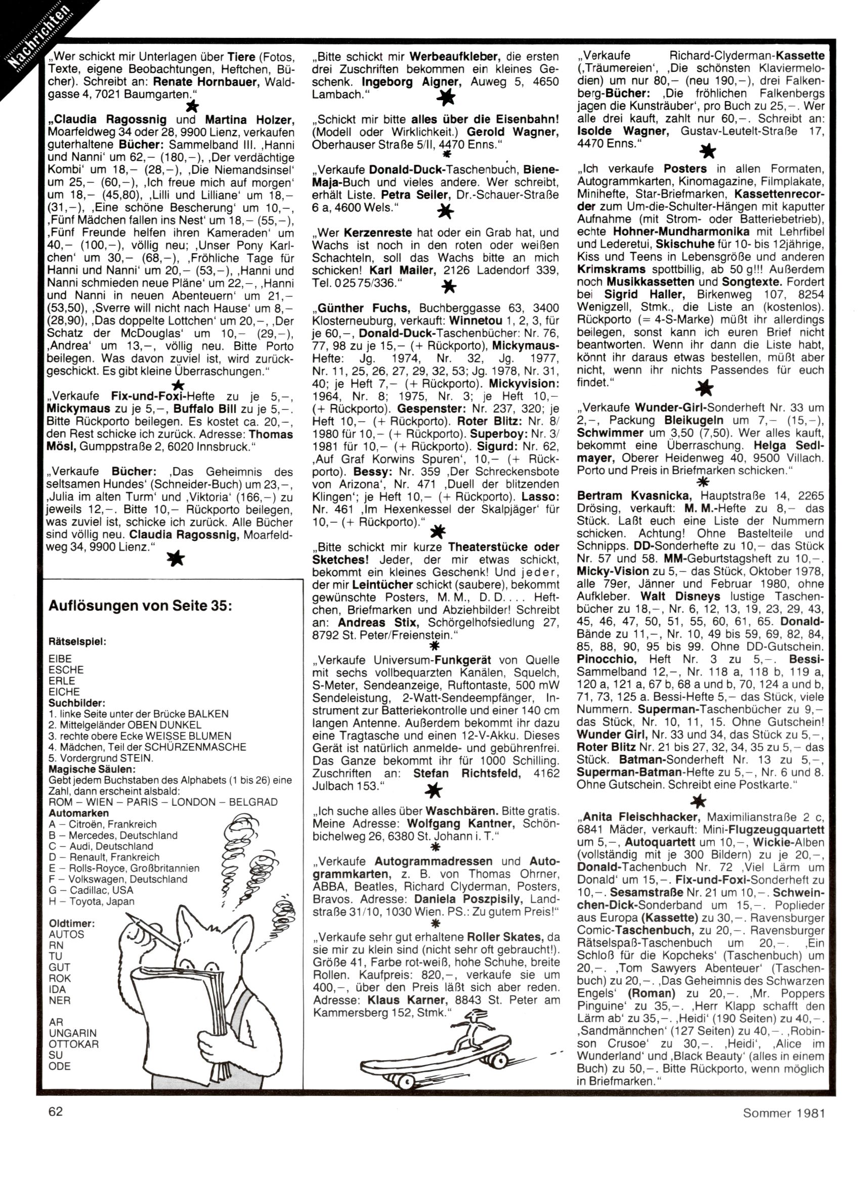 1981 - Ökosoziale Bildung ohne politische Beeinflussung Ein besonderes Kunststück, das dem Redaktionsteam der WunderWelt gelang, war es, über zehn Jahre hinweg ökologische, politische und soziale Themen anzufassen, ohne sich in Tagesthemen einzumischen oder eine politische Richtung vorzugeben. Selbst die Konkurrenz wurde trotz schwerer Verfehlungen fair und objektiv behandelt. Diesmal wurde das Konkurrenzblatt Yps unter die Lupe genommen, das als Marktführer im deutschsprachigen Raum für seine Reichweite mehrere Millionen Schmetterlinge hatte töten lassen, um diese den Lesern zu präsentieren. Die Antwort der WunderWelt war es, in einem Bildbericht die Schönheit der Schmetterlinge aufzuzeigen und dann in einem neutral gefassten Artikel die Leser um ihre Meinung zu fragen. Vorbildlicher hätte eine Redaktion kaum arbeiten können. Der Lohn dieser Arbeit war der Staatspreis für journalistische Leistungen im Interesse für die Jugend für Ingrid Greisenegger durch die Republik Österreich. Das Team der WunderWelt hatte nunmehr seinen Stil gefunden und verfeinert; demzufolge gab es 1981 abgesehen von einem Dritte-Welt-Schwerpunkt keine erwähnenswerten Neuerungen mehr. |