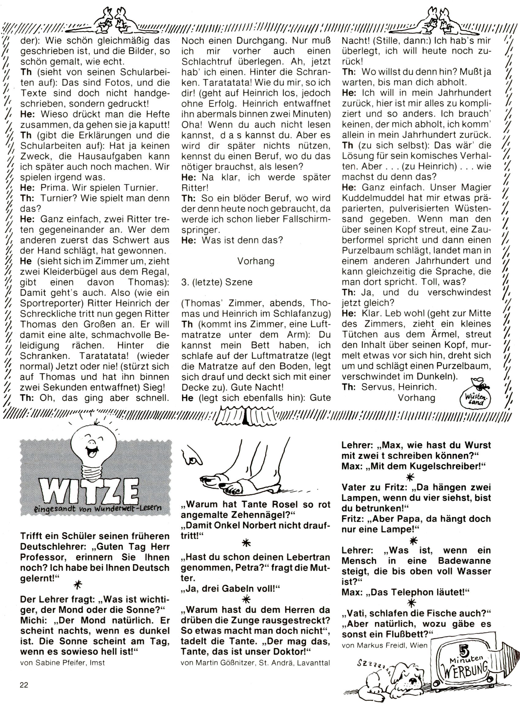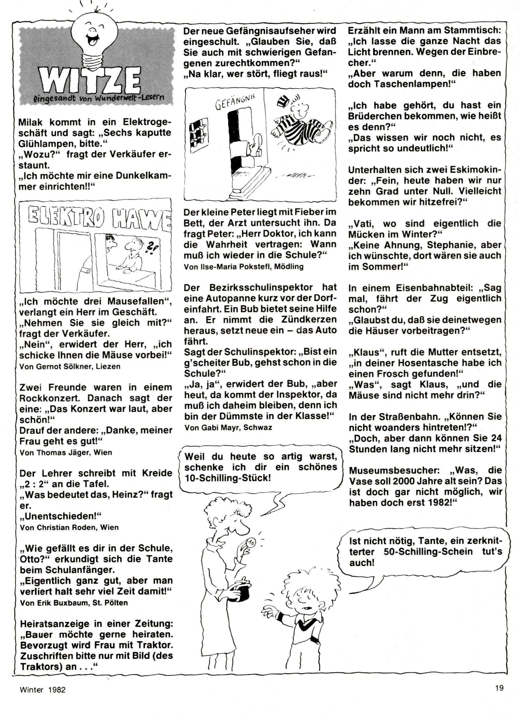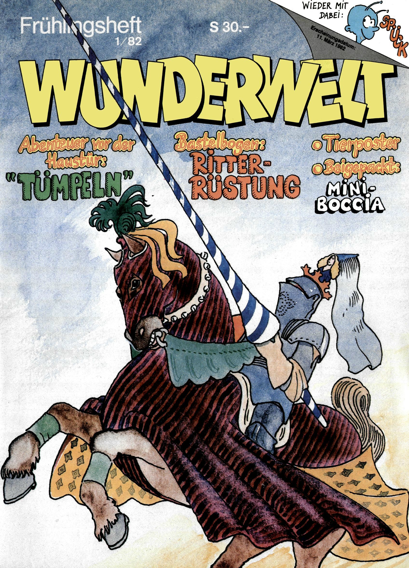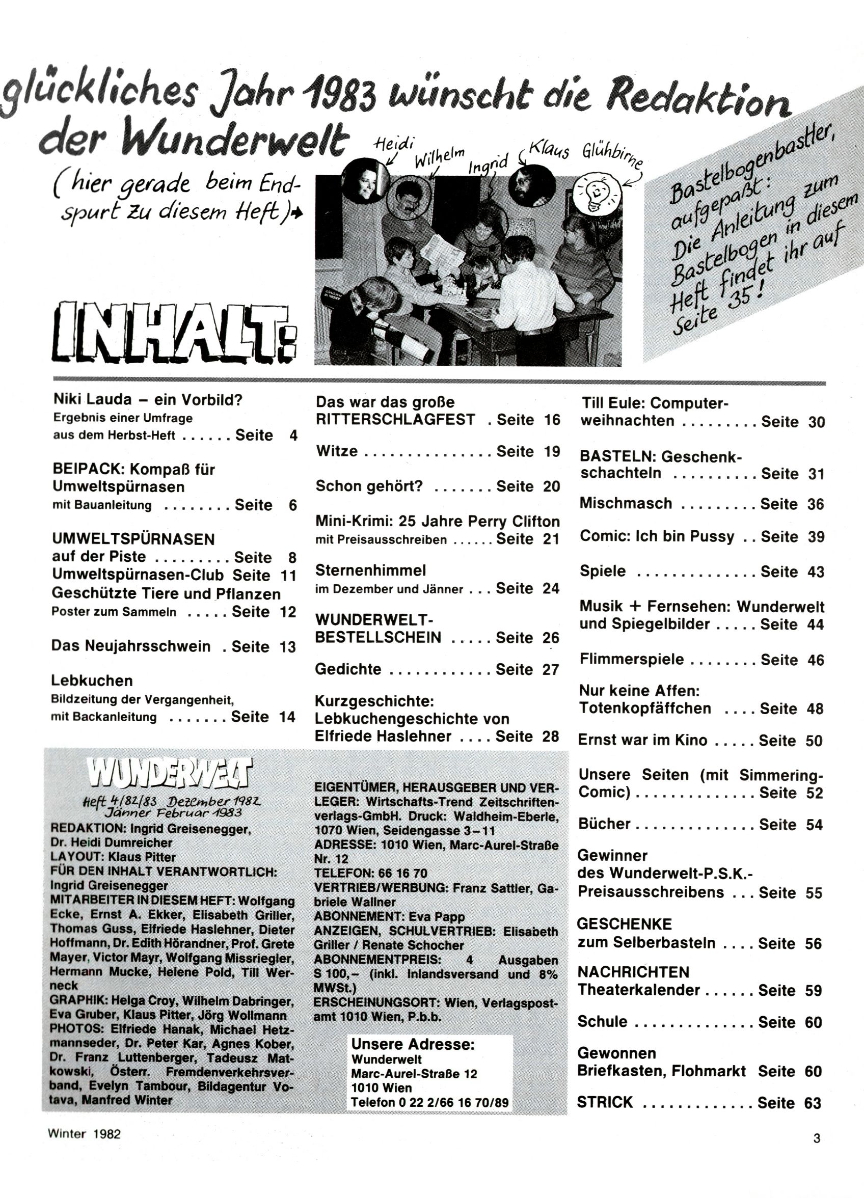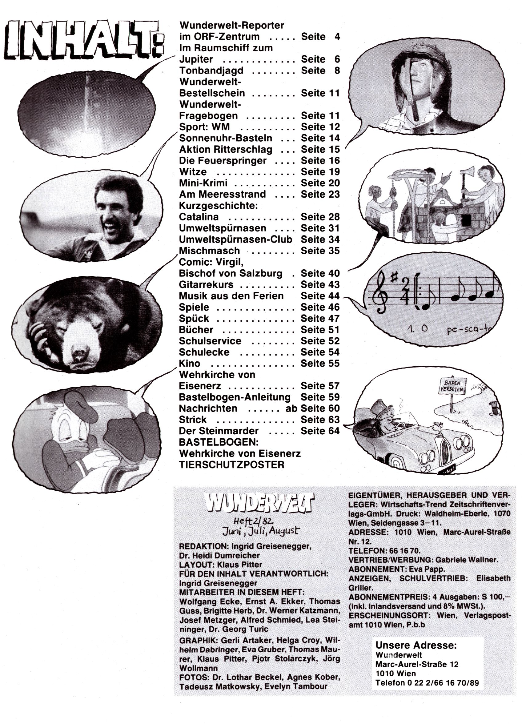 1982 - Hin und her In der angestrebten Marktnische hatte sich die WunderWelt 1982 perfekt eingenistet. Ohne auf Qualität zu verzichten, wäre eine Erhöhung der Reichweite in der multimedialen Umwelt nicht mehr möglich gewesen. Änderungen wurden daher nur in Datailbereichen durchgeführt. Neu war, dass erstmals ein Wunderwelt-Leser eine eigene Cartoonfolge starten durfte. Der fünfzehnjährige Thomas Maurer zeichnete mit Spück, dem Außerirdischen eine abgehobene Serie, die zwar in Teilbereichen witzig war, über deren Qualität und Professionalität man aber – freundlich ausgedrückt – geteilter Meinung sein konnte. Was freilich niemand ahnen konnte, war, dass genau dieser Thomas Maurer 26 Jahre später mit der Romy die höchste österreichische Filmauszeichnung für das beste Drehbuch erhalten würde. So gab es eine ganze Reihe von Jugendlichen, die in der WunderWelt erstmals aufgefallen waren und später bemerkenswerte Karrieren hinlegten. Nach dem Experiment Spück kehrte man aber wieder zu Altbewährtem zurück. Fortan wurden Cartoons nur mehr eingekauft. Lediglich Klaus Pitters Comicserie Strick brachte es als Eigenproduktion auf 46 Folgen und hielt bis zum Schluss durch. Andere neue Autoren 1982 waren Peter Abraham, Lea Steininger und Birgit Riejke. Wieder einmal entdeckte man das Thema Burgen. Mit der Aktion Ritterschlag wurden mehrere österreichische Burgen und das Leben im Mittelalter vorgestellt. |