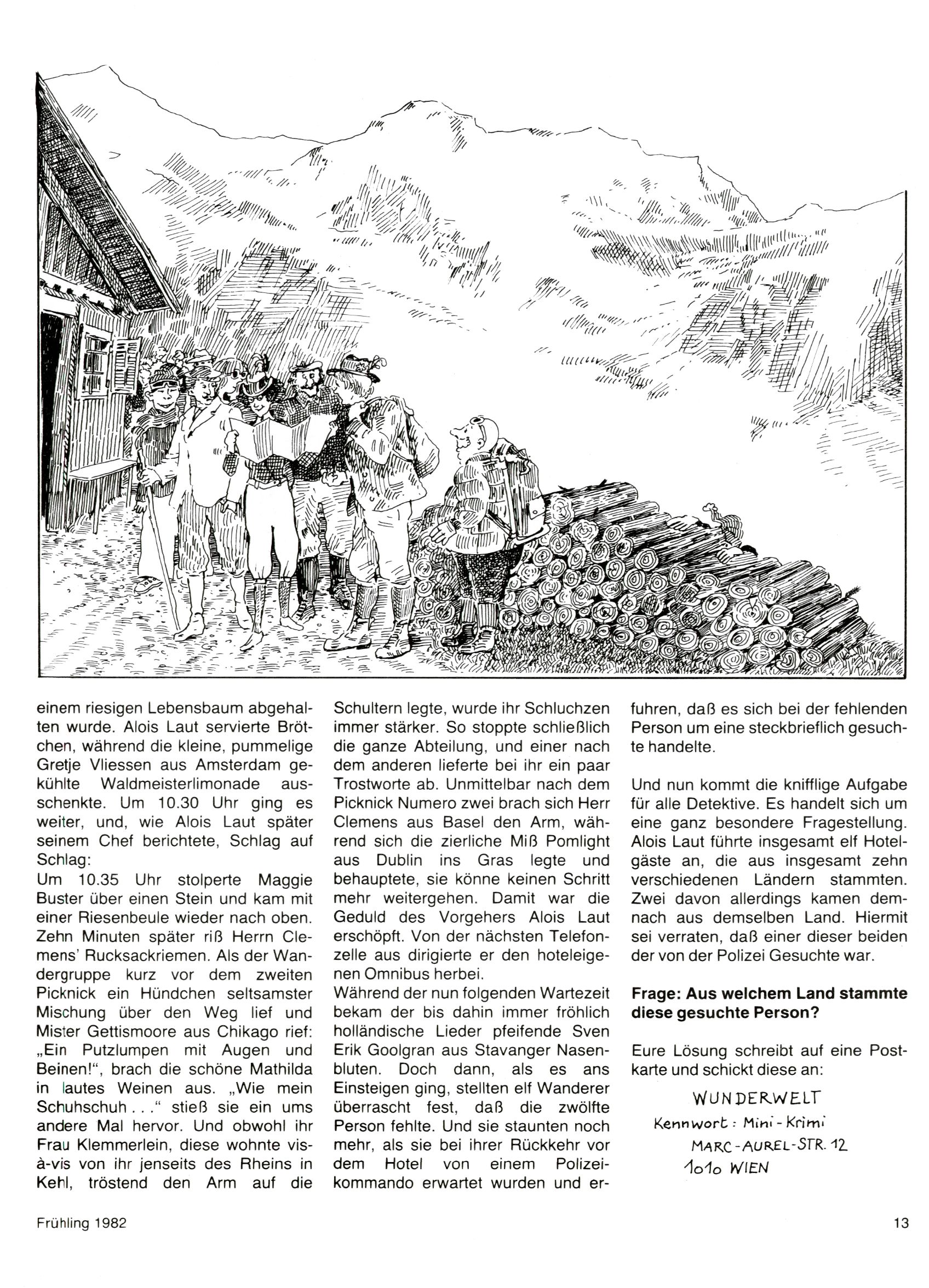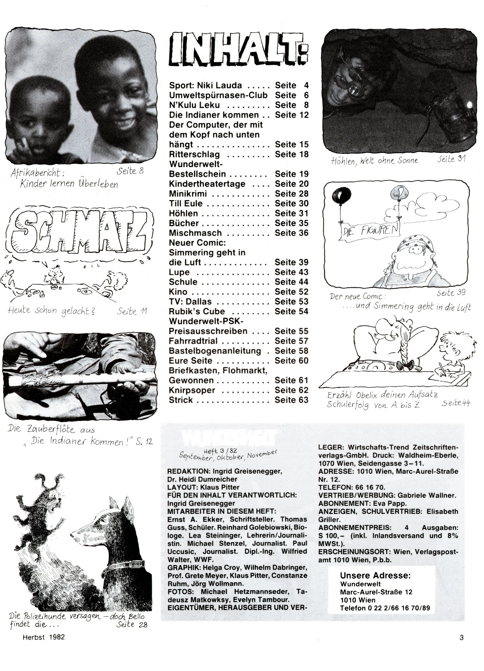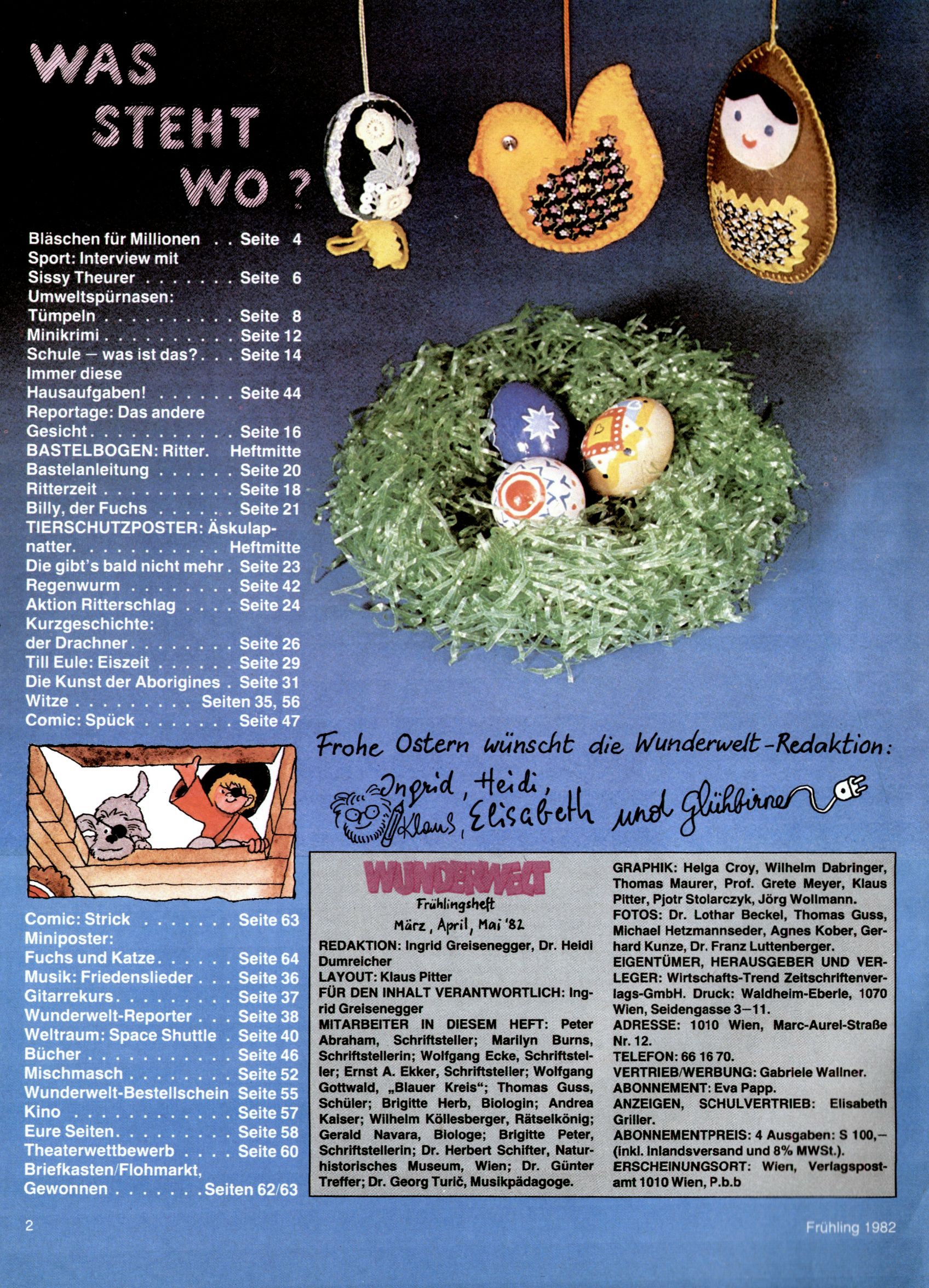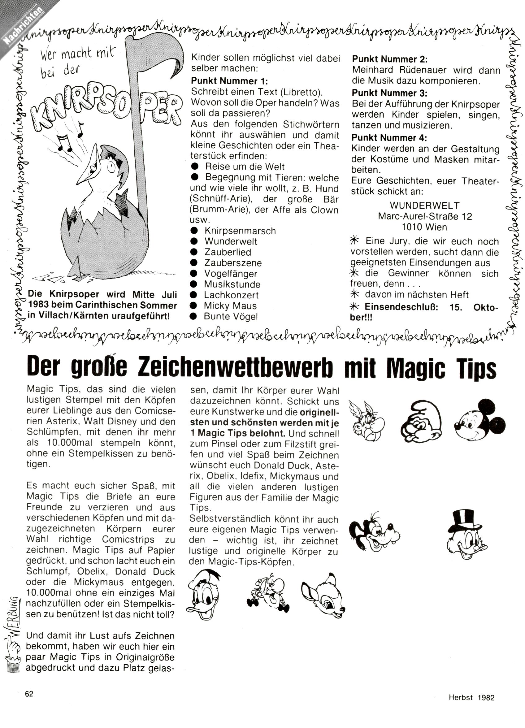 1982 - Hin und her In der angestrebten Marktnische hatte sich die WunderWelt 1982 perfekt eingenistet. Ohne auf Qualität zu verzichten, wäre eine Erhöhung der Reichweite in der multimedialen Umwelt nicht mehr möglich gewesen. Änderungen wurden daher nur in Datailbereichen durchgeführt. Neu war, dass erstmals ein Wunderwelt-Leser eine eigene Cartoonfolge starten durfte. Der fünfzehnjährige Thomas Maurer zeichnete mit Spück, dem Außerirdischen eine abgehobene Serie, die zwar in Teilbereichen witzig war, über deren Qualität und Professionalität man aber – freundlich ausgedrückt – geteilter Meinung sein konnte. Was freilich niemand ahnen konnte, war, dass genau dieser Thomas Maurer 26 Jahre später mit der Romy die höchste österreichische Filmauszeichnung für das beste Drehbuch erhalten würde. So gab es eine ganze Reihe von Jugendlichen, die in der WunderWelt erstmals aufgefallen waren und später bemerkenswerte Karrieren hinlegten. Nach dem Experiment Spück kehrte man aber wieder zu Altbewährtem zurück. Fortan wurden Cartoons nur mehr eingekauft. Lediglich Klaus Pitters Comicserie Strick brachte es als Eigenproduktion auf 46 Folgen und hielt bis zum Schluss durch. Andere neue Autoren 1982 waren Peter Abraham, Lea Steininger und Birgit Riejke. Wieder einmal entdeckte man das Thema Burgen. Mit der Aktion Ritterschlag wurden mehrere österreichische Burgen und das Leben im Mittelalter vorgestellt. |