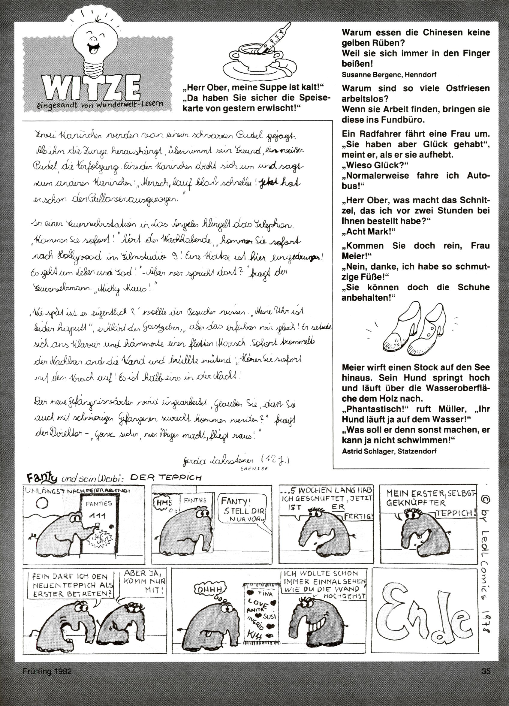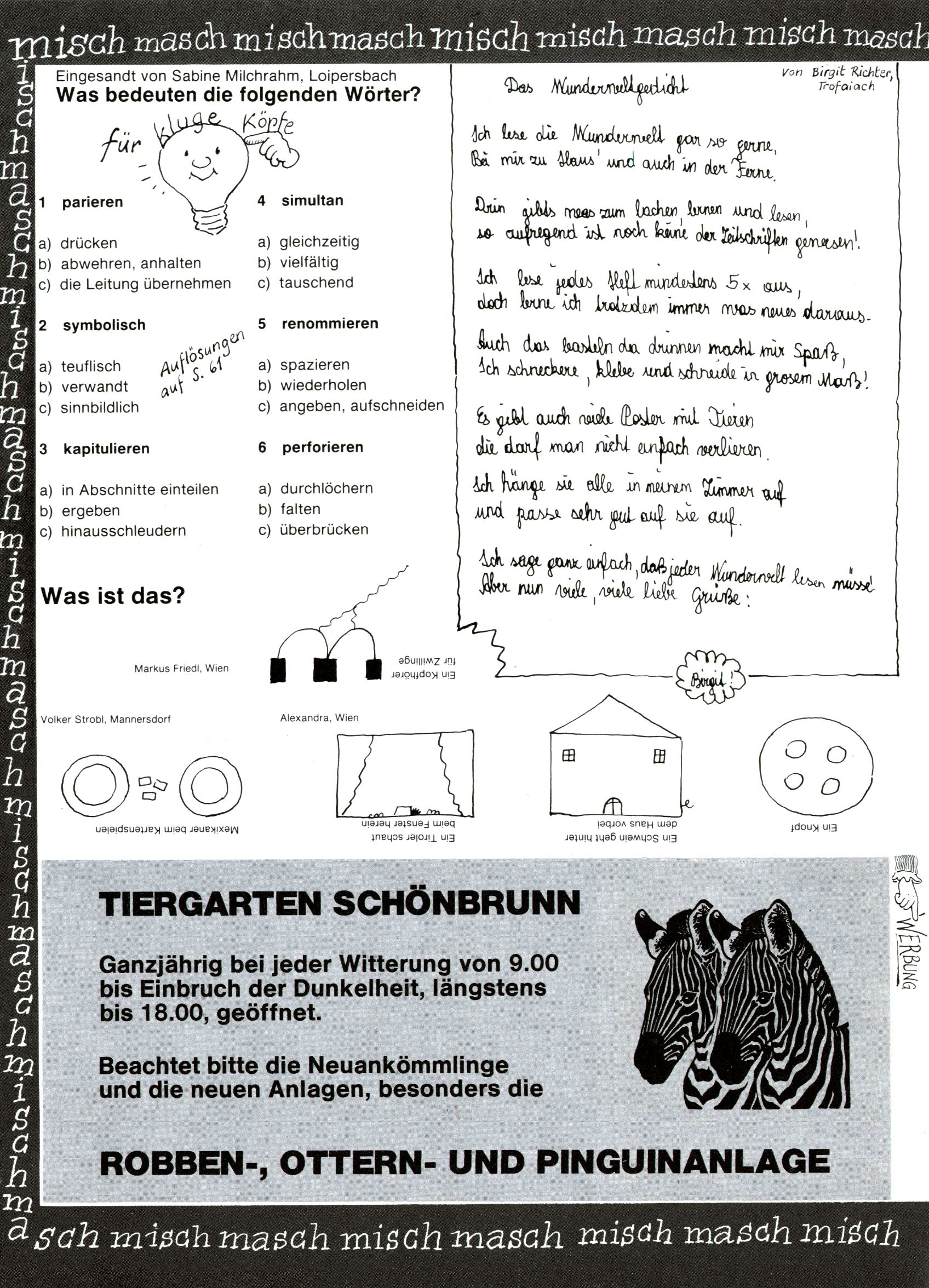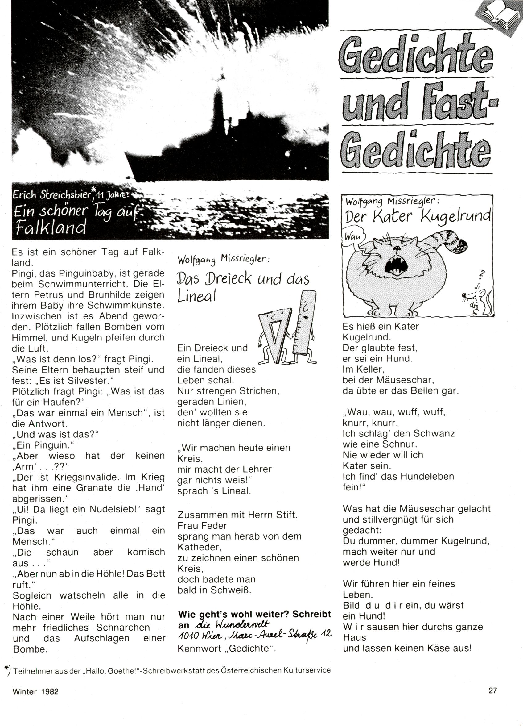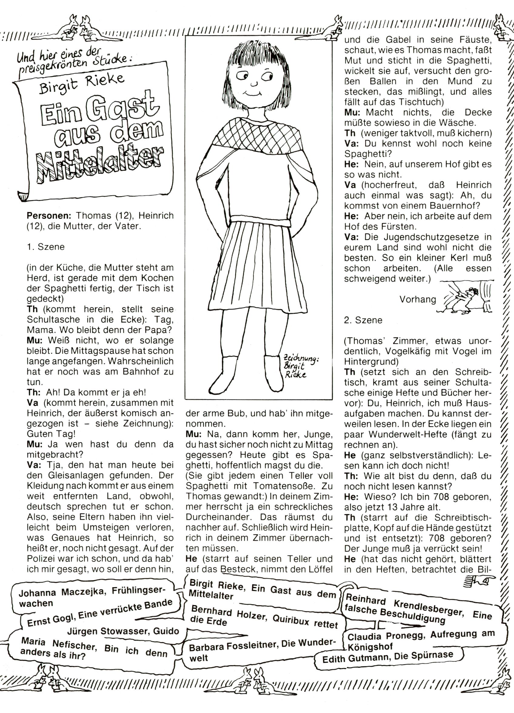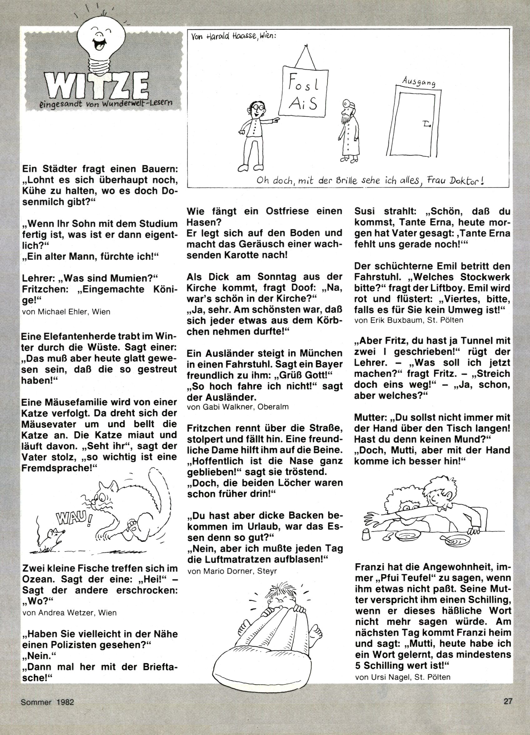 1982 - Hin und her In der angestrebten Marktnische hatte sich die WunderWelt 1982 perfekt eingenistet. Ohne auf Qualität zu verzichten, wäre eine Erhöhung der Reichweite in der multimedialen Umwelt nicht mehr möglich gewesen. Änderungen wurden daher nur in Datailbereichen durchgeführt. Neu war, dass erstmals ein Wunderwelt-Leser eine eigene Cartoonfolge starten durfte. Der fünfzehnjährige Thomas Maurer zeichnete mit Spück, dem Außerirdischen eine abgehobene Serie, die zwar in Teilbereichen witzig war, über deren Qualität und Professionalität man aber – freundlich ausgedrückt – geteilter Meinung sein konnte. Was freilich niemand ahnen konnte, war, dass genau dieser Thomas Maurer 26 Jahre später mit der Romy die höchste österreichische Filmauszeichnung für das beste Drehbuch erhalten würde. So gab es eine ganze Reihe von Jugendlichen, die in der WunderWelt erstmals aufgefallen waren und später bemerkenswerte Karrieren hinlegten. Nach dem Experiment Spück kehrte man aber wieder zu Altbewährtem zurück. Fortan wurden Cartoons nur mehr eingekauft. Lediglich Klaus Pitters Comicserie Strick brachte es als Eigenproduktion auf 46 Folgen und hielt bis zum Schluss durch. Andere neue Autoren 1982 waren Peter Abraham, Lea Steininger und Birgit Riejke. Wieder einmal entdeckte man das Thema Burgen. Mit der Aktion Ritterschlag wurden mehrere österreichische Burgen und das Leben im Mittelalter vorgestellt. |