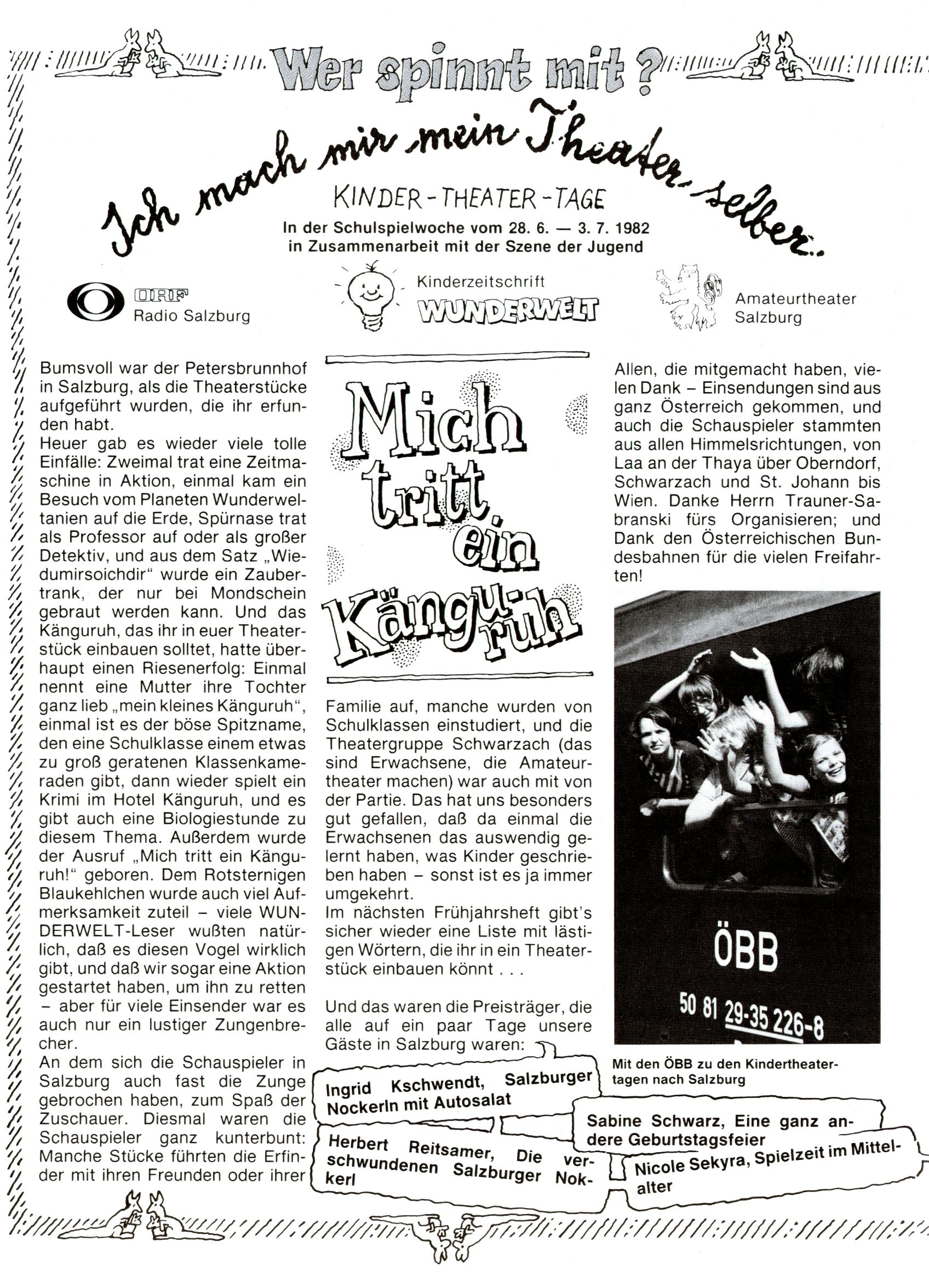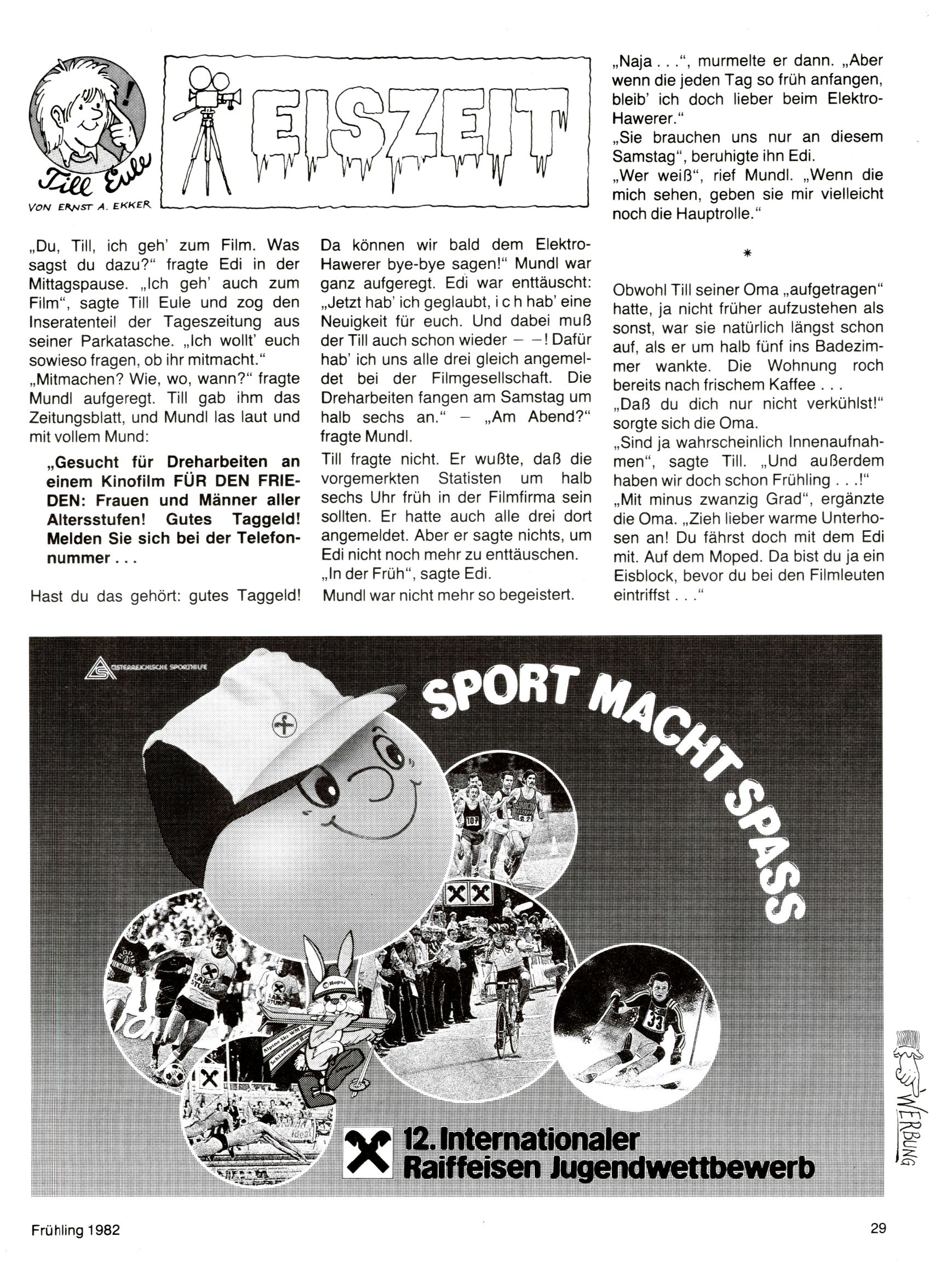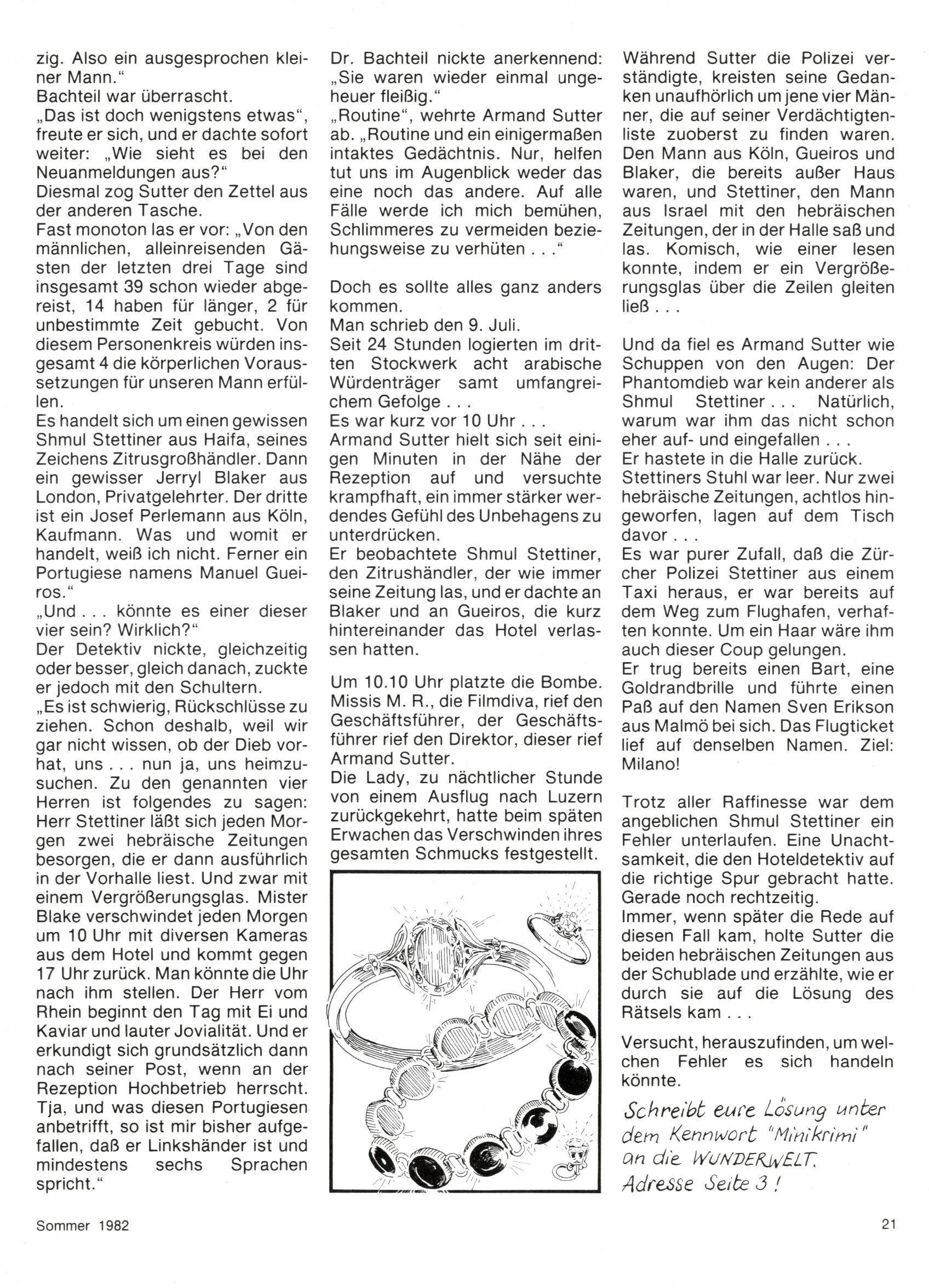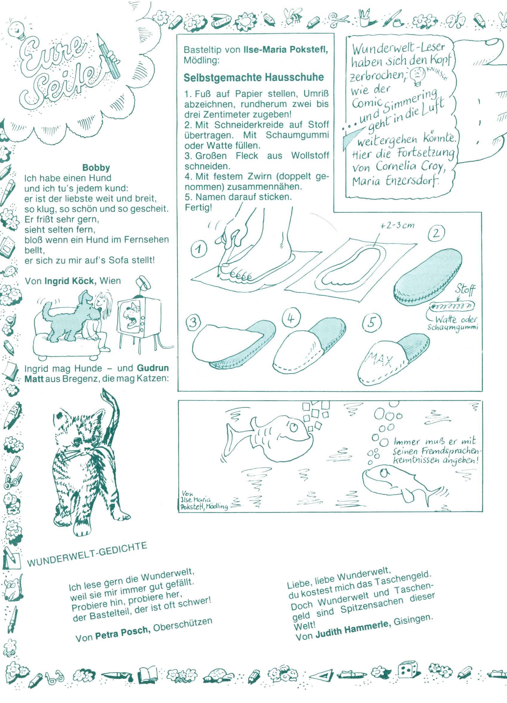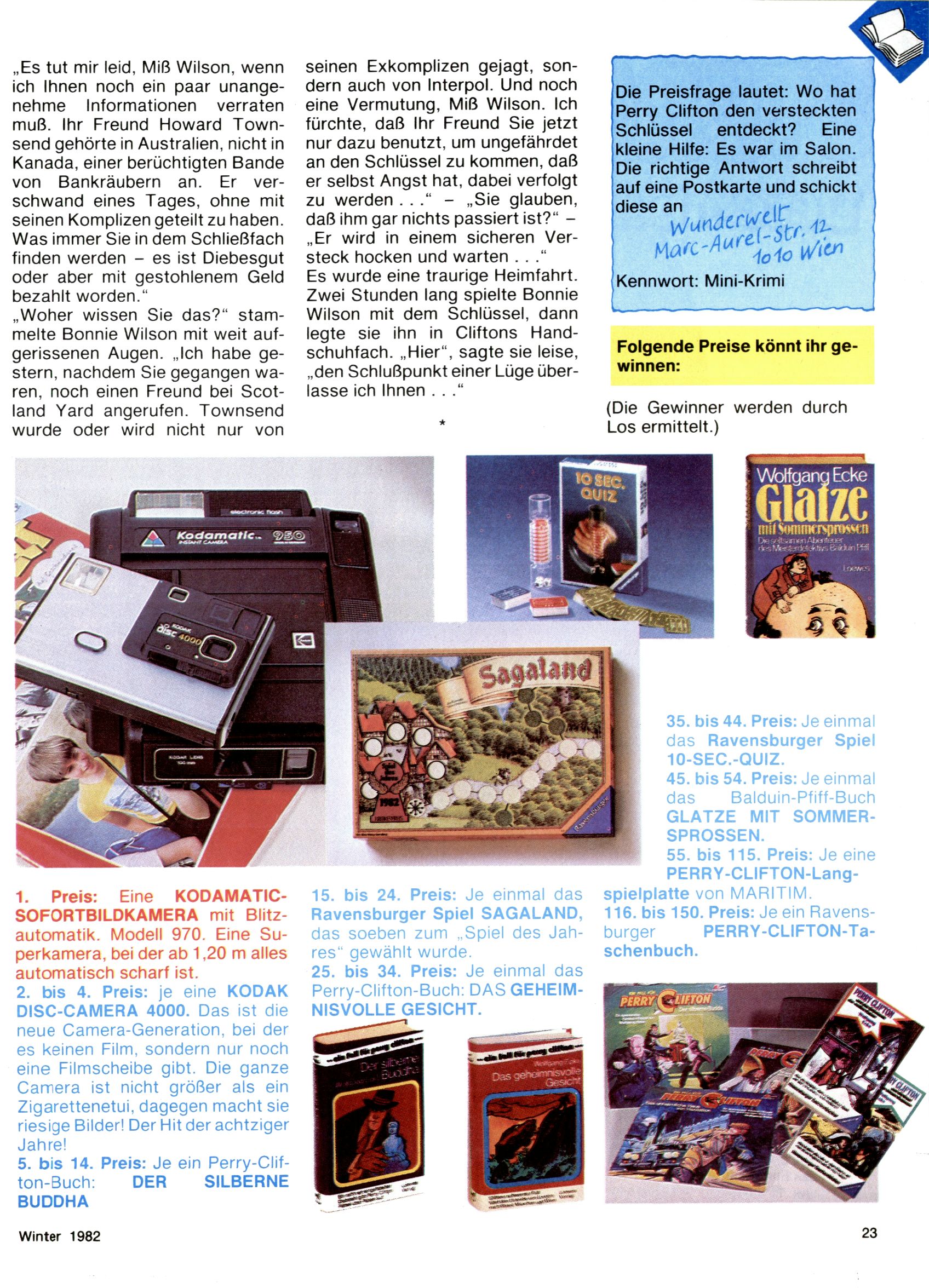 1982 - Hin und her In der angestrebten Marktnische hatte sich die WunderWelt 1982 perfekt eingenistet. Ohne auf Qualität zu verzichten, wäre eine Erhöhung der Reichweite in der multimedialen Umwelt nicht mehr möglich gewesen. Änderungen wurden daher nur in Datailbereichen durchgeführt. Neu war, dass erstmals ein Wunderwelt-Leser eine eigene Cartoonfolge starten durfte. Der fünfzehnjährige Thomas Maurer zeichnete mit Spück, dem Außerirdischen eine abgehobene Serie, die zwar in Teilbereichen witzig war, über deren Qualität und Professionalität man aber – freundlich ausgedrückt – geteilter Meinung sein konnte. Was freilich niemand ahnen konnte, war, dass genau dieser Thomas Maurer 26 Jahre später mit der Romy die höchste österreichische Filmauszeichnung für das beste Drehbuch erhalten würde. So gab es eine ganze Reihe von Jugendlichen, die in der WunderWelt erstmals aufgefallen waren und später bemerkenswerte Karrieren hinlegten. Nach dem Experiment Spück kehrte man aber wieder zu Altbewährtem zurück. Fortan wurden Cartoons nur mehr eingekauft. Lediglich Klaus Pitters Comicserie Strick brachte es als Eigenproduktion auf 46 Folgen und hielt bis zum Schluss durch. Andere neue Autoren 1982 waren Peter Abraham, Lea Steininger und Birgit Riejke. Wieder einmal entdeckte man das Thema Burgen. Mit der Aktion Ritterschlag wurden mehrere österreichische Burgen und das Leben im Mittelalter vorgestellt. |