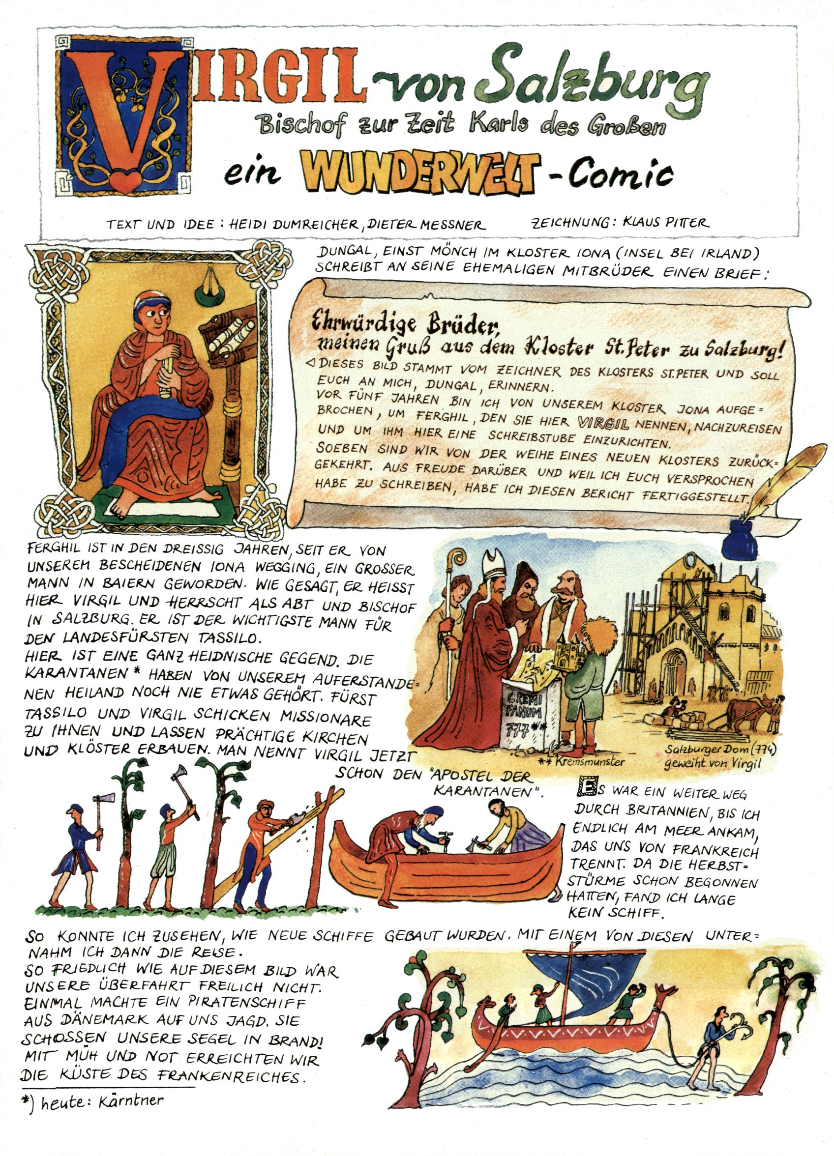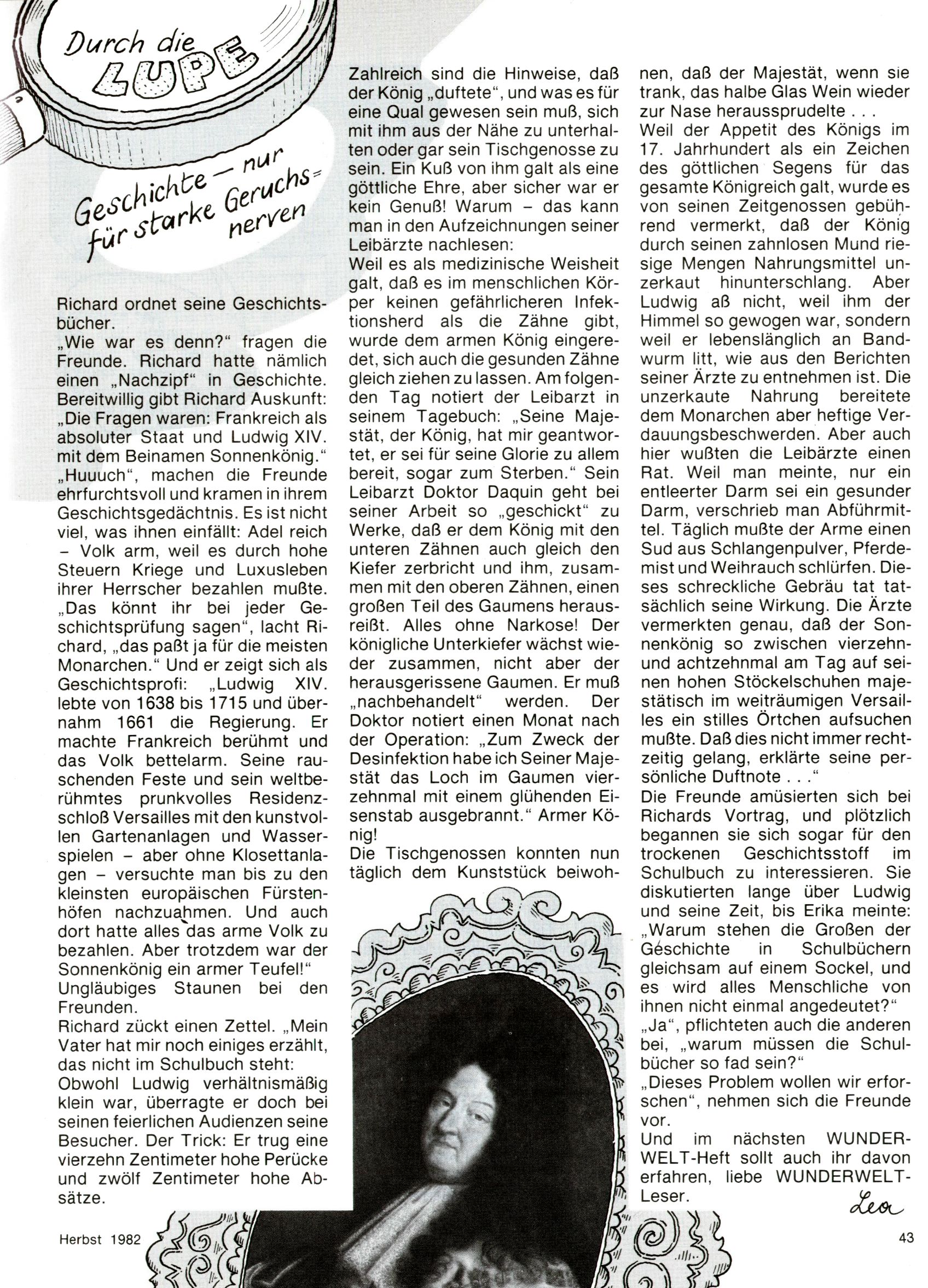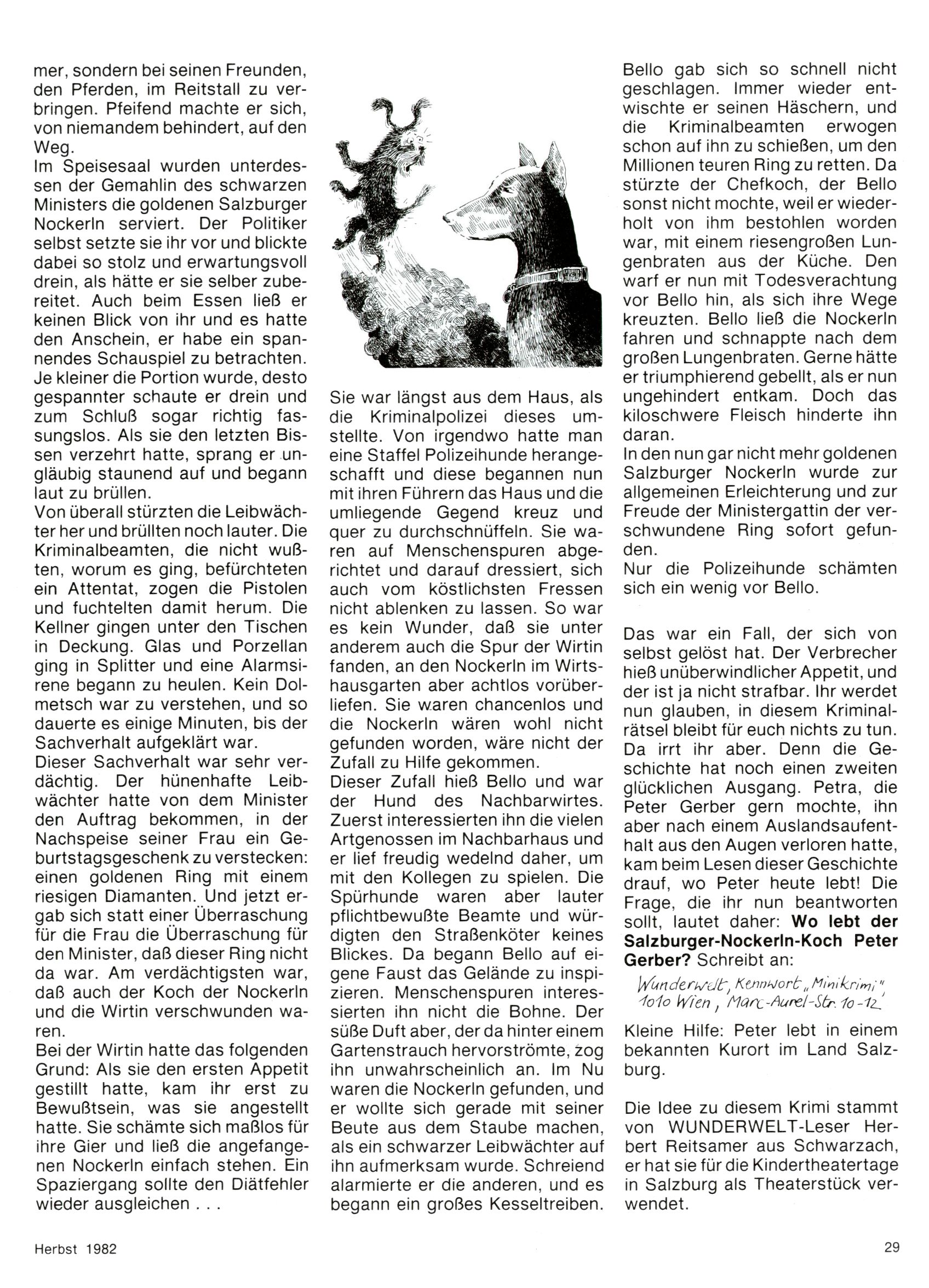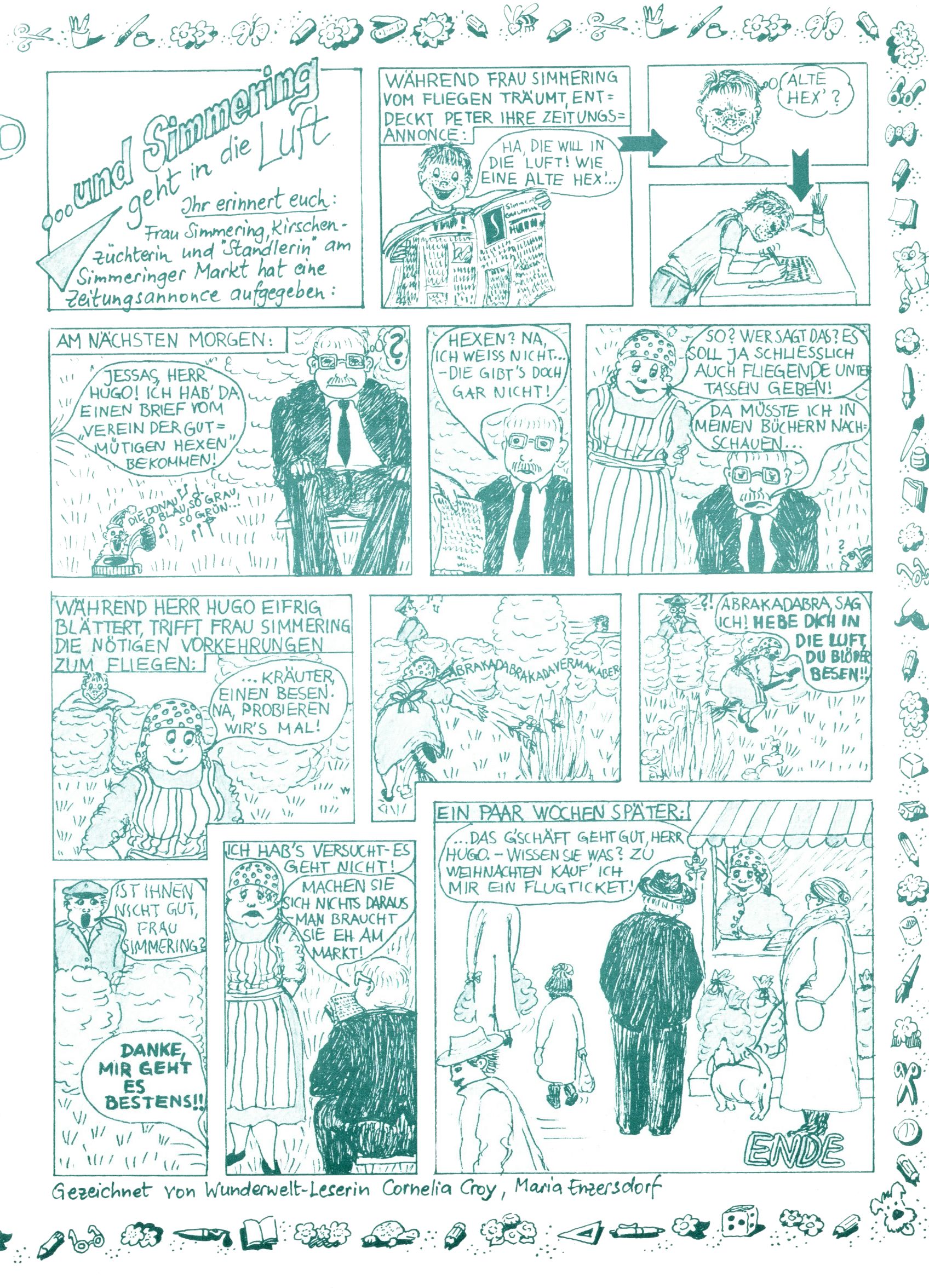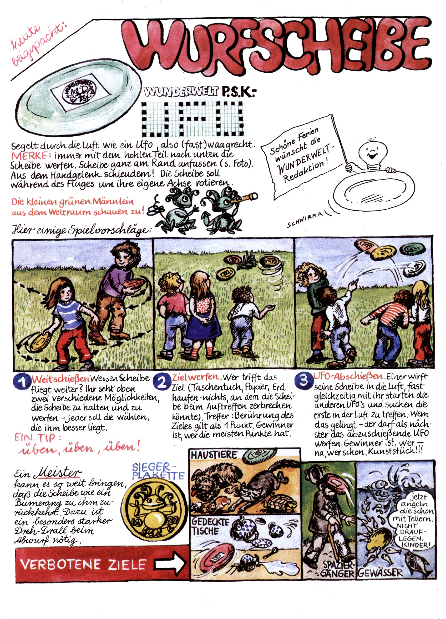 1982 - Hin und her In der angestrebten Marktnische hatte sich die WunderWelt 1982 perfekt eingenistet. Ohne auf Qualität zu verzichten, wäre eine Erhöhung der Reichweite in der multimedialen Umwelt nicht mehr möglich gewesen. Änderungen wurden daher nur in Datailbereichen durchgeführt. Neu war, dass erstmals ein Wunderwelt-Leser eine eigene Cartoonfolge starten durfte. Der fünfzehnjährige Thomas Maurer zeichnete mit Spück, dem Außerirdischen eine abgehobene Serie, die zwar in Teilbereichen witzig war, über deren Qualität und Professionalität man aber – freundlich ausgedrückt – geteilter Meinung sein konnte. Was freilich niemand ahnen konnte, war, dass genau dieser Thomas Maurer 26 Jahre später mit der Romy die höchste österreichische Filmauszeichnung für das beste Drehbuch erhalten würde. So gab es eine ganze Reihe von Jugendlichen, die in der WunderWelt erstmals aufgefallen waren und später bemerkenswerte Karrieren hinlegten. Nach dem Experiment Spück kehrte man aber wieder zu Altbewährtem zurück. Fortan wurden Cartoons nur mehr eingekauft. Lediglich Klaus Pitters Comicserie Strick brachte es als Eigenproduktion auf 46 Folgen und hielt bis zum Schluss durch. Andere neue Autoren 1982 waren Peter Abraham, Lea Steininger und Birgit Riejke. Wieder einmal entdeckte man das Thema Burgen. Mit der Aktion Ritterschlag wurden mehrere österreichische Burgen und das Leben im Mittelalter vorgestellt. |