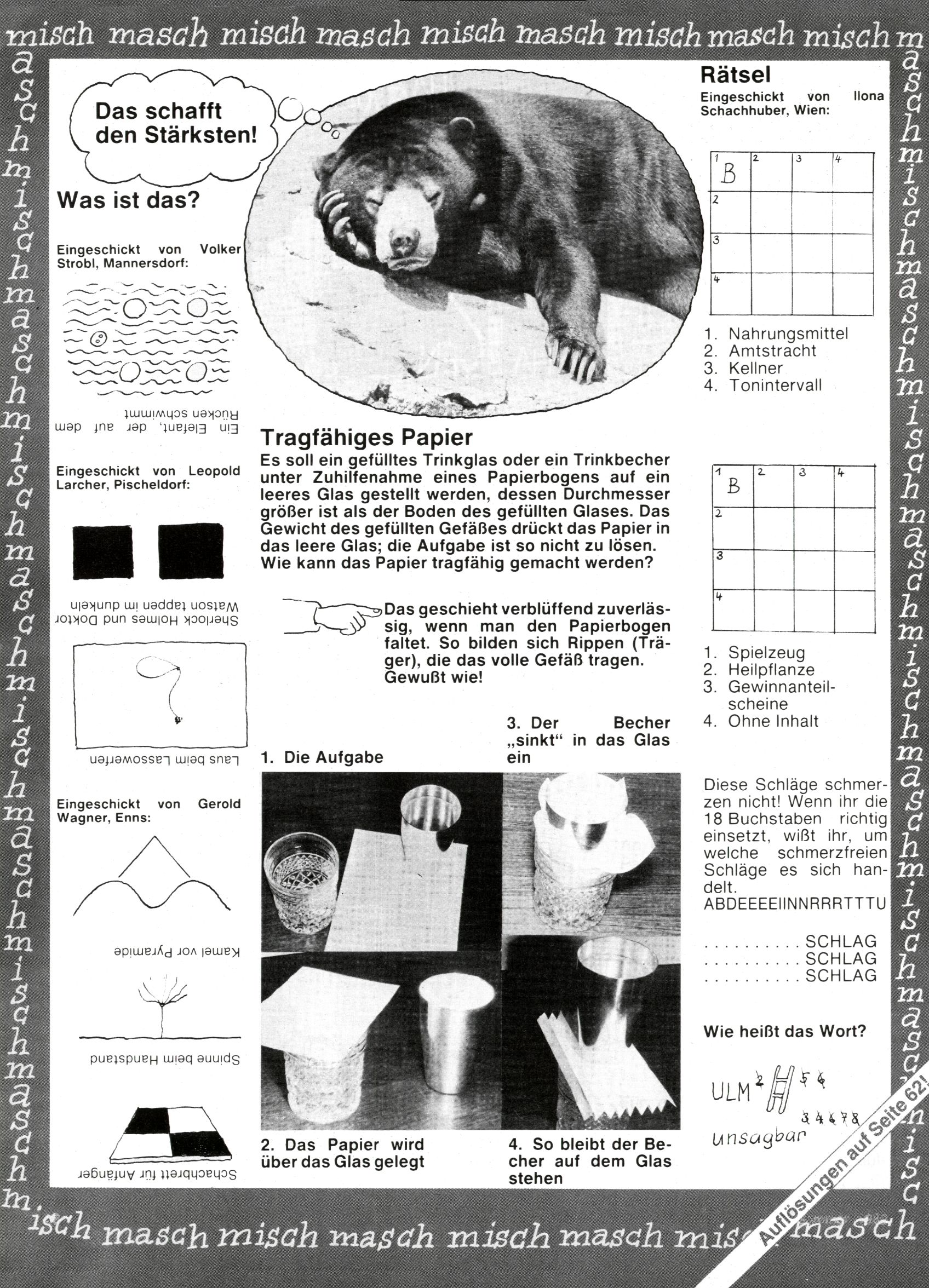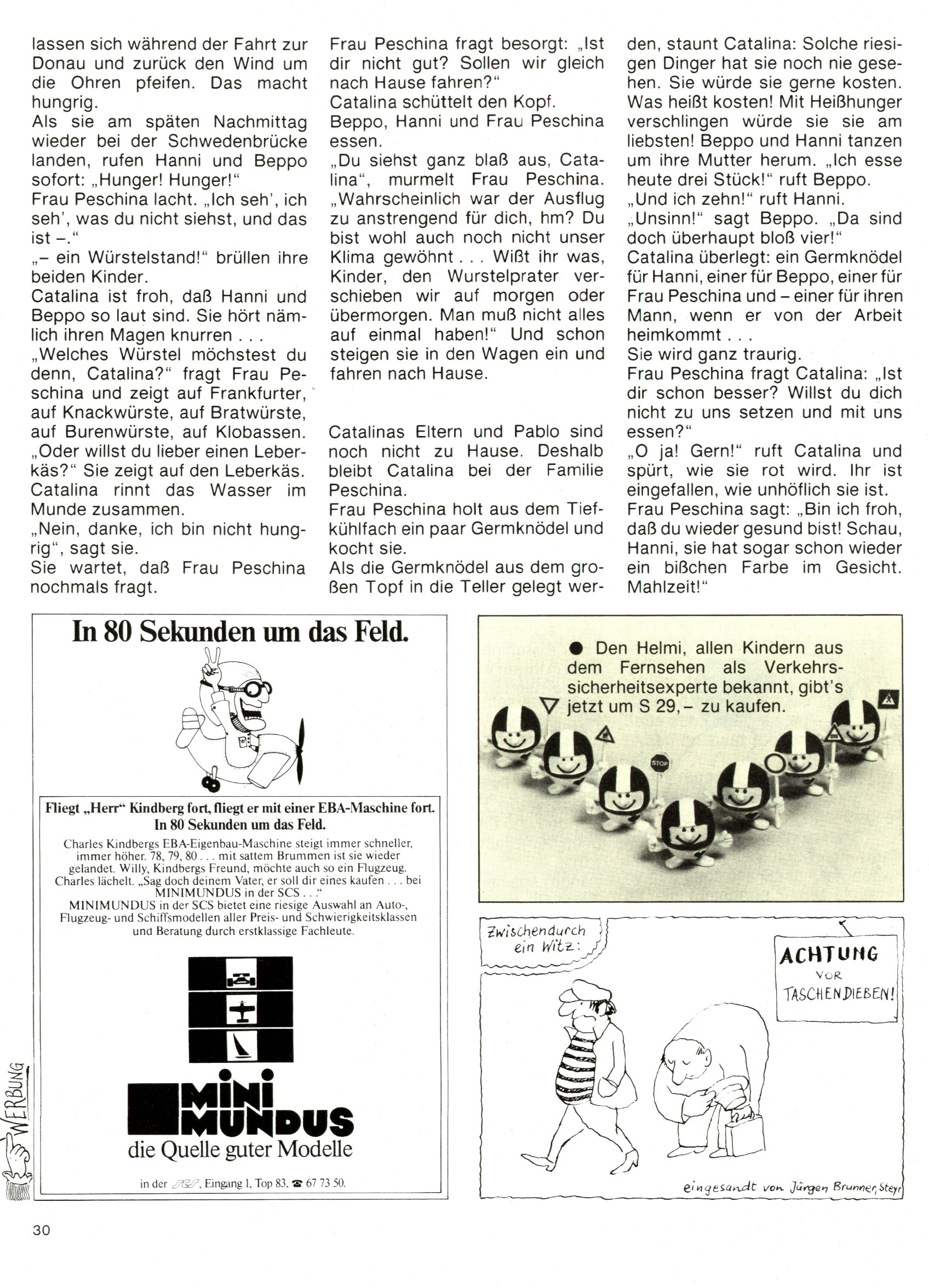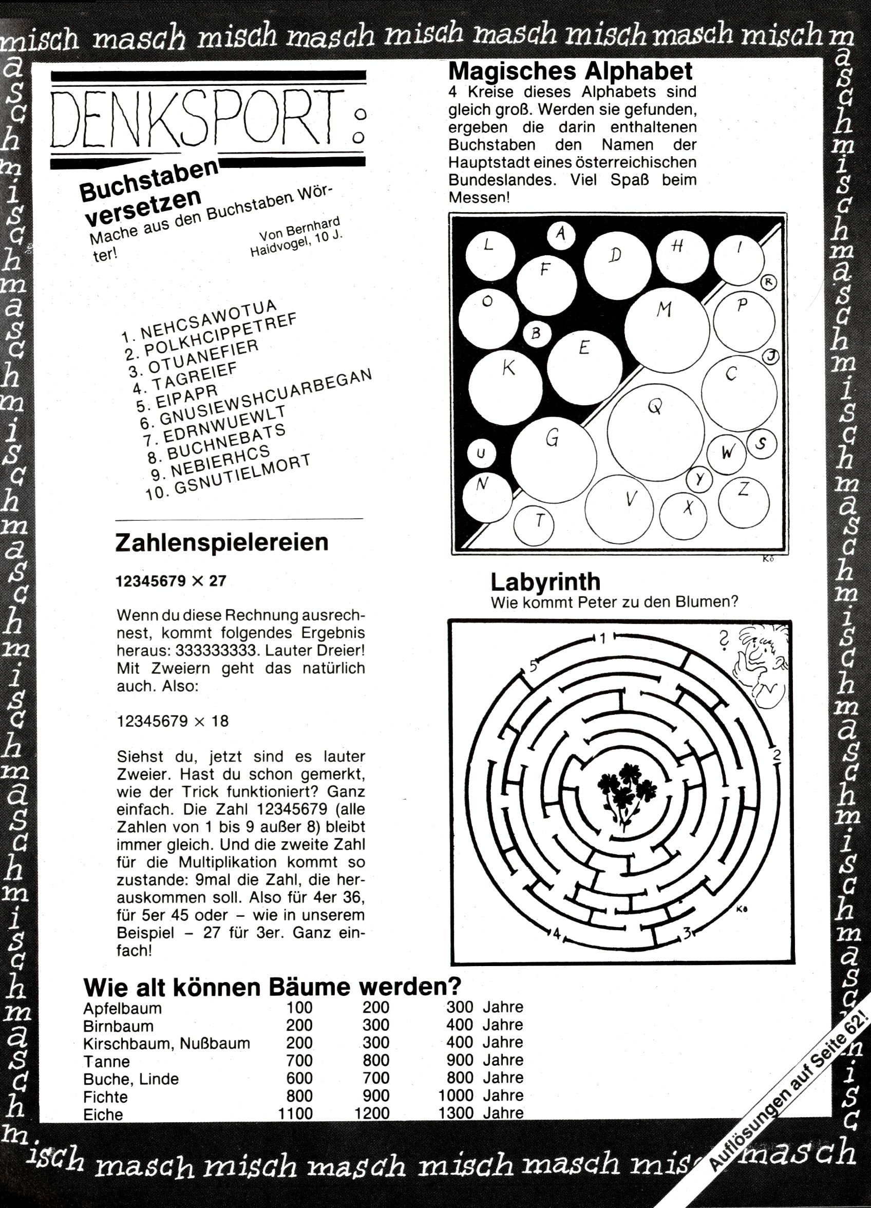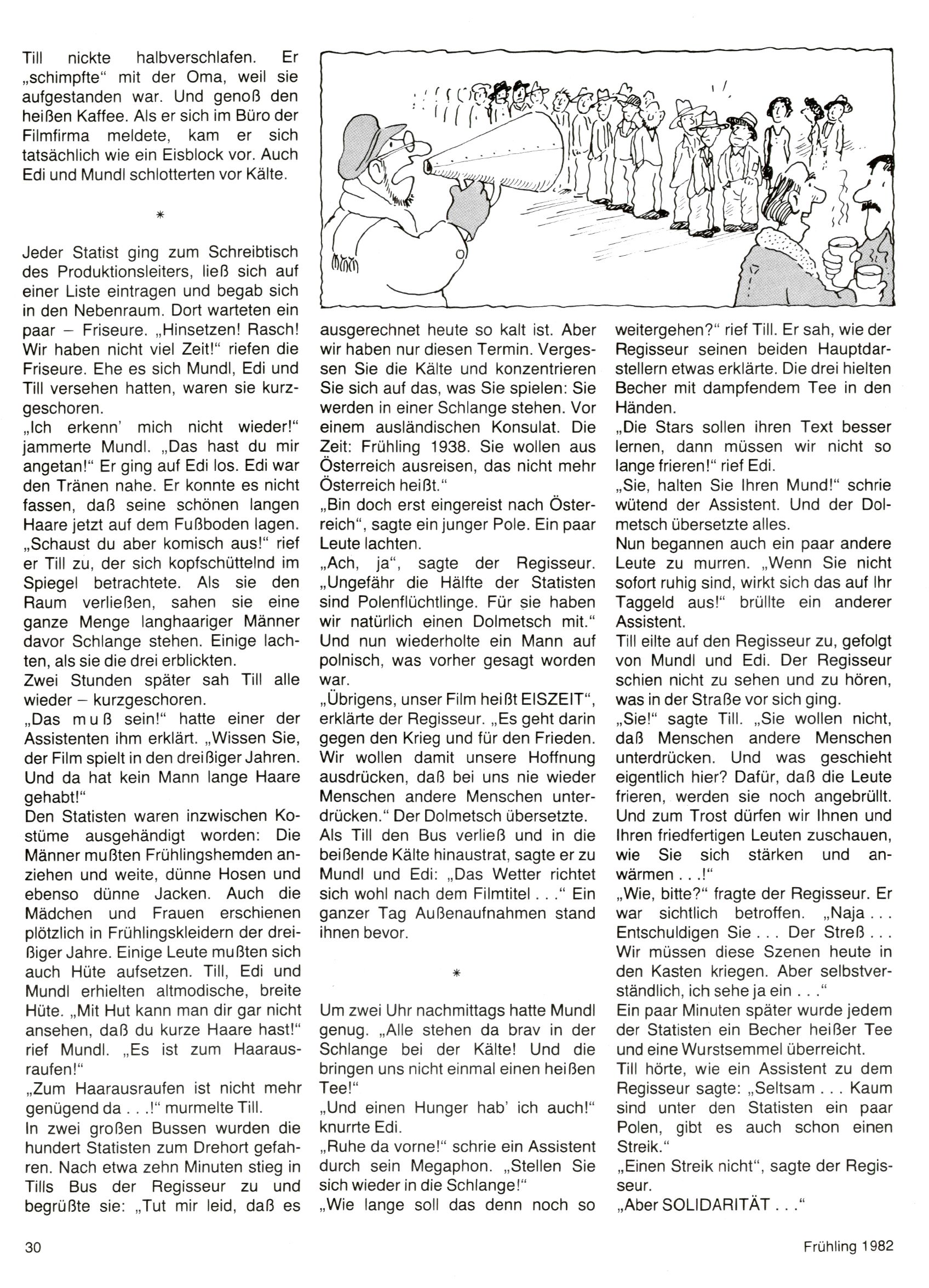 1982 - Hin und her In der angestrebten Marktnische hatte sich die WunderWelt 1982 perfekt eingenistet. Ohne auf Qualität zu verzichten, wäre eine Erhöhung der Reichweite in der multimedialen Umwelt nicht mehr möglich gewesen. Änderungen wurden daher nur in Datailbereichen durchgeführt. Neu war, dass erstmals ein Wunderwelt-Leser eine eigene Cartoonfolge starten durfte. Der fünfzehnjährige Thomas Maurer zeichnete mit Spück, dem Außerirdischen eine abgehobene Serie, die zwar in Teilbereichen witzig war, über deren Qualität und Professionalität man aber – freundlich ausgedrückt – geteilter Meinung sein konnte. Was freilich niemand ahnen konnte, war, dass genau dieser Thomas Maurer 26 Jahre später mit der Romy die höchste österreichische Filmauszeichnung für das beste Drehbuch erhalten würde. So gab es eine ganze Reihe von Jugendlichen, die in der WunderWelt erstmals aufgefallen waren und später bemerkenswerte Karrieren hinlegten. Nach dem Experiment Spück kehrte man aber wieder zu Altbewährtem zurück. Fortan wurden Cartoons nur mehr eingekauft. Lediglich Klaus Pitters Comicserie Strick brachte es als Eigenproduktion auf 46 Folgen und hielt bis zum Schluss durch. Andere neue Autoren 1982 waren Peter Abraham, Lea Steininger und Birgit Riejke. Wieder einmal entdeckte man das Thema Burgen. Mit der Aktion Ritterschlag wurden mehrere österreichische Burgen und das Leben im Mittelalter vorgestellt. |