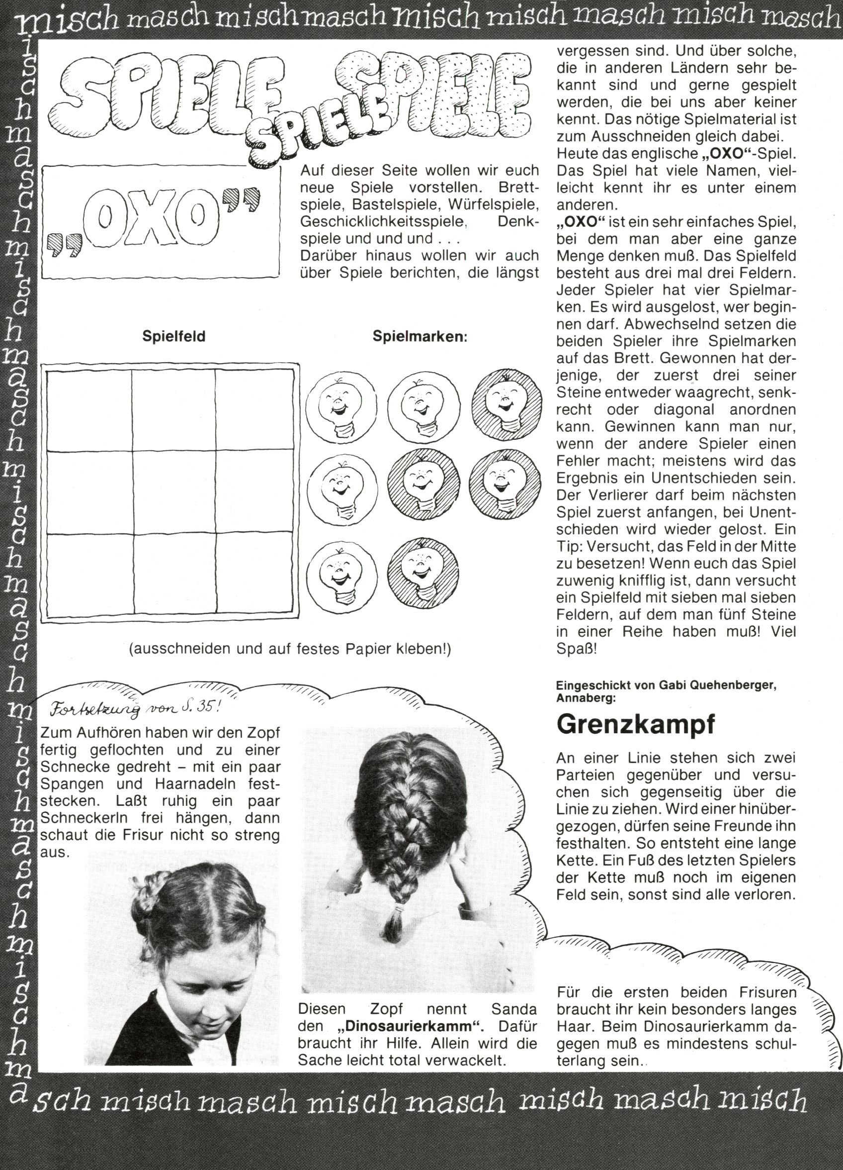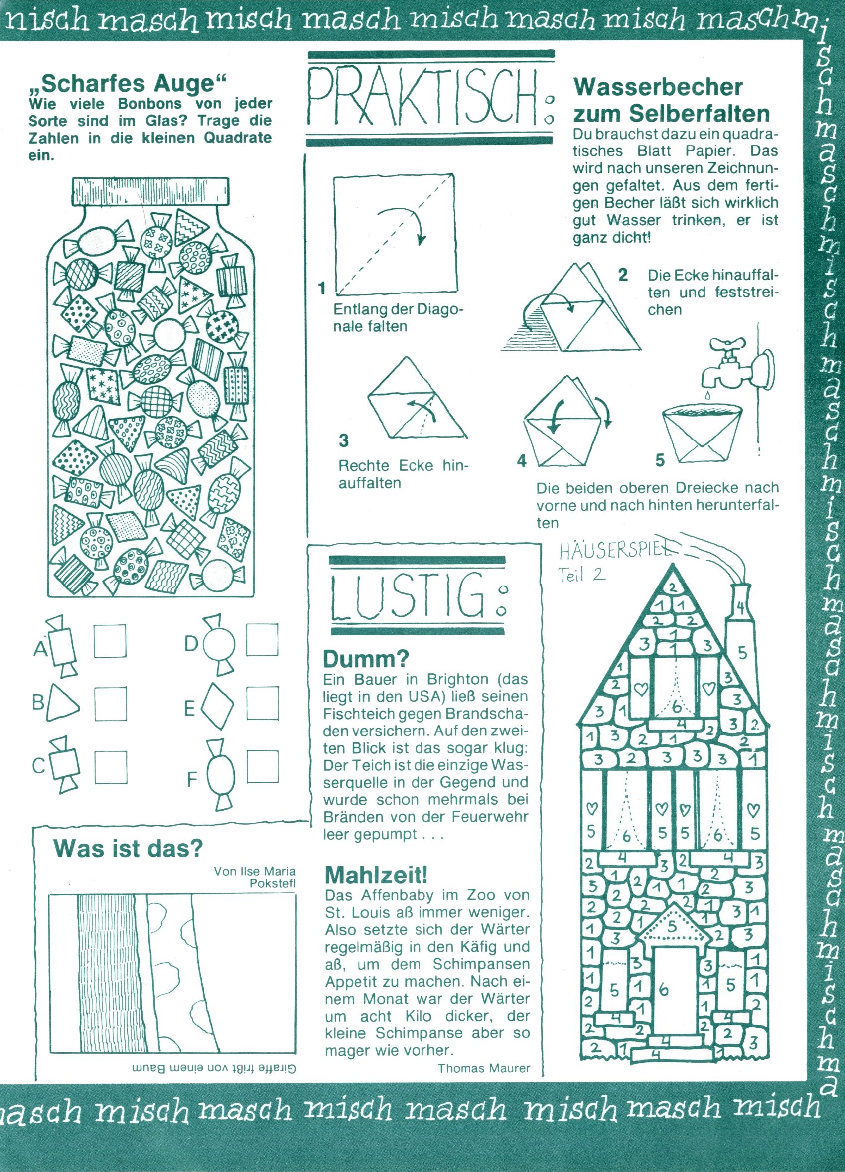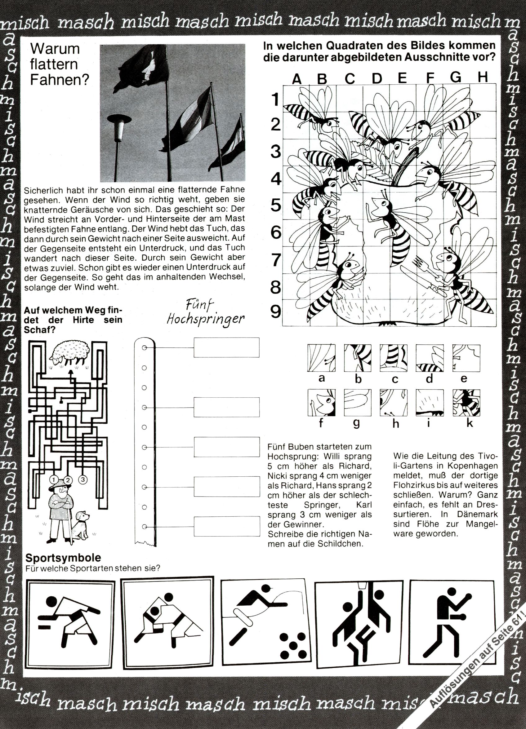 [A]usschneiden | [B]asteln/Handwerken | [C]omic | [E]rzählung/Märchen/Sage | [F]oto/Bild [G]edicht/Lied | [I]nformatives | [N]atur | [R]ätsel | [S]port/Spiel | [T]echnik/Wissen | [W]erbung |
