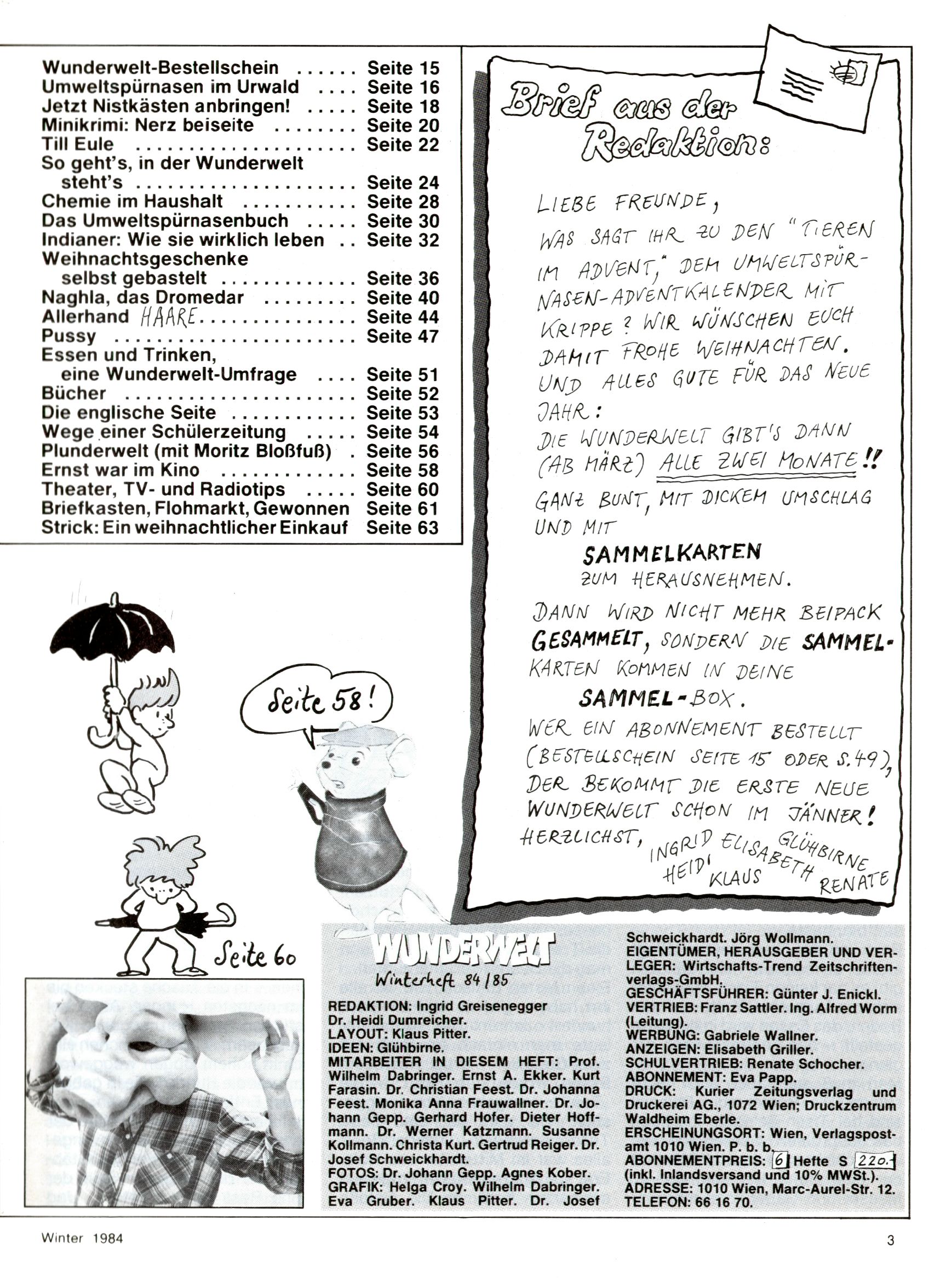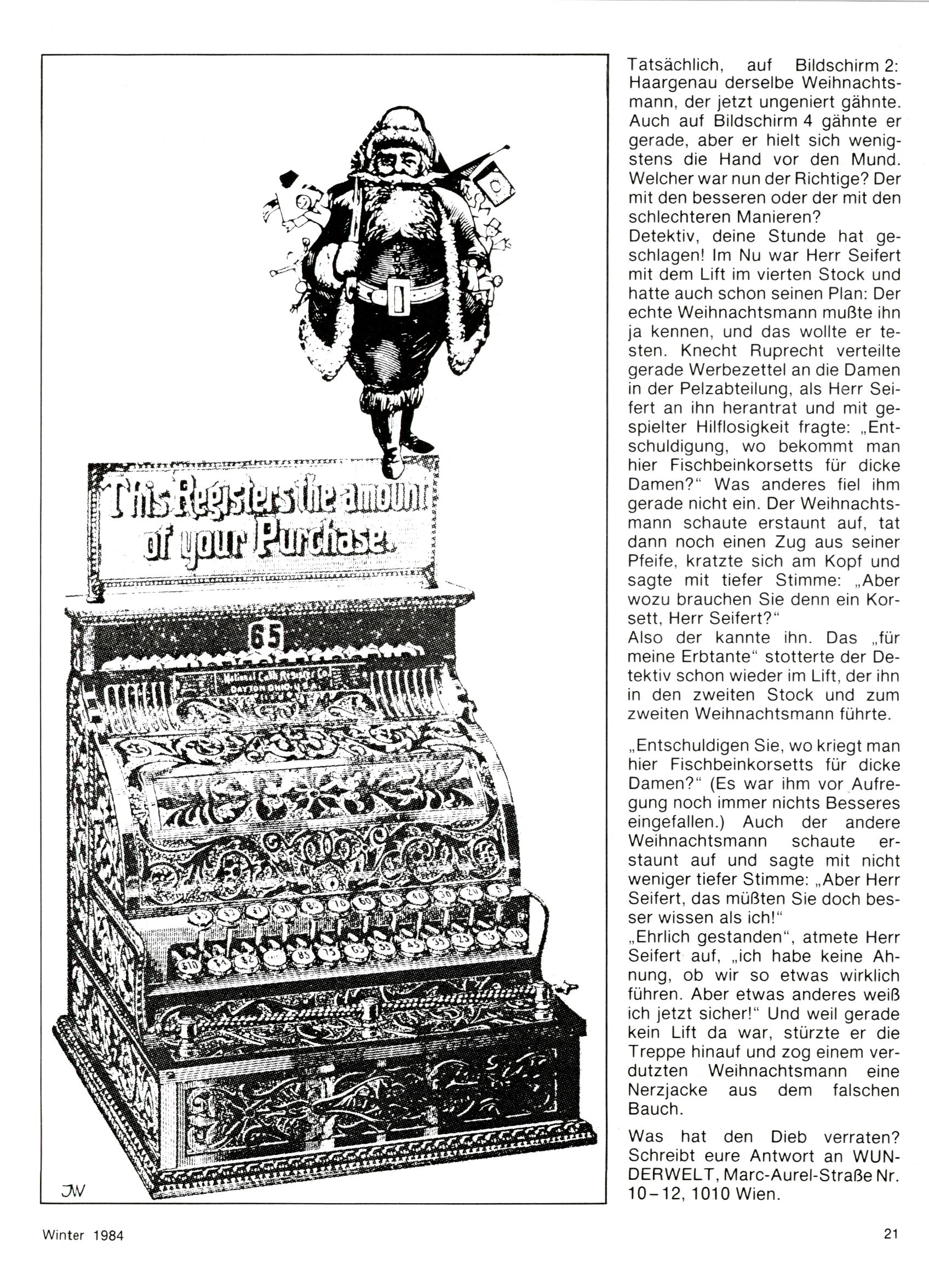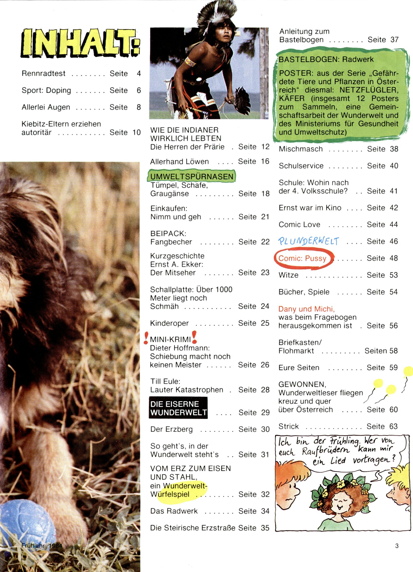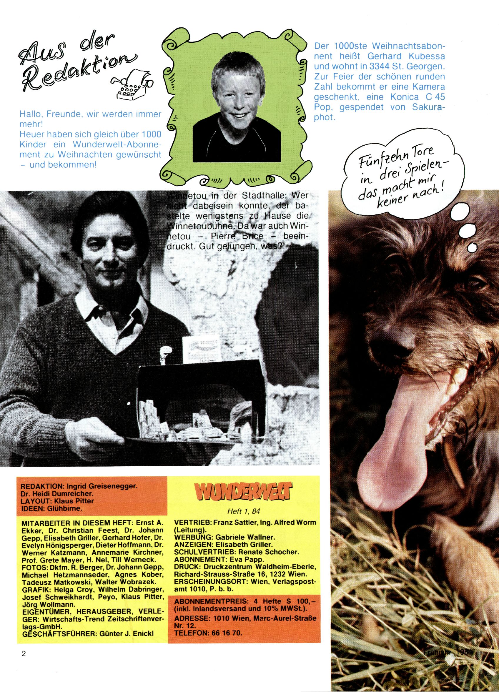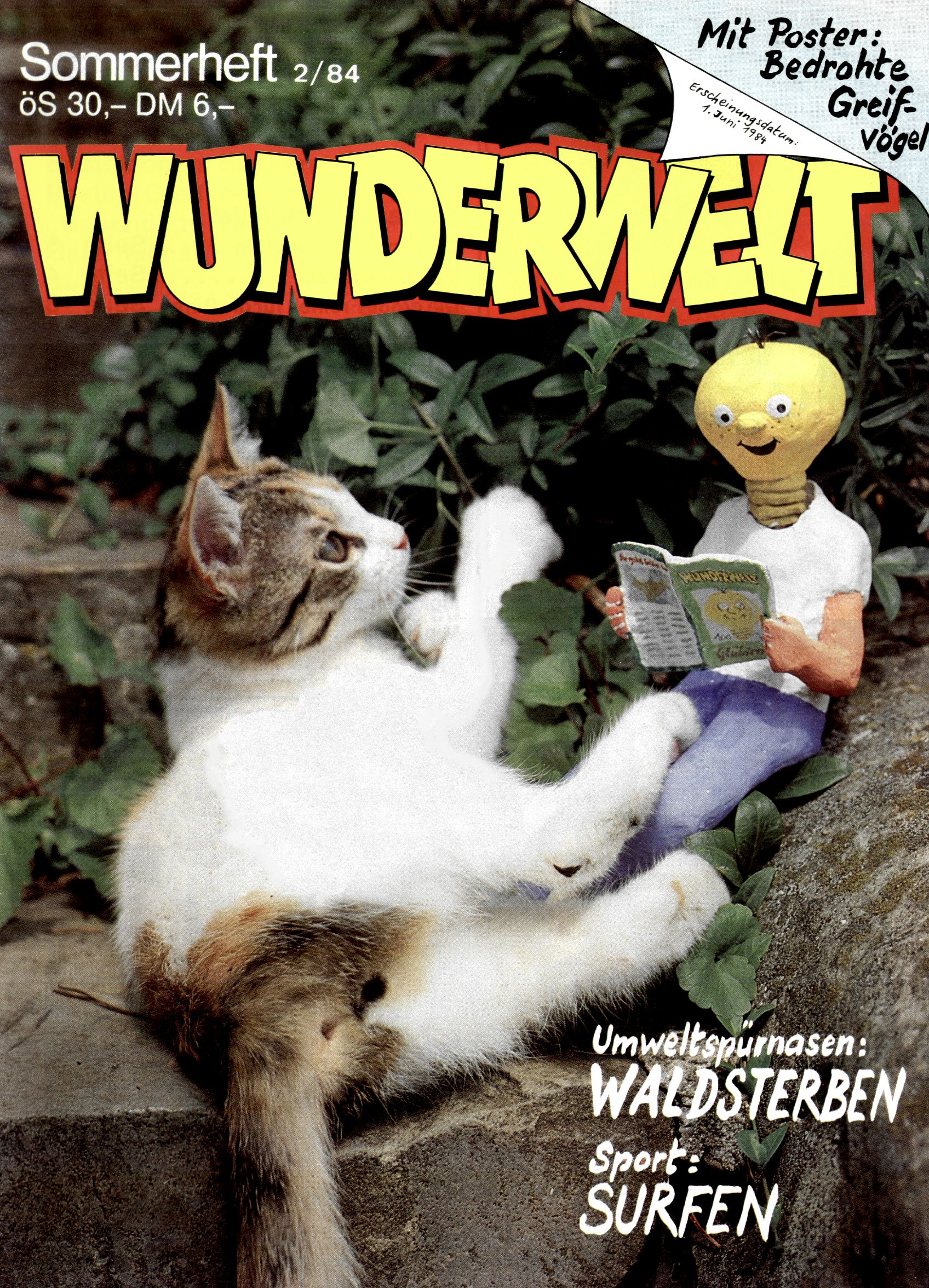 1984 - Der letzte Tango 1984 gab es keine Experimente mehr. Der Aufbau der Zeitung glich exakt dem von 1982 und 1983. Dies hatte einen Grund. Ab 1985 sollte die letzte Phase der WunderWelt eingeleitet werden. Vorerst gab es Wissenschaftliches wie zuletzt – Johann Gepp berichtete über Ameisenlöwen, Christian Feest wieder einmal über Indianer; daneben gab es Beiträge über Sport, Ernährung, biologische Landwirtschaft, die Erzgewinnung, Greifvögel und anderes. Dieter Hoffmann und Ernst A. Ekker bestritten ihr obligatorisches Fernduell bei den Kurzgeschichten, Wilhelm Dabringer zeichnete wie immer für die Bastelbögen verantwortlich. Die Vertriebsleitung hatte 1984 ein gewisser Alfred Worm inne und alleine dieser Umstand konnte einen hellhörig werden lassen. In der Tat war 1985 dann alles anders. |