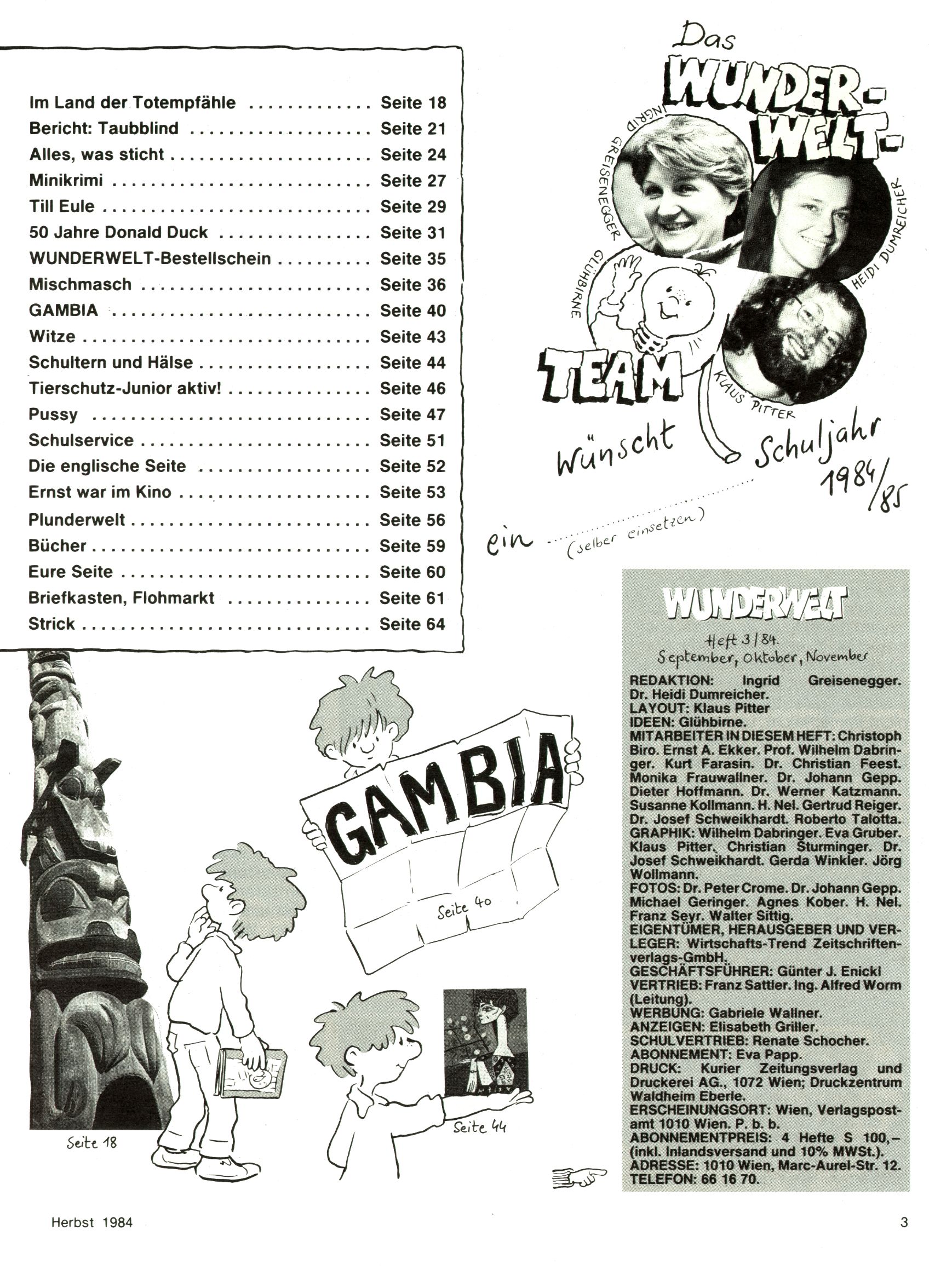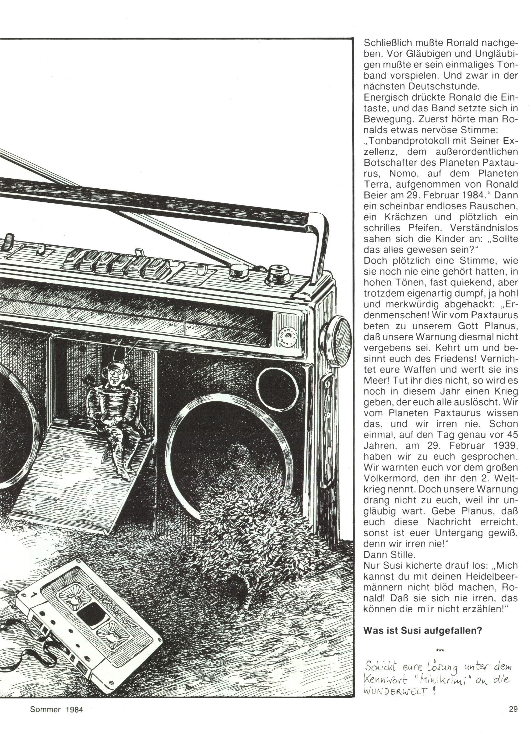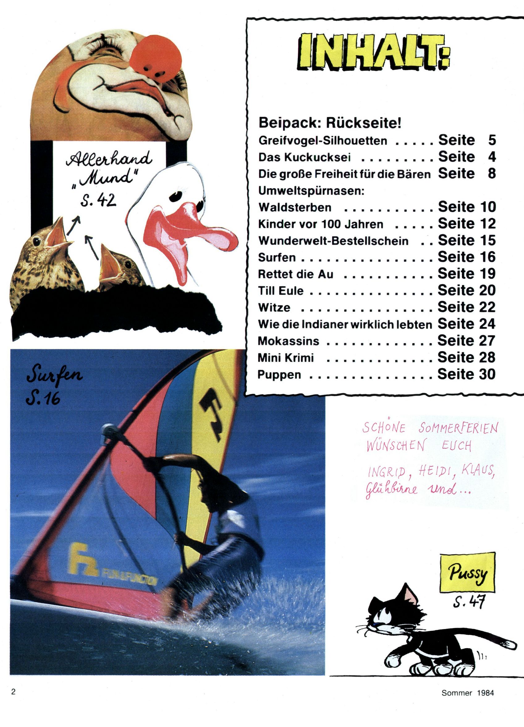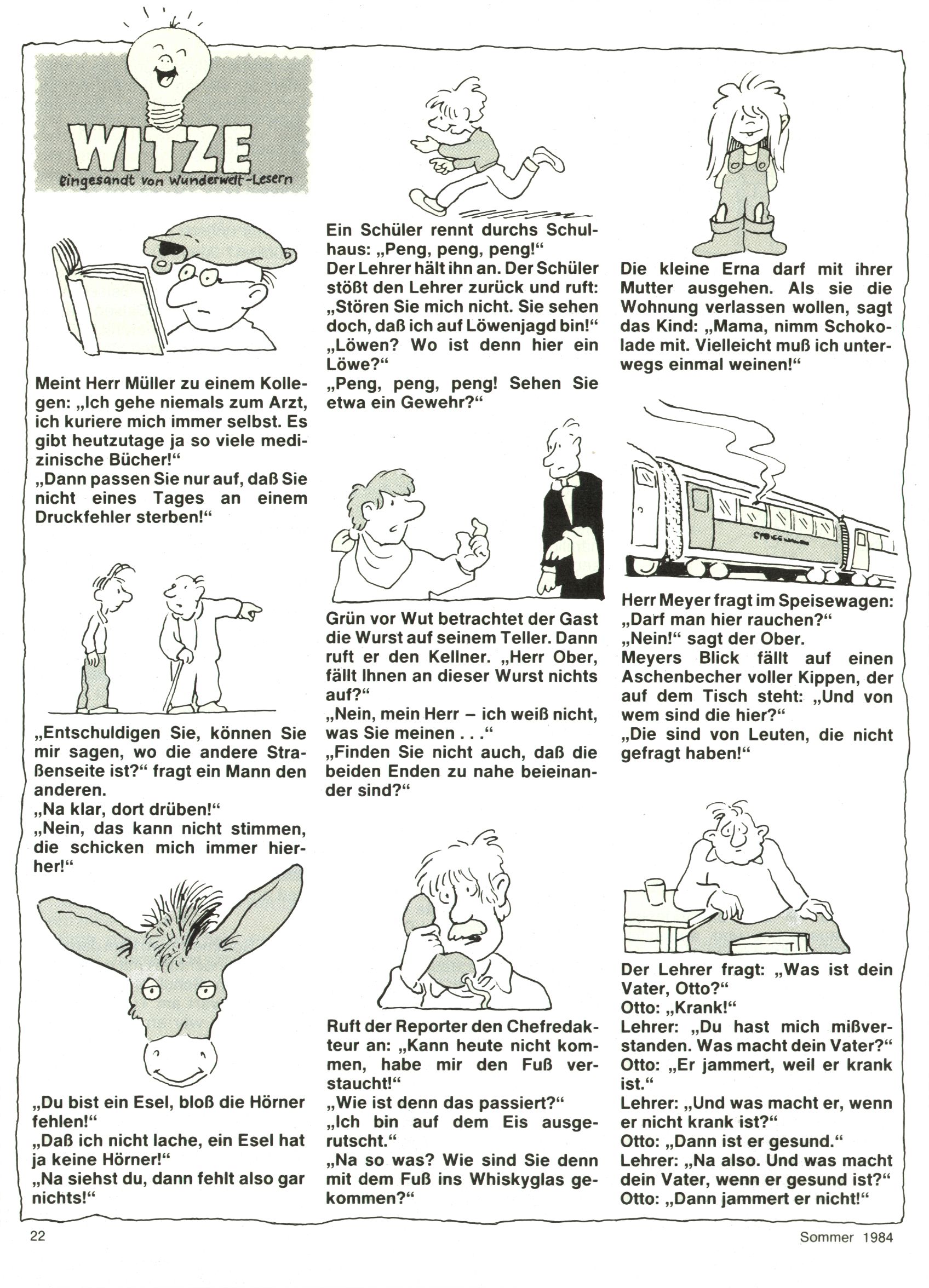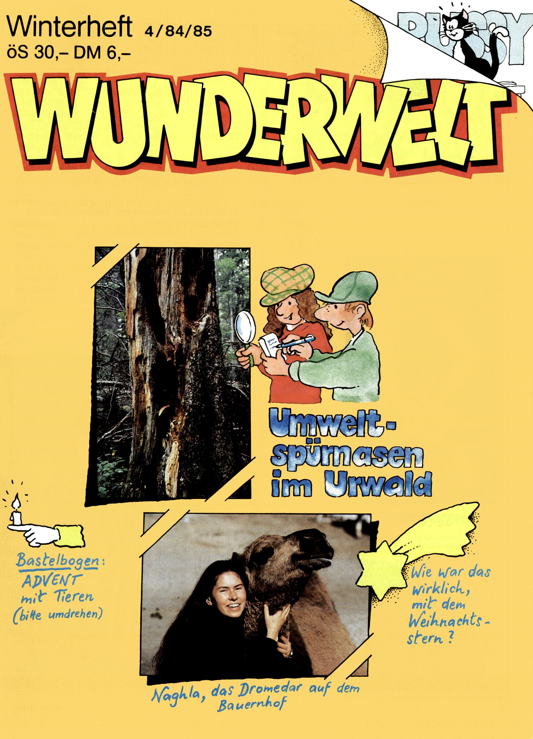 1984 - Der letzte Tango 1984 gab es keine Experimente mehr. Der Aufbau der Zeitung glich exakt dem von 1982 und 1983. Dies hatte einen Grund. Ab 1985 sollte die letzte Phase der WunderWelt eingeleitet werden. Vorerst gab es Wissenschaftliches wie zuletzt – Johann Gepp berichtete über Ameisenlöwen, Christian Feest wieder einmal über Indianer; daneben gab es Beiträge über Sport, Ernährung, biologische Landwirtschaft, die Erzgewinnung, Greifvögel und anderes. Dieter Hoffmann und Ernst A. Ekker bestritten ihr obligatorisches Fernduell bei den Kurzgeschichten, Wilhelm Dabringer zeichnete wie immer für die Bastelbögen verantwortlich. Die Vertriebsleitung hatte 1984 ein gewisser Alfred Worm inne und alleine dieser Umstand konnte einen hellhörig werden lassen. In der Tat war 1985 dann alles anders. |