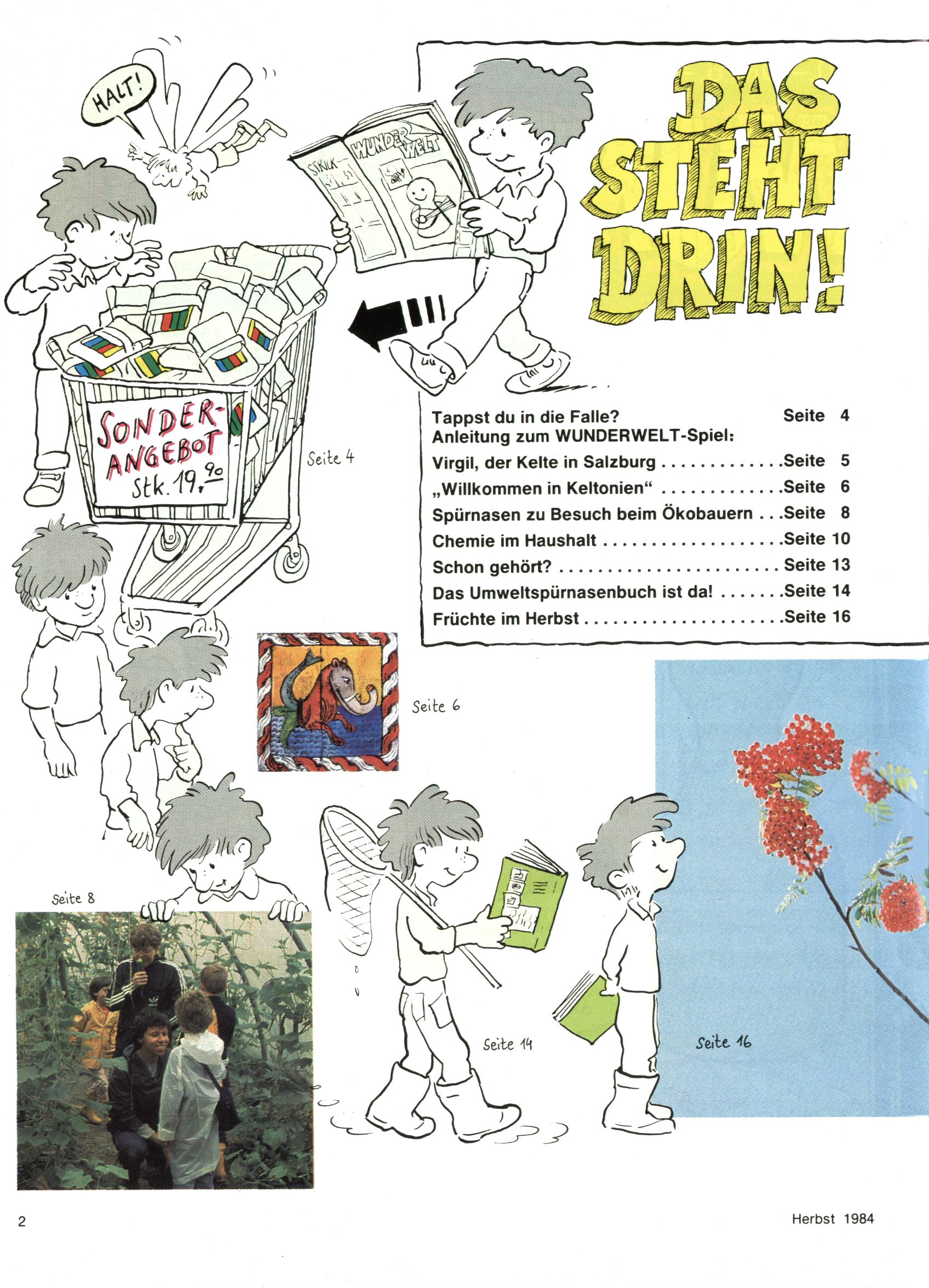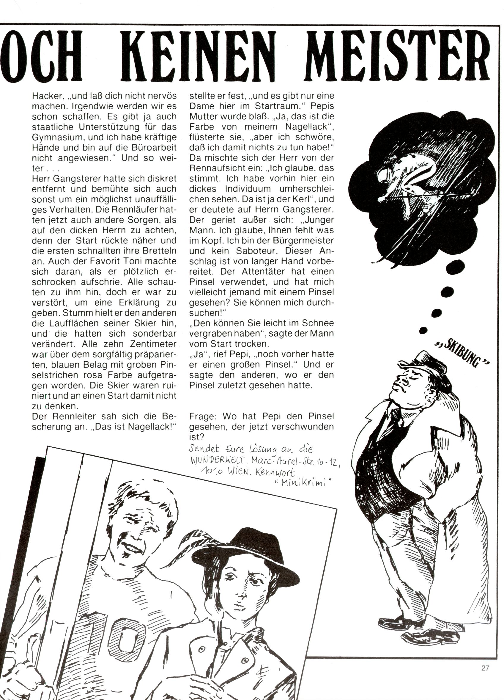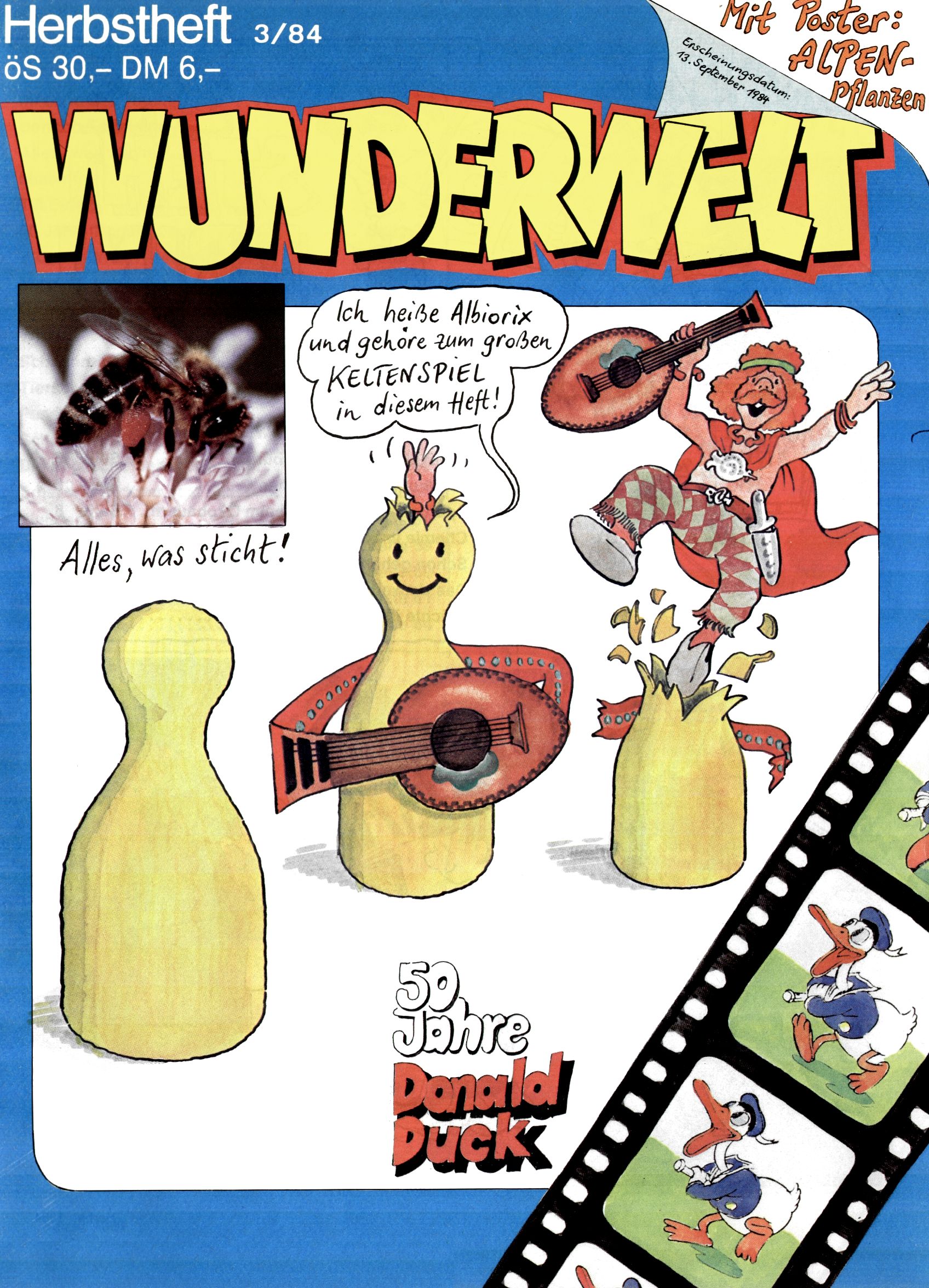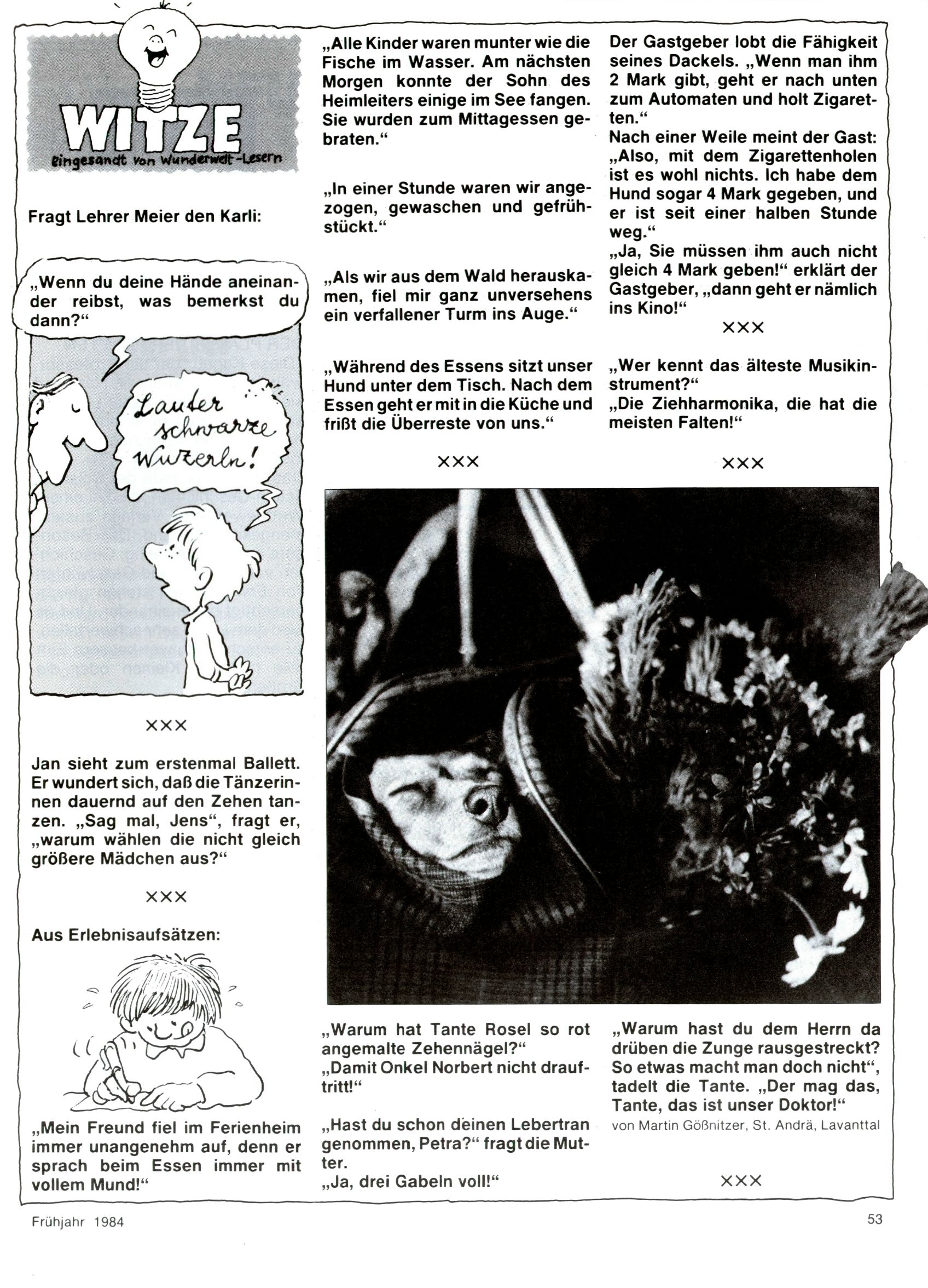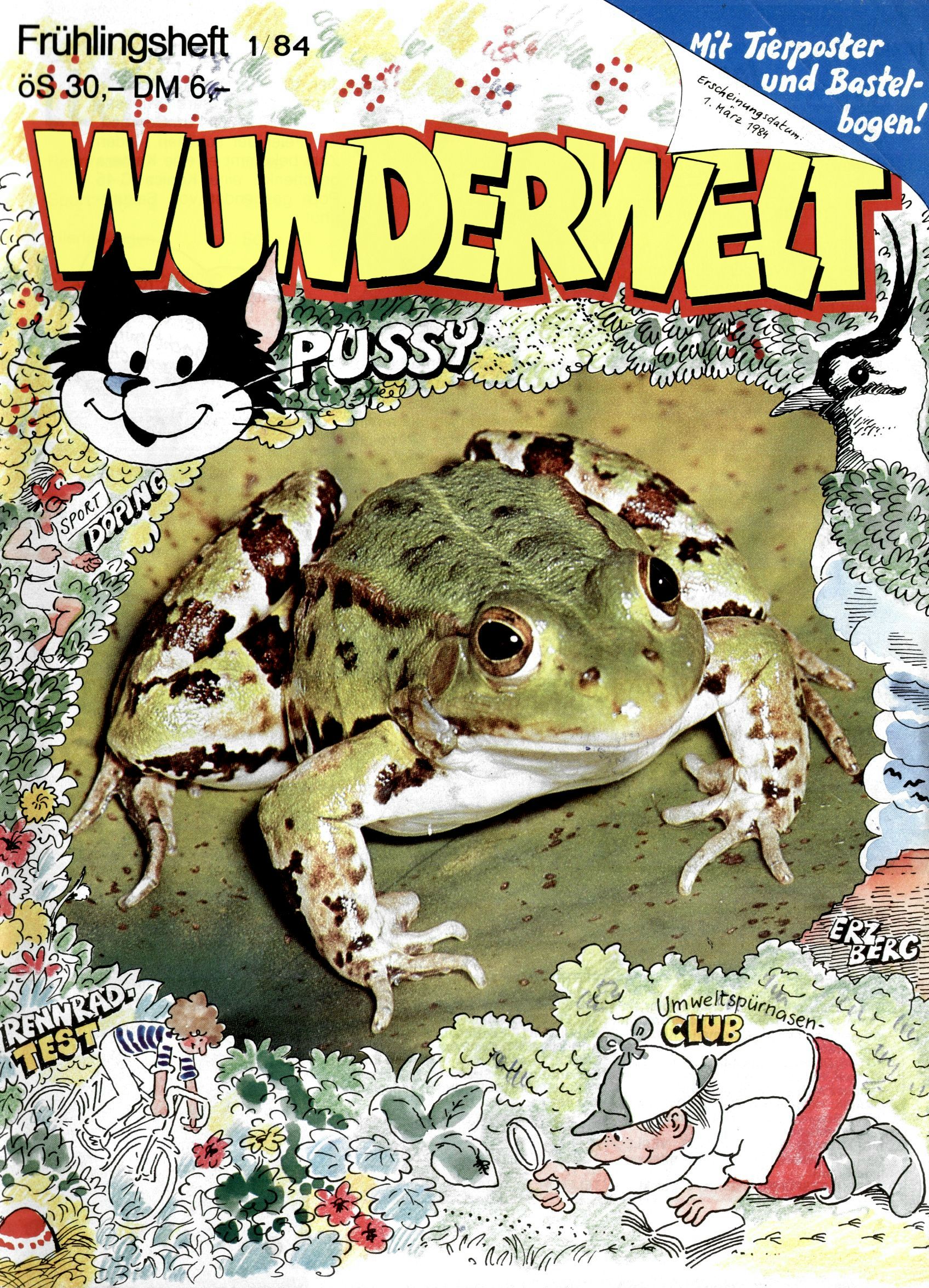 1984 - Der letzte Tango 1984 gab es keine Experimente mehr. Der Aufbau der Zeitung glich exakt dem von 1982 und 1983. Dies hatte einen Grund. Ab 1985 sollte die letzte Phase der WunderWelt eingeleitet werden. Vorerst gab es Wissenschaftliches wie zuletzt – Johann Gepp berichtete über Ameisenlöwen, Christian Feest wieder einmal über Indianer; daneben gab es Beiträge über Sport, Ernährung, biologische Landwirtschaft, die Erzgewinnung, Greifvögel und anderes. Dieter Hoffmann und Ernst A. Ekker bestritten ihr obligatorisches Fernduell bei den Kurzgeschichten, Wilhelm Dabringer zeichnete wie immer für die Bastelbögen verantwortlich. Die Vertriebsleitung hatte 1984 ein gewisser Alfred Worm inne und alleine dieser Umstand konnte einen hellhörig werden lassen. In der Tat war 1985 dann alles anders. |