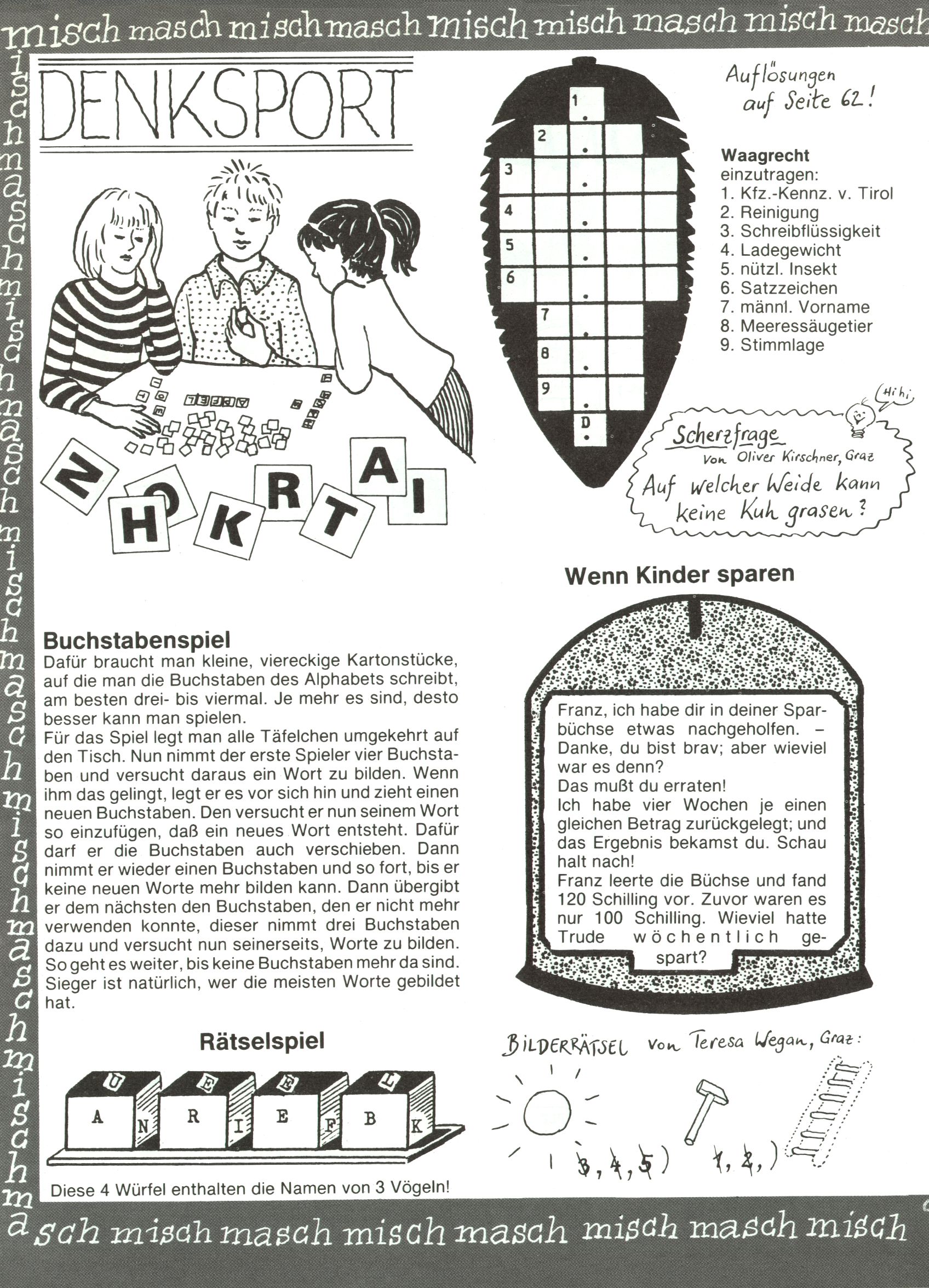 [A]usschneiden | [B]asteln/Handwerken | [C]omic | [E]rzählung/Märchen/Sage | [F]oto/Bild [G]edicht/Lied | [I]nformatives | [N]atur | [R]ätsel | [S]port/Spiel | [T]echnik/Wissen | [W]erbung |