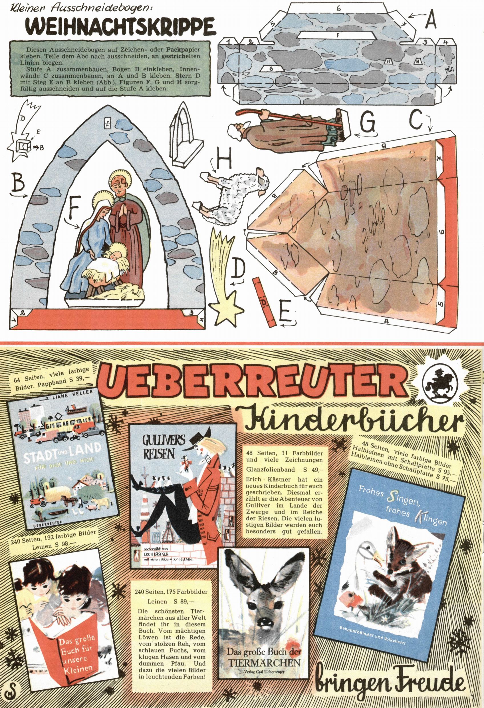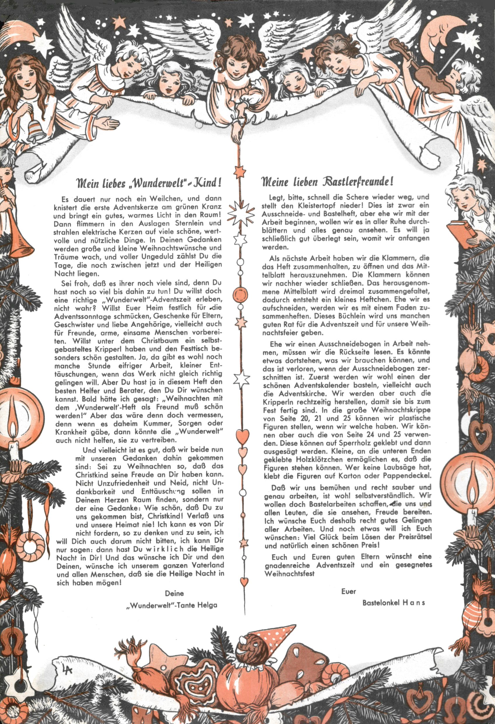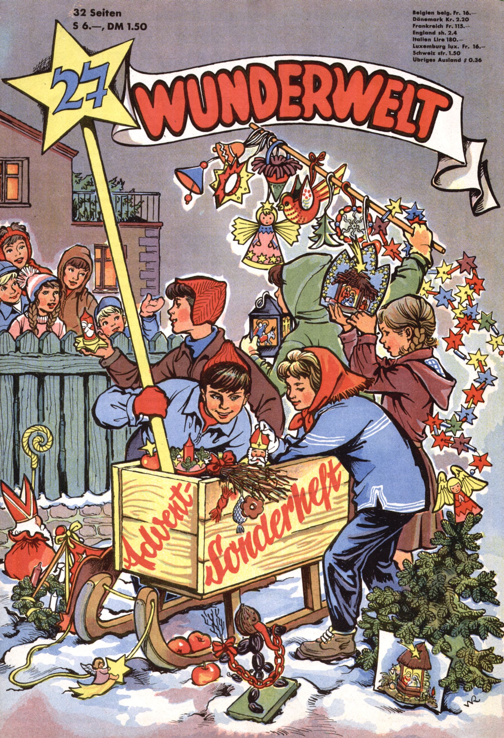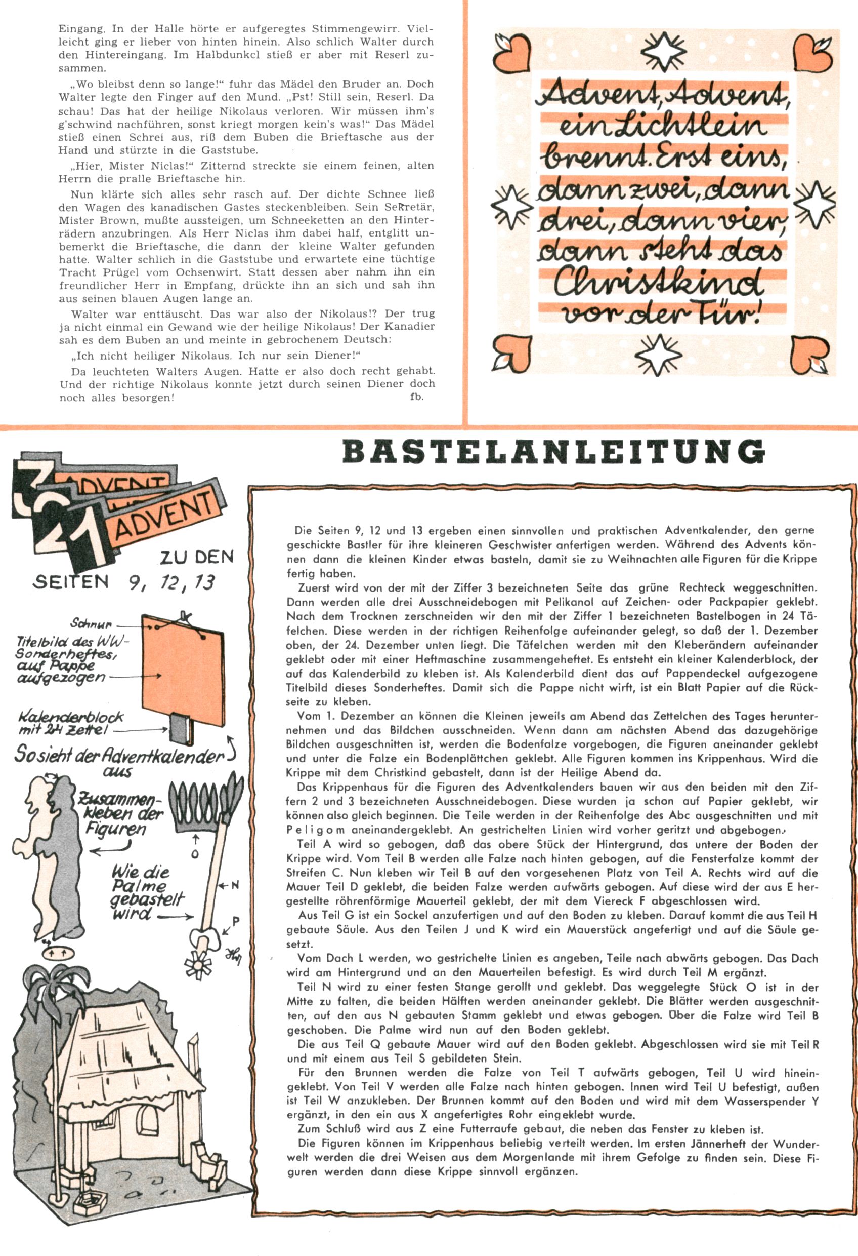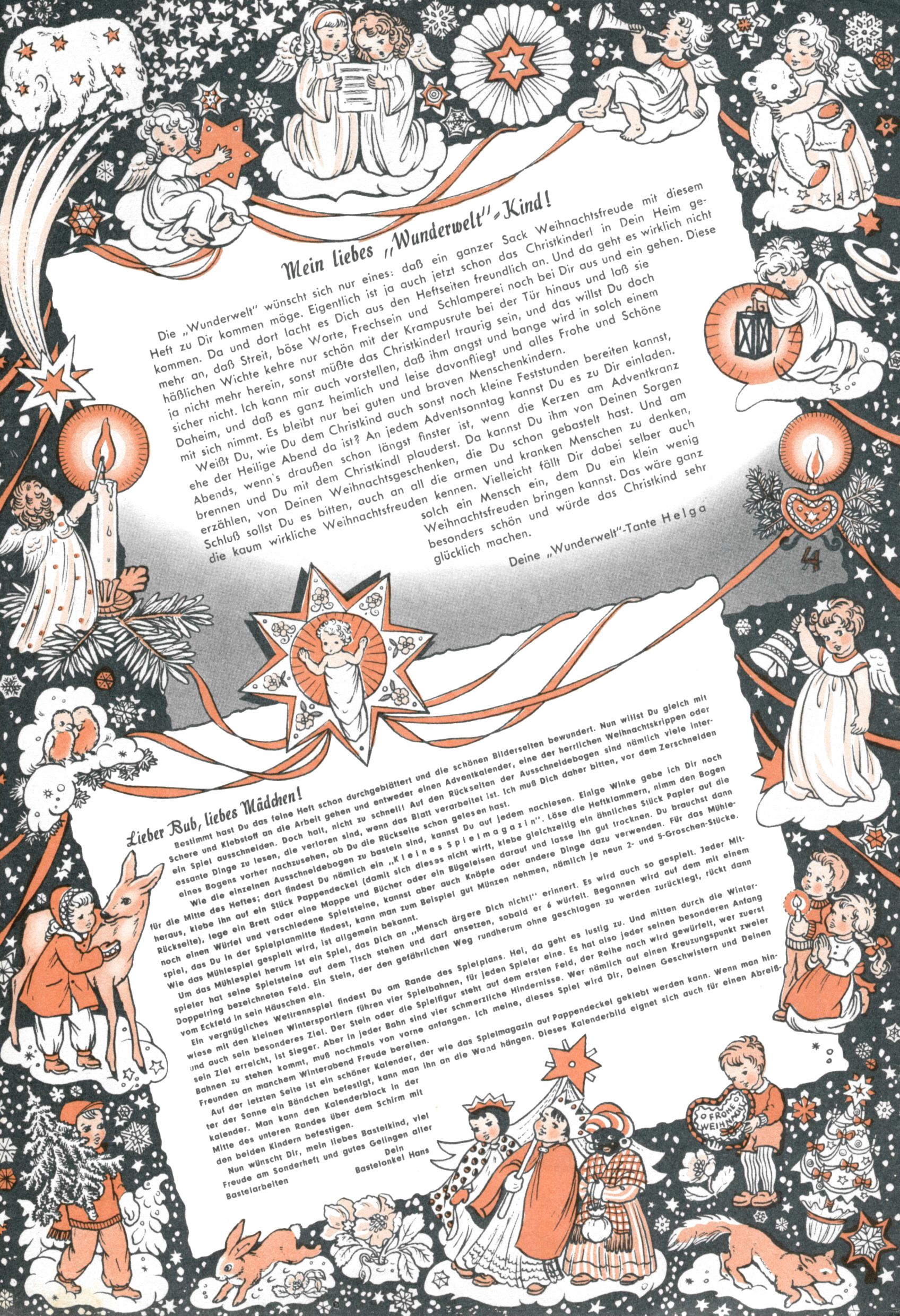 Die Wunderwelt im Festtagsgewand In den Sonderheften präsentierte sich die Wunderwelt wahrhaftig in Feiertagsstimmung. Mit wenigen Ausnahmen gab es pro Jahr drei Sonderhefte - zu Weihnachten bzw. im Advent, zu Ostern und in den Ferien im Sommer. Experimente mit Faschings- und Muttertagsheften hatten sich nicht bewährt. Selbst als es die Einzelhefte in der Krisensituation nach 1967 nicht mehr gab, wurde die Wunderwelt-Zeitung im Layout der Sonderhefte fortgesetzt: Zunächst mit 3 bis 5 und ab 1971 immerhin wieder mit 10-12 Heften pro Jahr. Die Weihnachts-, Oster- und Ferienhefte hatten naturgemäß verschiedene Schwerpunkte. Während im Sommer Spielen und Werken mit Material im Vordergrund stand, waren es zu Weihnachten Krippen und Adventhäuser; zu Ostern dann Erzählungen, Hasenstädte und Oster-Basteleien. Das bessere Papier der Sonderhefte erleichterte das Ausschneiden der insgesamt mehr als 1000 Papiermodelle erheblich. Die Sonderhefte waren vergleichsweise aufwändig gestaltet, aber auch ein wichtiges Zusatzgeschäft für die Zeitung. Die Kinder fieberten dem Erscheinungsdatum der jeweiligen Ausgabe nicht selten richtiggehend entgegen. Mit knapp 100 Seiten pro Jahr machten die Sonderhefte von der Menge her zwar nicht einmal ein Viertel aus, trugen aber zum Erscheinungsbild mindestens genauso viel bei wie die Standardhefte. Im Wesentlichen blieb das Layout der Sonderhefte über die Jahre hin unverändert. Mühselig wurde es, als man den Inhalt der Beiträge vorübergehend auf die Seiten gleichmäßig verteilte und die Kinder ermunterte, die Hefte in der Mitte zu zerschneiden. Die eine Hälfte enthielt dann etwa Erzählungen und Bastelvorschläge, der andere Teil der Zeitung Spielanleitungen. Zur übersichtlichkeit trugen diese Layoutversuche jedenfalls in keiner Weise bei und als besonderen Auswuchs gab es eine Zeitlang auf einer Seite oft mehrere Seitennummern, je nachdem, ob sich diese auf das Gesamtheft oder den herauszunehmenden und zu zerschneidenden Heftteil bezogen. Gegen Ende der 1950er Jahre kehrte man wieder zu einem ganzseitigen Layout zurück und Ideen wie ein Spiel-(Heft-im-)Heft gehörten der Vergangenheit an. In den Sonderheften experimentierte man dann noch ab Mitte der 1960er Jahre, als die Verkaufszahlen stark rückläufig waren, mit grundsätzlich neuen Darstellungsformen - weg vom Niedlich-Kitschigen und engagierte neue Grafikerinnen wie Gundi Groh und Hella Soyka. Den erhofften Erfolg brachte dies jedoch nicht mehr. |