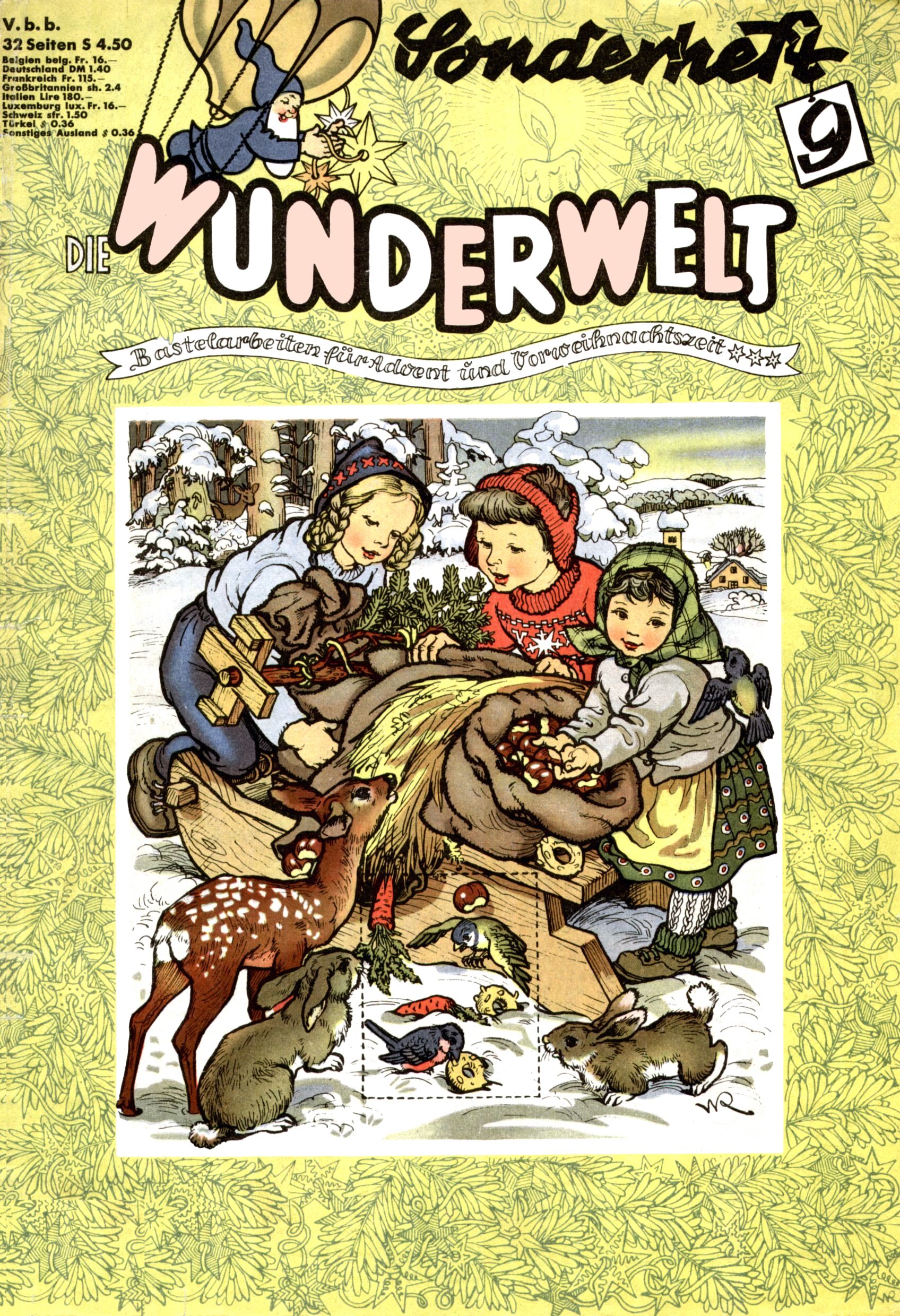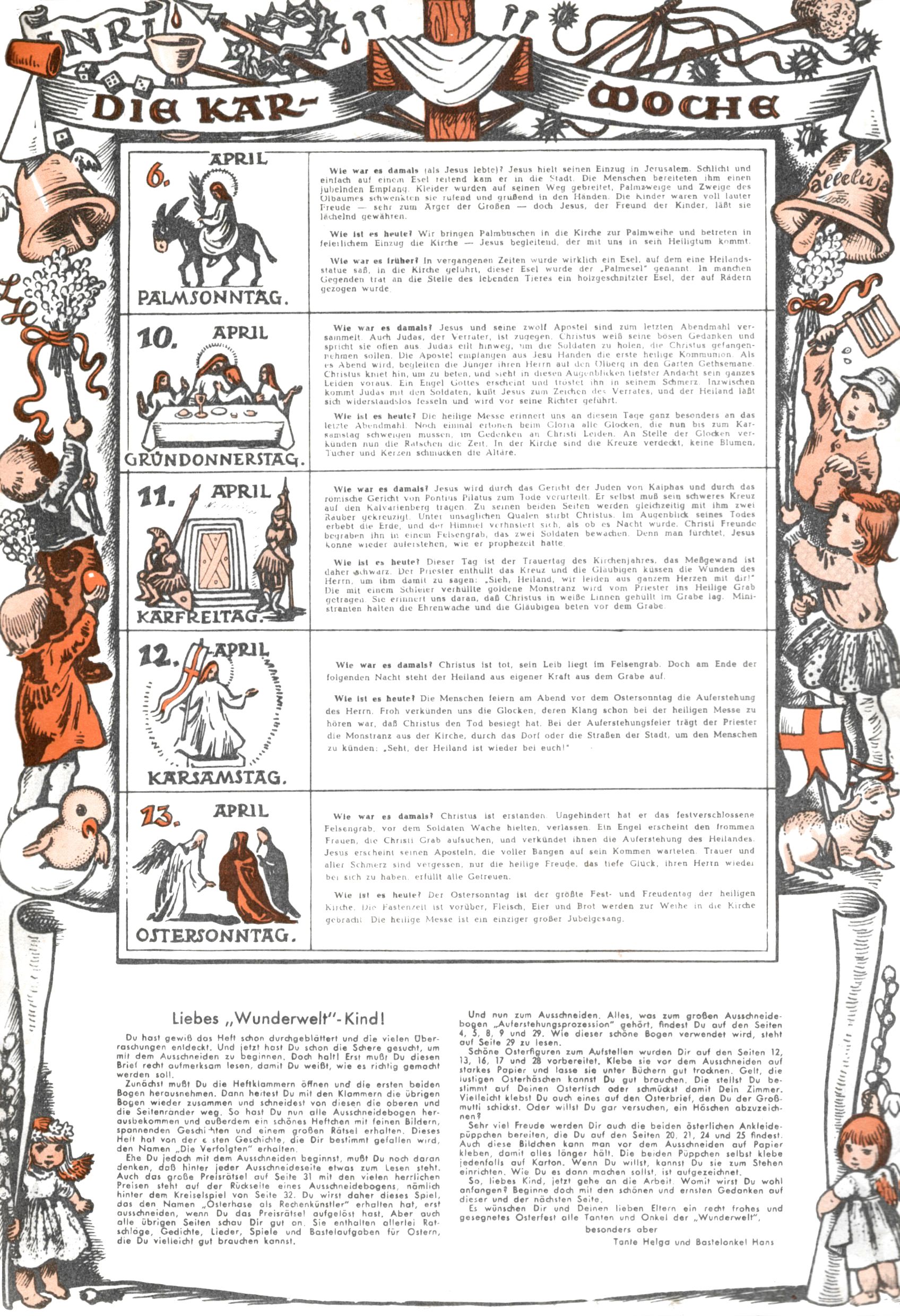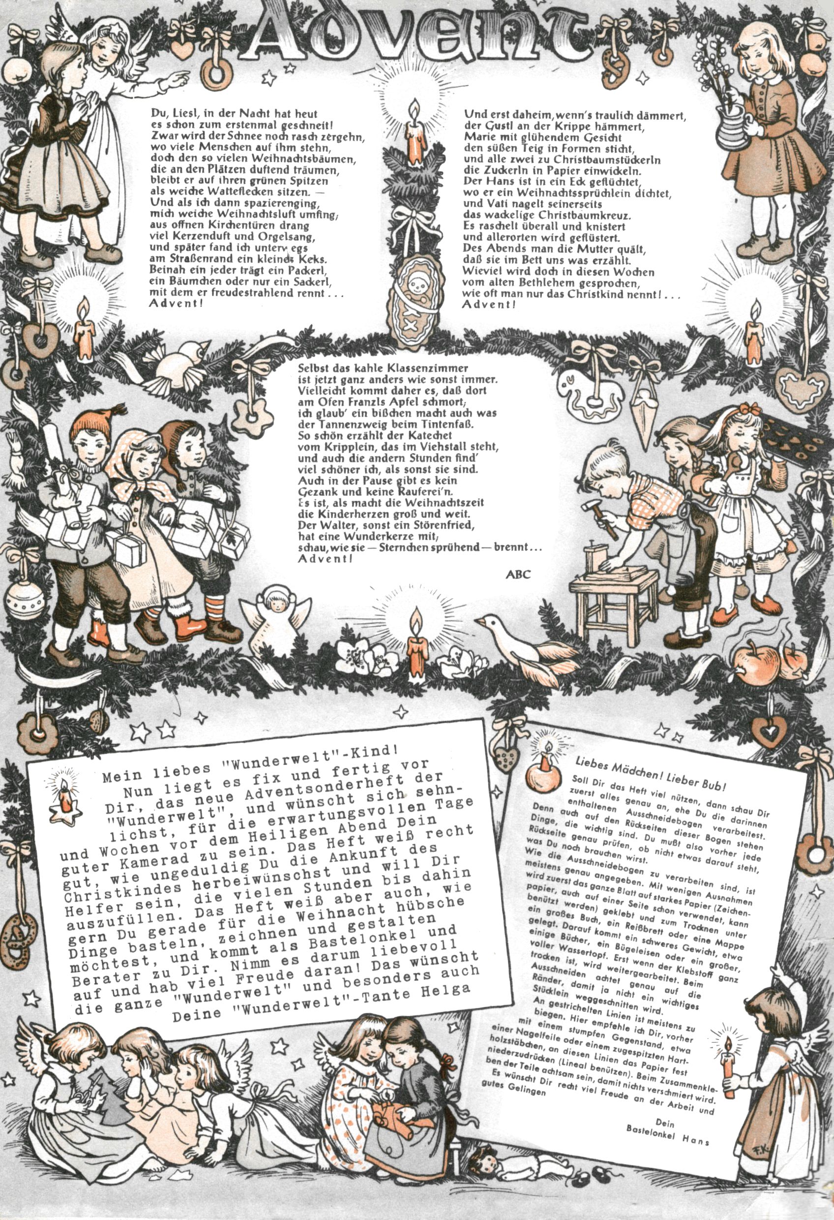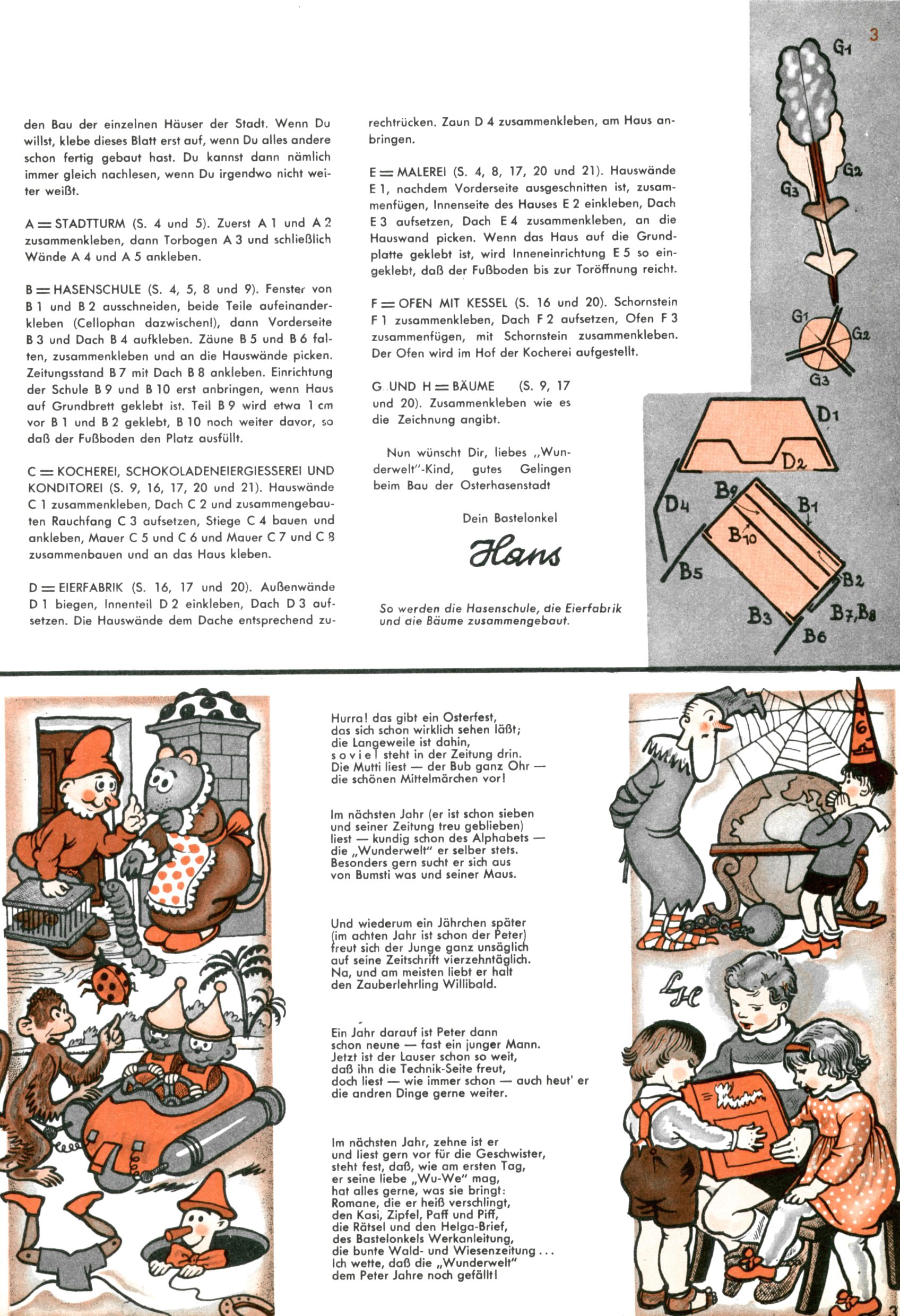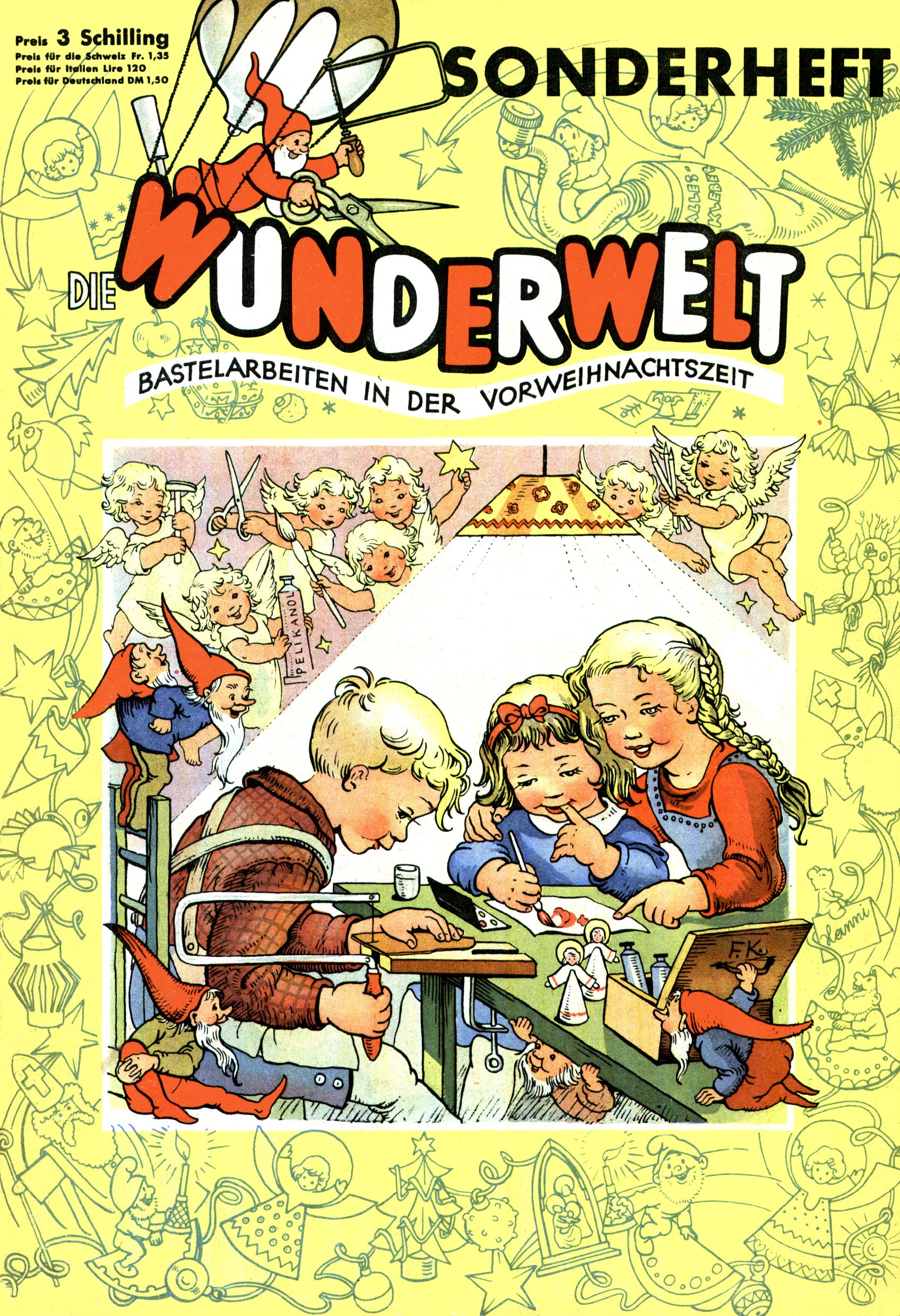 Die Wunderwelt im Festtagsgewand In den Sonderheften präsentierte sich die Wunderwelt wahrhaftig in Feiertagsstimmung. Mit wenigen Ausnahmen gab es pro Jahr drei Sonderhefte - zu Weihnachten bzw. im Advent, zu Ostern und in den Ferien im Sommer. Experimente mit Faschings- und Muttertagsheften hatten sich nicht bewährt. Selbst als es die Einzelhefte in der Krisensituation nach 1967 nicht mehr gab, wurde die Wunderwelt-Zeitung im Layout der Sonderhefte fortgesetzt: Zunächst mit 3 bis 5 und ab 1971 immerhin wieder mit 10-12 Heften pro Jahr. Die Weihnachts-, Oster- und Ferienhefte hatten naturgemäß verschiedene Schwerpunkte. Während im Sommer Spielen und Werken mit Material im Vordergrund stand, waren es zu Weihnachten Krippen und Adventhäuser; zu Ostern dann Erzählungen, Hasenstädte und Oster-Basteleien. Das bessere Papier der Sonderhefte erleichterte das Ausschneiden der insgesamt mehr als 1000 Papiermodelle erheblich. Die Sonderhefte waren vergleichsweise aufwändig gestaltet, aber auch ein wichtiges Zusatzgeschäft für die Zeitung. Die Kinder fieberten dem Erscheinungsdatum der jeweiligen Ausgabe nicht selten richtiggehend entgegen. Mit knapp 100 Seiten pro Jahr machten die Sonderhefte von der Menge her zwar nicht einmal ein Viertel aus, trugen aber zum Erscheinungsbild mindestens genauso viel bei wie die Standardhefte. Im Wesentlichen blieb das Layout der Sonderhefte über die Jahre hin unverändert. Mühselig wurde es, als man den Inhalt der Beiträge vorübergehend auf die Seiten gleichmäßig verteilte und die Kinder ermunterte, die Hefte in der Mitte zu zerschneiden. Die eine Hälfte enthielt dann etwa Erzählungen und Bastelvorschläge, der andere Teil der Zeitung Spielanleitungen. Zur übersichtlichkeit trugen diese Layoutversuche jedenfalls in keiner Weise bei und als besonderen Auswuchs gab es eine Zeitlang auf einer Seite oft mehrere Seitennummern, je nachdem, ob sich diese auf das Gesamtheft oder den herauszunehmenden und zu zerschneidenden Heftteil bezogen. Gegen Ende der 1950er Jahre kehrte man wieder zu einem ganzseitigen Layout zurück und Ideen wie ein Spiel-(Heft-im-)Heft gehörten der Vergangenheit an. In den Sonderheften experimentierte man dann noch ab Mitte der 1960er Jahre, als die Verkaufszahlen stark rückläufig waren, mit grundsätzlich neuen Darstellungsformen - weg vom Niedlich-Kitschigen und engagierte neue Grafikerinnen wie Gundi Groh und Hella Soyka. Den erhofften Erfolg brachte dies jedoch nicht mehr. |