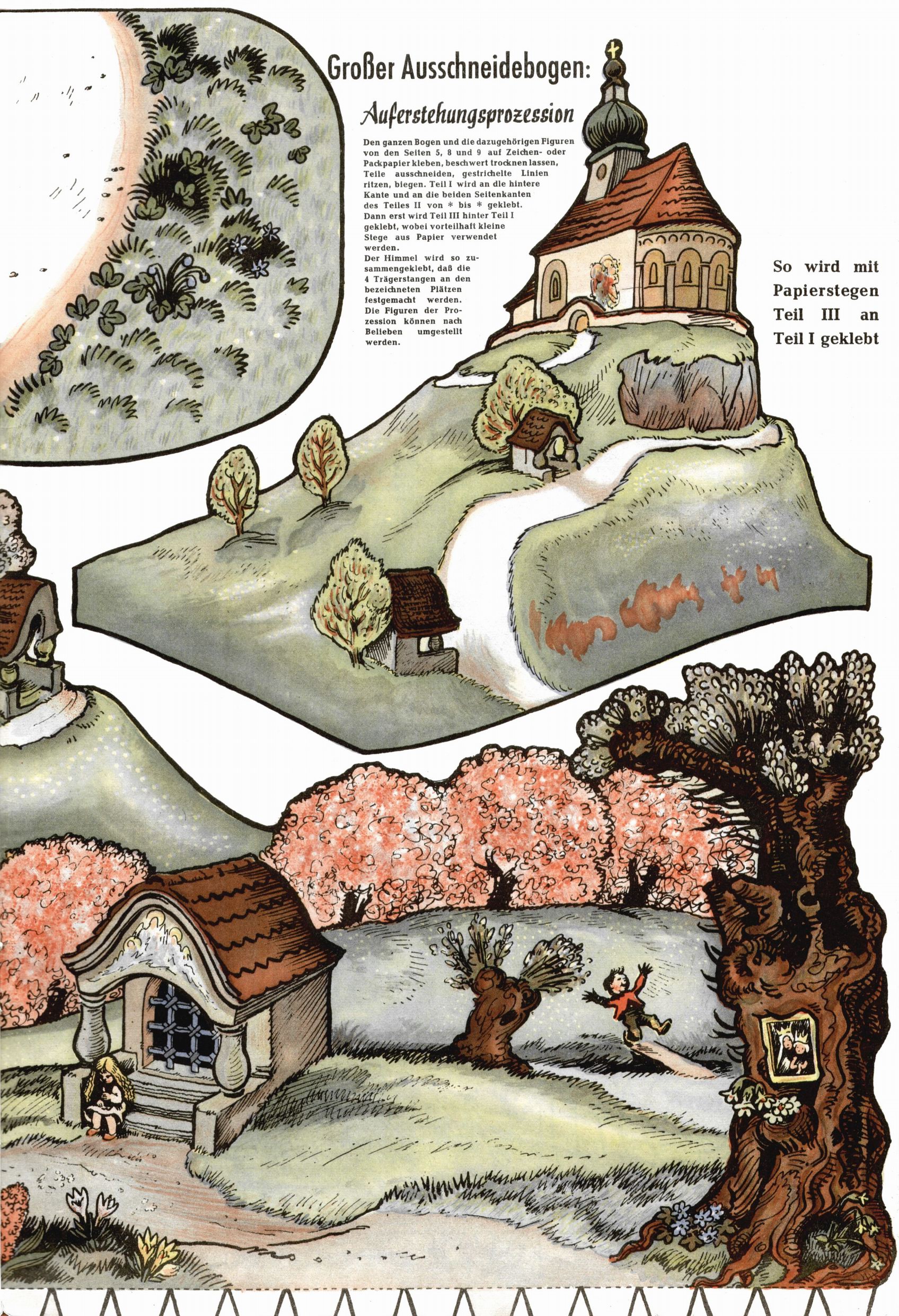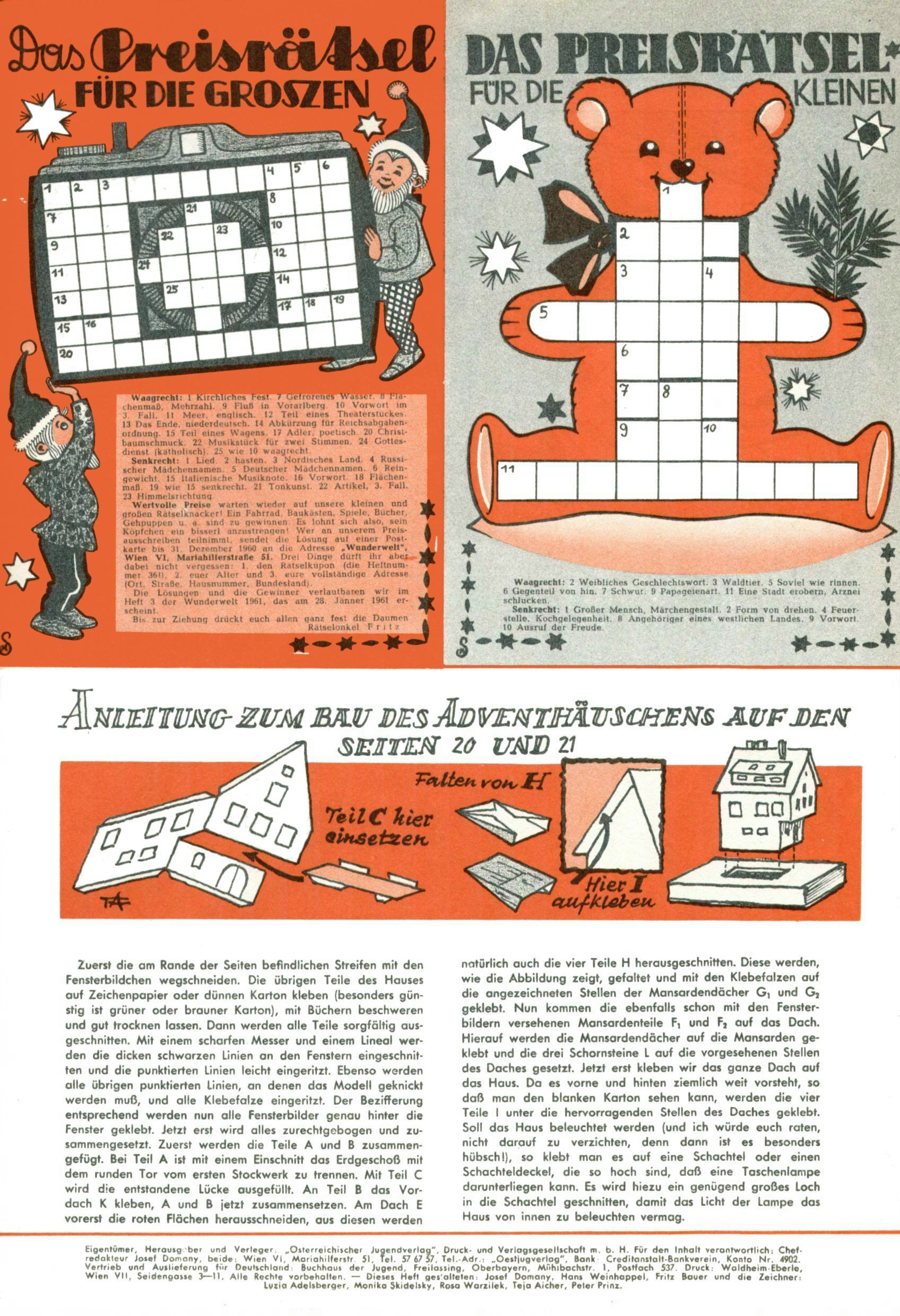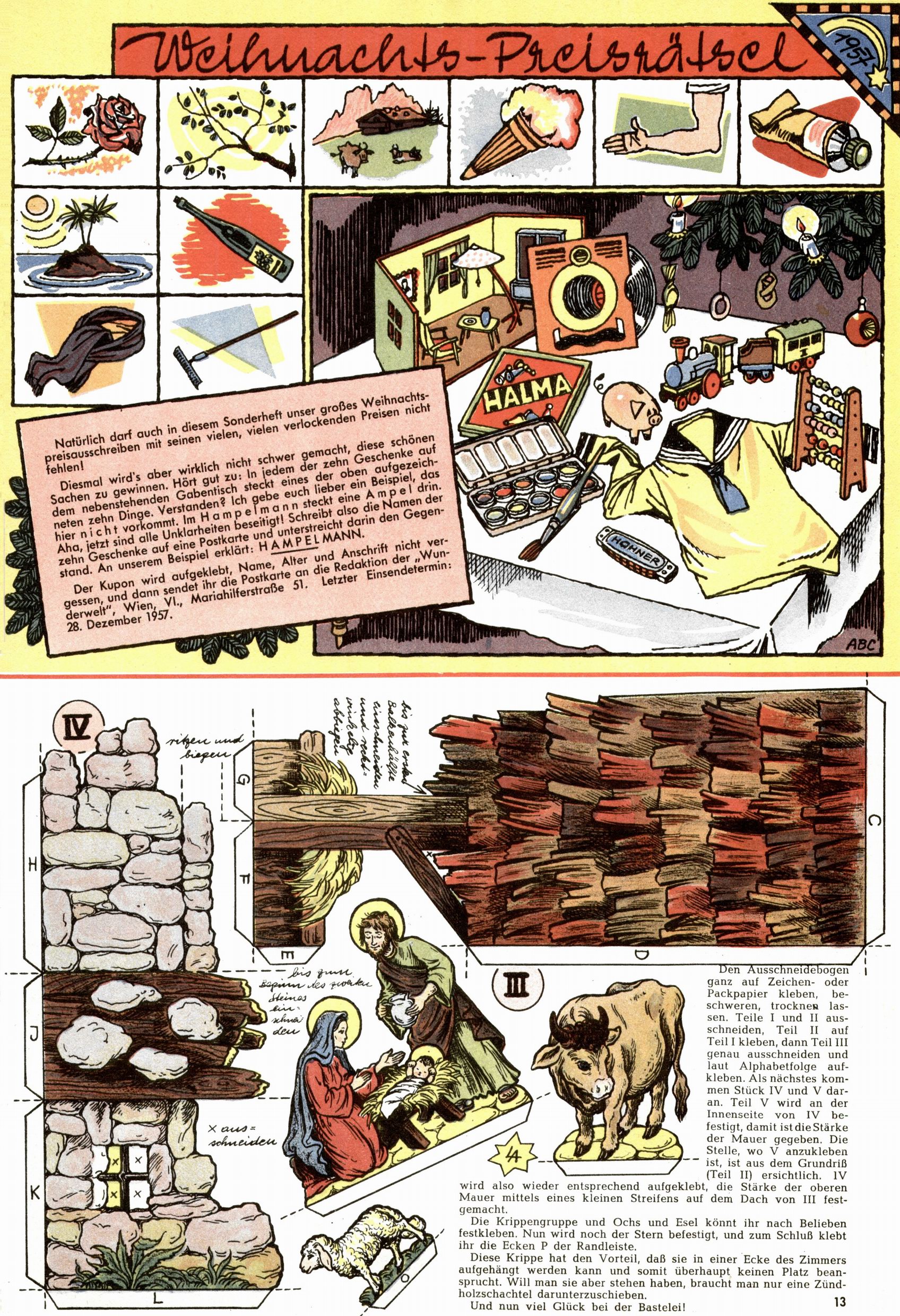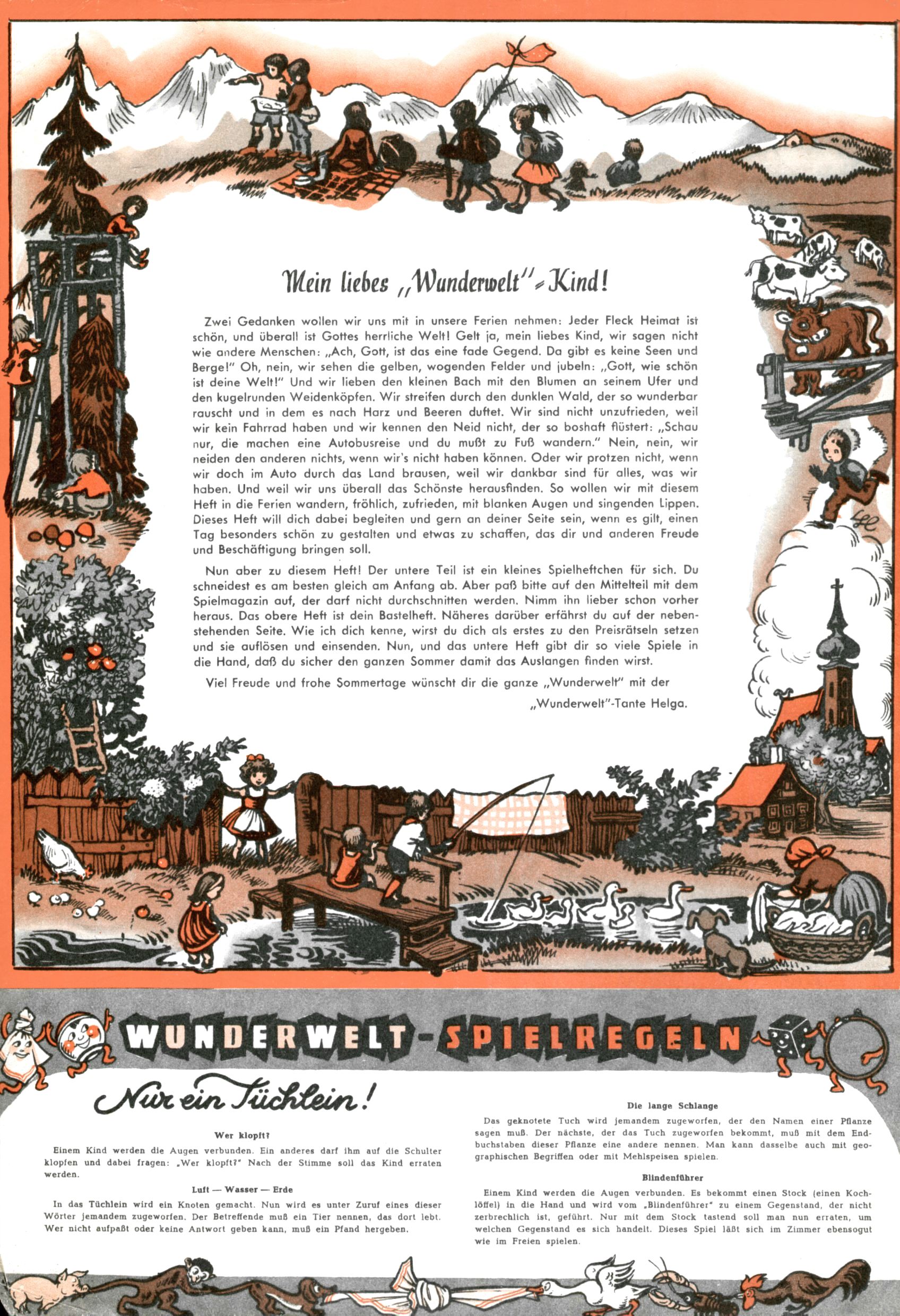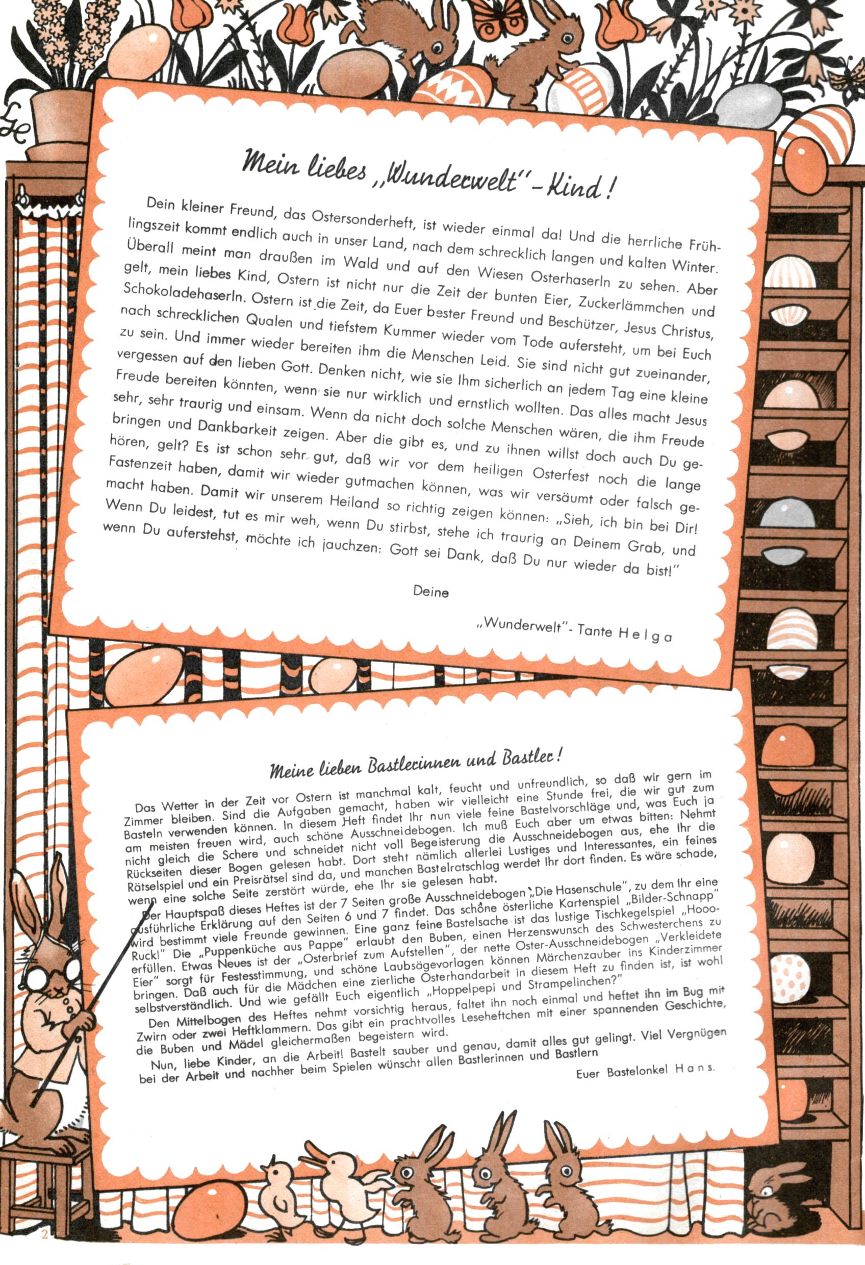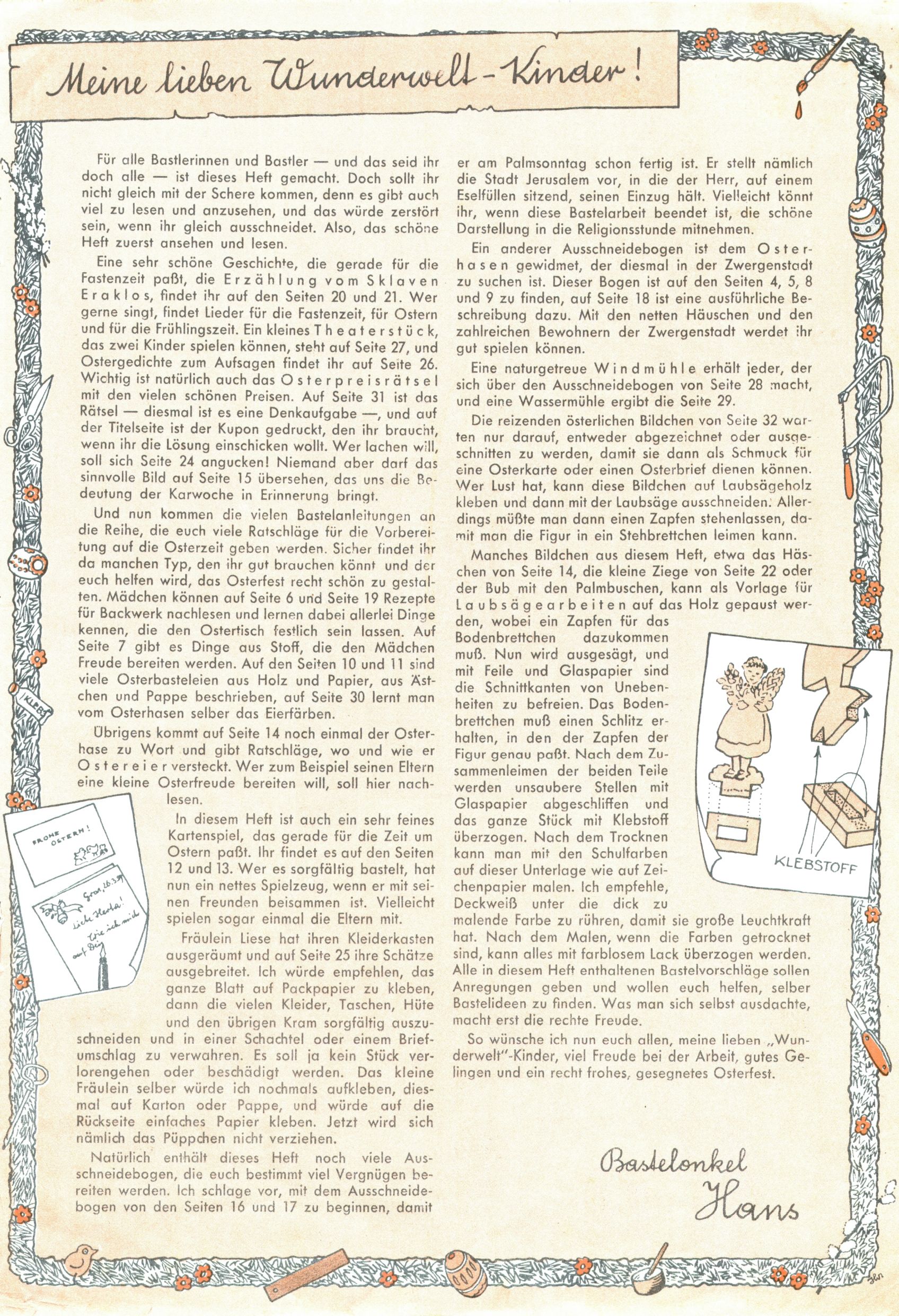 Die Wunderwelt im Festtagsgewand In den Sonderheften präsentierte sich die Wunderwelt wahrhaftig in Feiertagsstimmung. Mit wenigen Ausnahmen gab es pro Jahr drei Sonderhefte - zu Weihnachten bzw. im Advent, zu Ostern und in den Ferien im Sommer. Experimente mit Faschings- und Muttertagsheften hatten sich nicht bewährt. Selbst als es die Einzelhefte in der Krisensituation nach 1967 nicht mehr gab, wurde die Wunderwelt-Zeitung im Layout der Sonderhefte fortgesetzt: Zunächst mit 3 bis 5 und ab 1971 immerhin wieder mit 10-12 Heften pro Jahr. Die Weihnachts-, Oster- und Ferienhefte hatten naturgemäß verschiedene Schwerpunkte. Während im Sommer Spielen und Werken mit Material im Vordergrund stand, waren es zu Weihnachten Krippen und Adventhäuser; zu Ostern dann Erzählungen, Hasenstädte und Oster-Basteleien. Das bessere Papier der Sonderhefte erleichterte das Ausschneiden der insgesamt mehr als 1000 Papiermodelle erheblich. Die Sonderhefte waren vergleichsweise aufwändig gestaltet, aber auch ein wichtiges Zusatzgeschäft für die Zeitung. Die Kinder fieberten dem Erscheinungsdatum der jeweiligen Ausgabe nicht selten richtiggehend entgegen. Mit knapp 100 Seiten pro Jahr machten die Sonderhefte von der Menge her zwar nicht einmal ein Viertel aus, trugen aber zum Erscheinungsbild mindestens genauso viel bei wie die Standardhefte. Im Wesentlichen blieb das Layout der Sonderhefte über die Jahre hin unverändert. Mühselig wurde es, als man den Inhalt der Beiträge vorübergehend auf die Seiten gleichmäßig verteilte und die Kinder ermunterte, die Hefte in der Mitte zu zerschneiden. Die eine Hälfte enthielt dann etwa Erzählungen und Bastelvorschläge, der andere Teil der Zeitung Spielanleitungen. Zur übersichtlichkeit trugen diese Layoutversuche jedenfalls in keiner Weise bei und als besonderen Auswuchs gab es eine Zeitlang auf einer Seite oft mehrere Seitennummern, je nachdem, ob sich diese auf das Gesamtheft oder den herauszunehmenden und zu zerschneidenden Heftteil bezogen. Gegen Ende der 1950er Jahre kehrte man wieder zu einem ganzseitigen Layout zurück und Ideen wie ein Spiel-(Heft-im-)Heft gehörten der Vergangenheit an. In den Sonderheften experimentierte man dann noch ab Mitte der 1960er Jahre, als die Verkaufszahlen stark rückläufig waren, mit grundsätzlich neuen Darstellungsformen - weg vom Niedlich-Kitschigen und engagierte neue Grafikerinnen wie Gundi Groh und Hella Soyka. Den erhofften Erfolg brachte dies jedoch nicht mehr. |