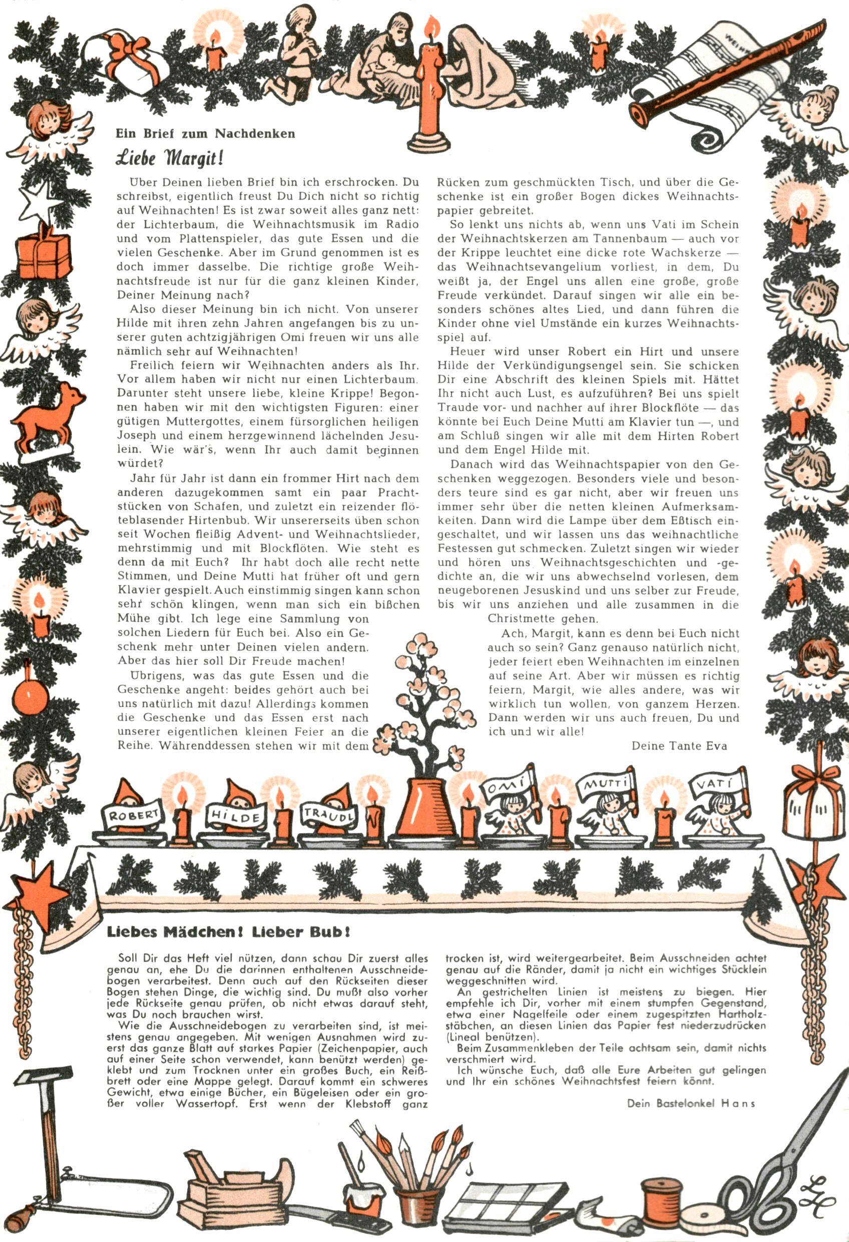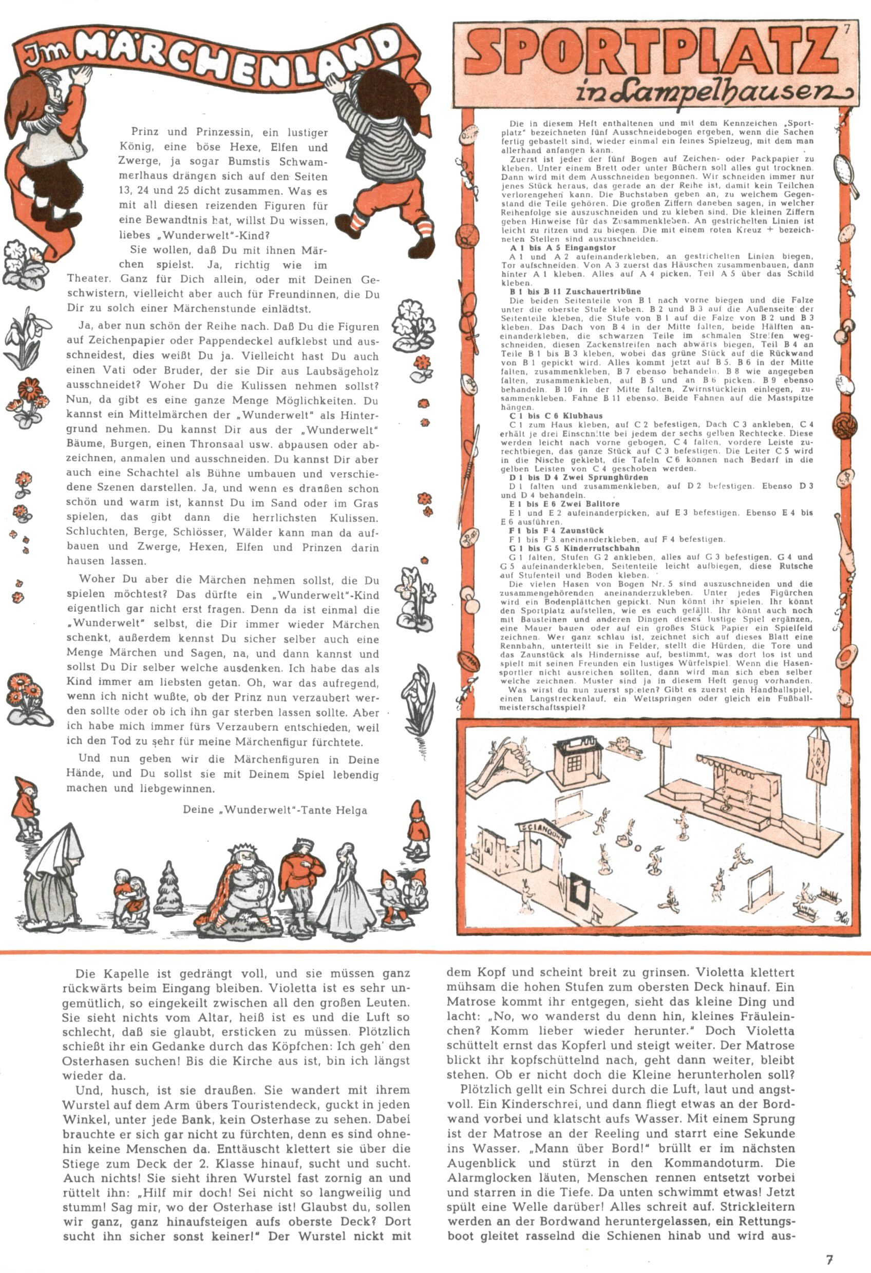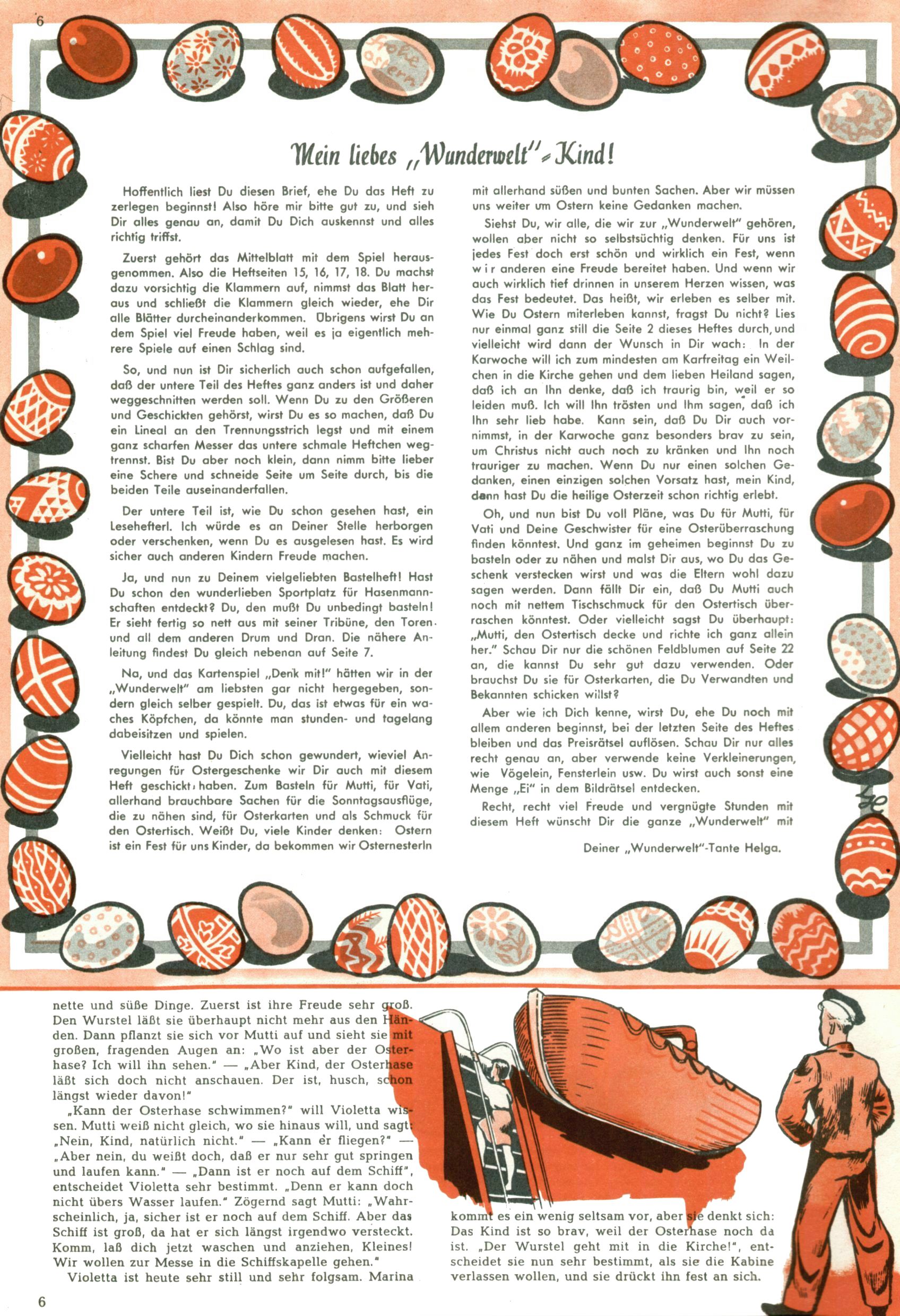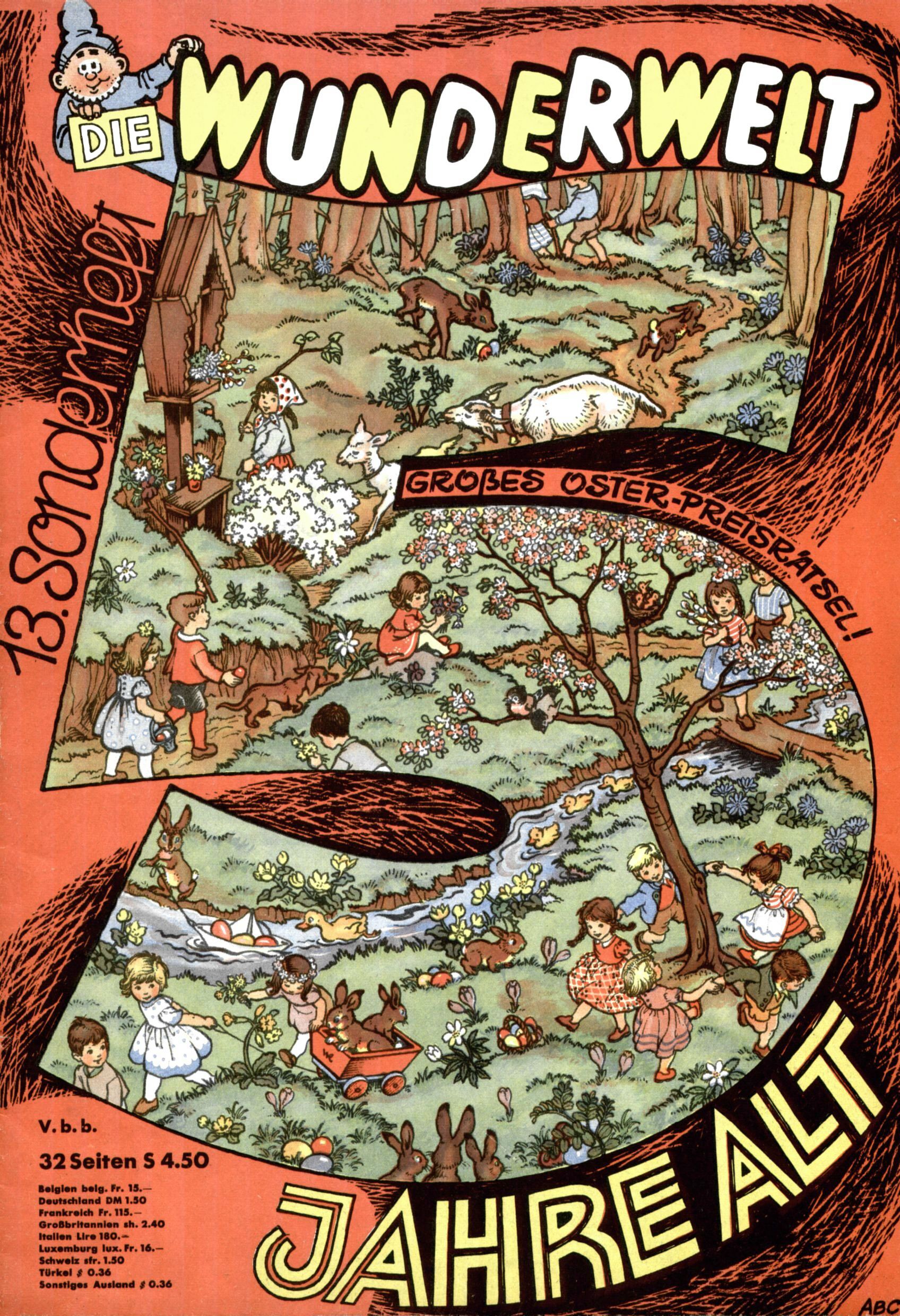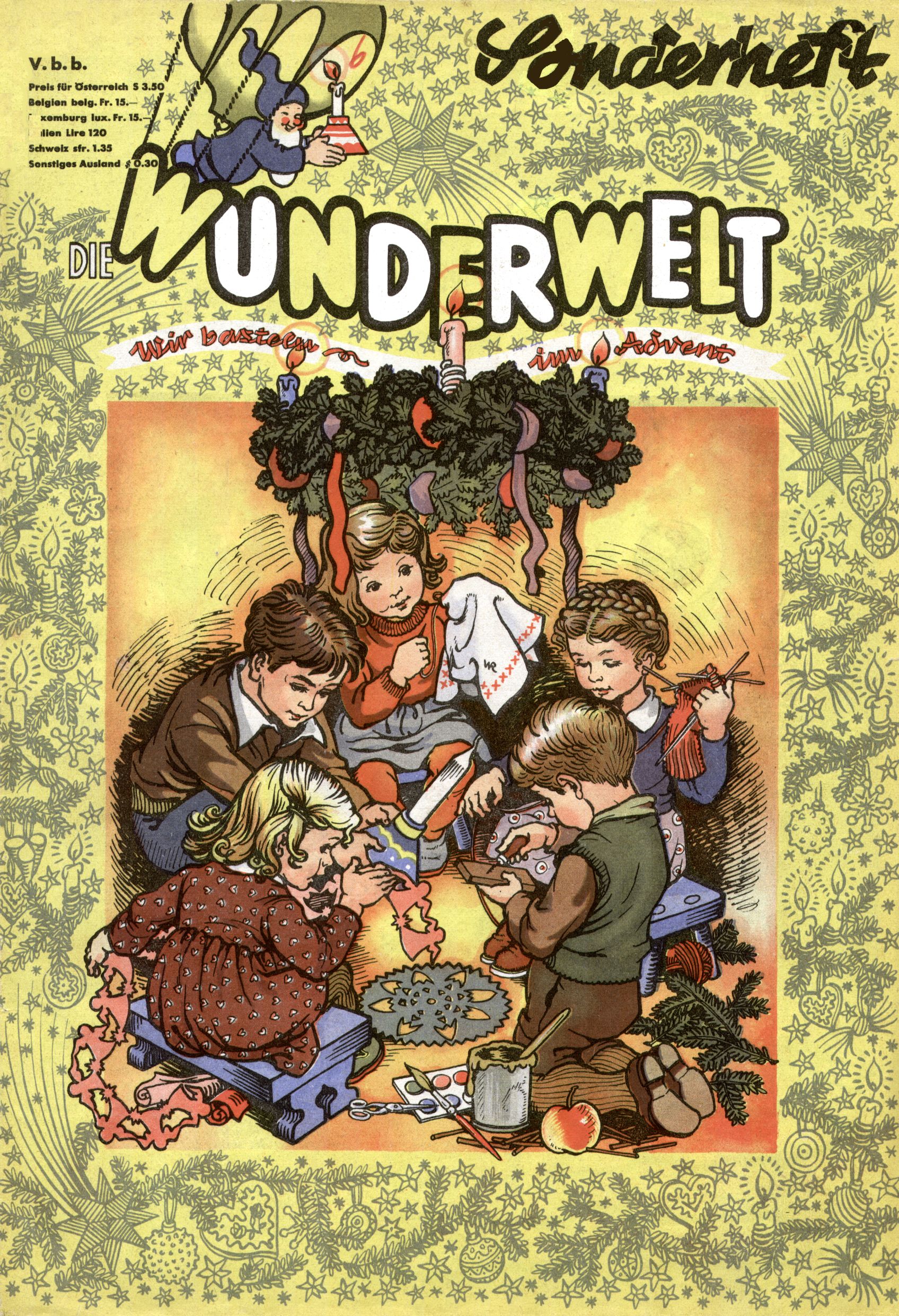 Die Wunderwelt im Festtagsgewand In den Sonderheften präsentierte sich die Wunderwelt wahrhaftig in Feiertagsstimmung. Mit wenigen Ausnahmen gab es pro Jahr drei Sonderhefte - zu Weihnachten bzw. im Advent, zu Ostern und in den Ferien im Sommer. Experimente mit Faschings- und Muttertagsheften hatten sich nicht bewährt. Selbst als es die Einzelhefte in der Krisensituation nach 1967 nicht mehr gab, wurde die Wunderwelt-Zeitung im Layout der Sonderhefte fortgesetzt: Zunächst mit 3 bis 5 und ab 1971 immerhin wieder mit 10-12 Heften pro Jahr. Die Weihnachts-, Oster- und Ferienhefte hatten naturgemäß verschiedene Schwerpunkte. Während im Sommer Spielen und Werken mit Material im Vordergrund stand, waren es zu Weihnachten Krippen und Adventhäuser; zu Ostern dann Erzählungen, Hasenstädte und Oster-Basteleien. Das bessere Papier der Sonderhefte erleichterte das Ausschneiden der insgesamt mehr als 1000 Papiermodelle erheblich. Die Sonderhefte waren vergleichsweise aufwändig gestaltet, aber auch ein wichtiges Zusatzgeschäft für die Zeitung. Die Kinder fieberten dem Erscheinungsdatum der jeweiligen Ausgabe nicht selten richtiggehend entgegen. Mit knapp 100 Seiten pro Jahr machten die Sonderhefte von der Menge her zwar nicht einmal ein Viertel aus, trugen aber zum Erscheinungsbild mindestens genauso viel bei wie die Standardhefte. Im Wesentlichen blieb das Layout der Sonderhefte über die Jahre hin unverändert. Mühselig wurde es, als man den Inhalt der Beiträge vorübergehend auf die Seiten gleichmäßig verteilte und die Kinder ermunterte, die Hefte in der Mitte zu zerschneiden. Die eine Hälfte enthielt dann etwa Erzählungen und Bastelvorschläge, der andere Teil der Zeitung Spielanleitungen. Zur übersichtlichkeit trugen diese Layoutversuche jedenfalls in keiner Weise bei und als besonderen Auswuchs gab es eine Zeitlang auf einer Seite oft mehrere Seitennummern, je nachdem, ob sich diese auf das Gesamtheft oder den herauszunehmenden und zu zerschneidenden Heftteil bezogen. Gegen Ende der 1950er Jahre kehrte man wieder zu einem ganzseitigen Layout zurück und Ideen wie ein Spiel-(Heft-im-)Heft gehörten der Vergangenheit an. In den Sonderheften experimentierte man dann noch ab Mitte der 1960er Jahre, als die Verkaufszahlen stark rückläufig waren, mit grundsätzlich neuen Darstellungsformen - weg vom Niedlich-Kitschigen und engagierte neue Grafikerinnen wie Gundi Groh und Hella Soyka. Den erhofften Erfolg brachte dies jedoch nicht mehr. |
