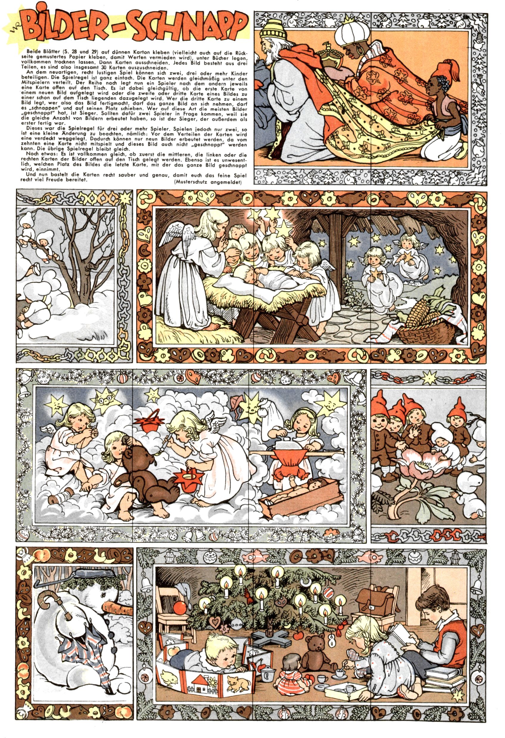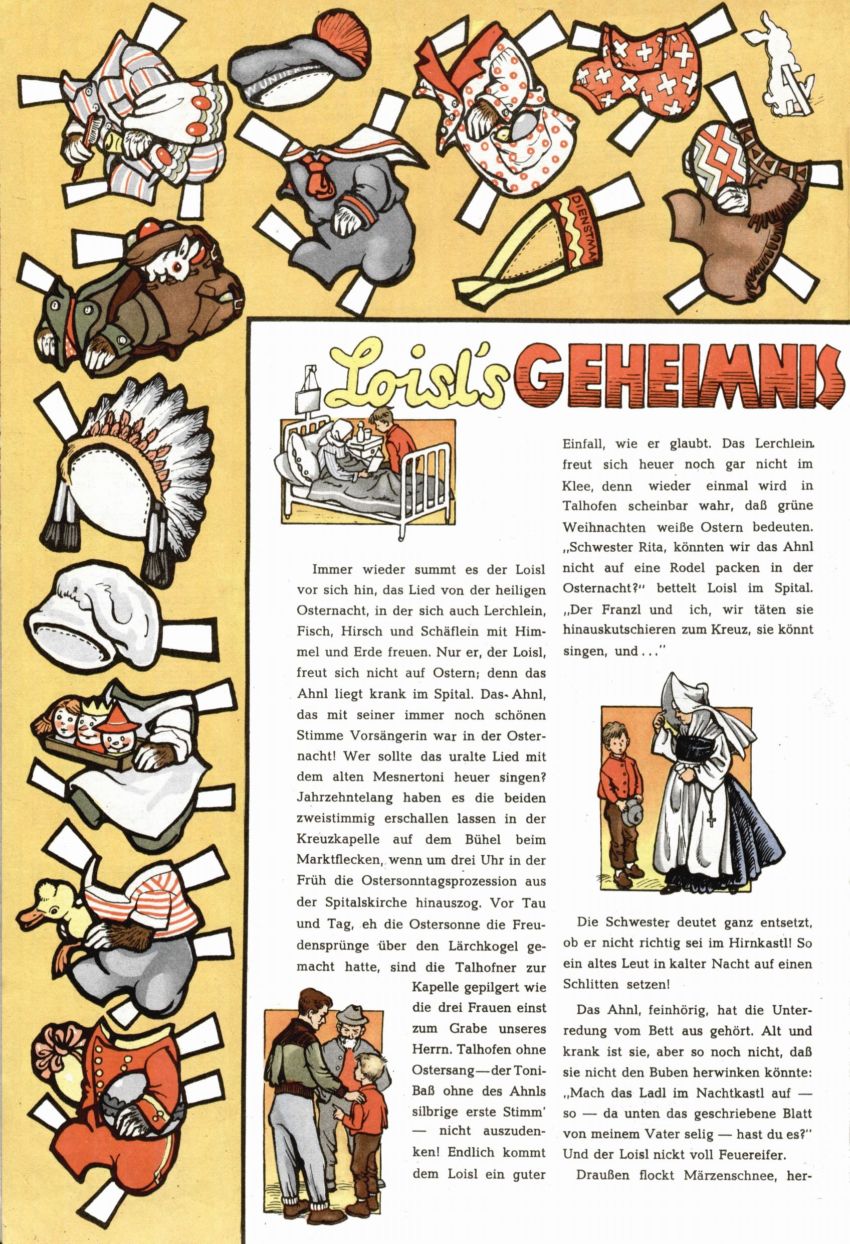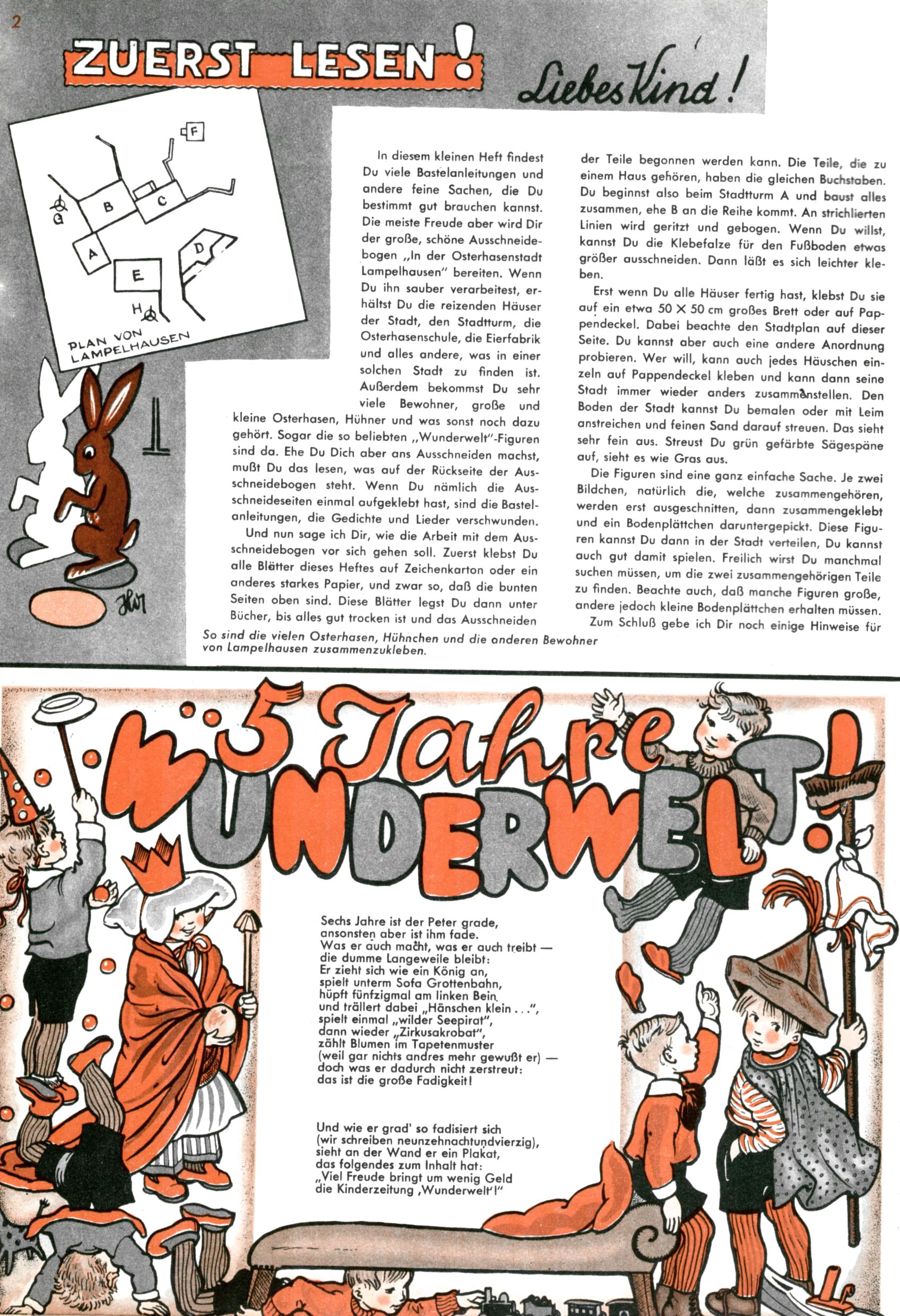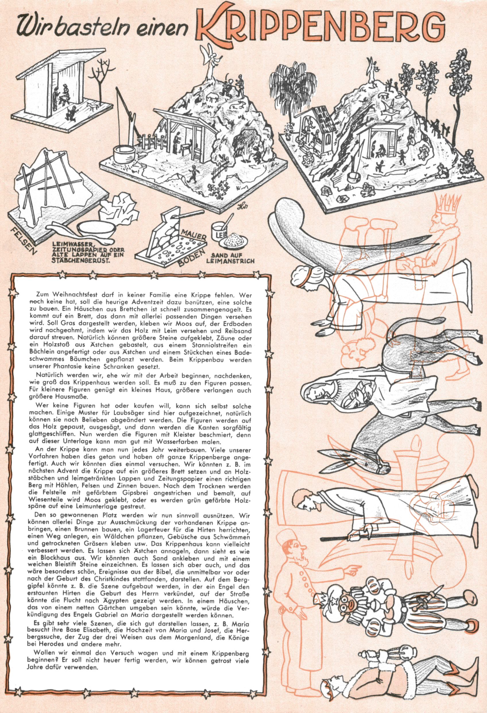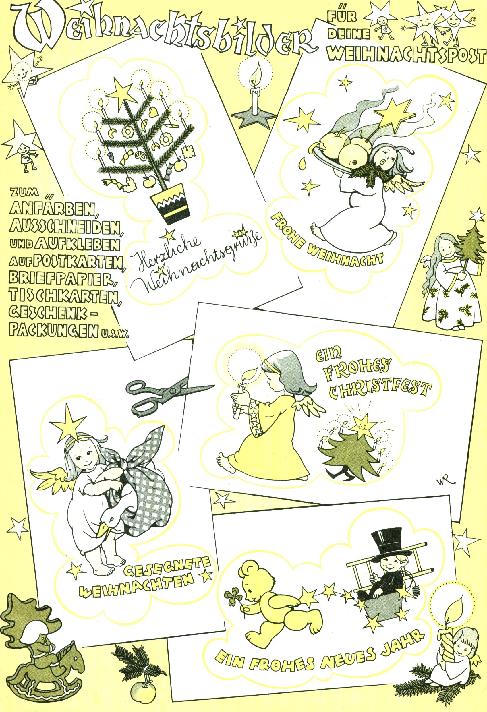 Die Wunderwelt im Festtagsgewand In den Sonderheften präsentierte sich die Wunderwelt wahrhaftig in Feiertagsstimmung. Mit wenigen Ausnahmen gab es pro Jahr drei Sonderhefte - zu Weihnachten bzw. im Advent, zu Ostern und in den Ferien im Sommer. Experimente mit Faschings- und Muttertagsheften hatten sich nicht bewährt. Selbst als es die Einzelhefte in der Krisensituation nach 1967 nicht mehr gab, wurde die Wunderwelt-Zeitung im Layout der Sonderhefte fortgesetzt: Zunächst mit 3 bis 5 und ab 1971 immerhin wieder mit 10-12 Heften pro Jahr. Die Weihnachts-, Oster- und Ferienhefte hatten naturgemäß verschiedene Schwerpunkte. Während im Sommer Spielen und Werken mit Material im Vordergrund stand, waren es zu Weihnachten Krippen und Adventhäuser; zu Ostern dann Erzählungen, Hasenstädte und Oster-Basteleien. Das bessere Papier der Sonderhefte erleichterte das Ausschneiden der insgesamt mehr als 1000 Papiermodelle erheblich. Die Sonderhefte waren vergleichsweise aufwändig gestaltet, aber auch ein wichtiges Zusatzgeschäft für die Zeitung. Die Kinder fieberten dem Erscheinungsdatum der jeweiligen Ausgabe nicht selten richtiggehend entgegen. Mit knapp 100 Seiten pro Jahr machten die Sonderhefte von der Menge her zwar nicht einmal ein Viertel aus, trugen aber zum Erscheinungsbild mindestens genauso viel bei wie die Standardhefte. Im Wesentlichen blieb das Layout der Sonderhefte über die Jahre hin unverändert. Mühselig wurde es, als man den Inhalt der Beiträge vorübergehend auf die Seiten gleichmäßig verteilte und die Kinder ermunterte, die Hefte in der Mitte zu zerschneiden. Die eine Hälfte enthielt dann etwa Erzählungen und Bastelvorschläge, der andere Teil der Zeitung Spielanleitungen. Zur übersichtlichkeit trugen diese Layoutversuche jedenfalls in keiner Weise bei und als besonderen Auswuchs gab es eine Zeitlang auf einer Seite oft mehrere Seitennummern, je nachdem, ob sich diese auf das Gesamtheft oder den herauszunehmenden und zu zerschneidenden Heftteil bezogen. Gegen Ende der 1950er Jahre kehrte man wieder zu einem ganzseitigen Layout zurück und Ideen wie ein Spiel-(Heft-im-)Heft gehörten der Vergangenheit an. In den Sonderheften experimentierte man dann noch ab Mitte der 1960er Jahre, als die Verkaufszahlen stark rückläufig waren, mit grundsätzlich neuen Darstellungsformen - weg vom Niedlich-Kitschigen und engagierte neue Grafikerinnen wie Gundi Groh und Hella Soyka. Den erhofften Erfolg brachte dies jedoch nicht mehr. |