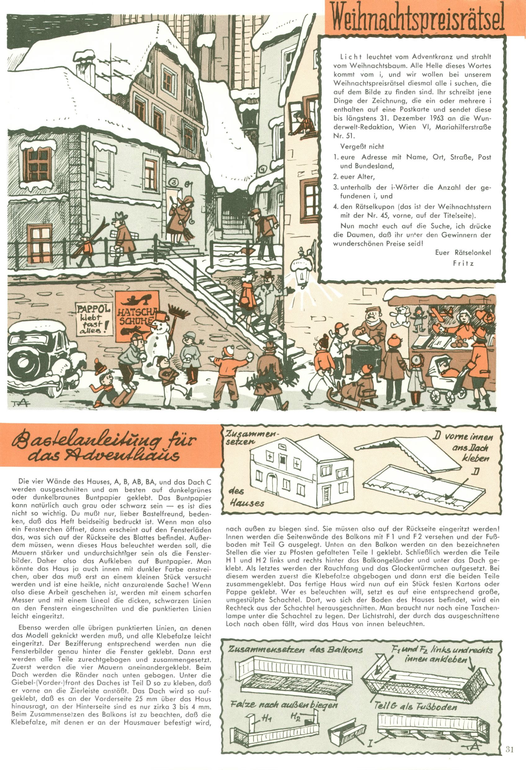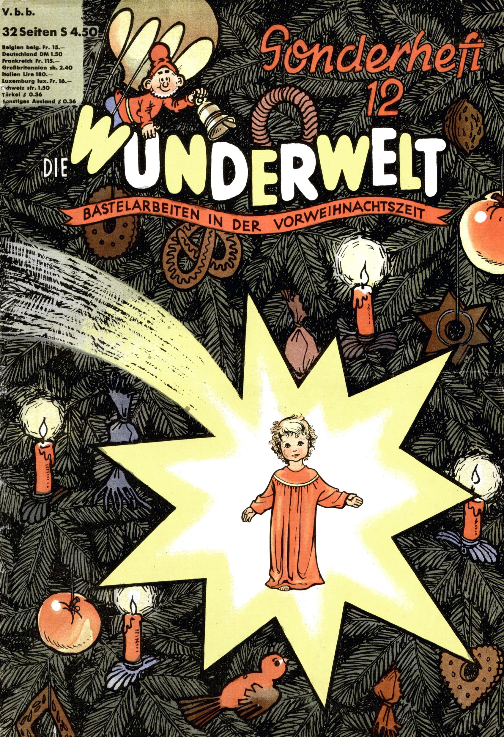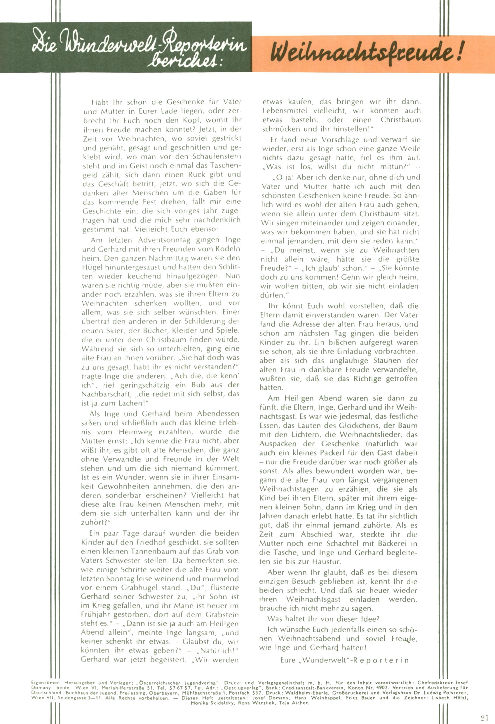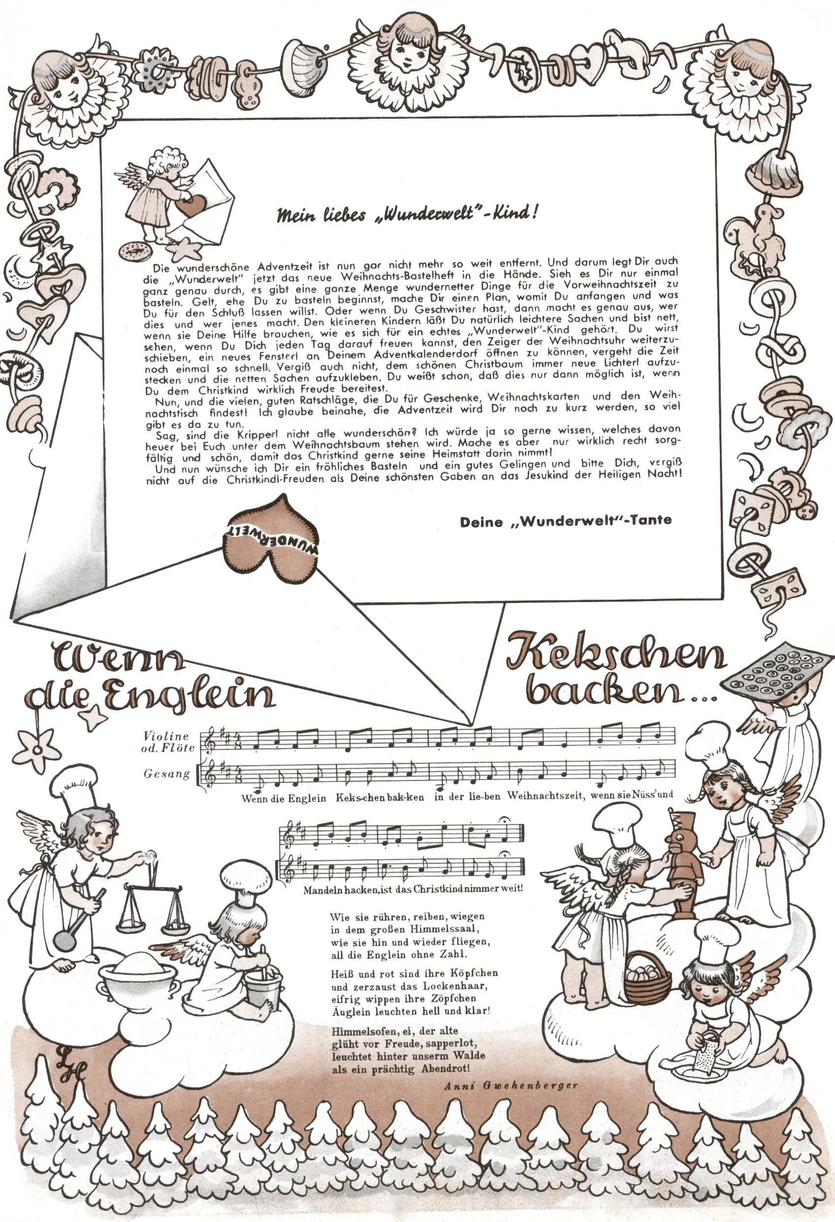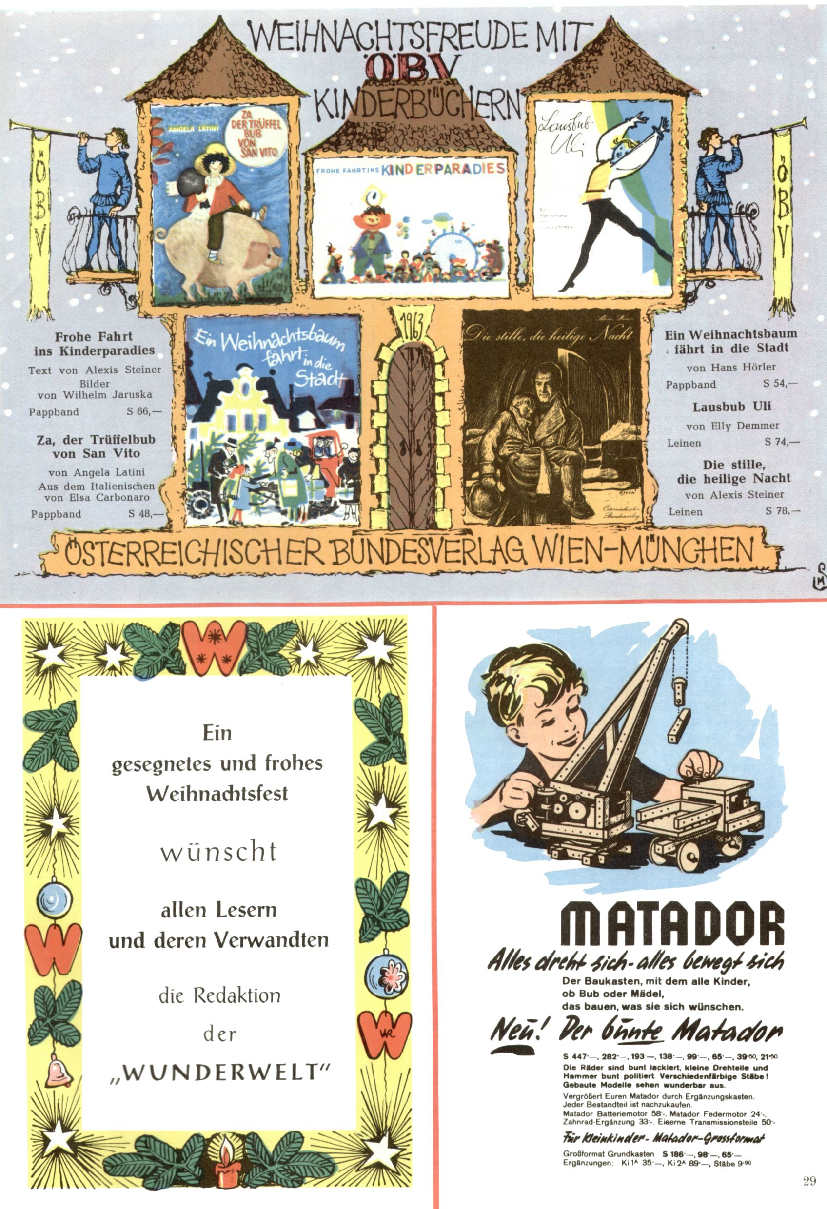 Die Wunderwelt im Festtagsgewand In den Sonderheften präsentierte sich die Wunderwelt wahrhaftig in Feiertagsstimmung. Mit wenigen Ausnahmen gab es pro Jahr drei Sonderhefte - zu Weihnachten bzw. im Advent, zu Ostern und in den Ferien im Sommer. Experimente mit Faschings- und Muttertagsheften hatten sich nicht bewährt. Selbst als es die Einzelhefte in der Krisensituation nach 1967 nicht mehr gab, wurde die Wunderwelt-Zeitung im Layout der Sonderhefte fortgesetzt: Zunächst mit 3 bis 5 und ab 1971 immerhin wieder mit 10-12 Heften pro Jahr. Die Weihnachts-, Oster- und Ferienhefte hatten naturgemäß verschiedene Schwerpunkte. Während im Sommer Spielen und Werken mit Material im Vordergrund stand, waren es zu Weihnachten Krippen und Adventhäuser; zu Ostern dann Erzählungen, Hasenstädte und Oster-Basteleien. Das bessere Papier der Sonderhefte erleichterte das Ausschneiden der insgesamt mehr als 1000 Papiermodelle erheblich. Die Sonderhefte waren vergleichsweise aufwändig gestaltet, aber auch ein wichtiges Zusatzgeschäft für die Zeitung. Die Kinder fieberten dem Erscheinungsdatum der jeweiligen Ausgabe nicht selten richtiggehend entgegen. Mit knapp 100 Seiten pro Jahr machten die Sonderhefte von der Menge her zwar nicht einmal ein Viertel aus, trugen aber zum Erscheinungsbild mindestens genauso viel bei wie die Standardhefte. Im Wesentlichen blieb das Layout der Sonderhefte über die Jahre hin unverändert. Mühselig wurde es, als man den Inhalt der Beiträge vorübergehend auf die Seiten gleichmäßig verteilte und die Kinder ermunterte, die Hefte in der Mitte zu zerschneiden. Die eine Hälfte enthielt dann etwa Erzählungen und Bastelvorschläge, der andere Teil der Zeitung Spielanleitungen. Zur übersichtlichkeit trugen diese Layoutversuche jedenfalls in keiner Weise bei und als besonderen Auswuchs gab es eine Zeitlang auf einer Seite oft mehrere Seitennummern, je nachdem, ob sich diese auf das Gesamtheft oder den herauszunehmenden und zu zerschneidenden Heftteil bezogen. Gegen Ende der 1950er Jahre kehrte man wieder zu einem ganzseitigen Layout zurück und Ideen wie ein Spiel-(Heft-im-)Heft gehörten der Vergangenheit an. In den Sonderheften experimentierte man dann noch ab Mitte der 1960er Jahre, als die Verkaufszahlen stark rückläufig waren, mit grundsätzlich neuen Darstellungsformen - weg vom Niedlich-Kitschigen und engagierte neue Grafikerinnen wie Gundi Groh und Hella Soyka. Den erhofften Erfolg brachte dies jedoch nicht mehr. |