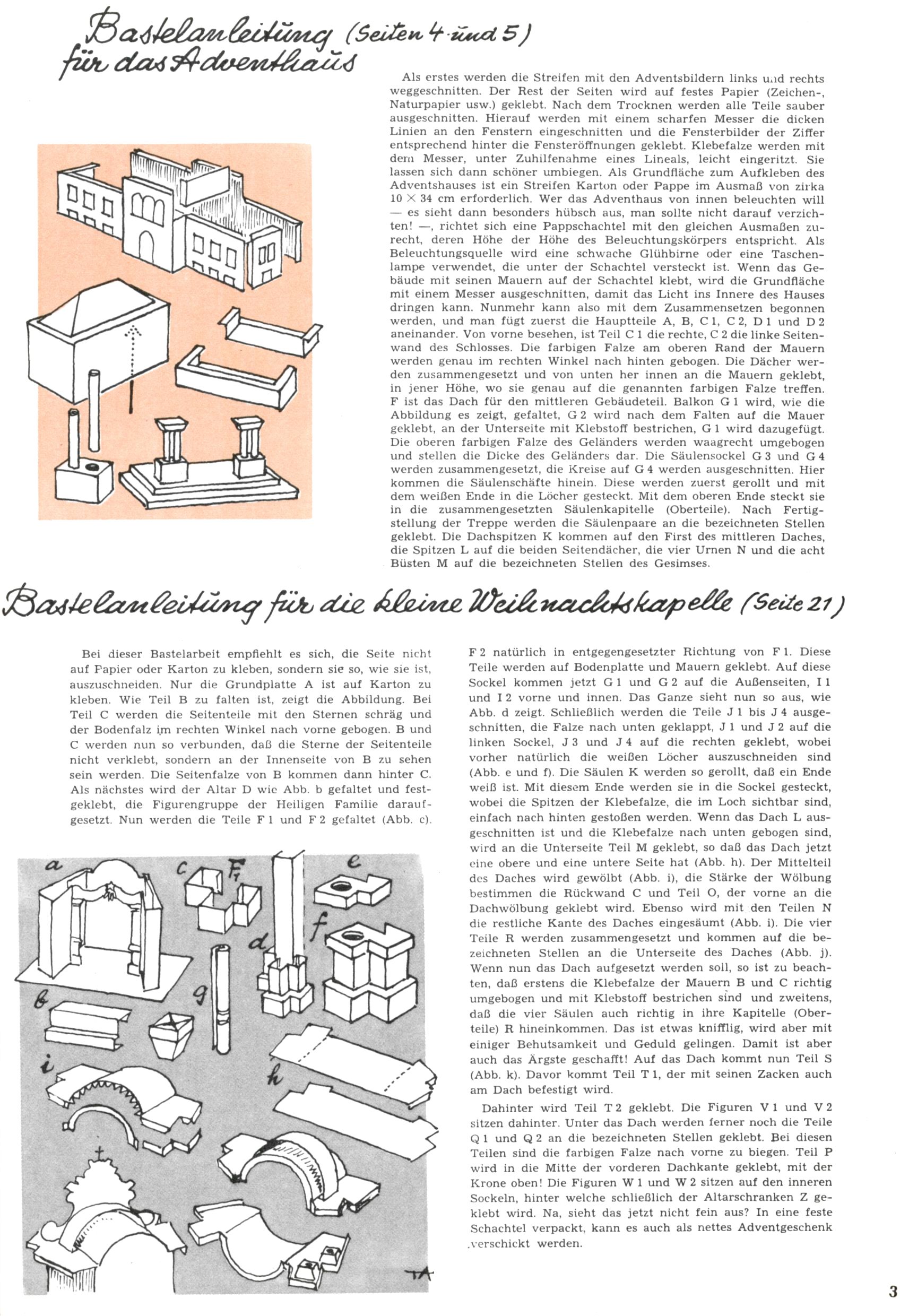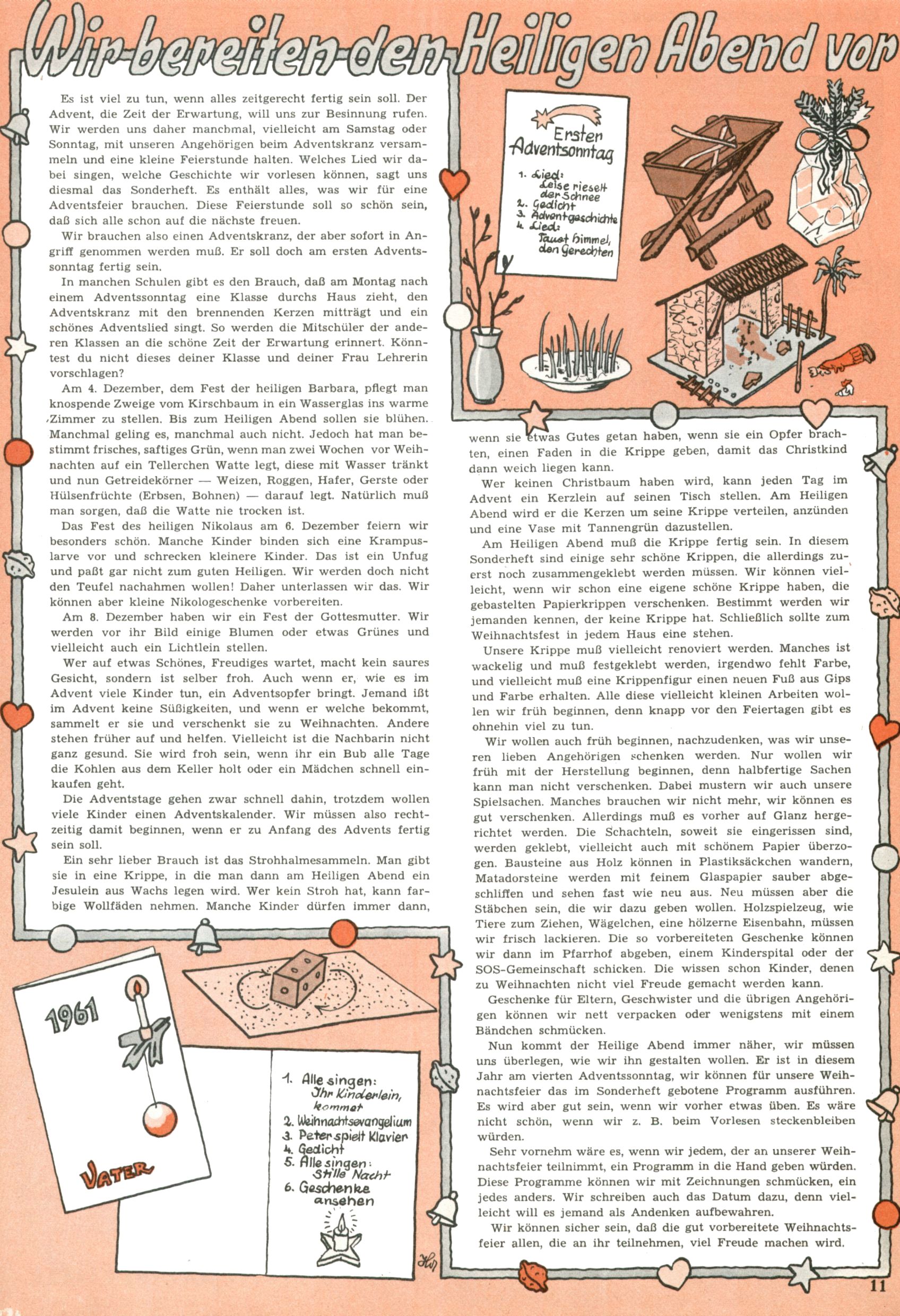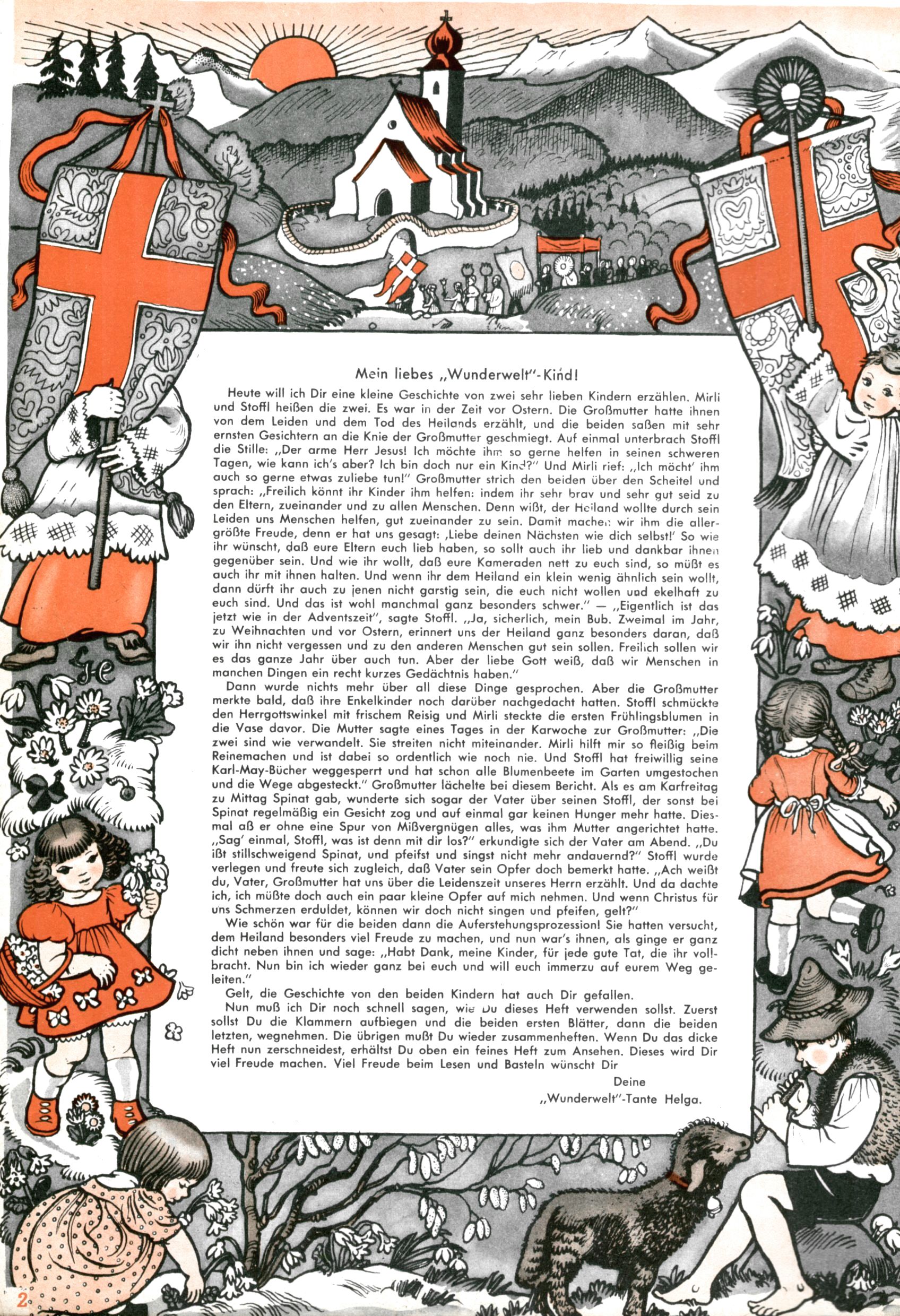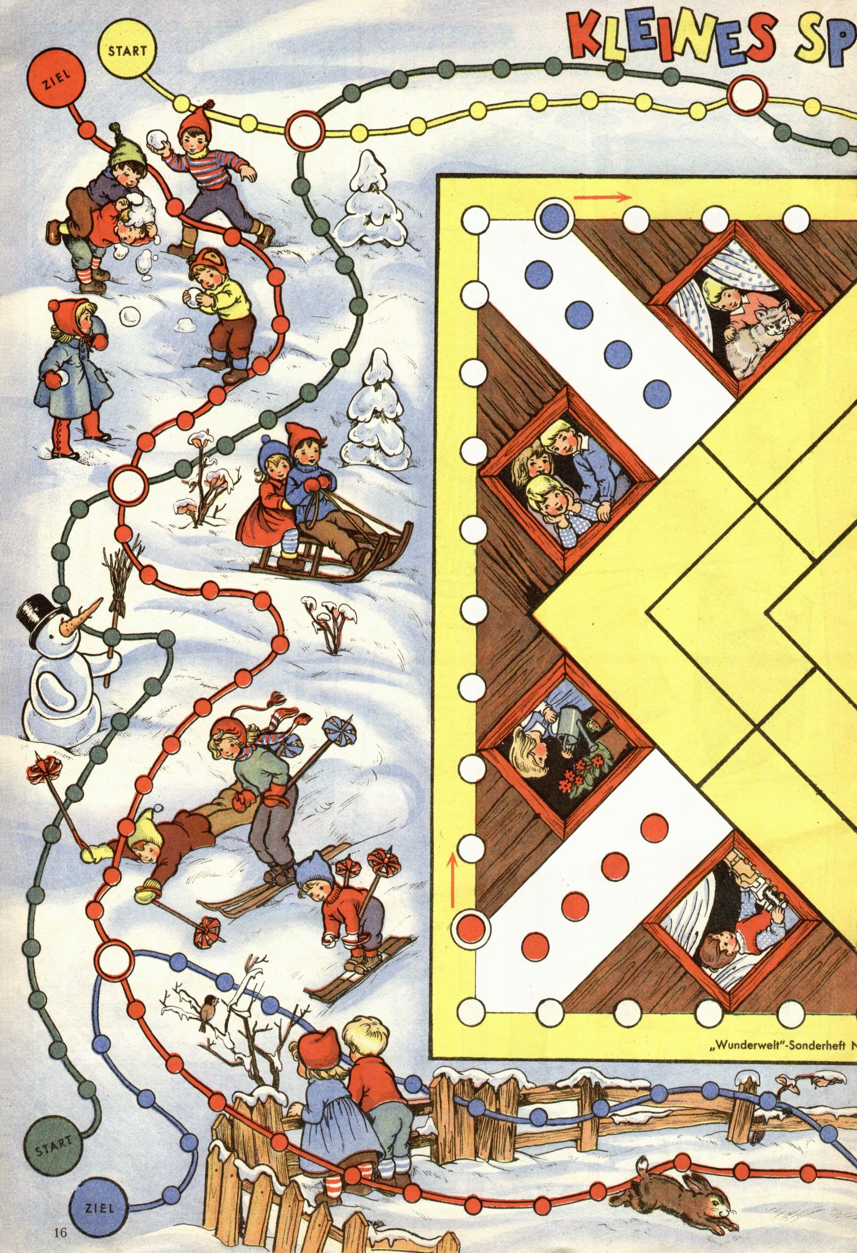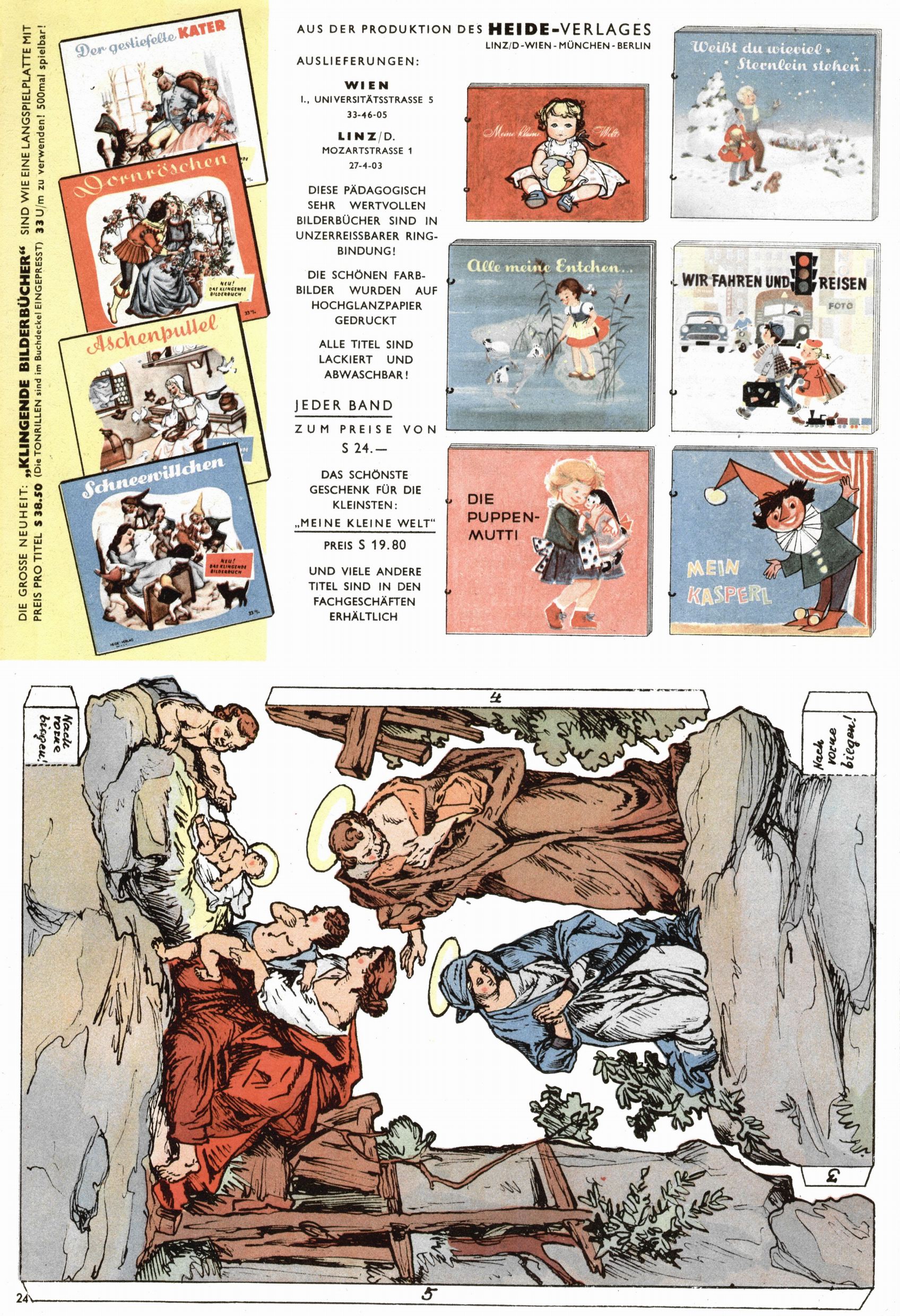 Die Wunderwelt im Festtagsgewand In den Sonderheften präsentierte sich die Wunderwelt wahrhaftig in Feiertagsstimmung. Mit wenigen Ausnahmen gab es pro Jahr drei Sonderhefte - zu Weihnachten bzw. im Advent, zu Ostern und in den Ferien im Sommer. Experimente mit Faschings- und Muttertagsheften hatten sich nicht bewährt. Selbst als es die Einzelhefte in der Krisensituation nach 1967 nicht mehr gab, wurde die Wunderwelt-Zeitung im Layout der Sonderhefte fortgesetzt: Zunächst mit 3 bis 5 und ab 1971 immerhin wieder mit 10-12 Heften pro Jahr. Die Weihnachts-, Oster- und Ferienhefte hatten naturgemäß verschiedene Schwerpunkte. Während im Sommer Spielen und Werken mit Material im Vordergrund stand, waren es zu Weihnachten Krippen und Adventhäuser; zu Ostern dann Erzählungen, Hasenstädte und Oster-Basteleien. Das bessere Papier der Sonderhefte erleichterte das Ausschneiden der insgesamt mehr als 1000 Papiermodelle erheblich. Die Sonderhefte waren vergleichsweise aufwändig gestaltet, aber auch ein wichtiges Zusatzgeschäft für die Zeitung. Die Kinder fieberten dem Erscheinungsdatum der jeweiligen Ausgabe nicht selten richtiggehend entgegen. Mit knapp 100 Seiten pro Jahr machten die Sonderhefte von der Menge her zwar nicht einmal ein Viertel aus, trugen aber zum Erscheinungsbild mindestens genauso viel bei wie die Standardhefte. Im Wesentlichen blieb das Layout der Sonderhefte über die Jahre hin unverändert. Mühselig wurde es, als man den Inhalt der Beiträge vorübergehend auf die Seiten gleichmäßig verteilte und die Kinder ermunterte, die Hefte in der Mitte zu zerschneiden. Die eine Hälfte enthielt dann etwa Erzählungen und Bastelvorschläge, der andere Teil der Zeitung Spielanleitungen. Zur übersichtlichkeit trugen diese Layoutversuche jedenfalls in keiner Weise bei und als besonderen Auswuchs gab es eine Zeitlang auf einer Seite oft mehrere Seitennummern, je nachdem, ob sich diese auf das Gesamtheft oder den herauszunehmenden und zu zerschneidenden Heftteil bezogen. Gegen Ende der 1950er Jahre kehrte man wieder zu einem ganzseitigen Layout zurück und Ideen wie ein Spiel-(Heft-im-)Heft gehörten der Vergangenheit an. In den Sonderheften experimentierte man dann noch ab Mitte der 1960er Jahre, als die Verkaufszahlen stark rückläufig waren, mit grundsätzlich neuen Darstellungsformen - weg vom Niedlich-Kitschigen und engagierte neue Grafikerinnen wie Gundi Groh und Hella Soyka. Den erhofften Erfolg brachte dies jedoch nicht mehr. |